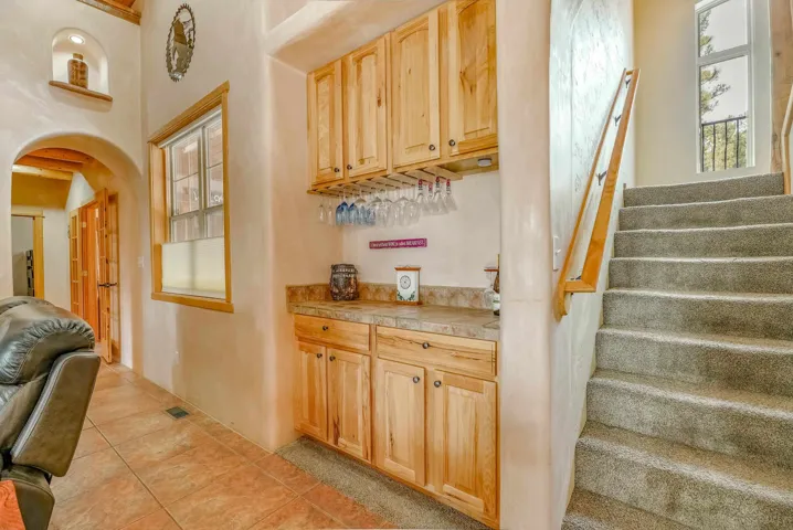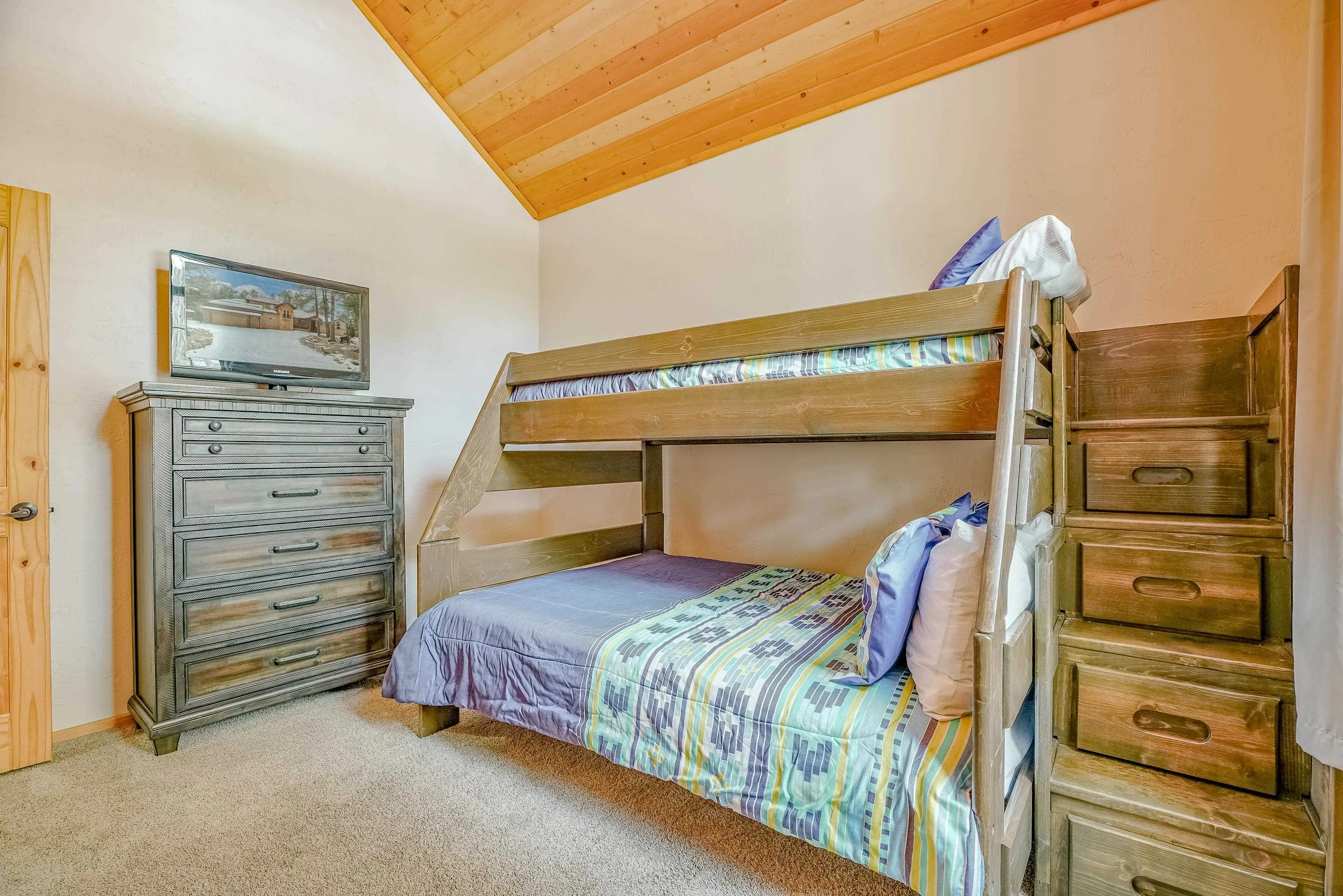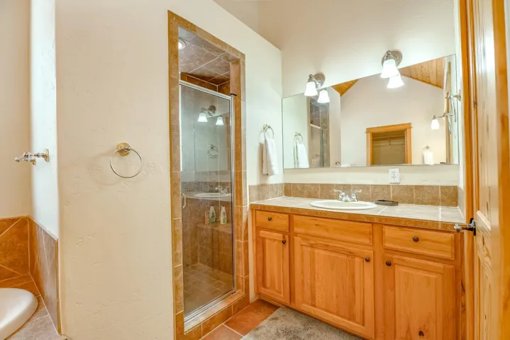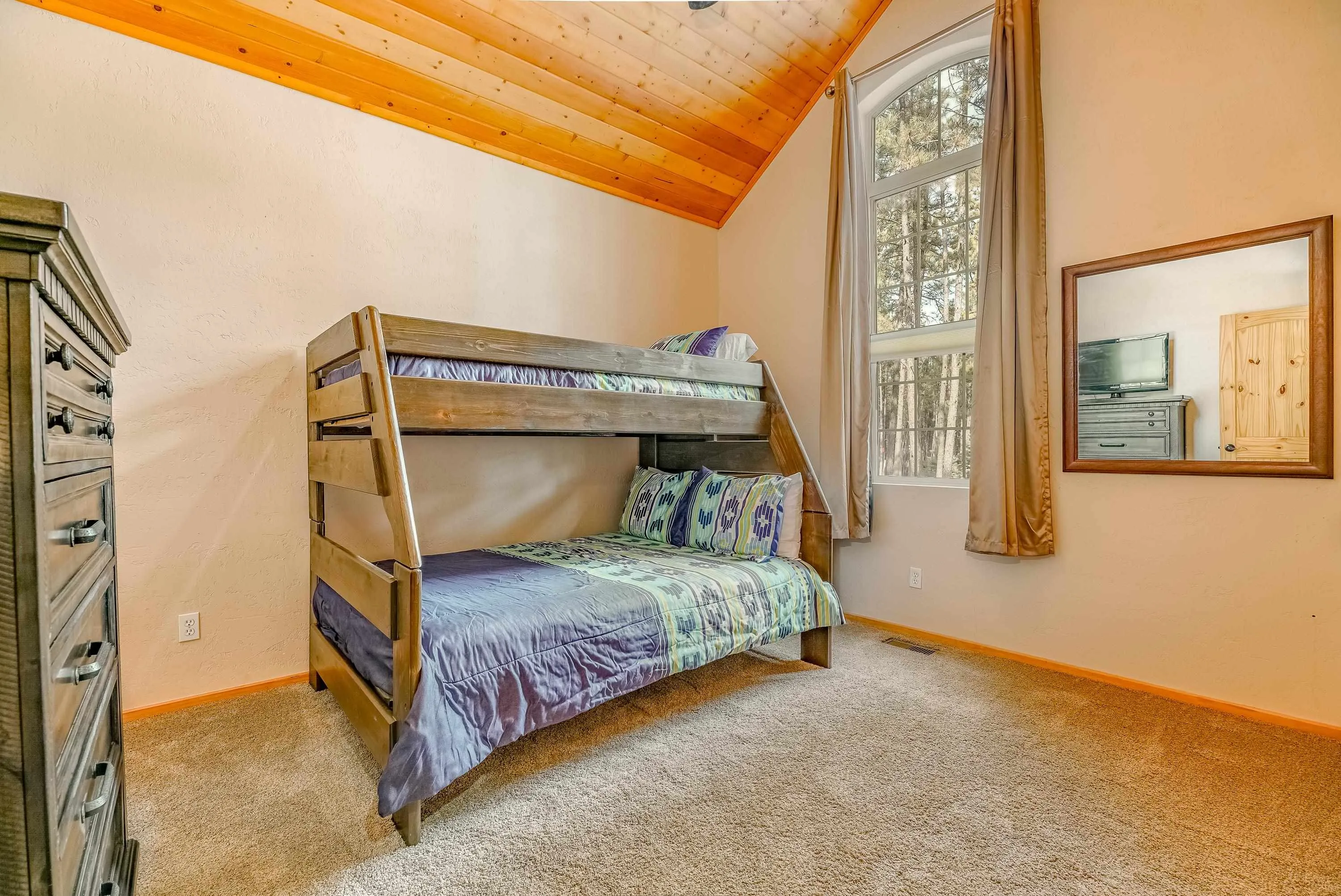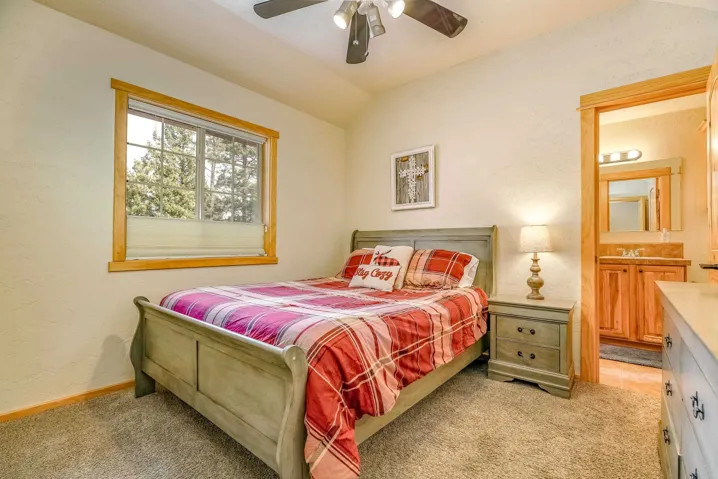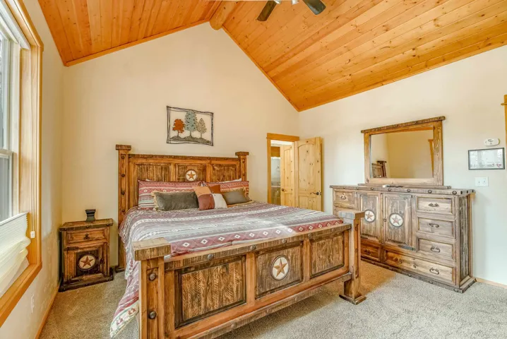 Mountain Paradise! This custom-built home offers 4 bedrooms, 2.5 baths, and generous spaces designed for both entertaining and everyday comfort. Vaulted tongue-and-groove pine ceilings with viga accents create warmth, character, and an unmistakable mountain feel throughout. The well-appointed kitchen features a walk-in pantry, built-in double ovens, and a dedicated wine cooler—perfect for hosting. The open-concept living and dining areas provide an inviting gathering space for family and friends. Outdoor living shines here, with a large covered deck plus an expansive free-standing deck complete with fire pit—ideal for enjoying fresh mountain air, stargazing, and the abundant local wildlife. The oversized heated garage offers versatility: when not used for vehicles, it converts into a full game space with indoor basketball, ping-pong, and darts. Situated on over three-quarters of an acre, this stately home backs to greenbelt and groomed walking trails, offering privacy and direct access to nature. Let us show you your Mountain Paradise!