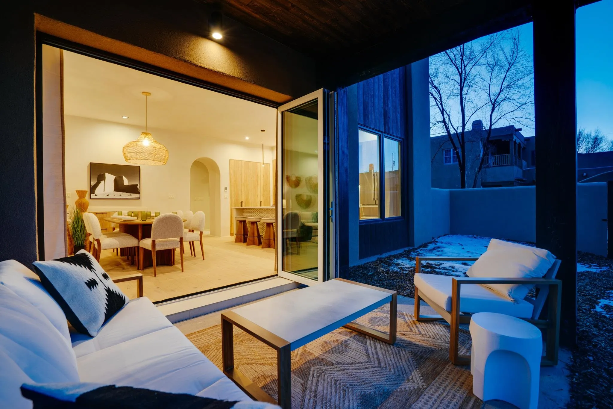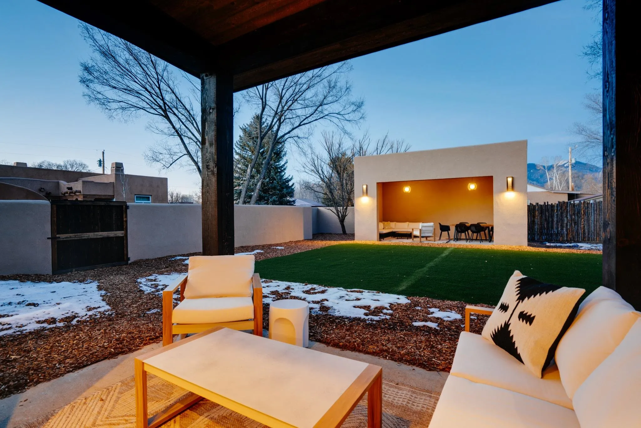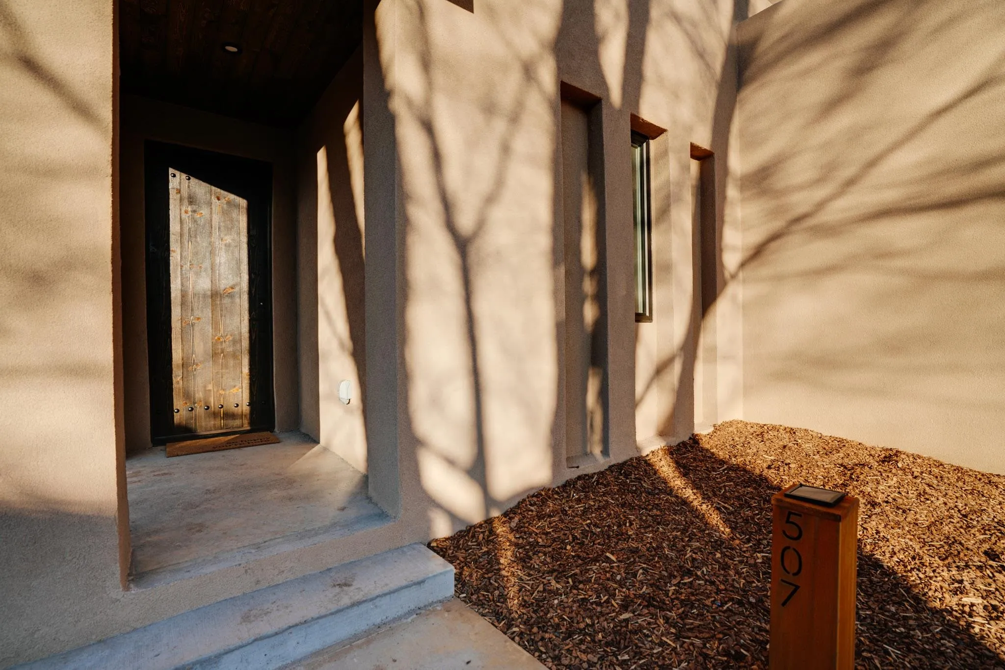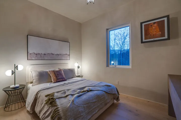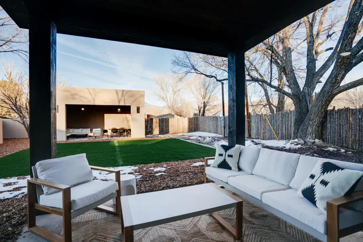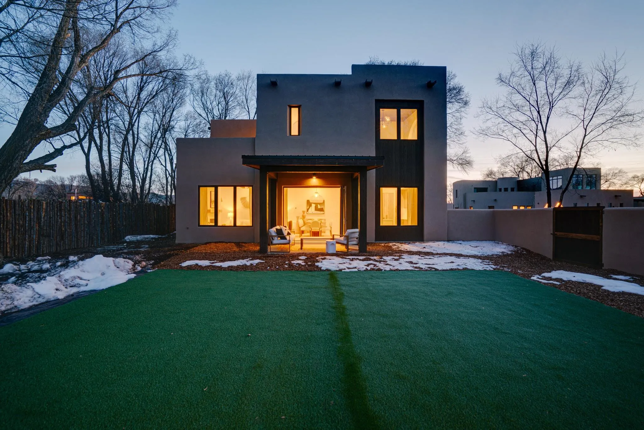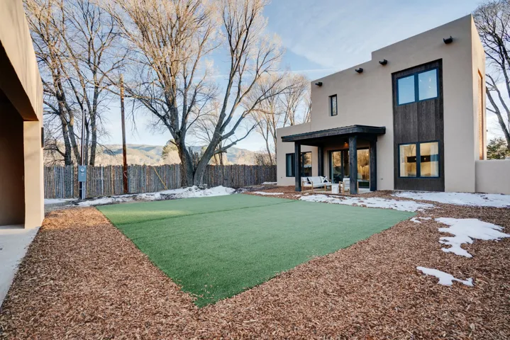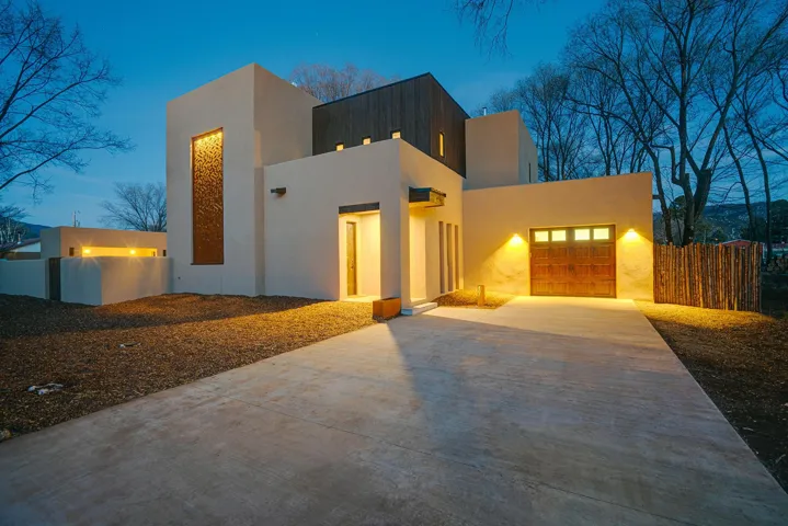 Welcome to ELMhouse, a truly spectacular newly built home surrounded by mature Siberian Elm trees. Located on the quiet Vigil Street you are afforded all the conveniences that town living has to offer. Designed and built by award winning Architect/Interior Designer, Johnna Barrett of Barrett Design, Elm House incorporates bold, dramatic design with the latest in eco-friendly sustainability. As you approach the property, the first thing you notice is the impressive custom designed Corten steel panel which is backlit at night. The lovely foyer, lit with a wall of electric pillar candles and handmade clay tile leads to the open kitchen/ dining/ living area. The kitchen offers Bosch electric appliances and durable, stain resistant quartz countertops with a Summit gas cooktop. A 9-foot Panoramic door opens to the outdoor patio and on to a detached portal which is great for leisurely lunches and dinners and excellent for entertaining. The landscaping offers minimal maintenance with weed barrier, topsoil and mulch. A patch of year-round green is provided by synthetic turf. The spacious dining/living room area has a gas fireplace as well as a mini split unit for additional heat and air conditioning. There are two bedrooms on the first level with a mini split unit in each as well as a full bath. Three storage closets and a large pantry lead to the one-car oversized garage. Enjoy electric radiant floor heat throughout the home. Two tankless on demand water heaters assure that you will never run out of hot water! The walls of the home are breathable lime-washed hand brushed paint which produces a velvety finish. White oak floors throughout the home come with a lifetime warranty. Five handmade wire lamps are suspended from the ceiling, giving a striking effect as you ascend to the second level. The risers of the stairs leading to the second level are enhanced by decorative encaustic tiles. Upstairs you will find the spacious primary bedroom offering a glorious view of Taos Mountain, a gas fireplace and a large ensuite bathroom. The plaster work in the bathrooms is Tadelakt , an elegant traditional waterproof Moroccan lime-based plaster with handmade clay tiles. There is an additional bedroom and a bonus room with a terrace. The bonus room can be used as an office, a TV room, studio, or an additional bedroom. This newly constructed 2488 SF 4-bedroom, 3 bath home which sits on .215 acres with high ceiling and skylights is filled with natural light. The construction is 2×6 and 2×12 which gives the home a very solid feeling. The exterior of the home is finished with Elastomeric stucco, a superior, long lasting, water and crack resistant product. Superior craftsmanship can be seen in every aspect of construction and design. The home is offered fully furnished and decorated in a sophisticated and soothing neutral color scheme giving a buyer the opportunity to add their own personal touches. Bold and dramatic, this stunning eco-friendly home is a must-see and beckons you to call it your own.