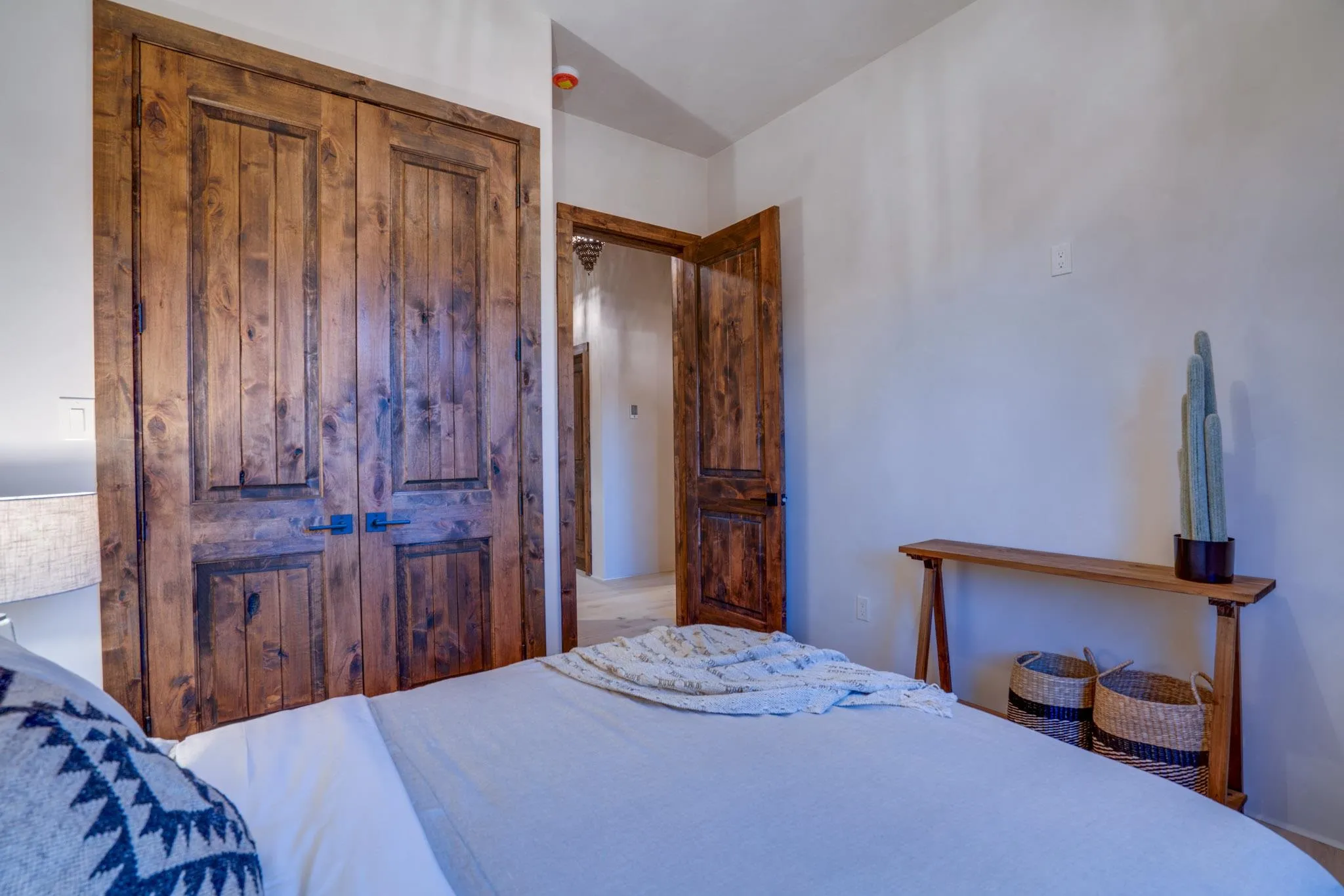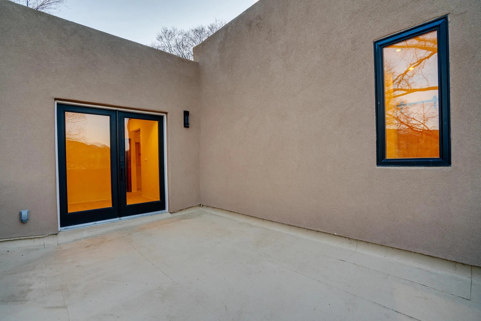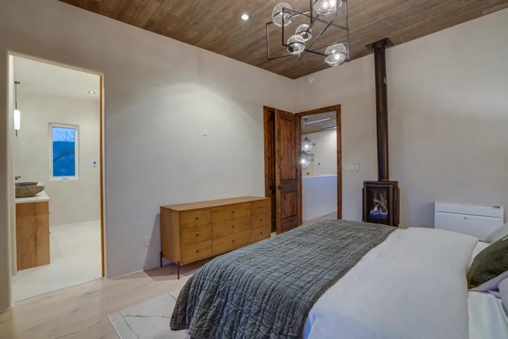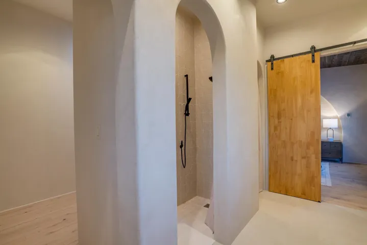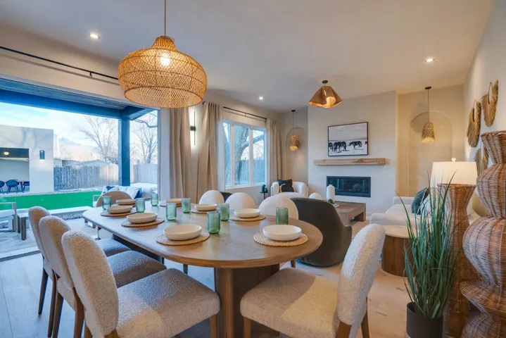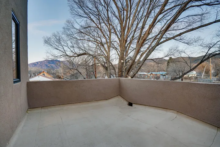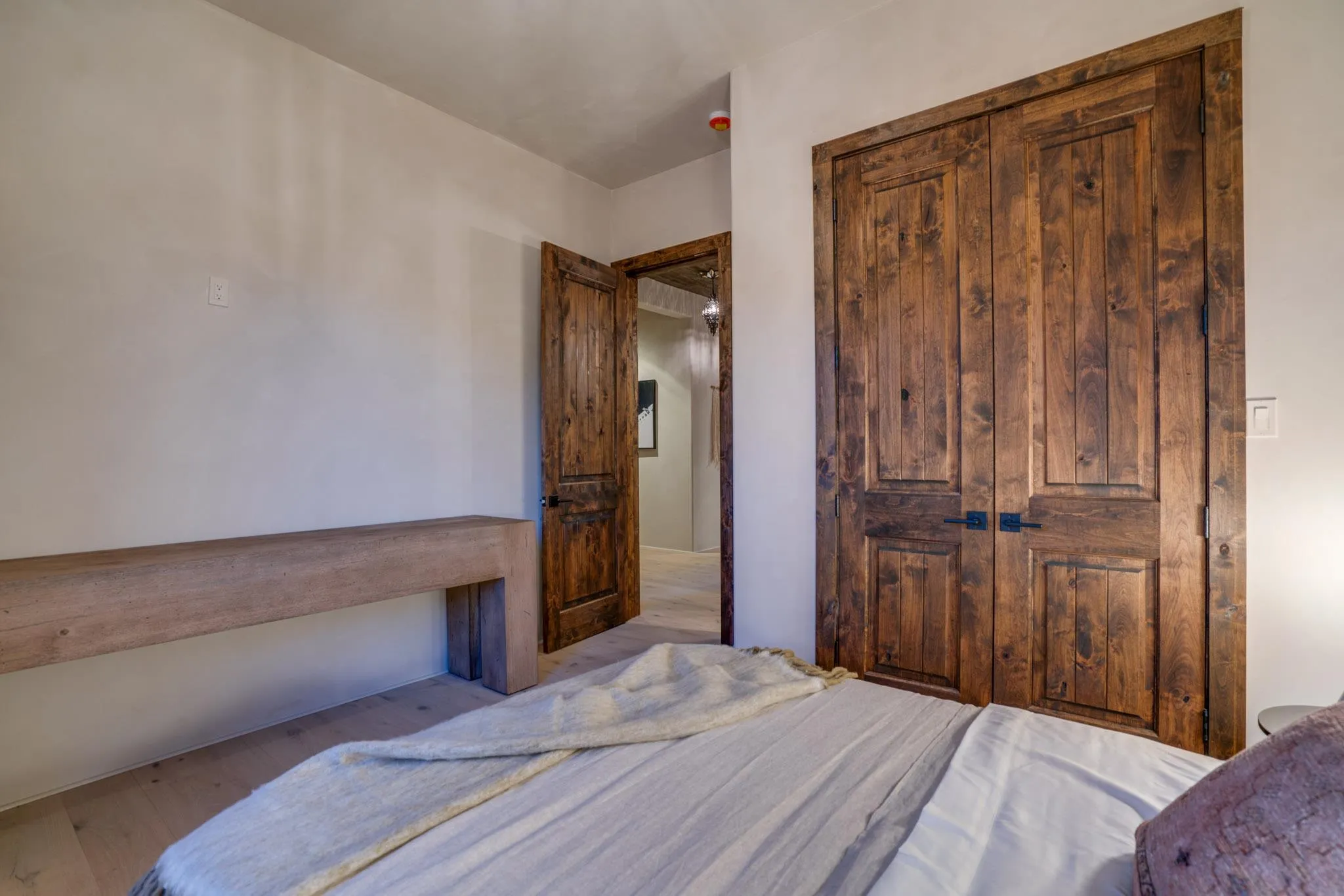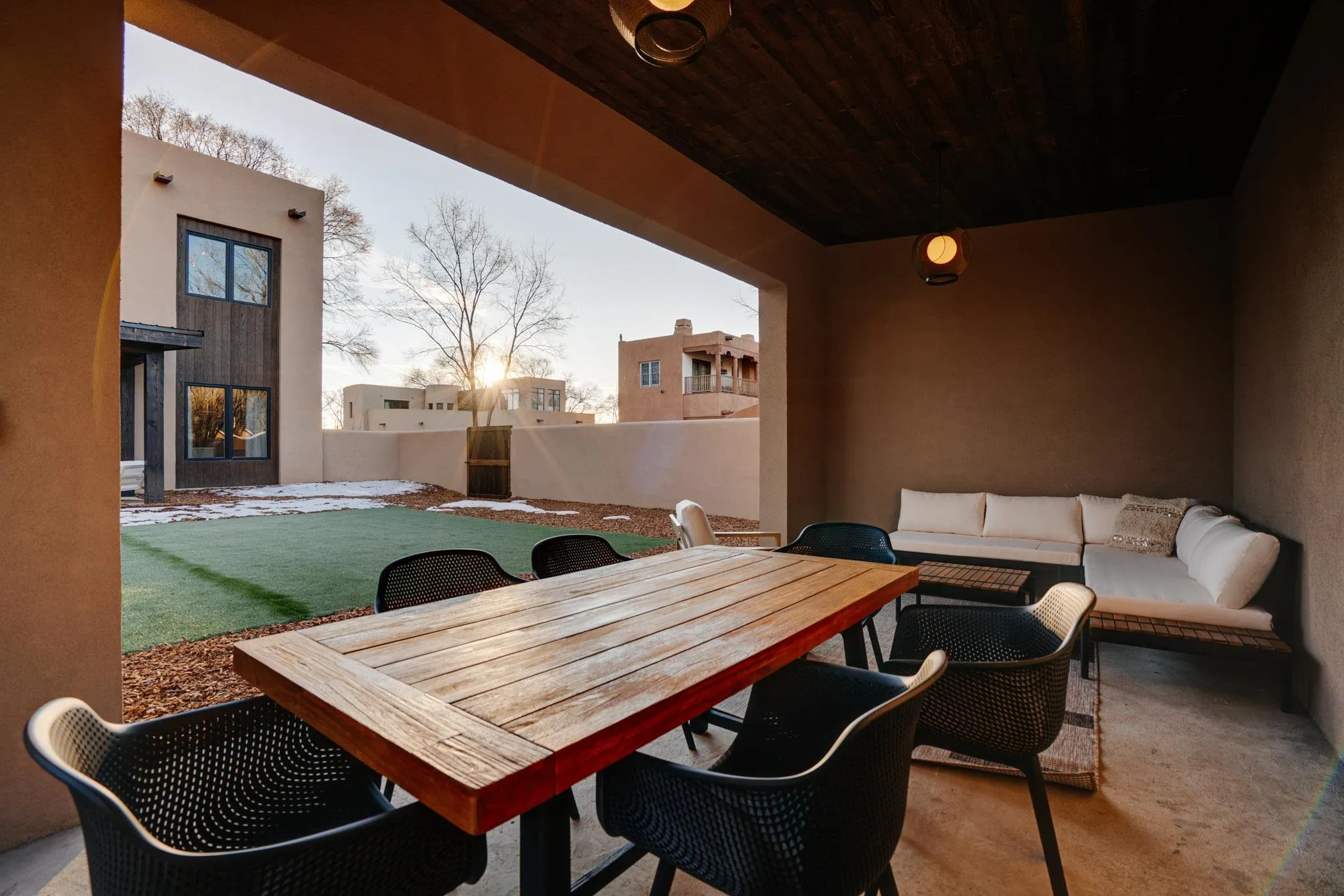 Welcome to ELMhouse, a truly spectacular newly built home surrounded by mature Siberian Elm trees. Located on the quiet Vigil Street you are afforded all the conveniences that town living has to offer. Designed and built by award winning Architect/Interior Designer, Johnna Barrett of Barrett Design, Elm House incorporates bold, dramatic design with the latest in eco-friendly sustainability. As you approach the property, the first thing you notice is the impressive custom designed Corten steel panel which is backlit at night. The lovely foyer, lit with a wall of electric pillar candles and handmade clay tile leads to the open kitchen/ dining/ living area. The kitchen offers Bosch electric appliances and durable, stain resistant quartz countertops with a Summit gas cooktop. A 9-foot Panoramic door opens to the outdoor patio and on to a detached portal which is great for leisurely lunches and dinners and excellent for entertaining. The landscaping offers minimal maintenance with weed barrier, topsoil and mulch. A patch of year-round green is provided by synthetic turf. The spacious dining/living room area has a gas fireplace as well as a mini split unit for additional heat and air conditioning. There are two bedrooms on the first level with a mini split unit in each as well as a full bath. Three storage closets and a large pantry lead to the one-car oversized garage. Enjoy electric radiant floor heat throughout the home. Two tankless on demand water heaters assure that you will never run out of hot water! The walls of the home are breathable lime-washed hand brushed paint which produces a velvety finish. White oak floors throughout the home come with a lifetime warranty. Five handmade wire lamps are suspended from the ceiling, giving a striking effect as you ascend to the second level. The risers of the stairs leading to the second level are enhanced by decorative encaustic tiles. Upstairs you will find the spacious primary bedroom offering a glorious view of Taos Mountain, a gas fireplace and a large ensuite bathroom. The plaster work in the bathrooms is Tadelakt , an elegant traditional waterproof Moroccan lime-based plaster with handmade clay tiles. There is an additional bedroom and a bonus room with a terrace. The bonus room can be used as an office, a TV room, studio, or an additional bedroom. This newly constructed 2488 SF 4-bedroom, 3 bath home which sits on .215 acres with high ceiling and skylights is filled with natural light. The construction is 2×6 and 2×12 which gives the home a very solid feeling. The exterior of the home is finished with Elastomeric stucco, a superior, long lasting, water and crack resistant product. Superior craftsmanship can be seen in every aspect of construction and design. The home is offered fully furnished and decorated in a sophisticated and soothing neutral color scheme giving a buyer the opportunity to add their own personal touches. Bold and dramatic, this stunning eco-friendly home is a must-see and beckons you to call it your own.