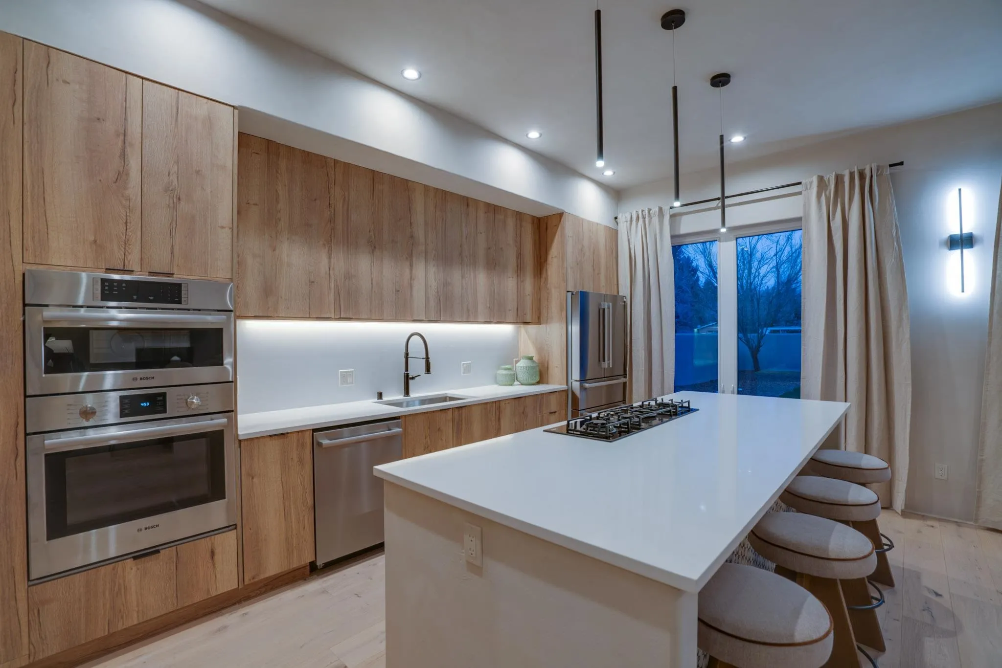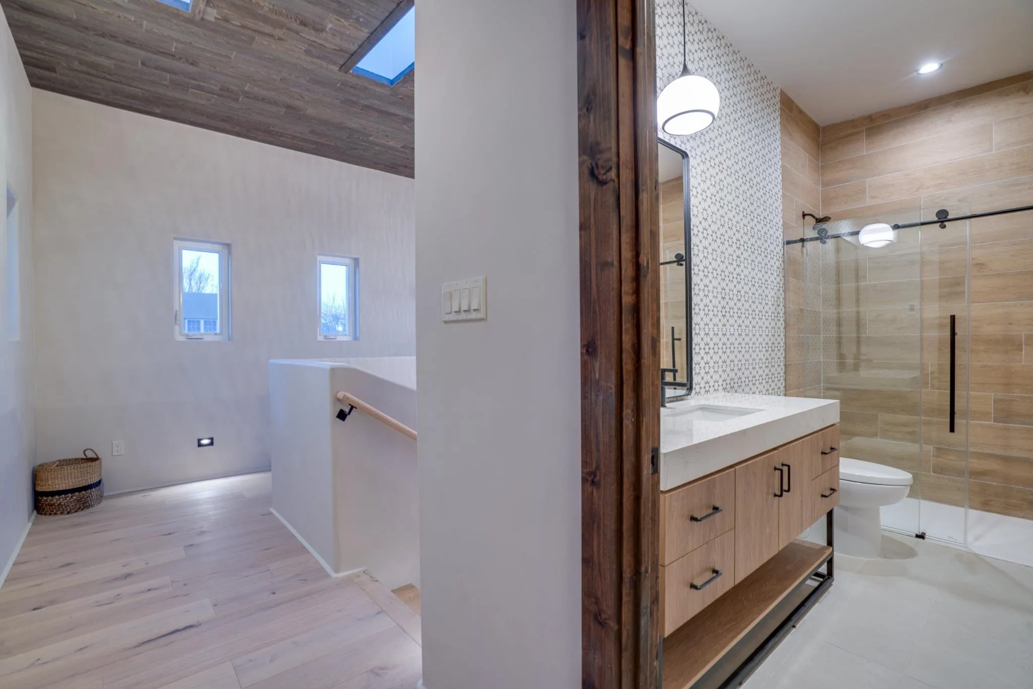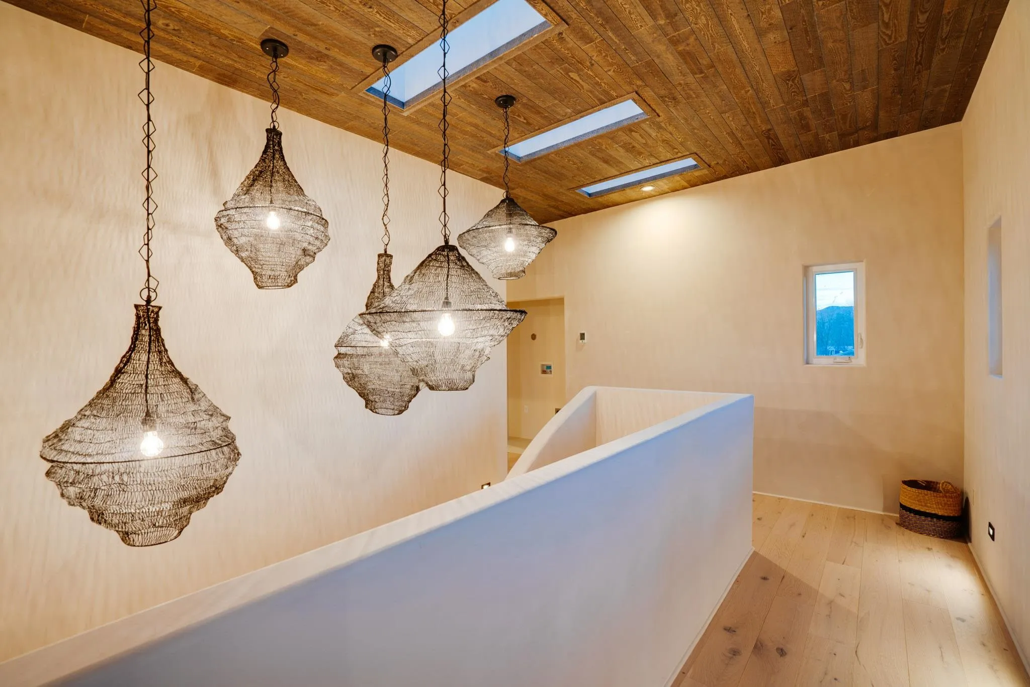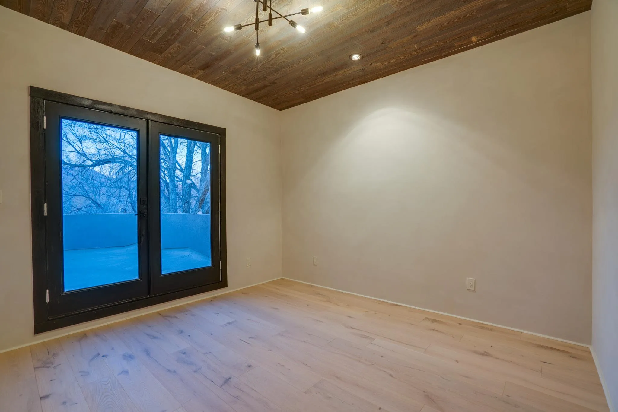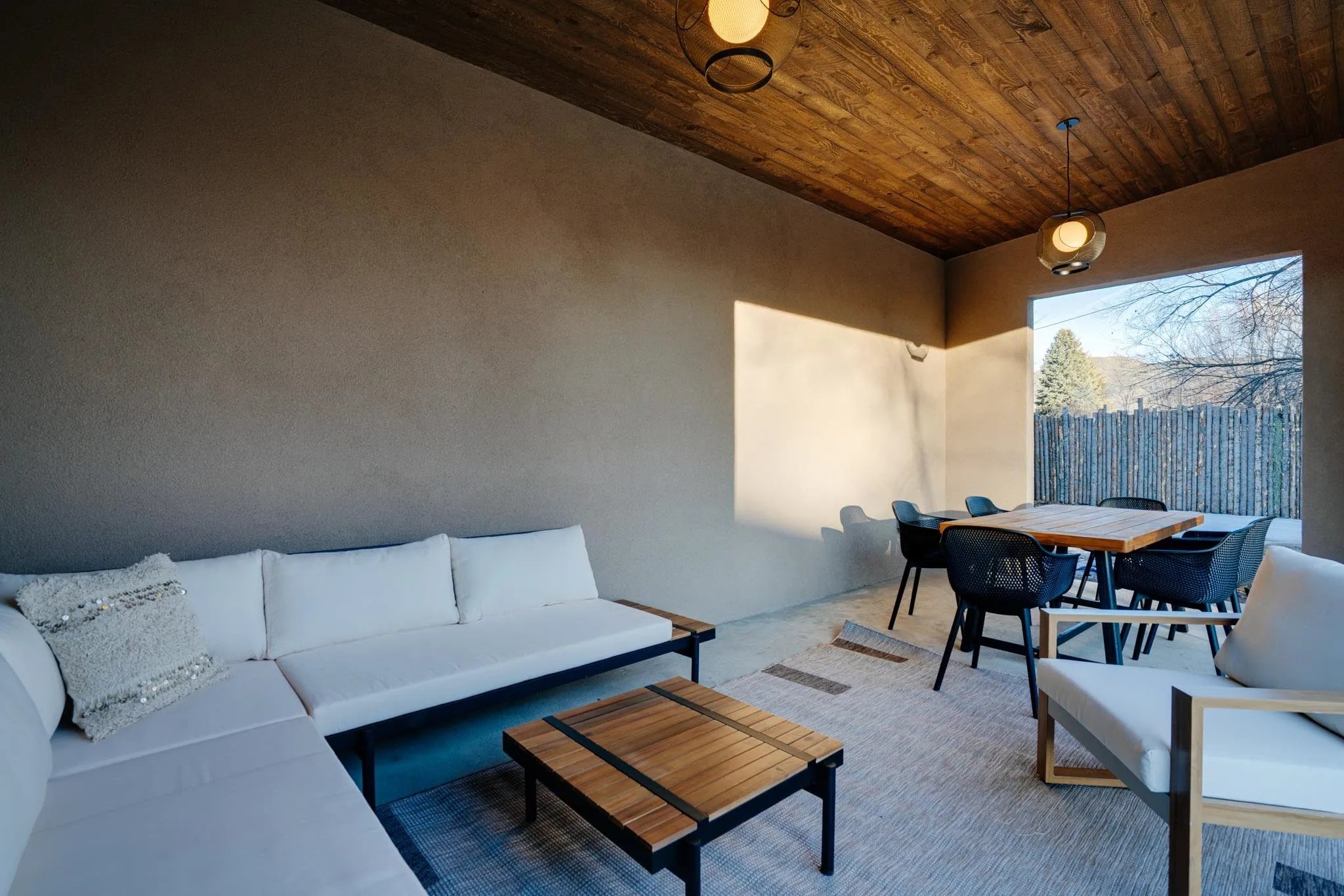 Welcome to ELMhouse, a truly spectacular newly built home surrounded by mature Siberian Elm trees. Located on the quiet Vigil Street you are afforded all the conveniences that town living has to offer. Designed and built by award winning Architect/Interior Designer, Johnna Barrett of Barrett Design, Elm House incorporates bold, dramatic design with the latest in eco-friendly sustainability. As you approach the property, the first thing you notice is the impressive custom designed Corten steel panel which is backlit at night. The lovely foyer, lit with a wall of electric pillar candles and handmade clay tile leads to the open kitchen/ dining/ living area. The kitchen offers Bosch electric appliances and durable, stain resistant quartz countertops with a Summit gas cooktop. A 9-foot Panoramic door opens to the outdoor patio and on to a detached portal which is great for leisurely lunches and dinners and excellent for entertaining. The landscaping offers minimal maintenance with weed barrier, topsoil and mulch. A patch of year-round green is provided by synthetic turf. The spacious dining/living room area has a gas fireplace as well as a mini split unit for additional heat and air conditioning. There are two bedrooms on the first level with a mini split unit in each as well as a full bath. Three storage closets and a large pantry lead to the one-car oversized garage. Enjoy electric radiant floor heat throughout the home. Two tankless on demand water heaters assure that you will never run out of hot water! The walls of the home are breathable lime-washed hand brushed paint which produces a velvety finish. White oak floors throughout the home come with a lifetime warranty. Five handmade wire lamps are suspended from the ceiling, giving a striking effect as you ascend to the second level. The risers of the stairs leading to the second level are enhanced by decorative encaustic tiles. Upstairs you will find the spacious primary bedroom offering a glorious view of Taos Mountain, a gas fireplace and a large ensuite bathroom. The plaster work in the bathrooms is Tadelakt , an elegant traditional waterproof Moroccan lime-based plaster with handmade clay tiles. There is an additional bedroom and a bonus room with a terrace. The bonus room can be used as an office, a TV room, studio, or an additional bedroom. This newly constructed 2488 SF 4-bedroom, 3 bath home which sits on .215 acres with high ceiling and skylights is filled with natural light. The construction is 2×6 and 2×12 which gives the home a very solid feeling. The exterior of the home is finished with Elastomeric stucco, a superior, long lasting, water and crack resistant product. Superior craftsmanship can be seen in every aspect of construction and design. The home is offered fully furnished and decorated in a sophisticated and soothing neutral color scheme giving a buyer the opportunity to add their own personal touches. Bold and dramatic, this stunning eco-friendly home is a must-see and beckons you to call it your own.
