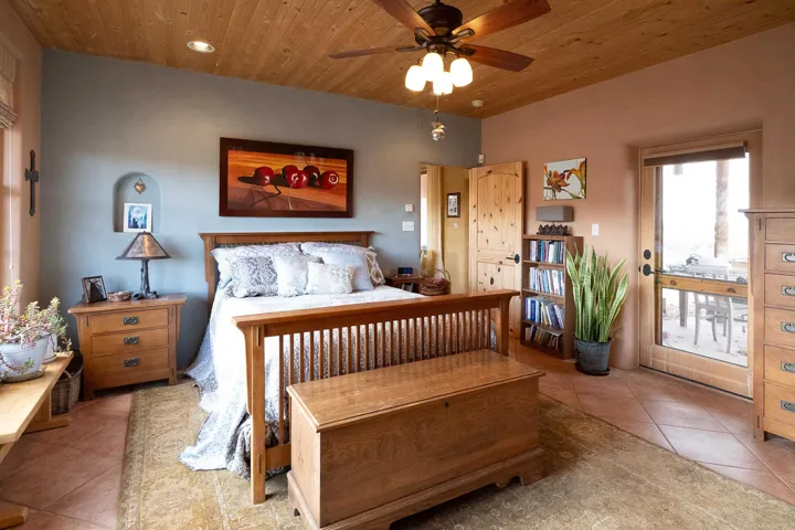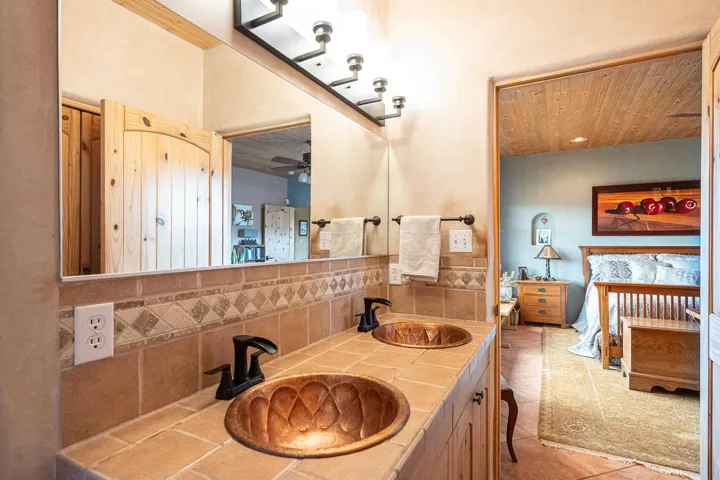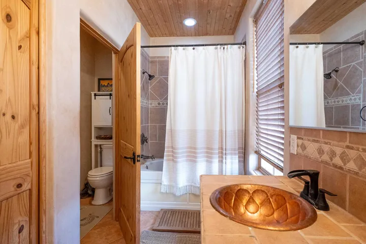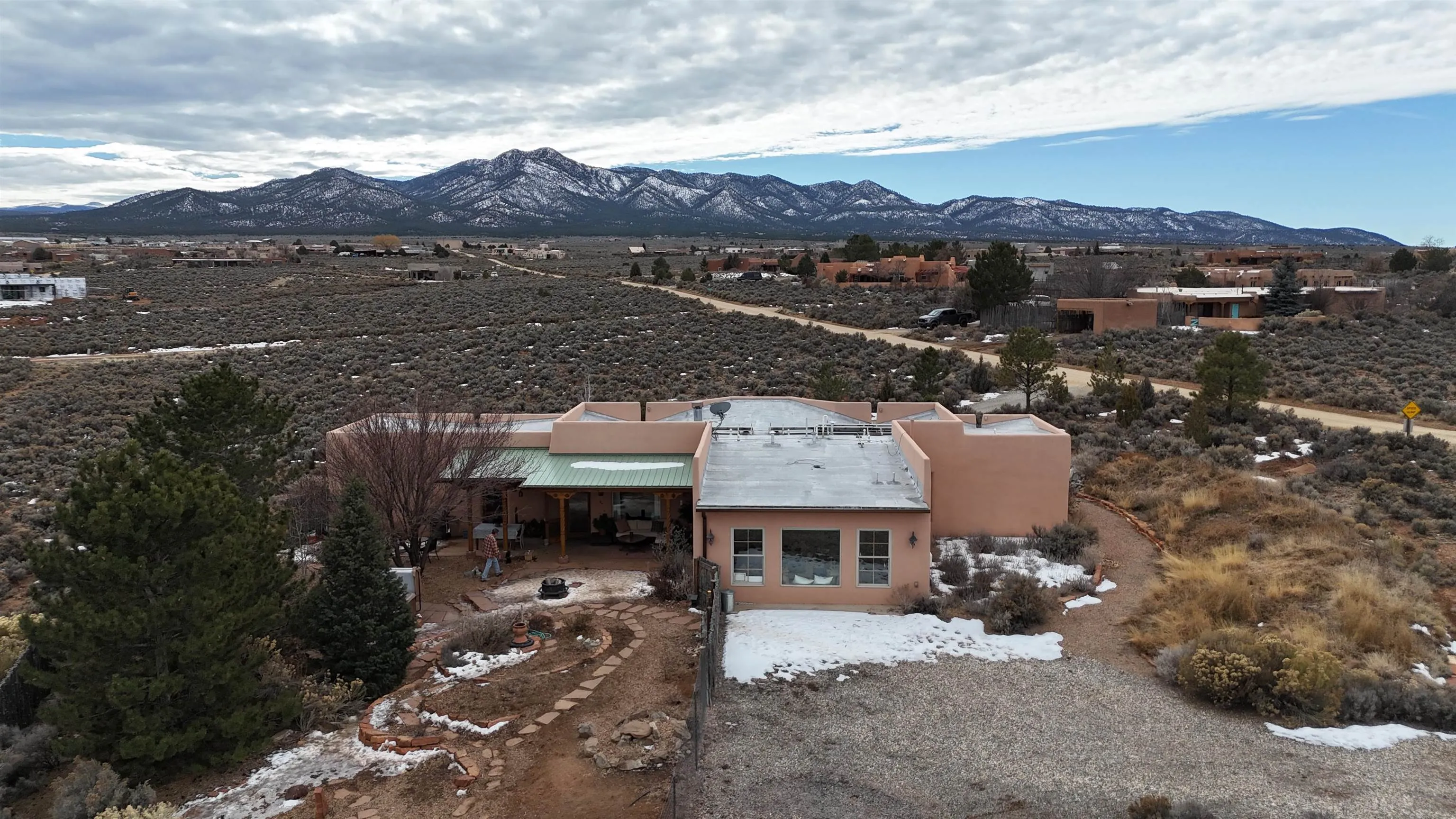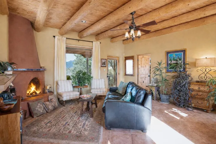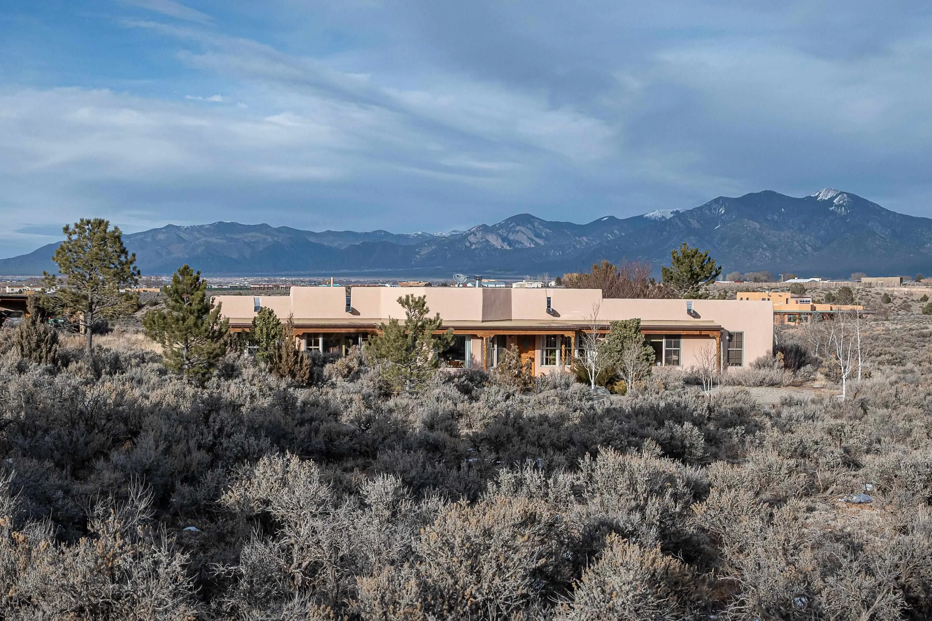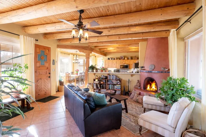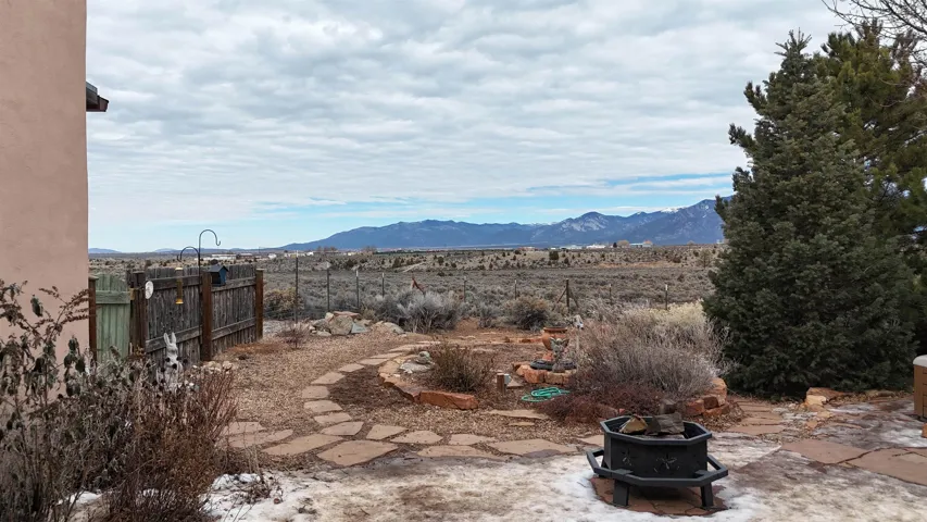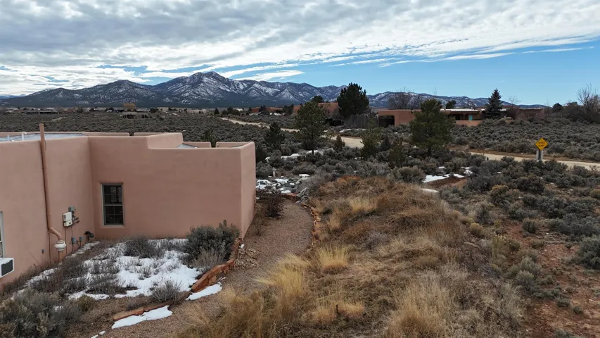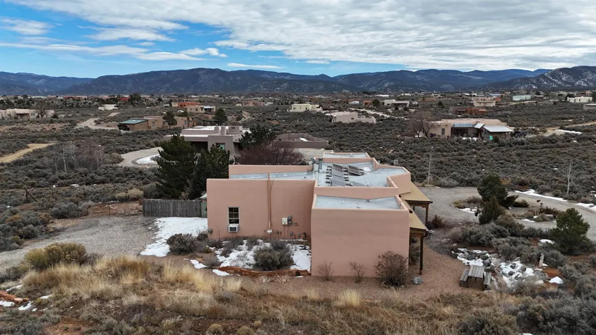 SUNNY, SERENE AND TOTALLY SOUTHWEST! Classic Southwest design meets thoughtful living in this artistically crafted, solar-oriented 3 bedroom, 2 bath home in the desirable Vista Linda Subdivision — just minutes from town and near the Taos Country Club. Built by Ecobuilders using sustainable materials, this residence embraces true Northern New Mexico style with hand-troweled natural tinted plaster walls, traditional vigas and tongue-and-groove ceilings, and warm earth-toned tile floors that glow in the natural light. The open floor plan flows effortlessly between the spacious living room, kitchen, and dining area– ideal for dinner parties, holiday tamale-making, or simply admiring your excellent taste. The beautiful wood-burning fireplace anchors the living space with timeless Southwest character. The radial vigas over the dining room add a subtle drama that whispers “yes– I’m fabulous.” The kitchen is well-equipped with gas oven, gas range, dishwasher, refrigerator, generous panty and separate laundry room. The primary suite is full of light and luxury, with copper sinks, jumbo walk-in closet and direct access to the backyard and hot tub. (Morning coffee soak? Late-night stargazing? Both feel appropriate.) Two additional bedrooms and full bath sit off a sunny hallway– perfect for guests, studio space or a home office you’ll pretend you’re very disciplined about. Beyond the kitchen is a large north-facing family room with its own sink offering endless flexibilty– art studio, wet bar, media lounge, creative lab, yoga space… you choose. Soft light, big views, no bad angles. Step outside to a covered portal designed for lingering. Room to dine, room to lounge, room to exhale. Perennial gardens, mature trees, and established landscaping on drip irrigation surrounds the home and softens the natural high-desert setting, creating a peaceful outdoor retreat framed by stunning mountain views. There’s even a hot tub for soaking in the views or the star-filled Taos skies– because sometimes you just need to float and contemplate life choices. Ample parking for entertaining and a detached carport with storage means there’s room for guests, gear and outdoor toys. Behind the beauty? Smart design. Passive solar, electric solar panels, pumice exterior wall construction (north, east & west), a private well and a rainwater catchment system with cistern for irrigation reflect forward-thinking, energy-efficient living. Sustainable never looked so good. Located near the Taos Country Club, Slide + Rift hiking + biking trails, and offering convenient access to Pilar and the Rio Grande for rafting, kayaking, and world-class fishing — this home is the perfect balance of Southwest detail, sustainability, and access to the wild beauty that makes Taos…. Taos.
