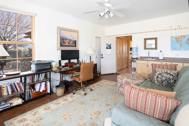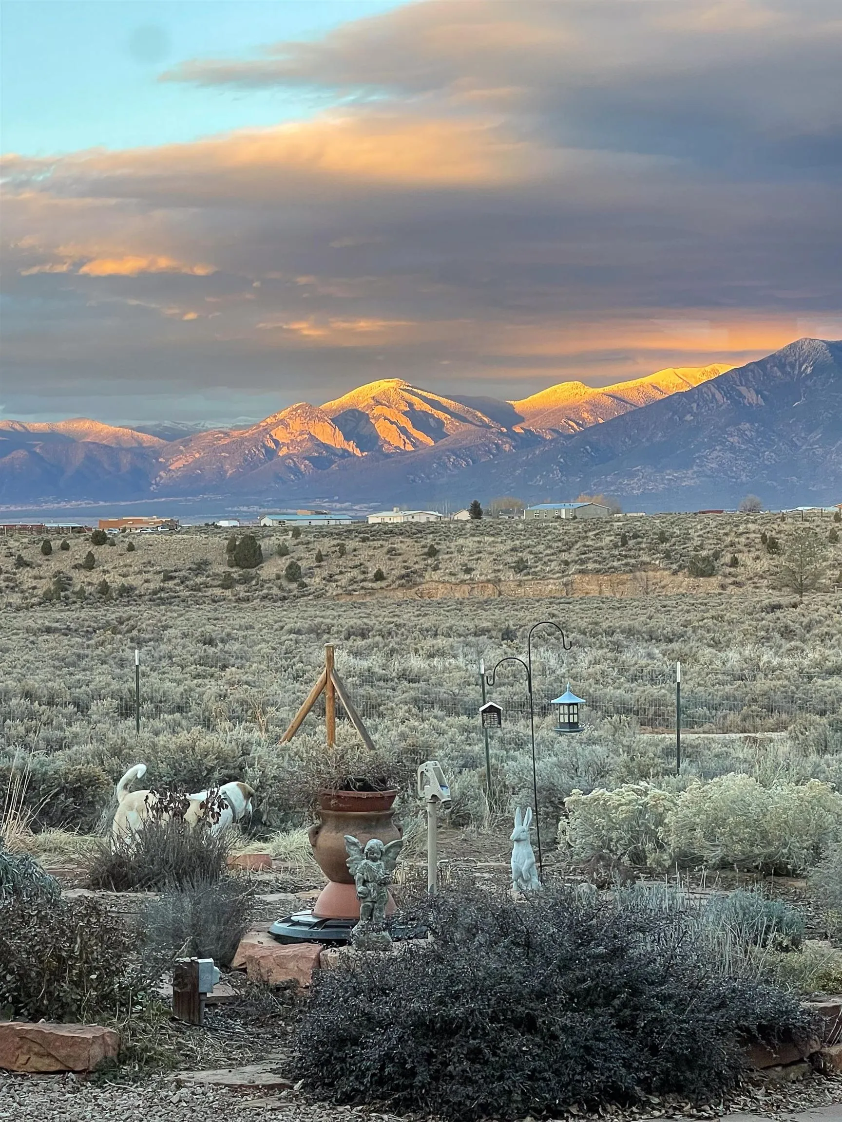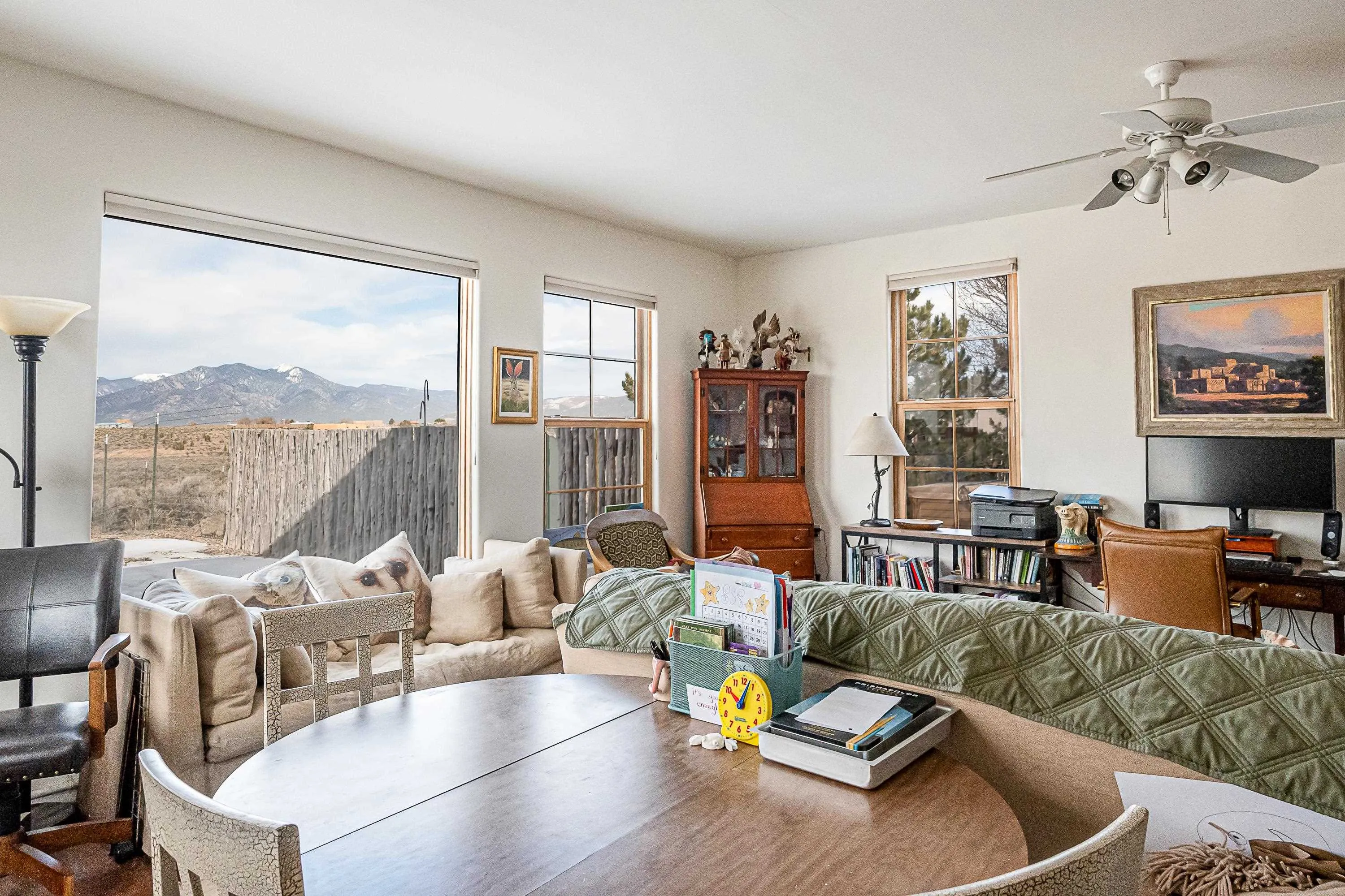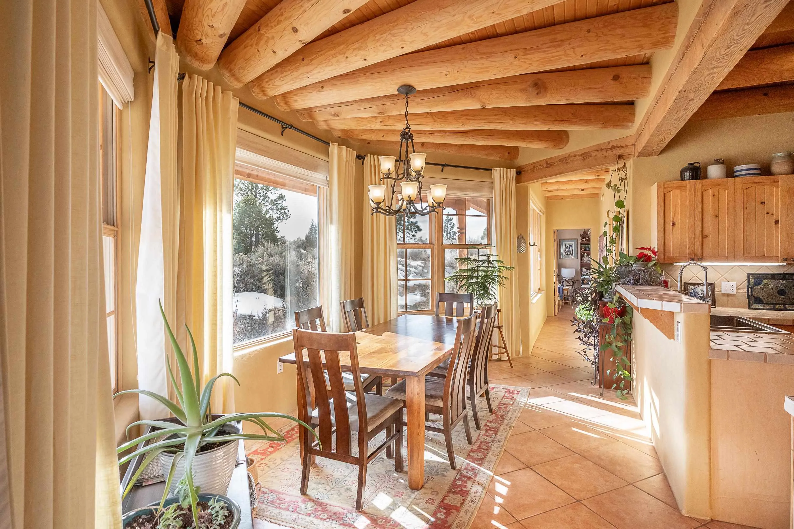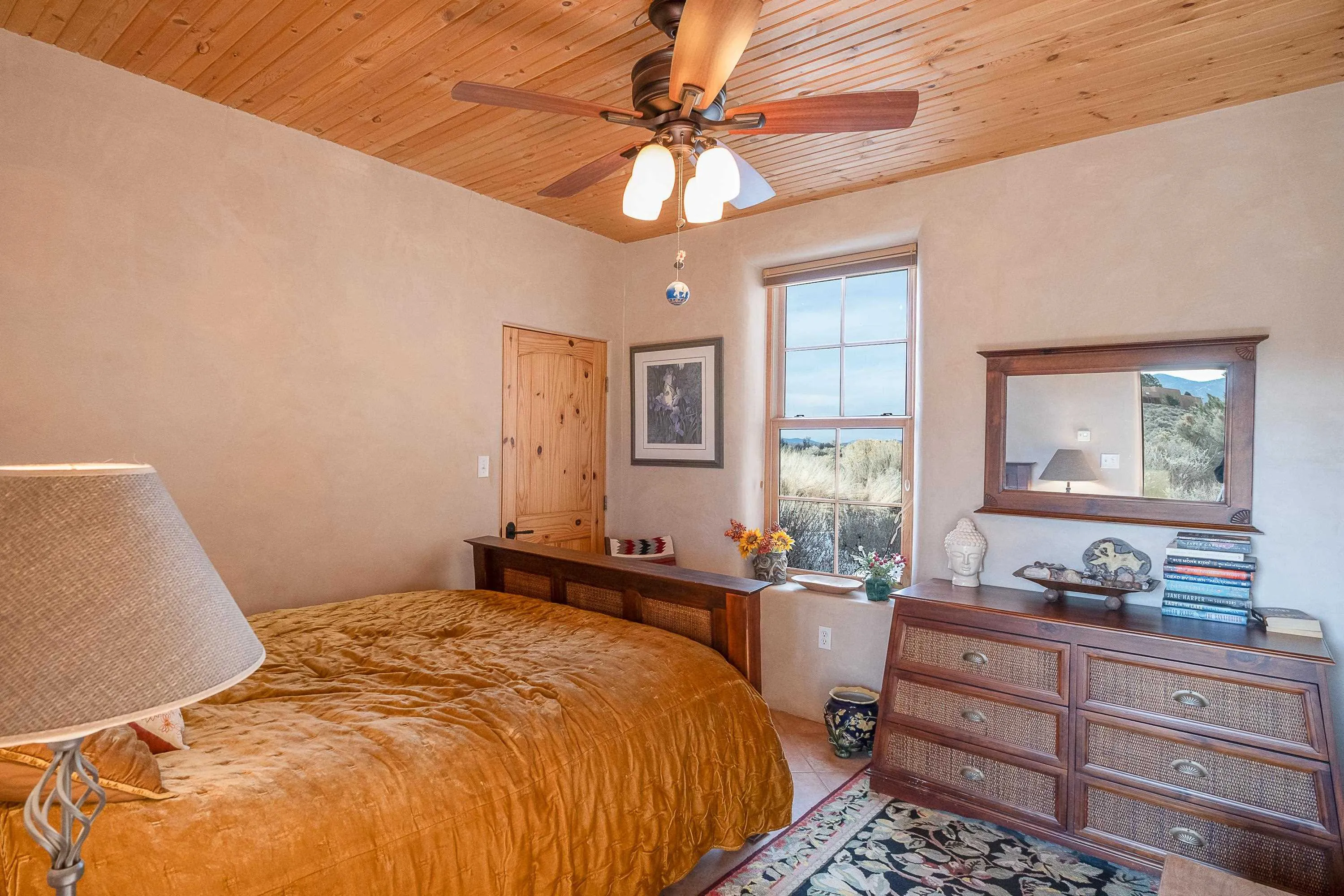 SUNNY, SERENE AND TOTALLY SOUTHWEST! Classic Southwest design meets thoughtful living in this artistically crafted, solar-oriented 3 bedroom, 2 bath home in the desirable Vista Linda Subdivision — just minutes from town and near the Taos Country Club. Built by Ecobuilders using sustainable materials, this residence embraces true Northern New Mexico style with hand-troweled natural tinted plaster walls, traditional vigas and tongue-and-groove ceilings, and warm earth-toned tile floors that glow in the natural light. The open floor plan flows effortlessly between the spacious living room, kitchen, and dining area– ideal for dinner parties, holiday tamale-making, or simply admiring your excellent taste. The beautiful wood-burning fireplace anchors the living space with timeless Southwest character. The radial vigas over the dining room add a subtle drama that whispers “yes– I’m fabulous.” The kitchen is well-equipped with gas oven, gas range, dishwasher, refrigerator, generous panty and separate laundry room. The primary suite is full of light and luxury, with copper sinks, jumbo walk-in closet and direct access to the backyard and hot tub. (Morning coffee soak? Late-night stargazing? Both feel appropriate.) Two additional bedrooms and full bath sit off a sunny hallway– perfect for guests, studio space or a home office you’ll pretend you’re very disciplined about. Beyond the kitchen is a large north-facing family room with its own sink offering endless flexibilty– art studio, wet bar, media lounge, creative lab, yoga space… you choose. Soft light, big views, no bad angles. Step outside to a covered portal designed for lingering. Room to dine, room to lounge, room to exhale. Perennial gardens, mature trees, and established landscaping on drip irrigation surrounds the home and softens the natural high-desert setting, creating a peaceful outdoor retreat framed by stunning mountain views. There’s even a hot tub for soaking in the views or the star-filled Taos skies– because sometimes you just need to float and contemplate life choices. Ample parking for entertaining and a detached carport with storage means there’s room for guests, gear and outdoor toys. Behind the beauty? Smart design. Passive solar, electric solar panels, pumice exterior wall construction (north, east & west), a private well and a rainwater catchment system with cistern for irrigation reflect forward-thinking, energy-efficient living. Sustainable never looked so good. Located near the Taos Country Club, Slide + Rift hiking + biking trails, and offering convenient access to Pilar and the Rio Grande for rafting, kayaking, and world-class fishing — this home is the perfect balance of Southwest detail, sustainability, and access to the wild beauty that makes Taos…. Taos.