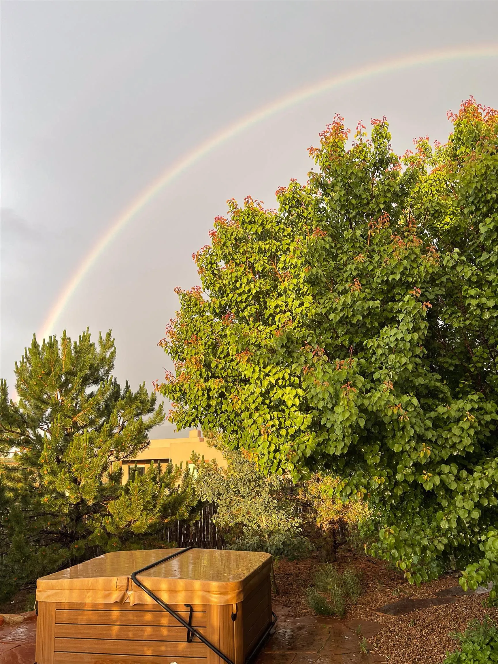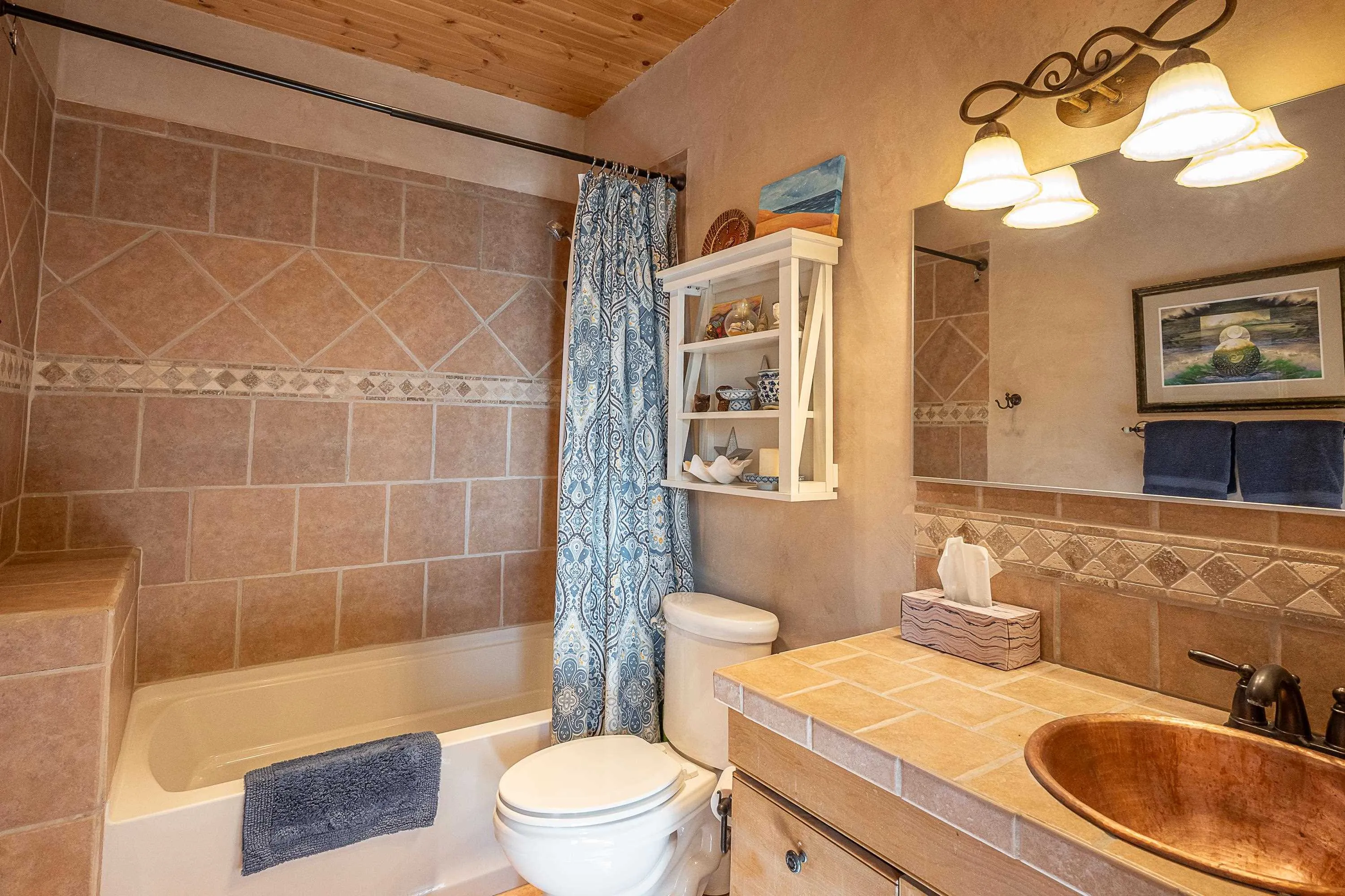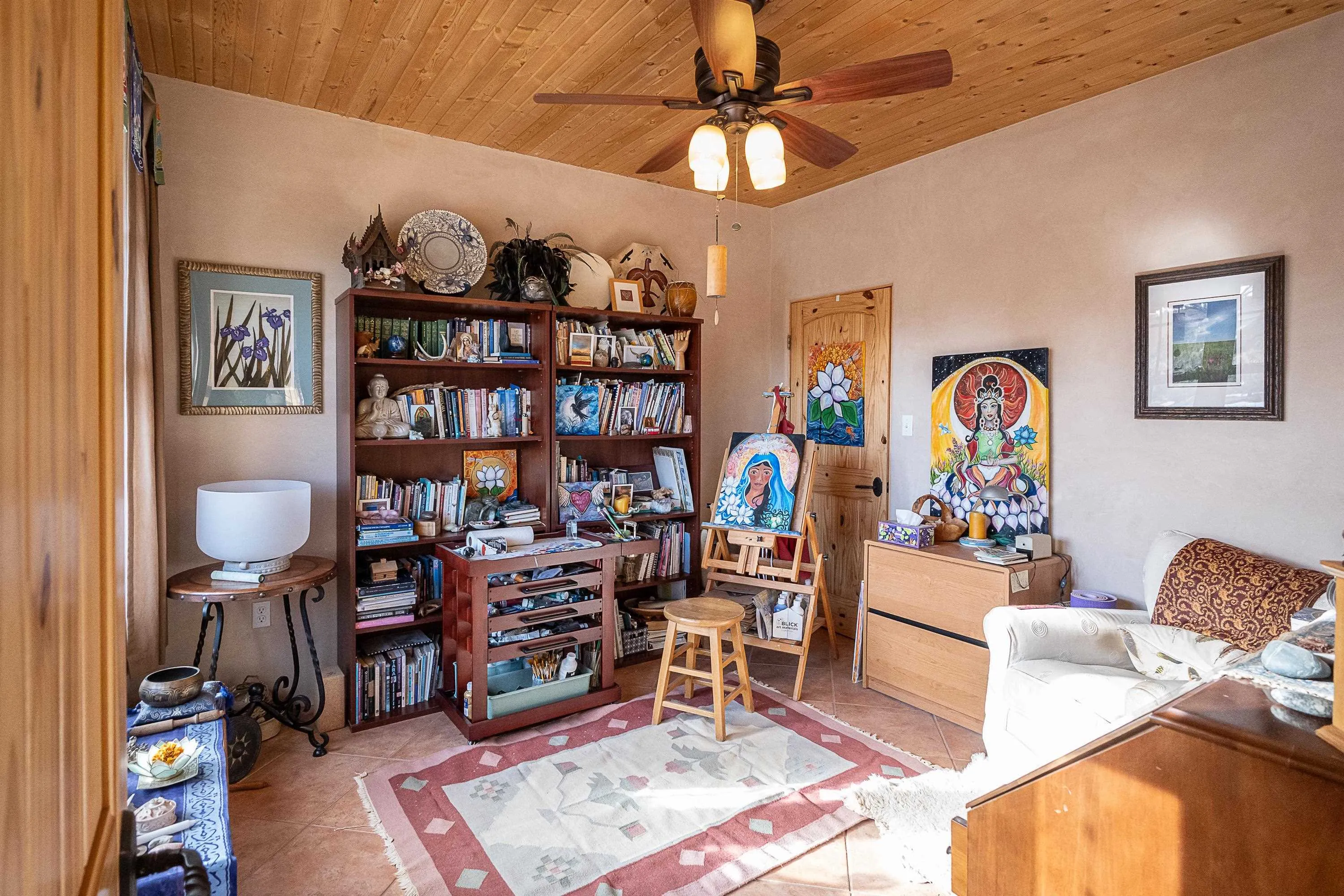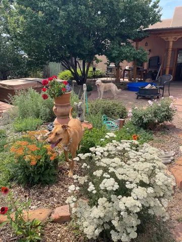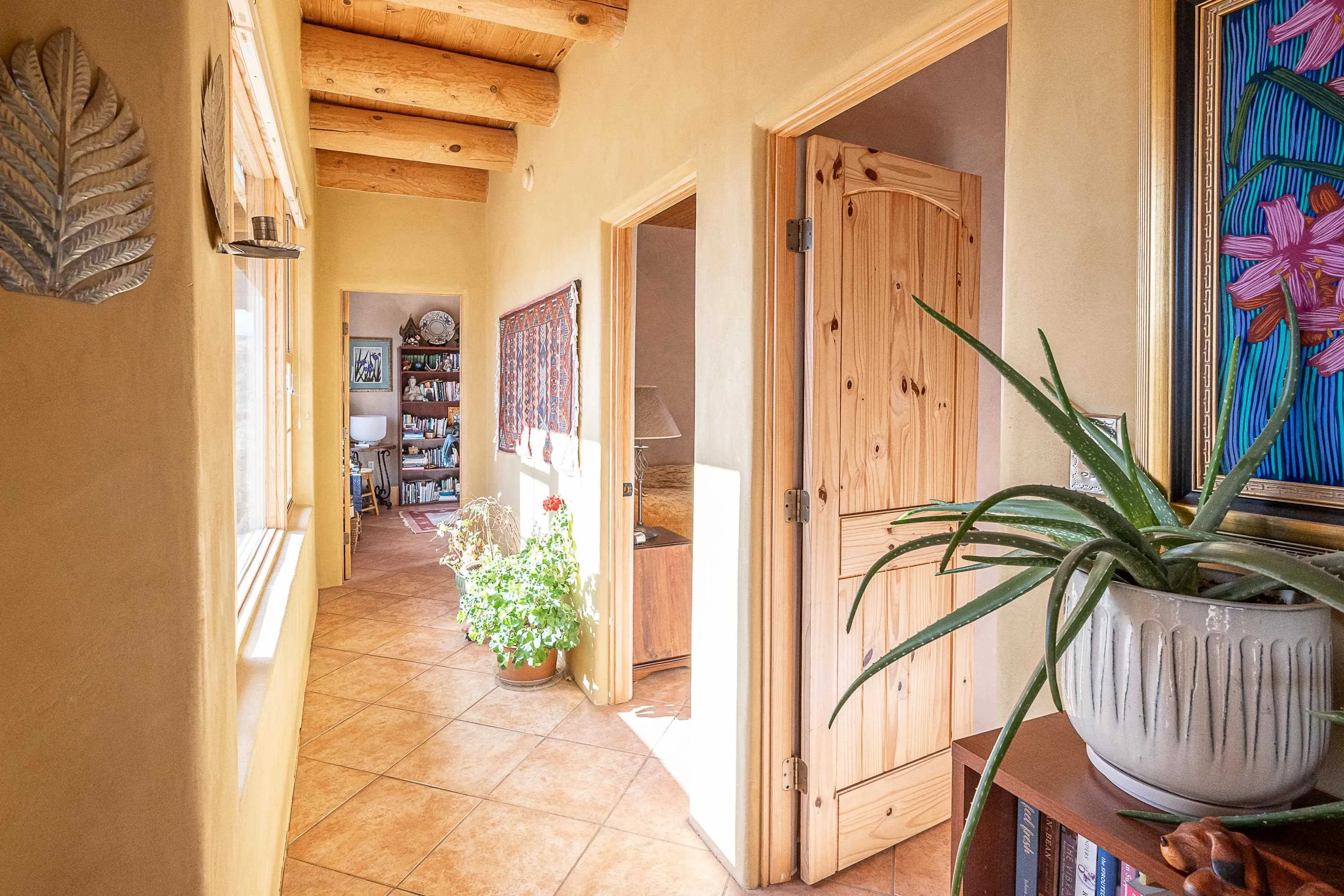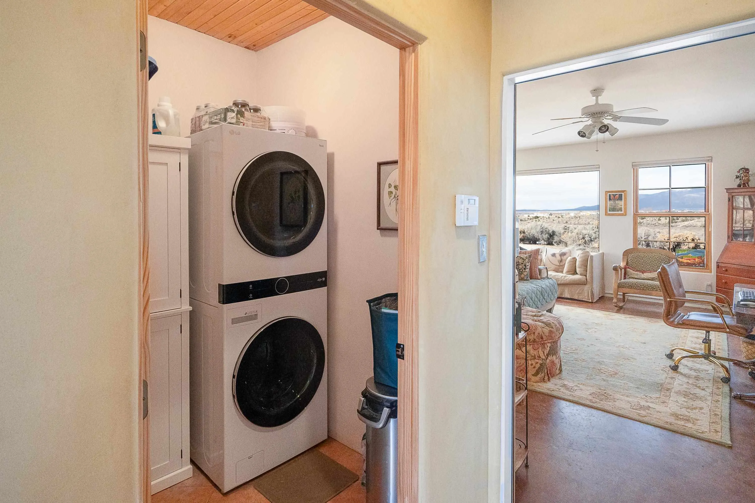 SUNNY, SERENE AND TOTALLY SOUTHWEST! Classic Southwest design meets thoughtful living in this artistically crafted, solar-oriented 3 bedroom, 2 bath home in the desirable Vista Linda Subdivision — just minutes from town and near the Taos Country Club. Built by Ecobuilders using sustainable materials, this residence embraces true Northern New Mexico style with hand-troweled natural tinted plaster walls, traditional vigas and tongue-and-groove ceilings, and warm earth-toned tile floors that glow in the natural light. The open floor plan flows effortlessly between the spacious living room, kitchen, and dining area– ideal for dinner parties, holiday tamale-making, or simply admiring your excellent taste. The beautiful wood-burning fireplace anchors the living space with timeless Southwest character. The radial vigas over the dining room add a subtle drama that whispers “yes– I’m fabulous.” The kitchen is well-equipped with gas oven, gas range, dishwasher, refrigerator, generous panty and separate laundry room. The primary suite is full of light and luxury, with copper sinks, jumbo walk-in closet and direct access to the backyard and hot tub. (Morning coffee soak? Late-night stargazing? Both feel appropriate.) Two additional bedrooms and full bath sit off a sunny hallway– perfect for guests, studio space or a home office you’ll pretend you’re very disciplined about. Beyond the kitchen is a large north-facing family room with its own sink offering endless flexibilty– art studio, wet bar, media lounge, creative lab, yoga space… you choose. Soft light, big views, no bad angles. Step outside to a covered portal designed for lingering. Room to dine, room to lounge, room to exhale. Perennial gardens, mature trees, and established landscaping on drip irrigation surrounds the home and softens the natural high-desert setting, creating a peaceful outdoor retreat framed by stunning mountain views. There’s even a hot tub for soaking in the views or the star-filled Taos skies– because sometimes you just need to float and contemplate life choices. Ample parking for entertaining and a detached carport with storage means there’s room for guests, gear and outdoor toys. Behind the beauty? Smart design. Passive solar, electric solar panels, pumice exterior wall construction (north, east & west), a private well and a rainwater catchment system with cistern for irrigation reflect forward-thinking, energy-efficient living. Sustainable never looked so good. Located near the Taos Country Club, Slide + Rift hiking + biking trails, and offering convenient access to Pilar and the Rio Grande for rafting, kayaking, and world-class fishing — this home is the perfect balance of Southwest detail, sustainability, and access to the wild beauty that makes Taos…. Taos.