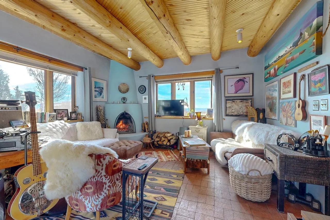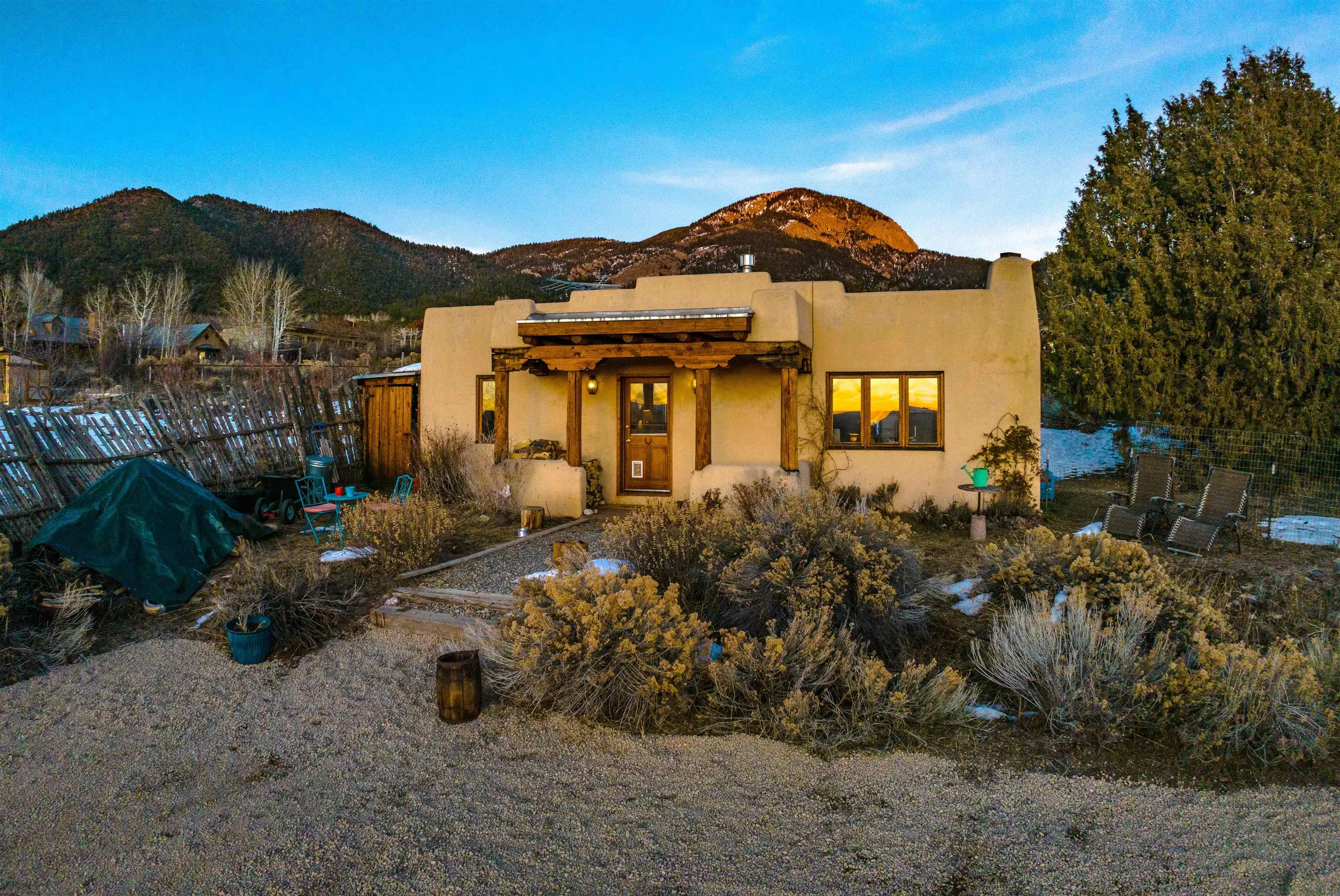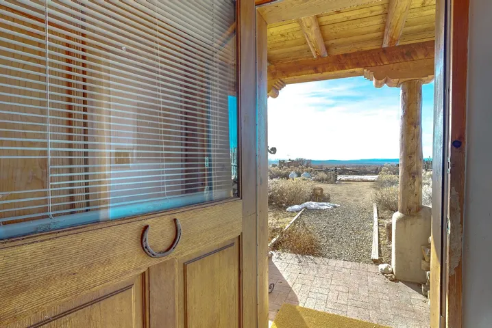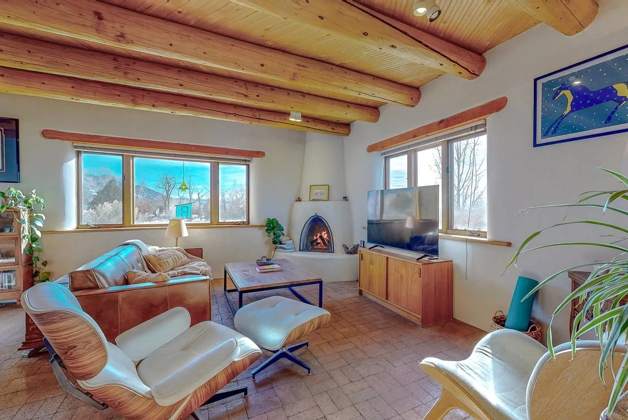 Authentic Adobe Home in Desirable El Salto with Casita & Mountain Views Nestled in the highly sought-after El Salto area, this authentic adobe-and-stucco property offers timeless Northern New Mexico charm amid breathtaking mountain views. The main residence features 2 bedrooms and 2 baths, complemented by a detached 1-bedroom, 1-bath casita — ideal for guests, rental income, studio space, or multigenerational living. Both structures are traditional adobe construction with classic stucco exteriors, reflecting the enduring architectural heritage of Taos. The main home showcases exposed vigas, tongue-and-groove wood ceilings, warm brick flooring, smooth plaster walls, and a charming kiva fireplace that anchors the living area. Expansive windows frame dramatic views of the surrounding mountains and mesa while filling the home with beautiful natural light throughout the day. The kitchen maintains regional character with handcrafted tile details and scenic outlooks. Bedrooms are tranquil and sun-filled, while bathrooms feature colorful tile accents consistent with classic Southwestern style. Outside, the property enjoys wide-open skies, mature trees, and a peaceful setting that captures the magic of El Salto. The detached casita offers privacy and versatility, making this property well-suited for full-time living, a part-time retreat, or investment potential. Located just minutes from the Village of Arroyo Seco with its charming shops, restaurants, galleries, and artisan culture. World-class skiing at Taos Ski Valley is only a short drive away, and the Historic Taos Plaza with additional dining and shopping options is conveniently close. A rare opportunity to own an authentic adobe home and casita in one of Taos’ most desirable and scenic locations. Don’t let this gem slip away! MATTERPORT VIDEO – CASITA https://my.matterport.com/show/?m=RUb6rfUrNaE DRONE VIDEO: https://vimeo.com/1164014754 Fire in fireplaces is virtually staged. Seasonal change photos are virtually staged.