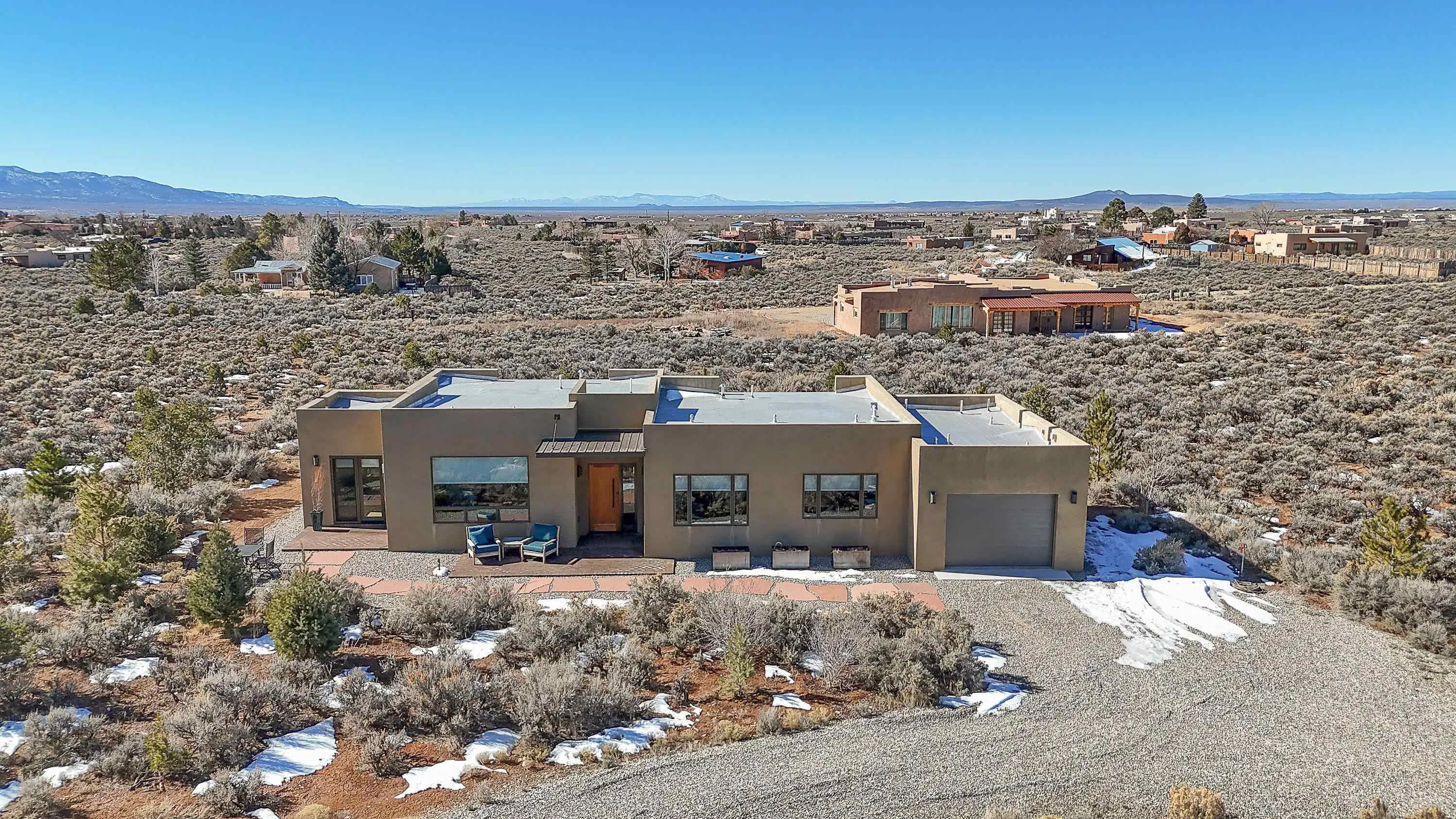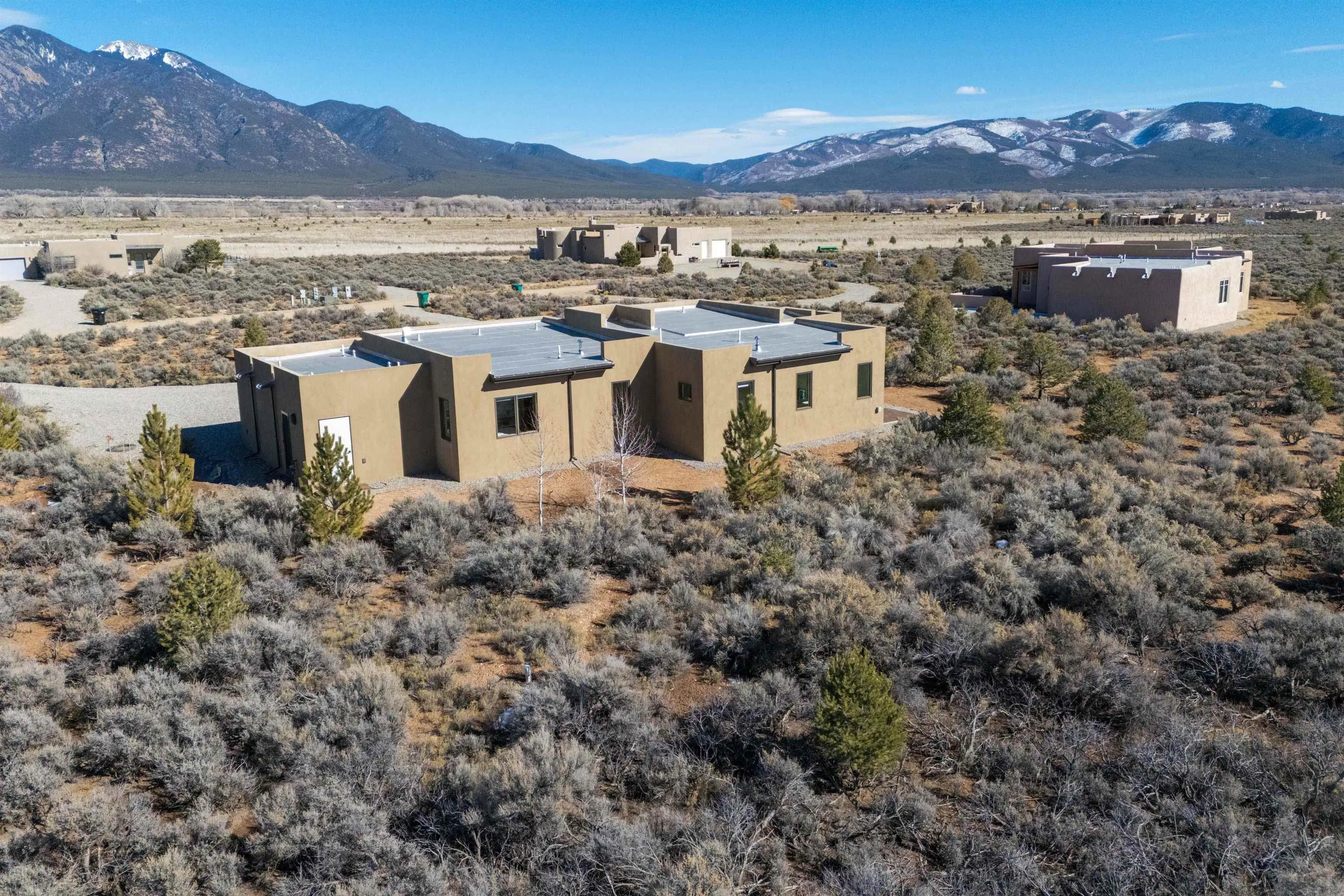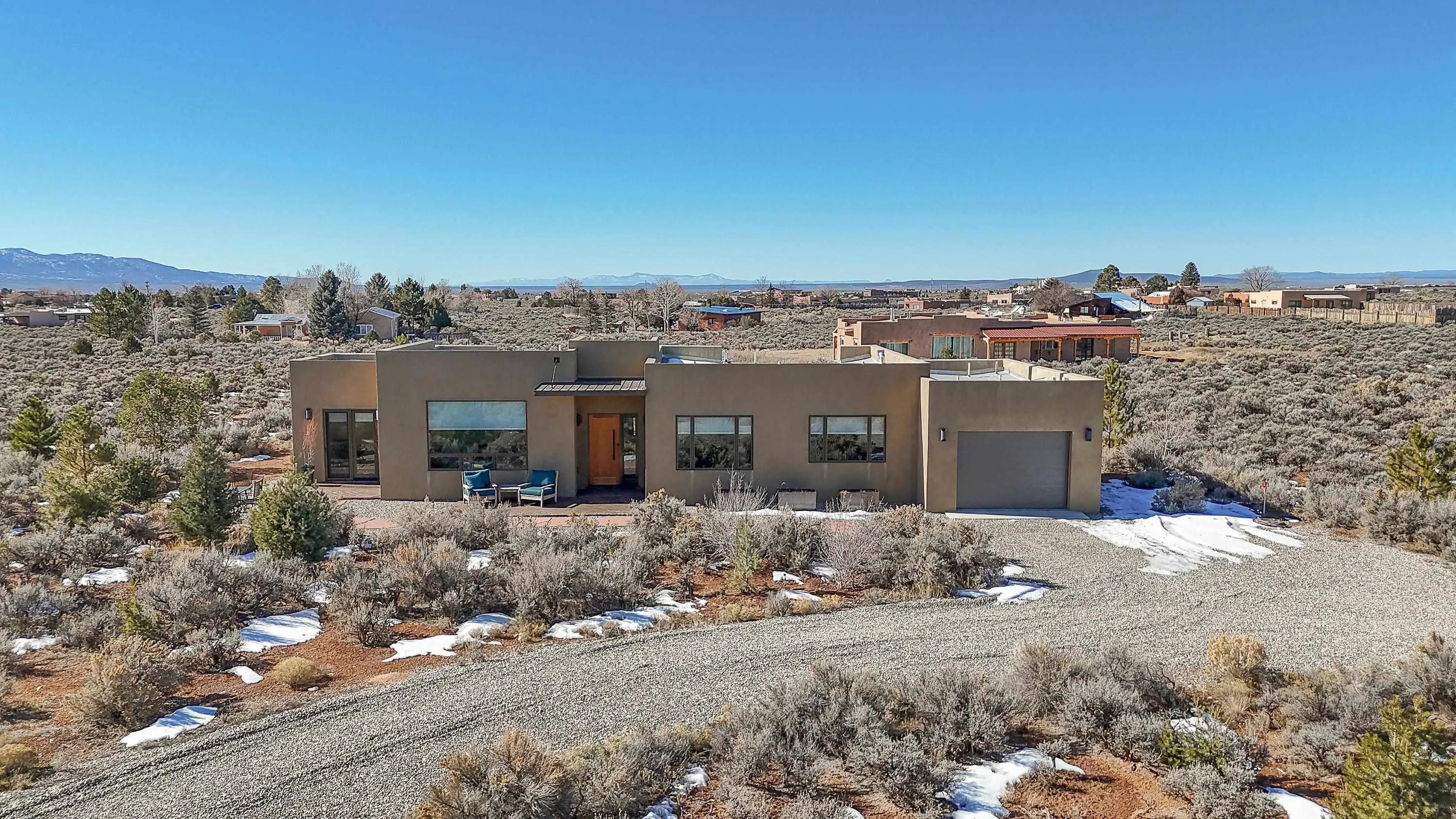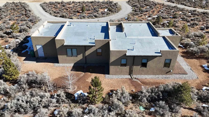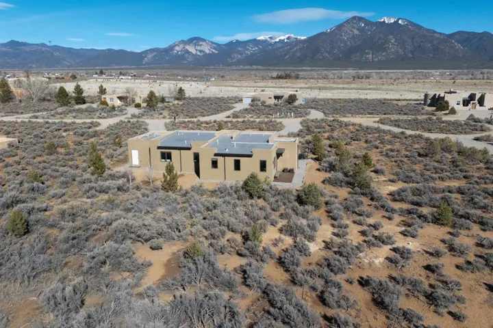 At the quiet end of a dead-end road, where the land opens into protected beauty and the sky feels endless, this contemporary Southwest residence offers a rare harmony of privacy, design, and place. Thoughtfully built just five years ago and maintained to the highest standard, the two-bedroom, two-bath home lives like new—radiant floor heat beneath your feet, a glowing gas Jotul fireplace anchoring the living space, and expansive windows framing the ever-changing drama of the Sangre de Cristo Mountains. Natural light moves effortlessly through the interiors, illuminating clean lines and warm, organic textures. The kitchen is exceptional—abundant custom storage, top-of-the-line Frigidaire Professional appliances, double wall ovens (convection), a convection microwave/oven combo, Zepher hood, 6 burner 36″ Thor gas Range top, a large custom-built island and a gracious layout designed for both intimate evenings and inspired entertaining. Every detail feels intentional. Every finish, timeless. There are custom details throughout and all systems are thoughtful and efficient including: water softener, reverse osmosis drinking system, on demand hot water heater, instant hot water for taps, multi zone radiant heating, including garage, dimmable LED lighting inside and out, fiber optic high speed internet with ethernet wall outlets, adjustable Elfa closet systems, automatic drip irrigation and a hot tub hookup. The Primary bedroom is bathed in natural light and graced with a spa-like bath and large walk-in closet and a sublime view of Pedernal on the horizon through the West facing windows. The guest bedroom is currently used as a fantastic Artist studio. A flexible bonus room offers the perfect setting for a private office, studio, or creative sanctuary. The attached heated garage adds everyday ease, while the home’s position contiguous to a conservation easement ensures lasting tranquility and gorgeous walks just out the front door. Step outside to miles of walking trails through open sage , where the landscape is preserved and the silence is sacred. Ideally located off the north end of Blueberry Hill, this property is perfectly poised between the cultural heartbeat of Taos and the alpine exhilaration of Taos Ski Valley. World-class skiing, rafting, biking, and hiking are all within effortless reach—yet home remains a peaceful retreat. Offered fully furnished with beautifully curated pieces that complement the architecture and light, this is more than a home. It is a turnkey expression of modern Southwest living—romantic, refined, and ready to be lived in beautifully.