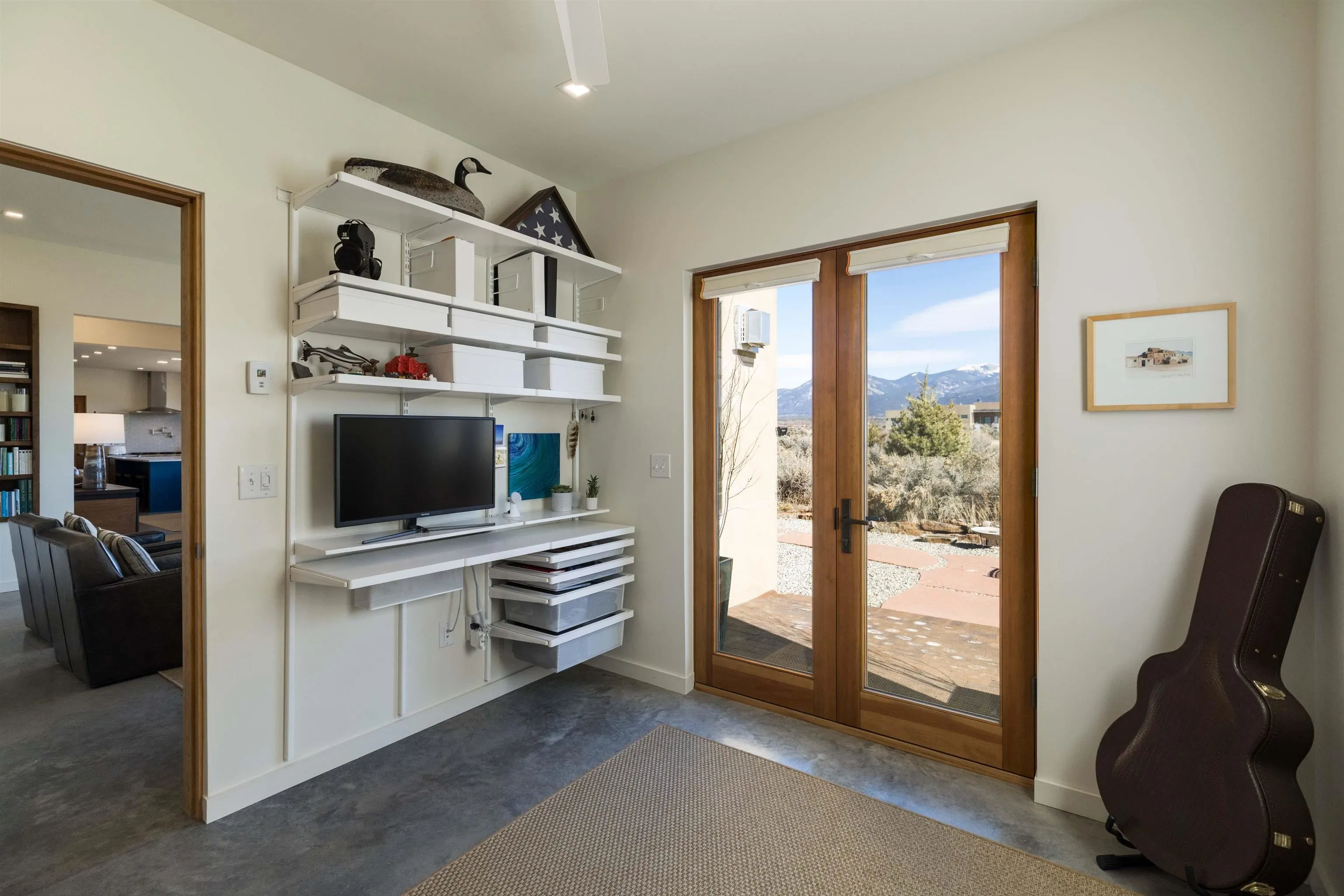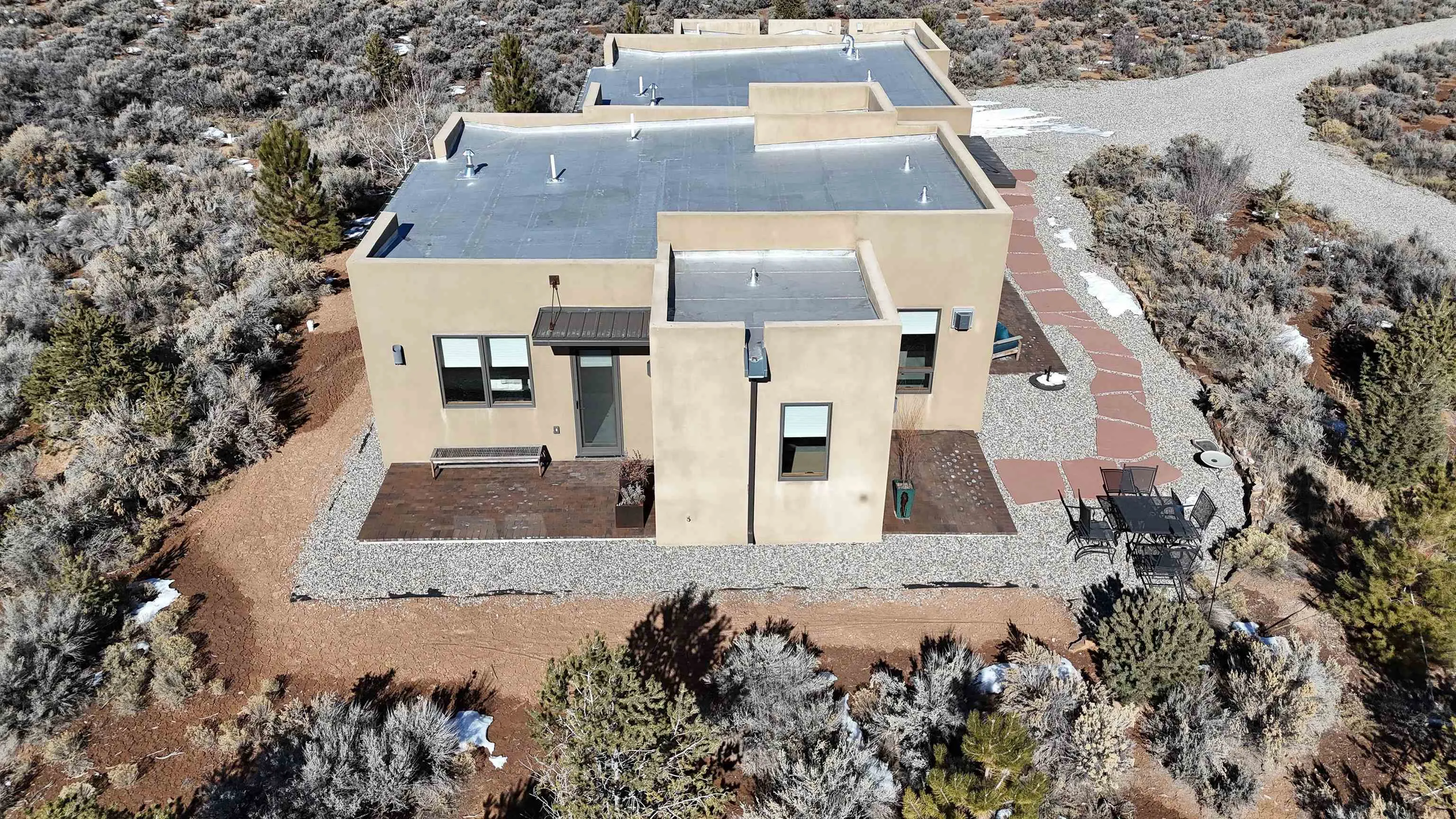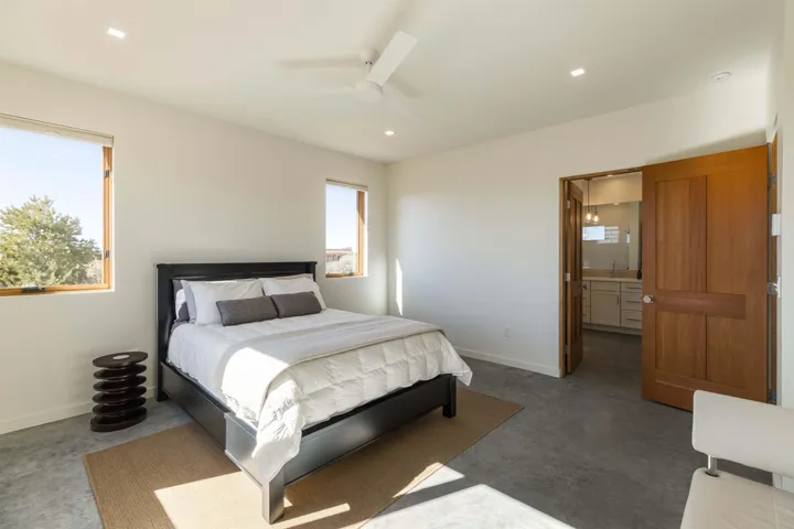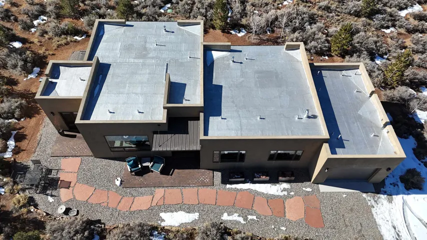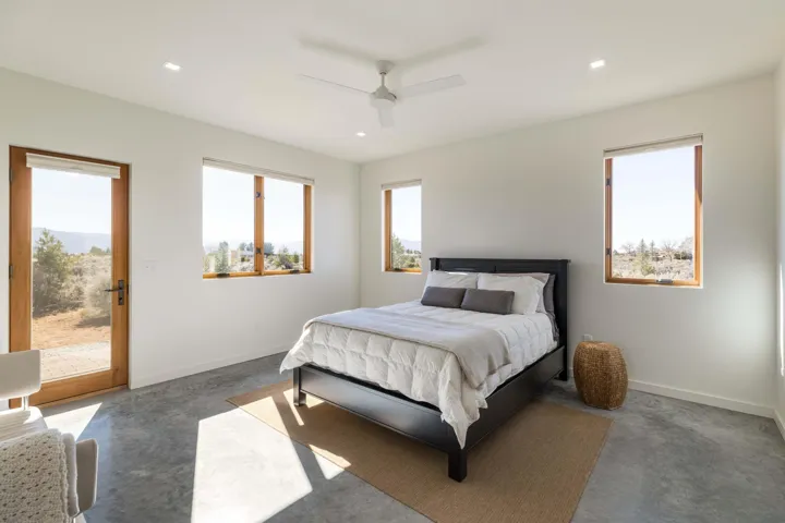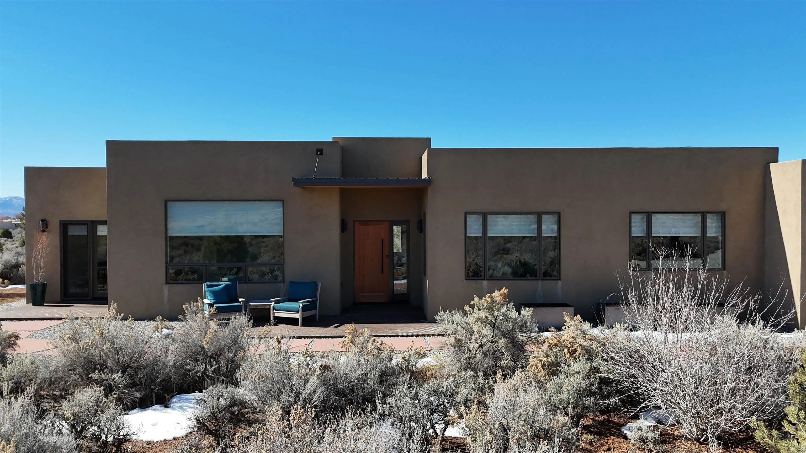 At the quiet end of a dead-end road, where the land opens into protected beauty and the sky feels endless, this contemporary Southwest residence offers a rare harmony of privacy, design, and place. Thoughtfully built just five years ago and maintained to the highest standard, the two-bedroom, two-bath home lives like new—radiant floor heat beneath your feet, a glowing gas Jotul fireplace anchoring the living space, and expansive windows framing the ever-changing drama of the Sangre de Cristo Mountains. Natural light moves effortlessly through the interiors, illuminating clean lines and warm, organic textures. The kitchen is exceptional—abundant custom storage, top-of-the-line Frigidaire Professional appliances, double wall ovens (convection), a convection microwave/oven combo, Zepher hood, 6 burner 36″ Thor gas Range top, a large custom-built island and a gracious layout designed for both intimate evenings and inspired entertaining. Every detail feels intentional. Every finish, timeless. There are custom details throughout and all systems are thoughtful and efficient including: water softener, reverse osmosis drinking system, on demand hot water heater, instant hot water for taps, multi zone radiant heating, including garage, dimmable LED lighting inside and out, fiber optic high speed internet with ethernet wall outlets, adjustable Elfa closet systems, automatic drip irrigation and a hot tub hookup. The Primary bedroom is bathed in natural light and graced with a spa-like bath and large walk-in closet and a sublime view of Pedernal on the horizon through the West facing windows. The guest bedroom is currently used as a fantastic Artist studio. A flexible bonus room offers the perfect setting for a private office, studio, or creative sanctuary. The attached heated garage adds everyday ease, while the home’s position contiguous to a conservation easement ensures lasting tranquility and gorgeous walks just out the front door. Step outside to miles of walking trails through open sage , where the landscape is preserved and the silence is sacred. Ideally located off the north end of Blueberry Hill, this property is perfectly poised between the cultural heartbeat of Taos and the alpine exhilaration of Taos Ski Valley. World-class skiing, rafting, biking, and hiking are all within effortless reach—yet home remains a peaceful retreat. Offered fully furnished with beautifully curated pieces that complement the architecture and light, this is more than a home. It is a turnkey expression of modern Southwest living—romantic, refined, and ready to be lived in beautifully.