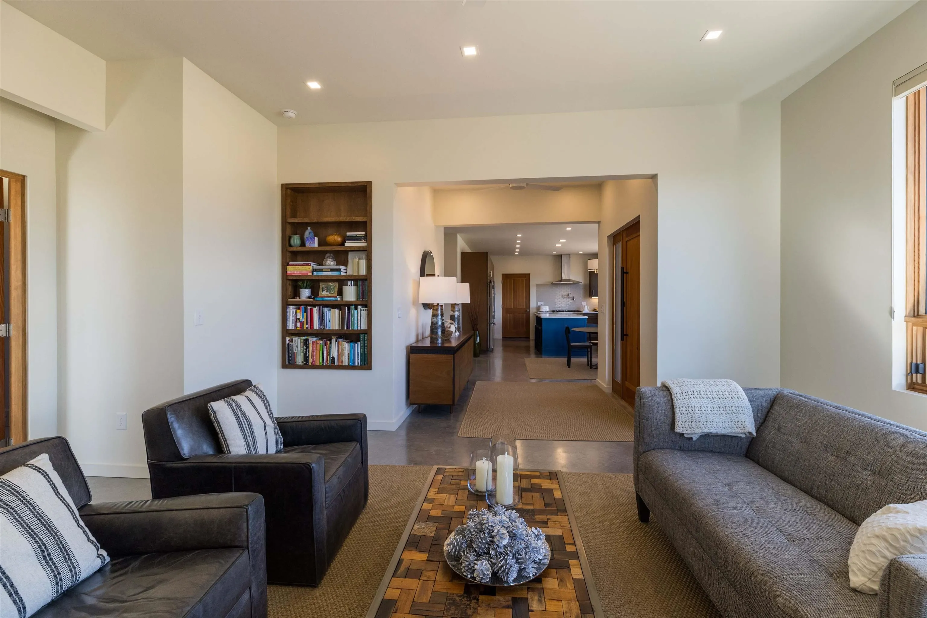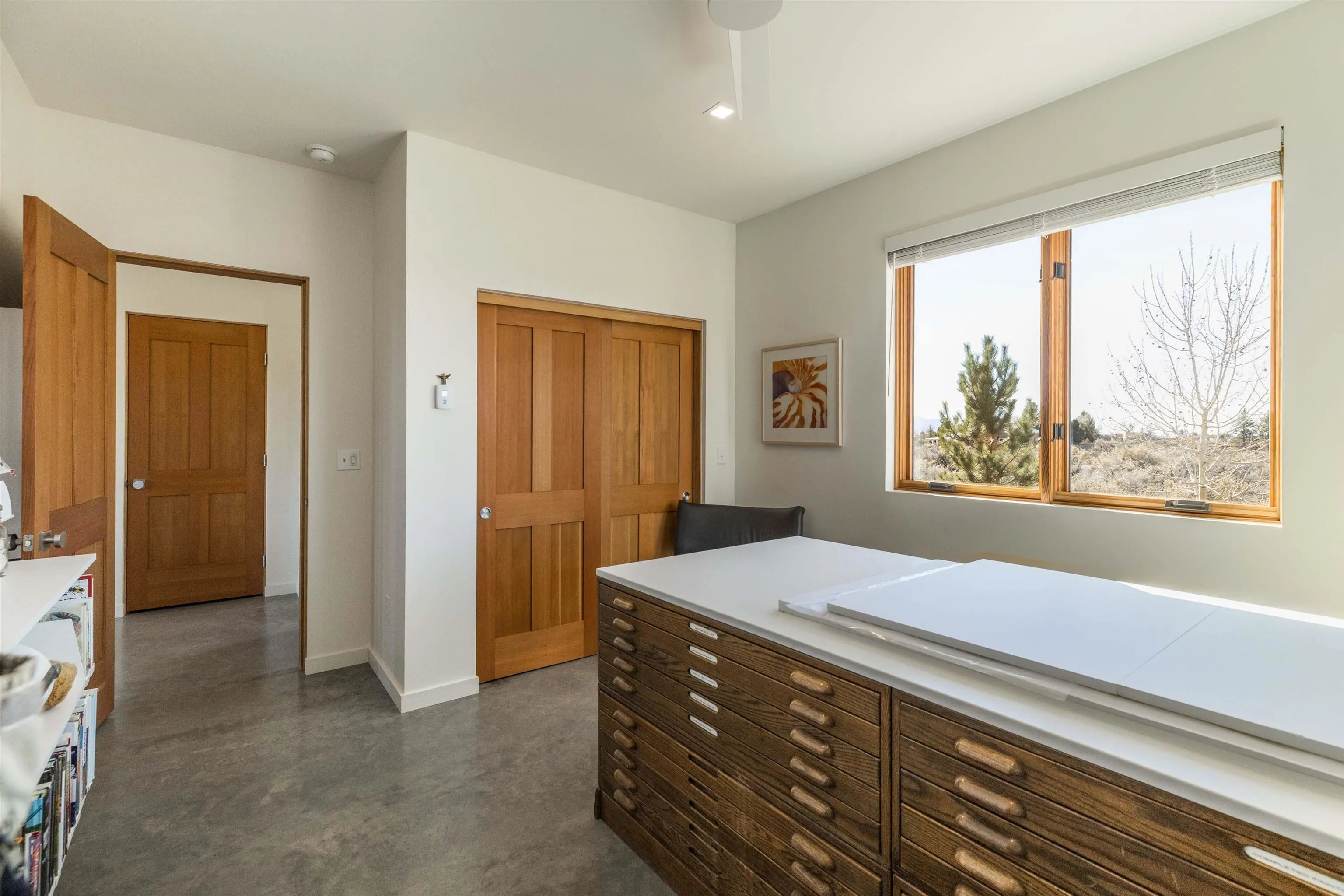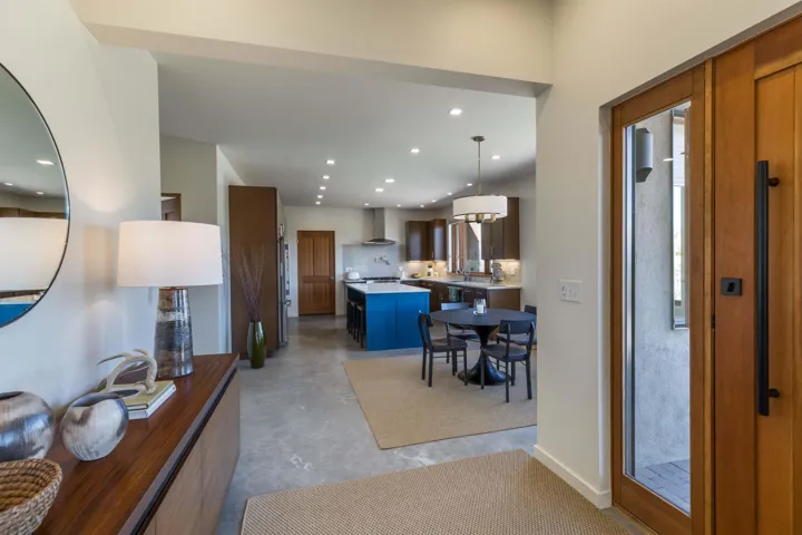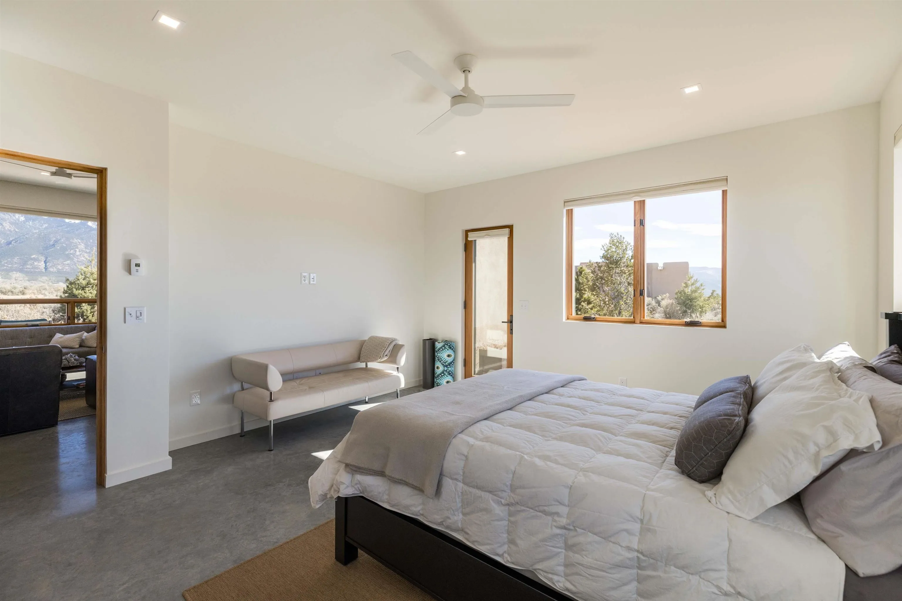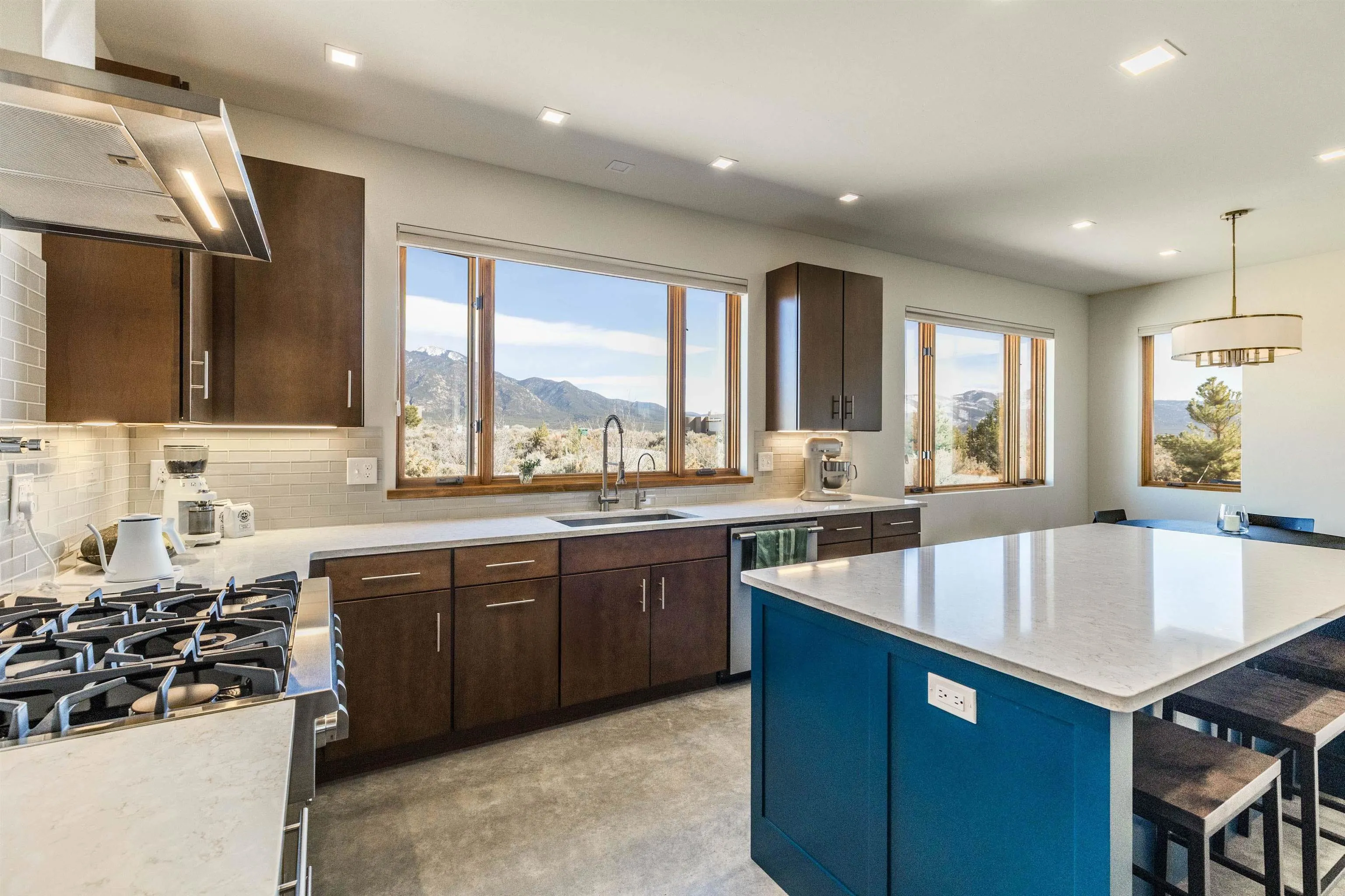 At the quiet end of a dead-end road, where the land opens into protected beauty and the sky feels endless, this contemporary Southwest residence offers a rare harmony of privacy, design, and place. Thoughtfully built just five years ago and maintained to the highest standard, the two-bedroom, two-bath home lives like new—radiant floor heat beneath your feet, a glowing gas Jotul fireplace anchoring the living space, and expansive windows framing the ever-changing drama of the Sangre de Cristo Mountains. Natural light moves effortlessly through the interiors, illuminating clean lines and warm, organic textures. The kitchen is exceptional—abundant custom storage, top-of-the-line Frigidaire Professional appliances, double wall ovens (convection), a convection microwave/oven combo, Zepher hood, 6 burner 36″ Thor gas Range top, a large custom-built island and a gracious layout designed for both intimate evenings and inspired entertaining. Every detail feels intentional. Every finish, timeless. There are custom details throughout and all systems are thoughtful and efficient including: water softener, reverse osmosis drinking system, on demand hot water heater, instant hot water for taps, multi zone radiant heating, including garage, dimmable LED lighting inside and out, fiber optic high speed internet with ethernet wall outlets, adjustable Elfa closet systems, automatic drip irrigation and a hot tub hookup. The Primary bedroom is bathed in natural light and graced with a spa-like bath and large walk-in closet and a sublime view of Pedernal on the horizon through the West facing windows. The guest bedroom is currently used as a fantastic Artist studio. A flexible bonus room offers the perfect setting for a private office, studio, or creative sanctuary. The attached heated garage adds everyday ease, while the home’s position contiguous to a conservation easement ensures lasting tranquility and gorgeous walks just out the front door. Step outside to miles of walking trails through open sage , where the landscape is preserved and the silence is sacred. Ideally located off the north end of Blueberry Hill, this property is perfectly poised between the cultural heartbeat of Taos and the alpine exhilaration of Taos Ski Valley. World-class skiing, rafting, biking, and hiking are all within effortless reach—yet home remains a peaceful retreat. Offered fully furnished with beautifully curated pieces that complement the architecture and light, this is more than a home. It is a turnkey expression of modern Southwest living—romantic, refined, and ready to be lived in beautifully.