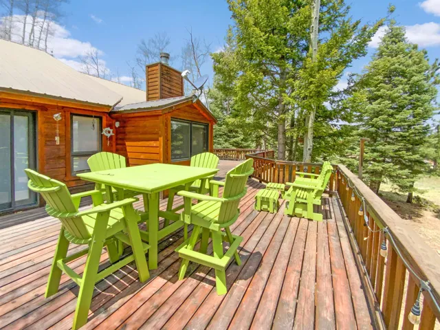 Welcome to your alpine retreat! This 4 bedroom, 4 bathroom, plus a large bunk room offers over 2,600 sq ft of rustic charm and comfort. Tucked among aspens, this home offers the perfect blend of comfort and convenience for your mountain adventures. The lower level is an ideal private suite, featuring a spacious bunk room, a convenient kitchenette, 2 full baths and an additional bedroom. This versatile space is perfect for accommodating friends, extended family, or even serving as a dedicated guest area. The oversized deck is wonderful for entertaining guests or simply unwinding. Imagine sipping your morning coffee surrounded by the beauty of the aspens and surrounding mountains or stargazing under the clear New Mexico sky. This home is perfectly situated just moments away from Angel Fire Resort’s PGA-rated 18-hole golf course and a short drive to the world-class ski mountain and bike park. With a flat driveway for easy access, and a spacious 2-car garage for all your outdoor gear, you’ll be ready for any adventure. From fishing and hiking to biking and snowshoeing, the best of Angel Fire’s outdoor activities are right at your fingertips. This home is a dream for large families or short-term rental investors, offering space, privacy, and a truly tranquil setting. Call us today to schedule a showing!
