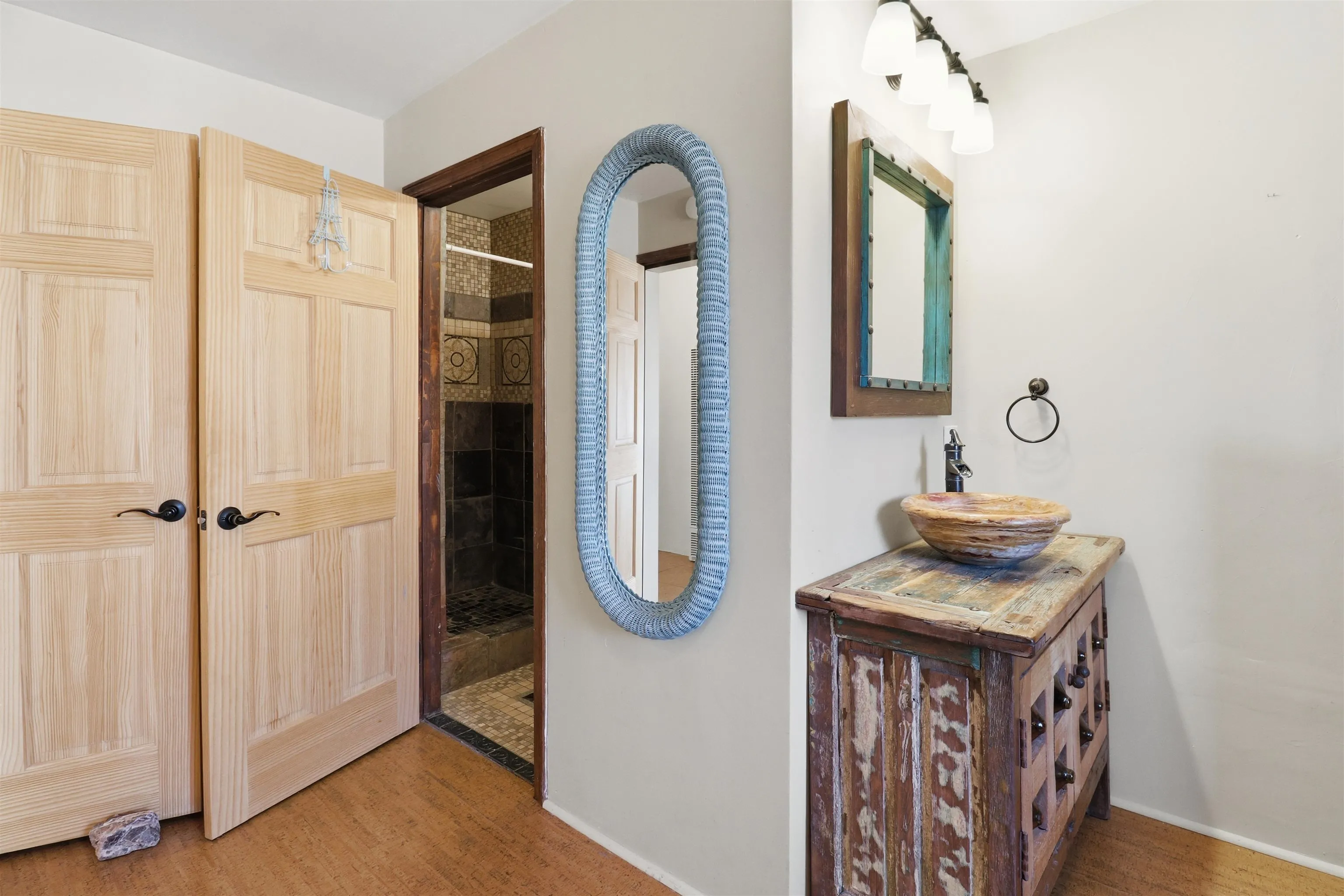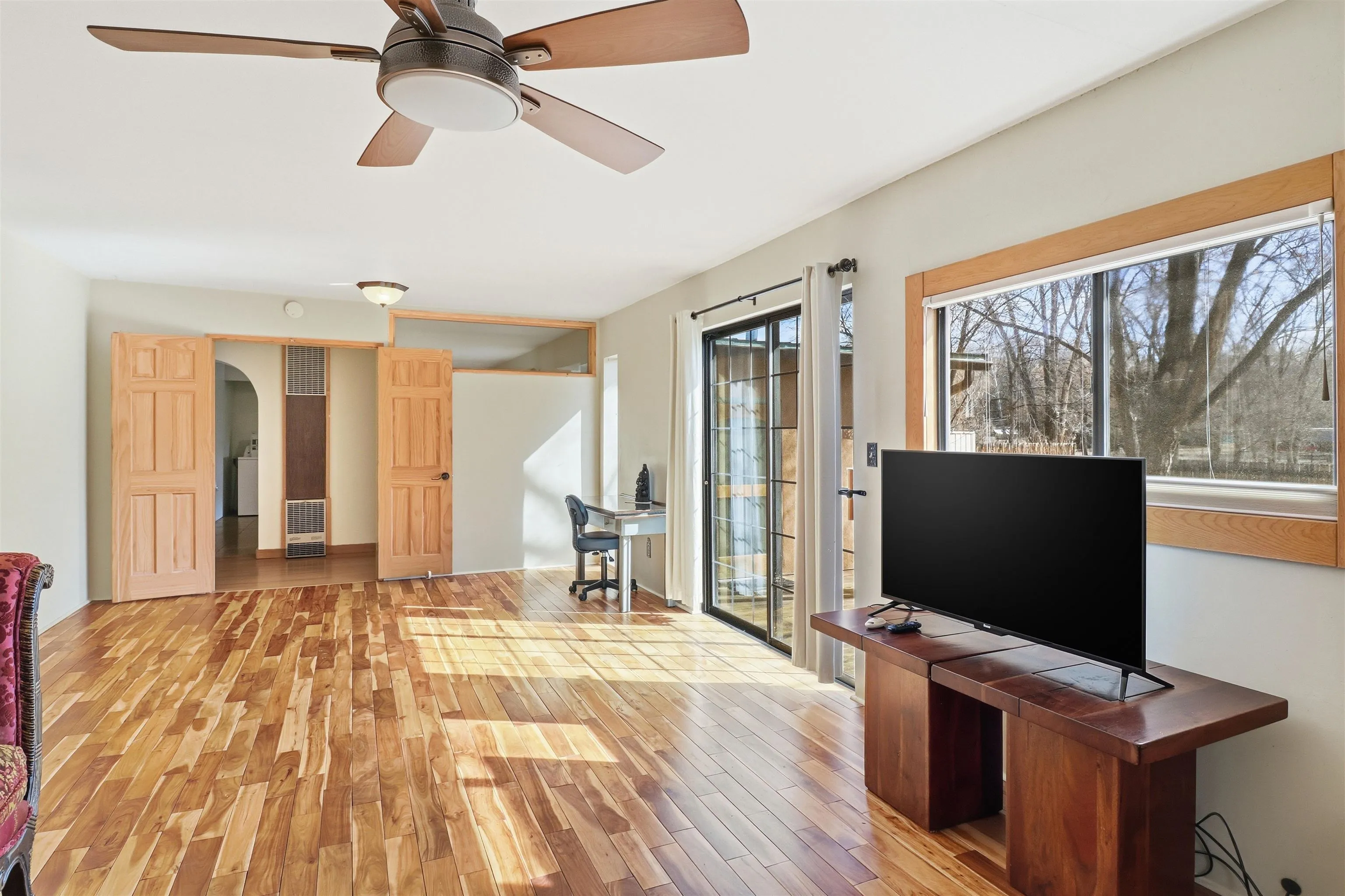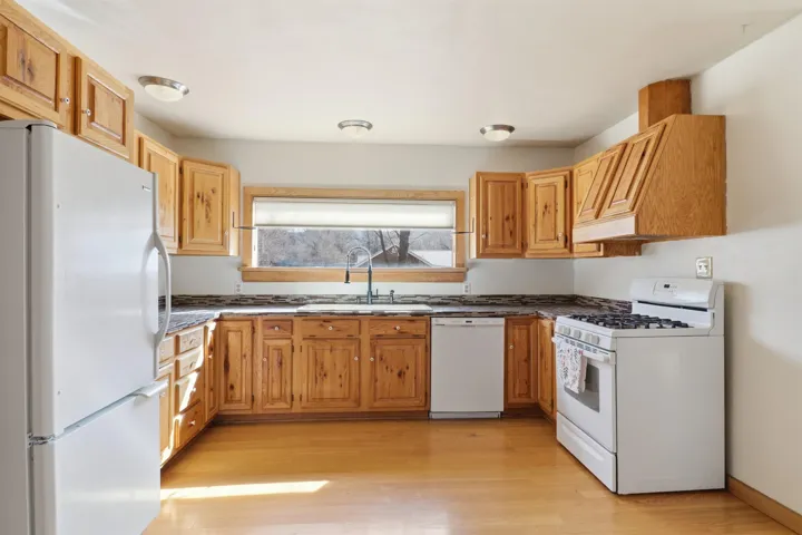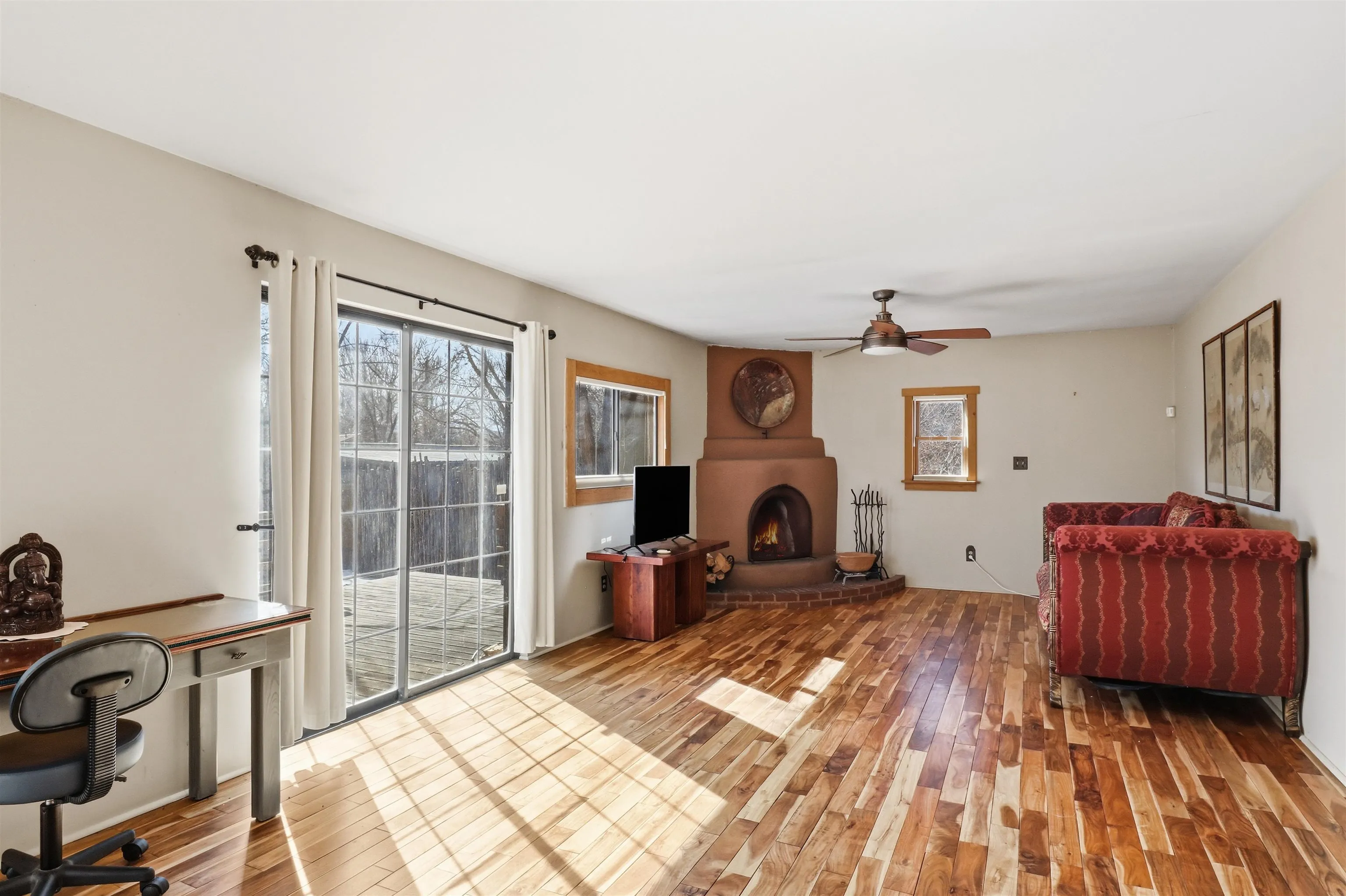 This charming DUPLEX at 104 Guthrie Lane #A & B, Taos, NM 87571 offers an exceptional opportunity for comfortable living with strong income-producing potential in a prime location just minutes from the center of Taos. The main house (#B) features a spacious eat-in kitchen with a separate pantry, lovely tile countertops, and serene garden views. The primary bedroom features cork flooring and an ensuite bathroom with beautiful tile accents. A second bedroom provides easy backyard access via a sliding glass door, a generous closet, and shares a full hall bath. The expansive living room showcases gorgeous wood floors and a cozy kiva fireplace, opening directly onto a large back deck perfect for relaxing or entertaining. An additional flexible living/multi-purpose room includes the washer/dryer and abundant space for a home office or studio. The attached guest house (#A) has proven itself as a reliable rental unit for years, delivering steady income. It features beautiful natural light, tile flooring, a fireplace, 2 bedrooms, a delightful 4-season sunroom, a fenced private courtyard, and its own storage shed—ideal for guests, long-term tenants, or vacation rentals. Outside, enjoy a large, fully fenced backyard—a gardener’s dream with ample space for planting, outdoor activities, or pets. A large detached oversized 2-car garage provides plenty of room for vehicles, workshops, projects, or extra storage. Sited on a generous corner lot (approximately half a acre) in a peaceful cul-de-sac, this property offers tranquility while being conveniently close to Taos’ shops, restaurants, galleries, and cultural attractions. Whether you’re seeking a primary residence with guest/income suite, a multi-generational setup, or an investment property with built-in rental history, this property has it covered. Don’t miss this rare combination of space, charm, and location!