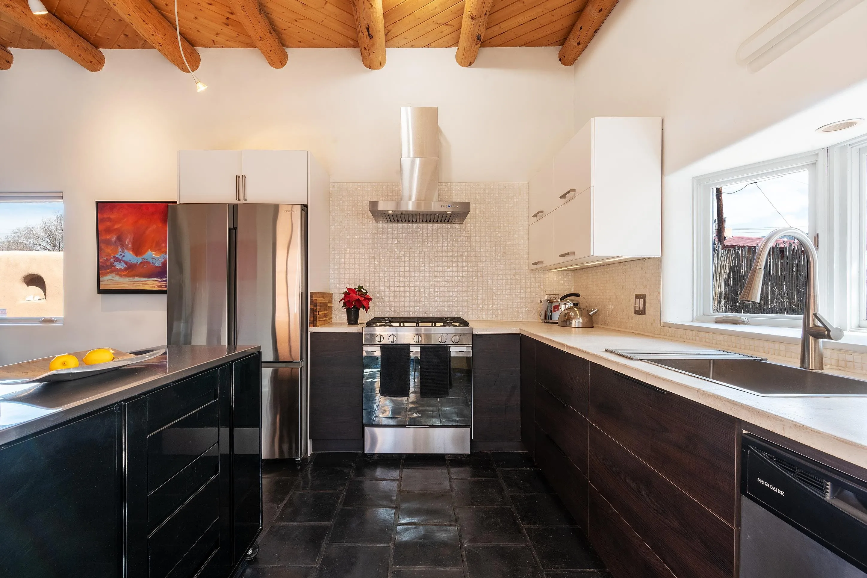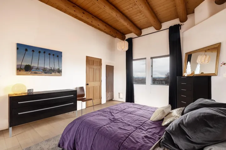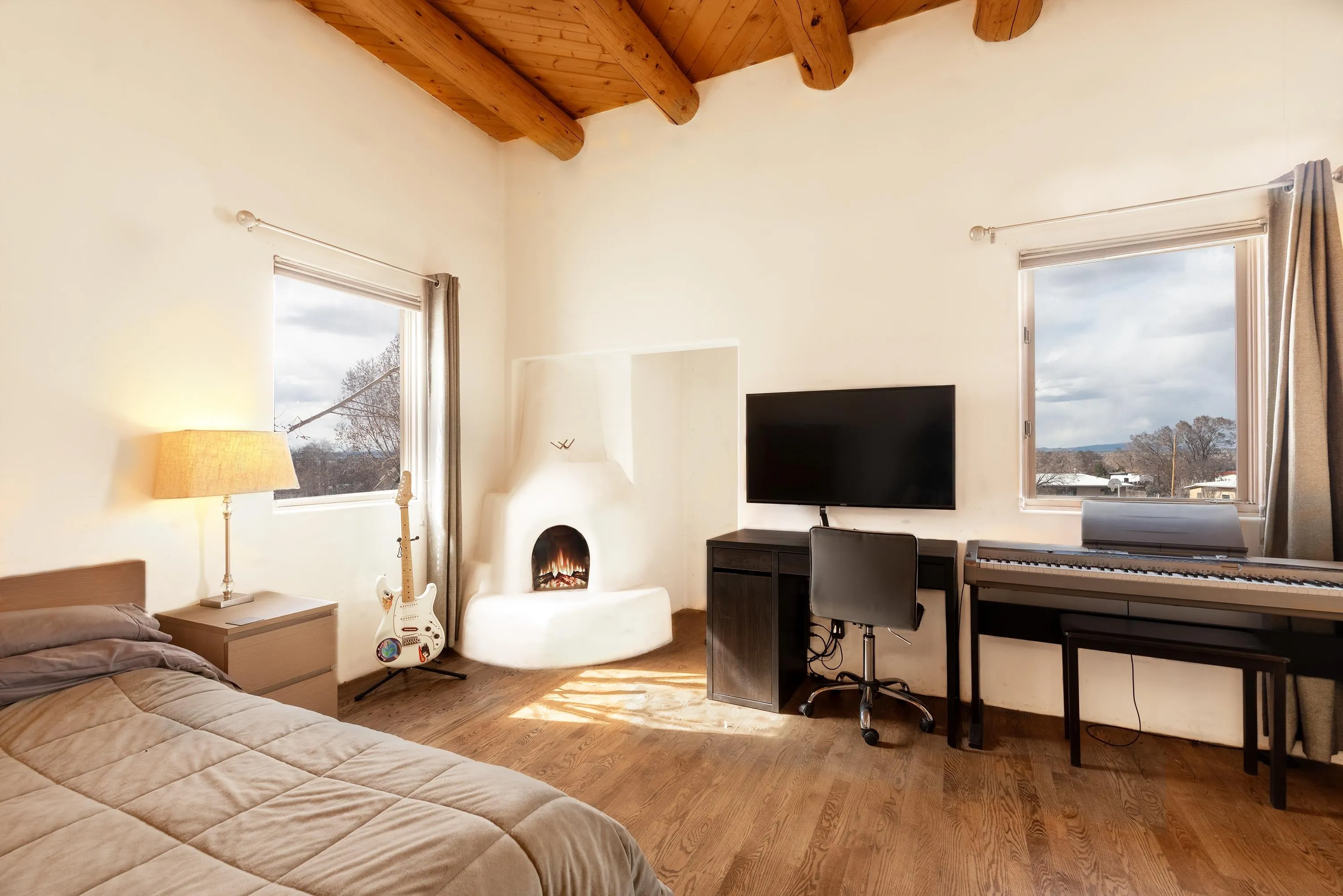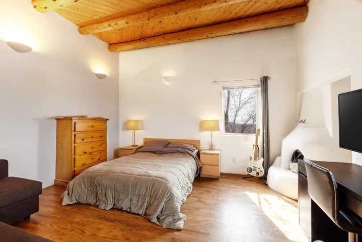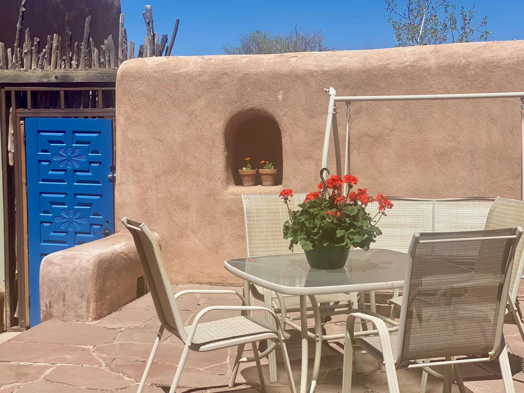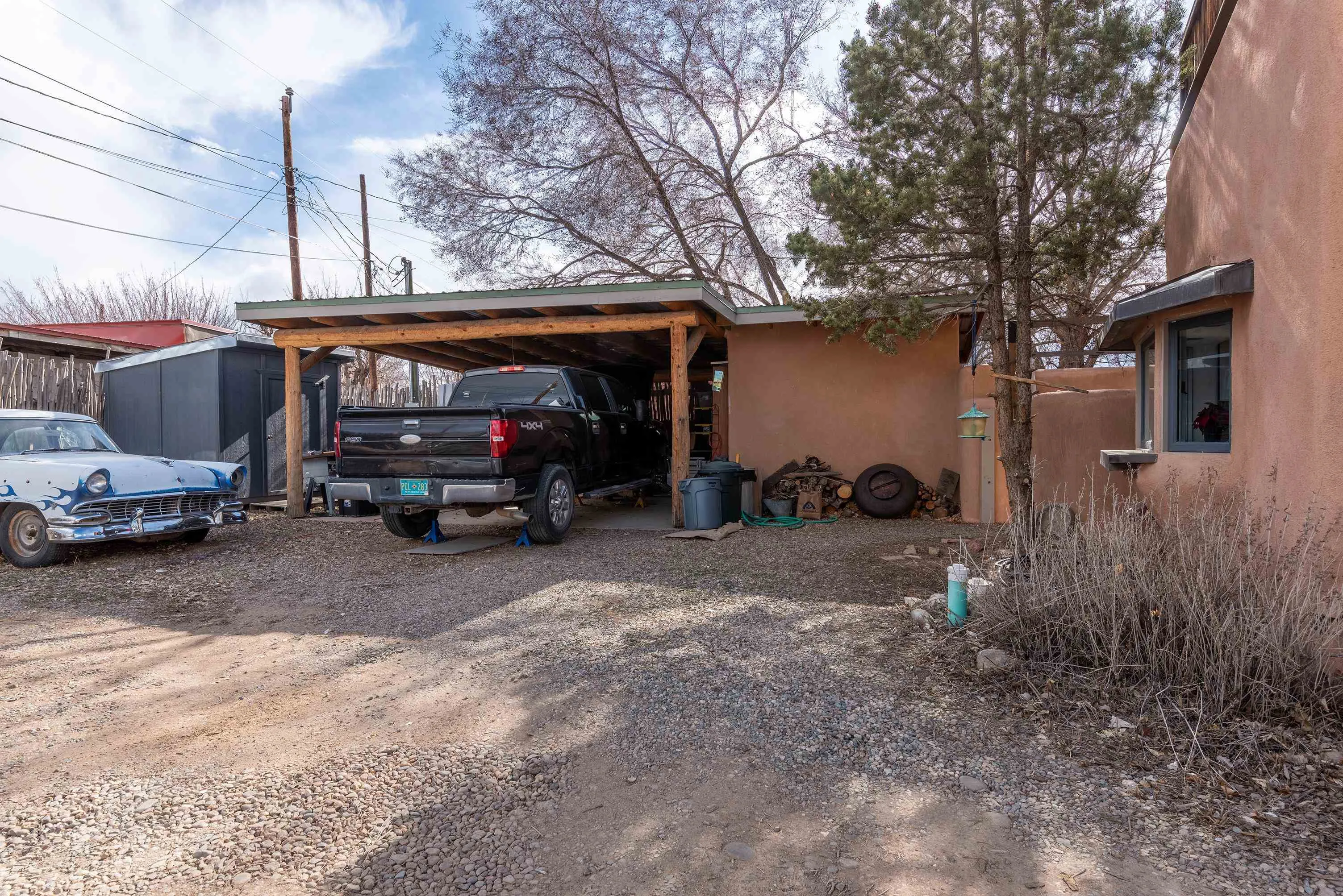 LIVE, WORK, CREATE!!!! Currently used as a working artists’ Gallery and Studio, has been an Antique store, retail, professional office, and even a mercantile in the past. A dream come true if you’re looking for an iconic Ranchos adobe! Behind the Blue Door is a walled flagstone patio creating a grand entryway. This 2319 sq ft adobe home has been tastefully renovated and modernized, preserving the original 1930’s feel with vigas and tongue and groove ceilings throughout. Saltillo tile floors are warmed by in-floor radiant heat. This home features two distinct living areas. The large, primary living area with wood floors southwestern style fireplace and bancos is currently used as a working artist’s studio and gallery with a reception area and private entrance. The other side of the soaring foyer leads to an open living room, warmed by a second fireplace, with dining room and newly renovated kitchen beyond. Double glass doors lead to an enclosed back courtyard ideal for entertaining. The downstairs includes a full bathroom and separate laundry room. Curving wooden stairs adorned with nichos lead to the two bedrooms. The primary bedroom has an attached bathroom and a private deck. A bedroom built-in and a large closet in the hall serve for ample wardrobe space. The third southwestern style fireplace is tucked in the corner of the comfortable guest bedroom. A gated drive-way along the north side of the home takes you to a detached two-car carport and workshop ideal for a second “maker space.” all on 0.184 acres