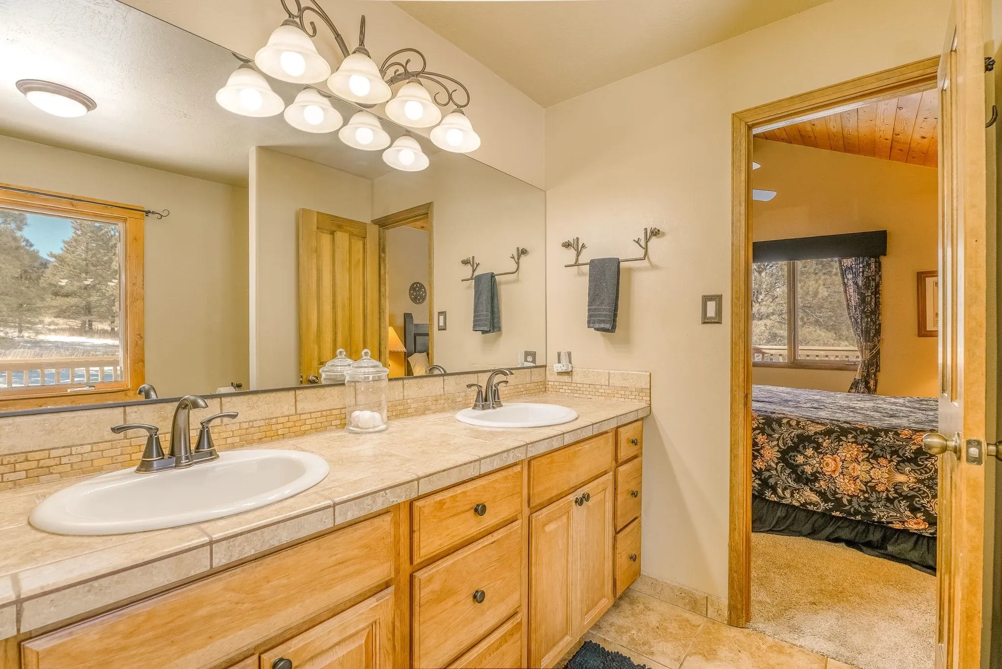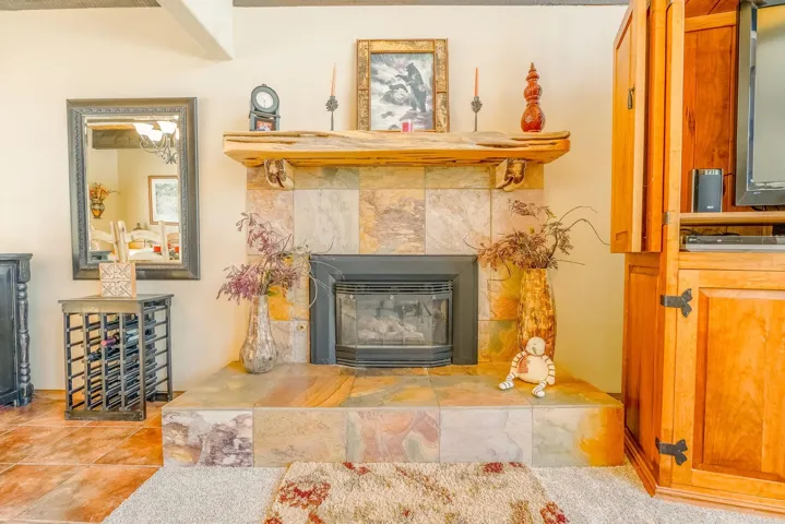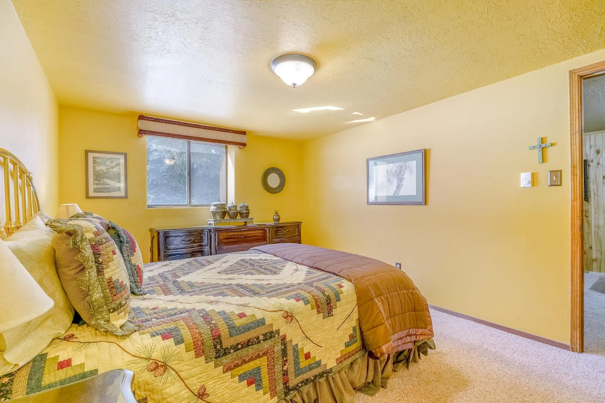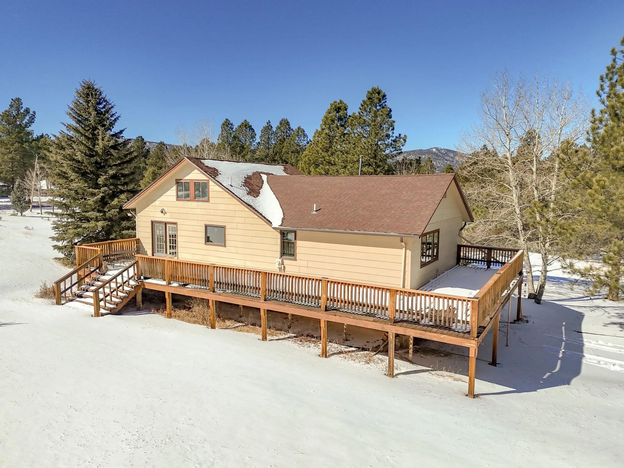 Comfortable mountain home on a level 1.8-acre lot with views of Wheeler Peak and easy year-round access. The main level features an open kitchen, living, and dining area with a dramatic window wall, vaulted tongue-and-groove ceilings, propane fireplace, and access to the deck for outdoor living and entertaining. The primary suite is on the main level along with a guest bedroom/office and half bath, creating flexible single-level living. The lower level offers a second living area, spacious guest bedroom, full bath, laundry, and access to the attached two-car garage. With a location near the base area, inside the Village, but outside the Resort, this home offers accessibility without the HOA! Located on a quiet road with a spacious yard, this property offers a great combination of privacy, views, and functionality right in Angel Fire.