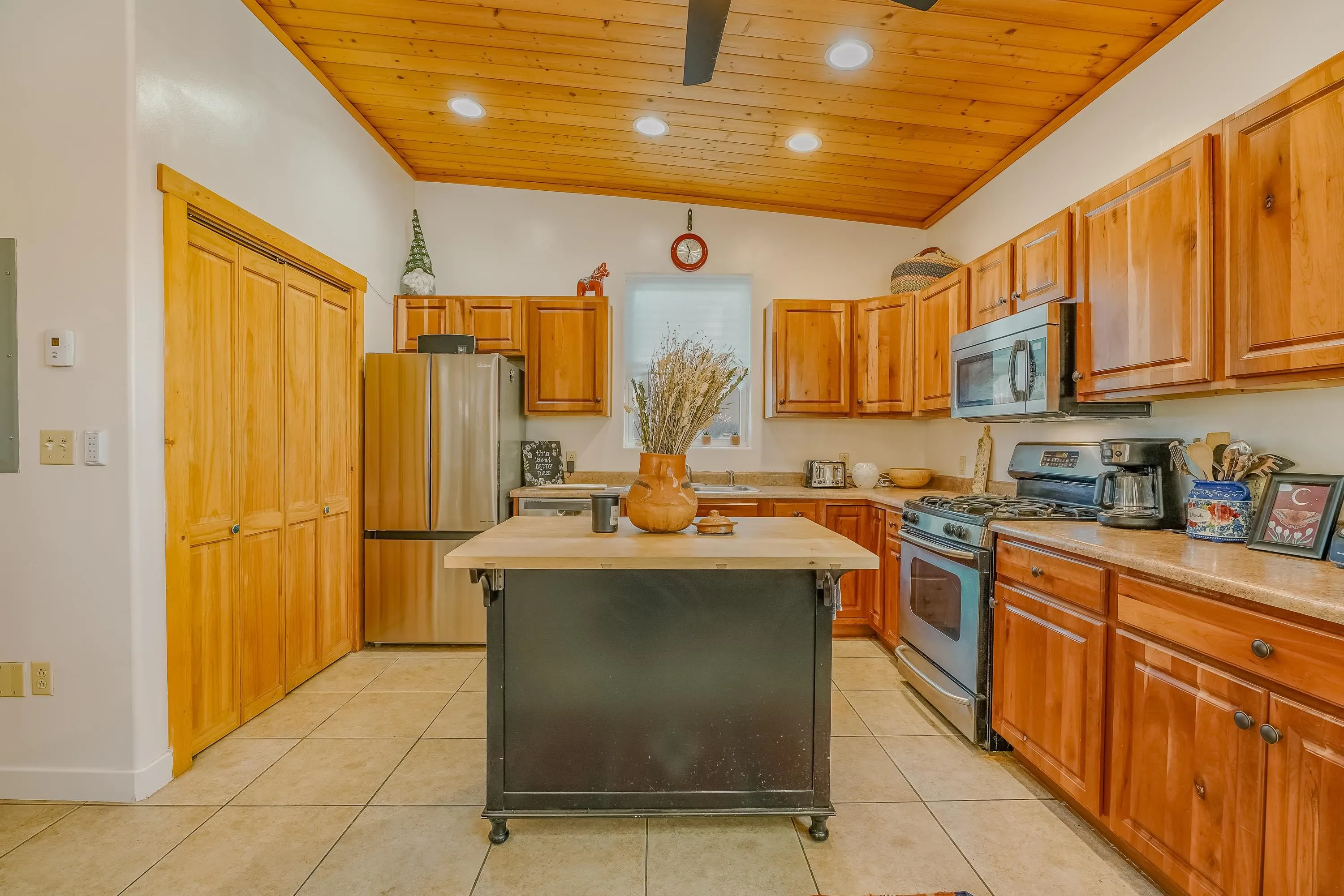Location, convenience, and the best floor plan you can ask for makes this home stand out! On a quiet dead-end street right in the middle of town, the home is just a few minutes walk away from the plaza, grocery stores, and local shops. Featuring two primary suite bedrooms positioned on opposite sides of the house, each with its own en-suite bathroom, making it ideal for owners and guests to enjoy their own private spaces. Next to both bathrooms there is generous built in cabinetry for all your home goods, clothes, and more. The living room is finished with soft wood touches, properly placed windows to maximize natural light and a sleek wood burning fireplace. Tile throughout the home makes the mud that we so love here in New Mexico easy to clean up! The kitchen is flexible and functional with a movable island that can be adjusted to fit the owner’s needs. An on-demand hot water system provides both domestic hot water and radiant floor heating throughout the home. Natural gas hookup keeps your monthly utility bills lower than the cost of your Sunday brunch. A stacked washer and dryer means no trip to the laundry mat. Out back, the enclosed backyard creates a private outdoor area with aspen trees and plenty enough space for a dining and grilling area under the portal. Mature landscaping around the property is maintained by the HOA, keeping the exterior looking clean and well cared for without the extra work that comes along with maintaining your own yard. Randall Lane is lined with tall drooping willows, elms, and cottonwoods making it a peaceful place to take a walk. Oh! And don’t forget that much for the furnishings and kitchen ware in the home will convey at the time of the sale; how about that for easy! Come see why this is a great spot to enjoy everything Taos has to offer just minutes away, while still feeling privately set back on a beautiful street with a winning floor plan.