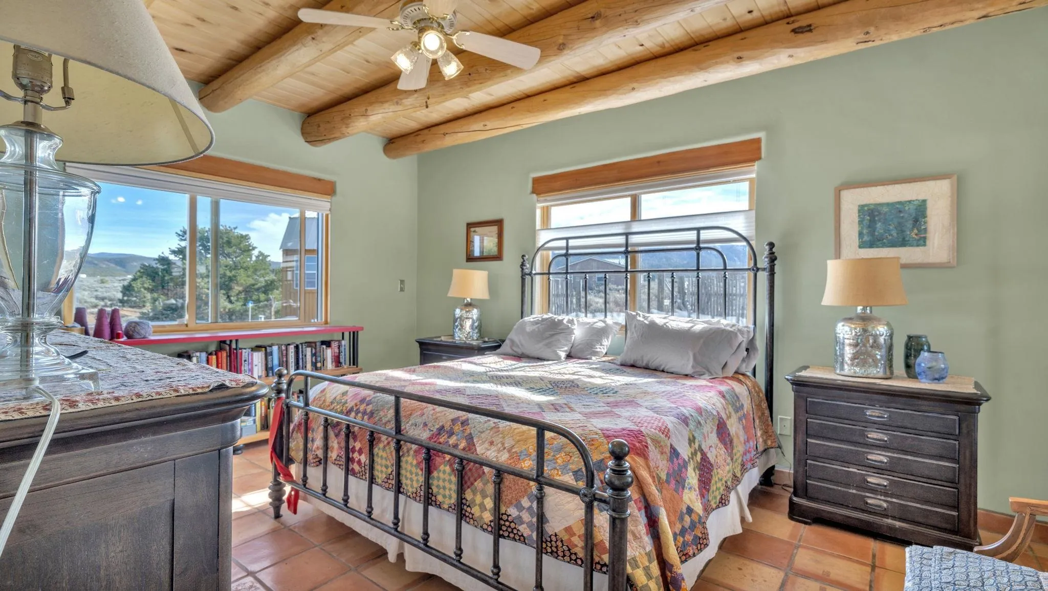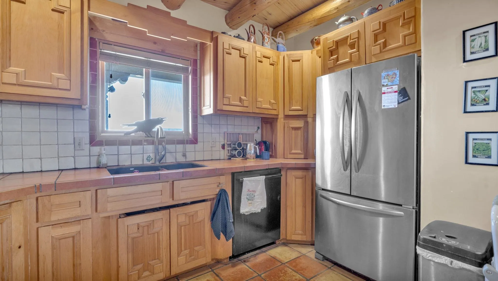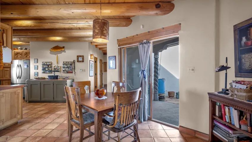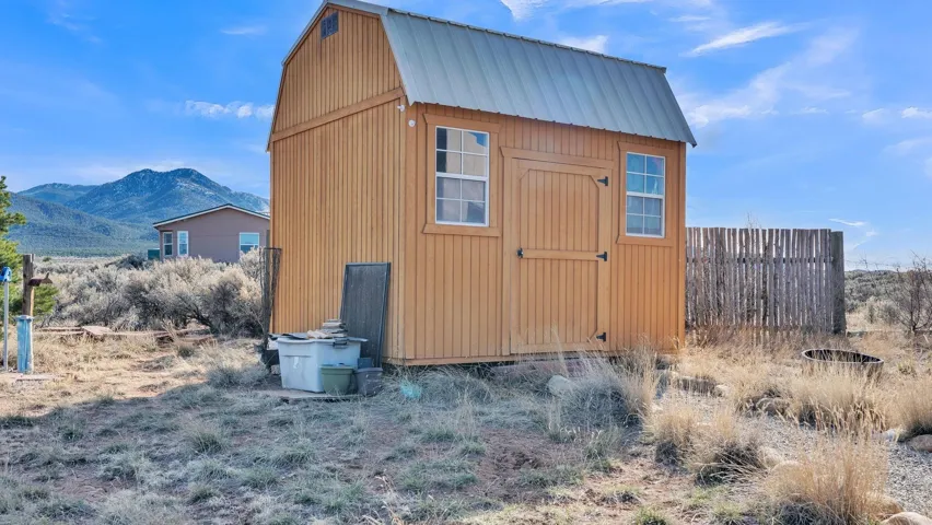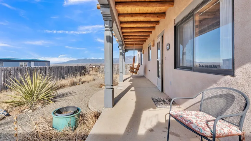 Mountain views take center stage at this spectacular Ranchos de Taos home, where epic vistas meet timeless Southwest charm. This spacious three-bedroom, two-full bath residence features a sunken living room with an inviting kiva fireplace, and saltillo tile floors throughout the home. The thoughtful split floor plan places the primary suite on the opposite side of the home from the guest bedrooms for added privacy. Step out onto the flagstone courtyard patio with trees to take in the vivid western sunsets and panoramic views. Outdoor walkways, a fully fenced yard, designated garden areas, a carport, and a large storage shed complete the property. Lovingly maintained and ideally located near the Taos golf course, and minutes from downtown Taos. This area offers plenty of hiking trails overlooking the Rio Grande, and of course the very epic sunsets. With 18 solar panels to offset your utility costs, a converted garage bonus room, and a tankless on-demand hot water heater, comfort meets efficiency. Discover the beauty of refined mountain living.