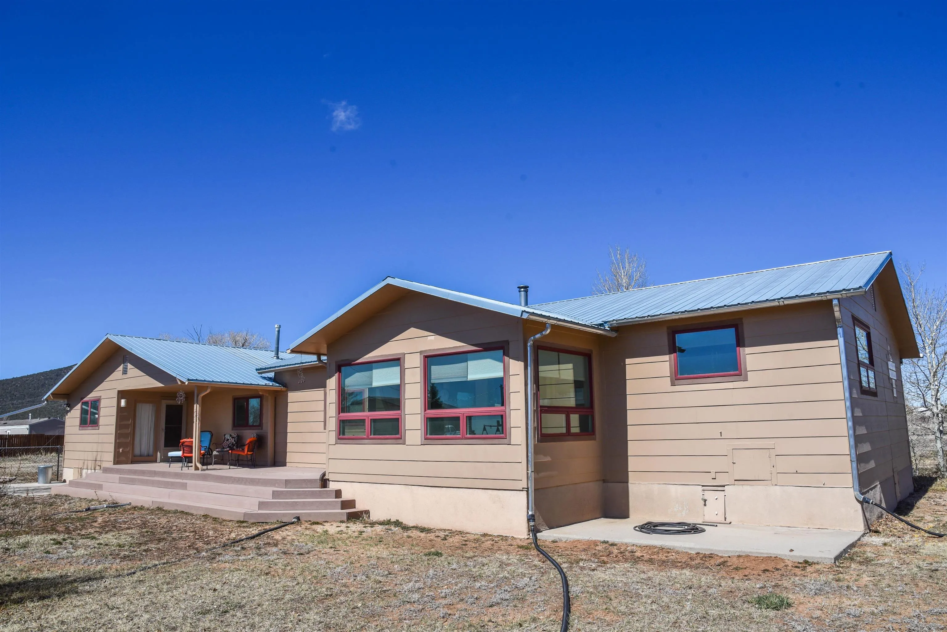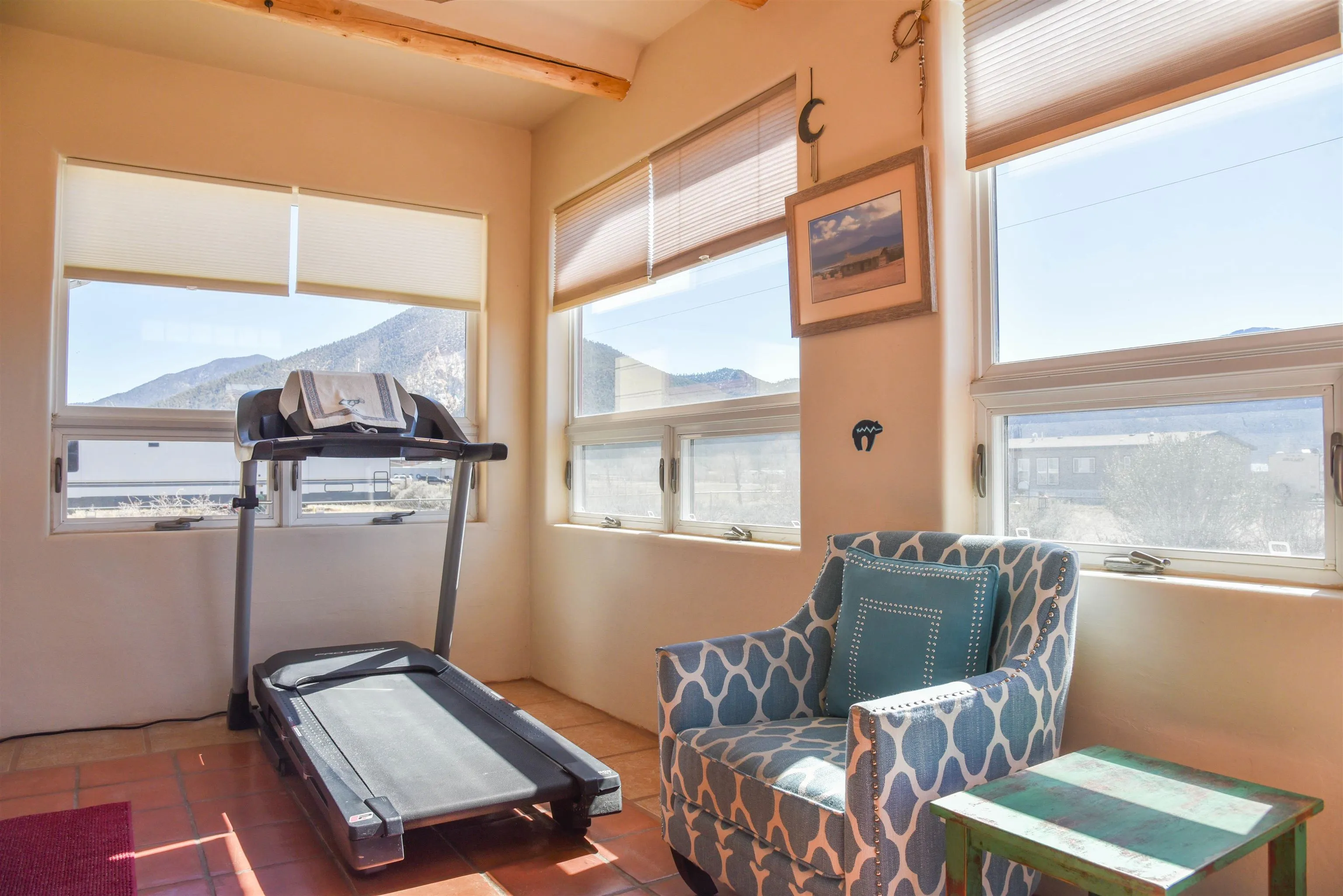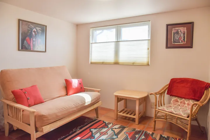 Upon entry into this charming, quaint single-level southwestern style home is the welcoming living room featuring a comfortable seating area, wood stove, gas stove, beautiful vigas and warm well-sought after saltilla tile throughout most of the home. Up the steps to your left is the bright well equipped kitchen with lots of storage and counterspace, a microwave, dishwasher, island, gas stove, new refrigerator (less than 1 yr old) and dining area/work space. Beyond the living room you’ll find the ever so warm and inviting sunroom/workout area that overlooks the Eastern mountains and the door leading to the back partially covered sunning deck. Deck is made of composite materials. To the right of the living area you’ll find the laundry room complete with a newer water-heater (less than 5 yrs old, a new washer/dryer set (less than 1 yr old), wash tub/sink and a great folding countertop area with plenty of cabinetry for storage. Continuing down the hallway to the left you’ll find the first guest bedroom with a futon that folds down into a full-sized bed, closet area and built in drawers for clothing/linen storage. Directly after, you’ll find the second bedroom currently used as another workout space also furnished with a closet space and built in drawers. Meanwhile across the hallway, you’ll find the full bath complete with a shower/tub combo, linen knook, vanity, and throne. Towards the back of the home, you will come across the TV room/sitting area, the door leading out the attached heated 2-car garage and the master bedroom suite. The master bedroom is large enough to house a king sized bed and nightstands with room to space! Special features are the gas stove, walk-in closet with plenty of hanging space, the large bathroom with walk-in shower, large vanity, throne. And a door leading to the covered portion of the backyard deck (composite) and backyard. Following the sidewath path to the West side of the property you’ll find a gate, and the 1500 sq ft. workshop with a single bay door and side entrance ready and willing for projects! On the roof of workshop is where the 6 paid off solar panels live. The yard of this home is completely fenced all the way around. Back at the house in the 2-car garage you’ll find a gas stove to heat the garage as well as a pantry/storage knook for any additional storage needs. This home is is currently on Fiber Optic Wi-Fi, Satellite TV and Solar. This home has gorgeous mountain views all around! Perfect for anyone looking to relocate or as an investment property whether short-term or long-rental!!! Selling mostly furnished. Priced to sell fast! Best deal on the market, schedule your showing today!!!