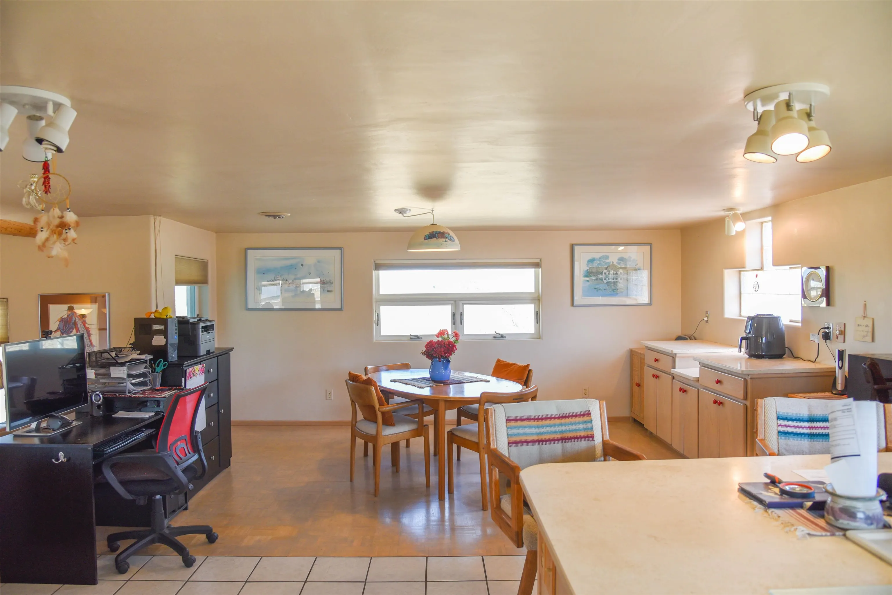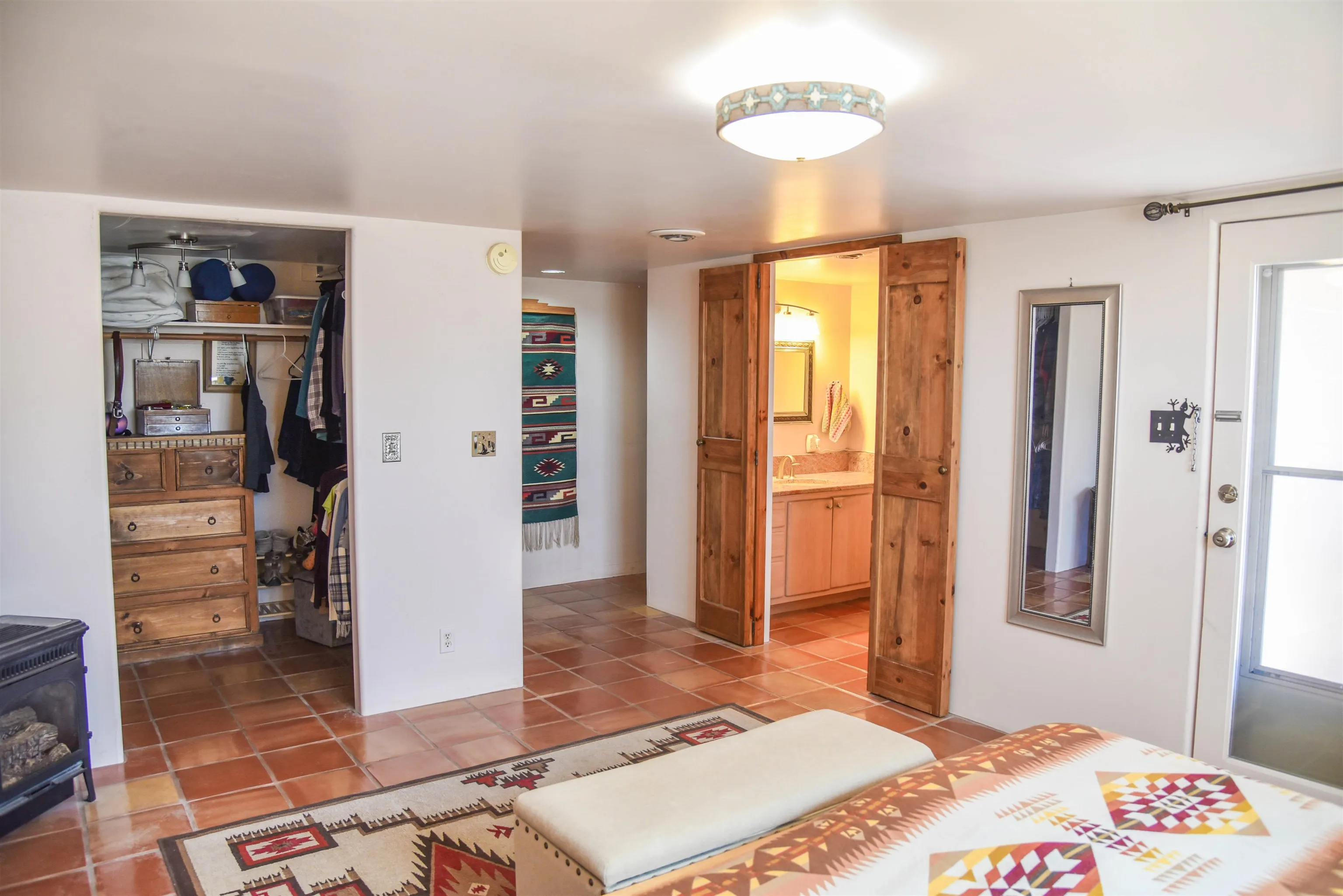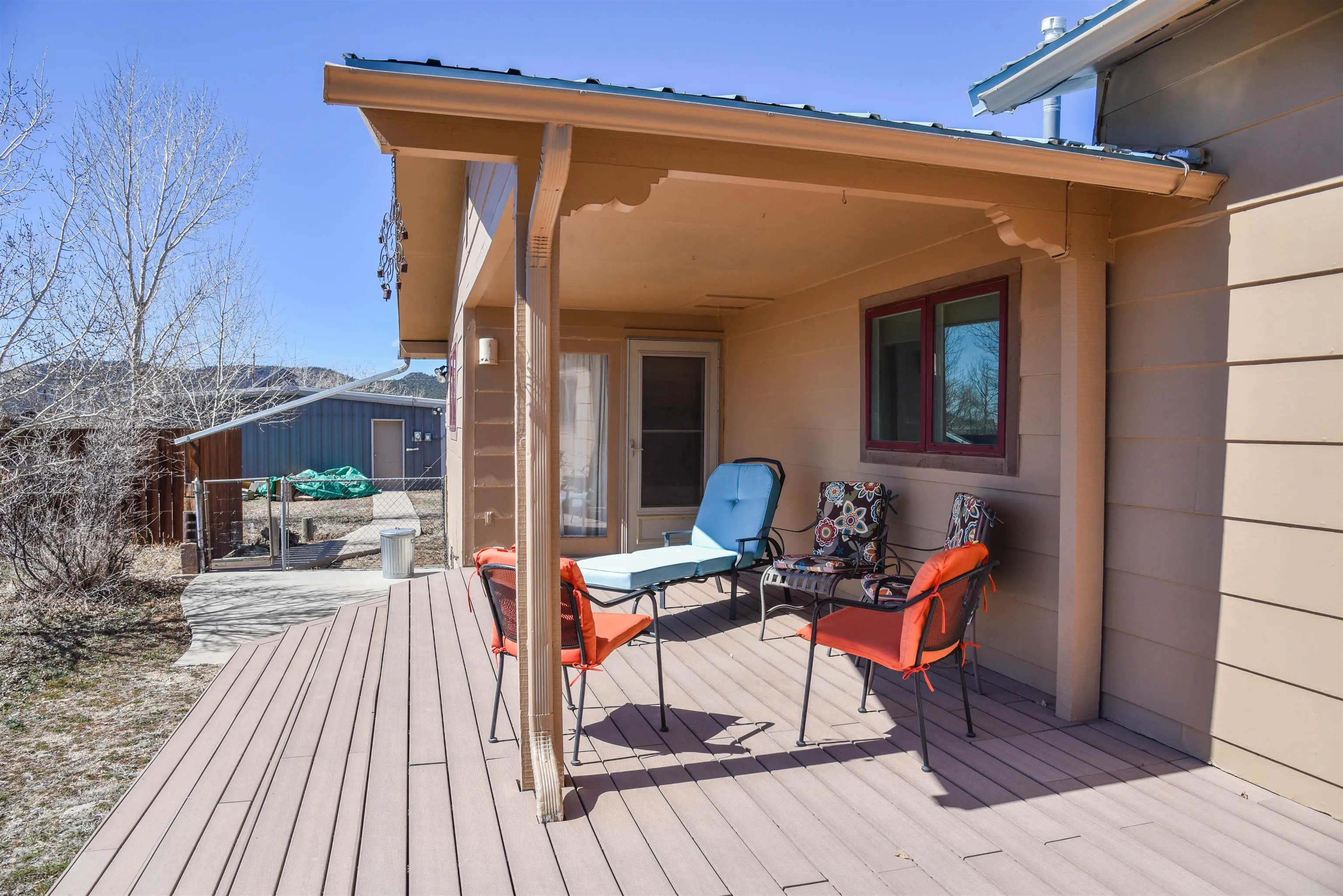 Upon entry into this charming, quaint single-level southwestern style home is the welcoming living room featuring a comfortable seating area, wood stove, gas stove, beautiful vigas and warm well-sought after saltilla tile throughout most of the home. Up the steps to your left is the bright well equipped kitchen with lots of storage and counterspace, a microwave, dishwasher, island, gas stove, new refrigerator (less than 1 yr old) and dining area/work space. Beyond the living room you’ll find the ever so warm and inviting sunroom/workout area that overlooks the Eastern mountains and the door leading to the back partially covered sunning deck. Deck is made of composite materials. To the right of the living area you’ll find the laundry room complete with a newer water-heater (less than 5 yrs old, a new washer/dryer set (less than 1 yr old), wash tub/sink and a great folding countertop area with plenty of cabinetry for storage. Continuing down the hallway to the left you’ll find the first guest bedroom with a futon that folds down into a full-sized bed, closet area and built in drawers for clothing/linen storage. Directly after, you’ll find the second bedroom currently used as another workout space also furnished with a closet space and built in drawers. Meanwhile across the hallway, you’ll find the full bath complete with a shower/tub combo, linen knook, vanity, and throne. Towards the back of the home, you will come across the TV room/sitting area, the door leading out the attached heated 2-car garage and the master bedroom suite. The master bedroom is large enough to house a king sized bed and nightstands with room to space! Special features are the gas stove, walk-in closet with plenty of hanging space, the large bathroom with walk-in shower, large vanity, throne. And a door leading to the covered portion of the backyard deck (composite) and backyard. Following the sidewath path to the West side of the property you’ll find a gate, and the 1500 sq ft. workshop with a single bay door and side entrance ready and willing for projects! On the roof of workshop is where the 6 paid off solar panels live. The yard of this home is completely fenced all the way around. Back at the house in the 2-car garage you’ll find a gas stove to heat the garage as well as a pantry/storage knook for any additional storage needs. This home is is currently on Fiber Optic Wi-Fi, Satellite TV and Solar. This home has gorgeous mountain views all around! Perfect for anyone looking to relocate or as an investment property whether short-term or long-rental!!! Selling mostly furnished. Priced to sell fast! Best deal on the market, schedule your showing today!!!