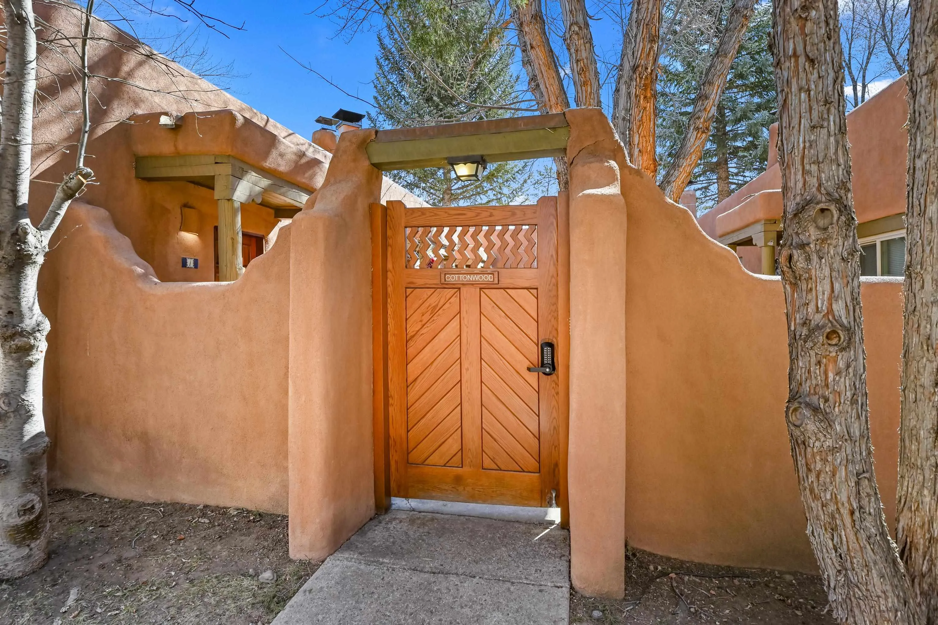 Tucked within a gated courtyard of the La Buena Vida condominium community, Cottonwood #4 offers classic Taos character in an exceptionally convenient location just moments from the historic Taos Plaza and Kit Carson Park. This thoughtfully maintained one-bedroom, one-bath residence offers approximately 544 square feet of comfortable living, filled with natural light and authentic Southwest details. High ceilings with hand-hewn vigas, a traditional kiva fireplace, and pueblo-style architectural elements create a warm sense of place that feels distinctly Taos. The efficient floor plan makes excellent use of the space, with an open living area, a well-appointed kitchen, and a comfortable bedroom with generous storage. Lovingly cared for by the current owner, the home is move-in ready while retaining the charm and character that define the community. La Buena Vida is known for its lush, well-tended grounds and mature shade trees, creating a peaceful setting behind its secure courtyard entrance. From here, some of Taos’ favorite restaurants, coffee shops, galleries, and local events are just a short stroll away. Whether as a full-time residence, weekend retreat, or long-term investment, Cottonwood #4 offers an inviting opportunity to enjoy life in the heart of Taos.