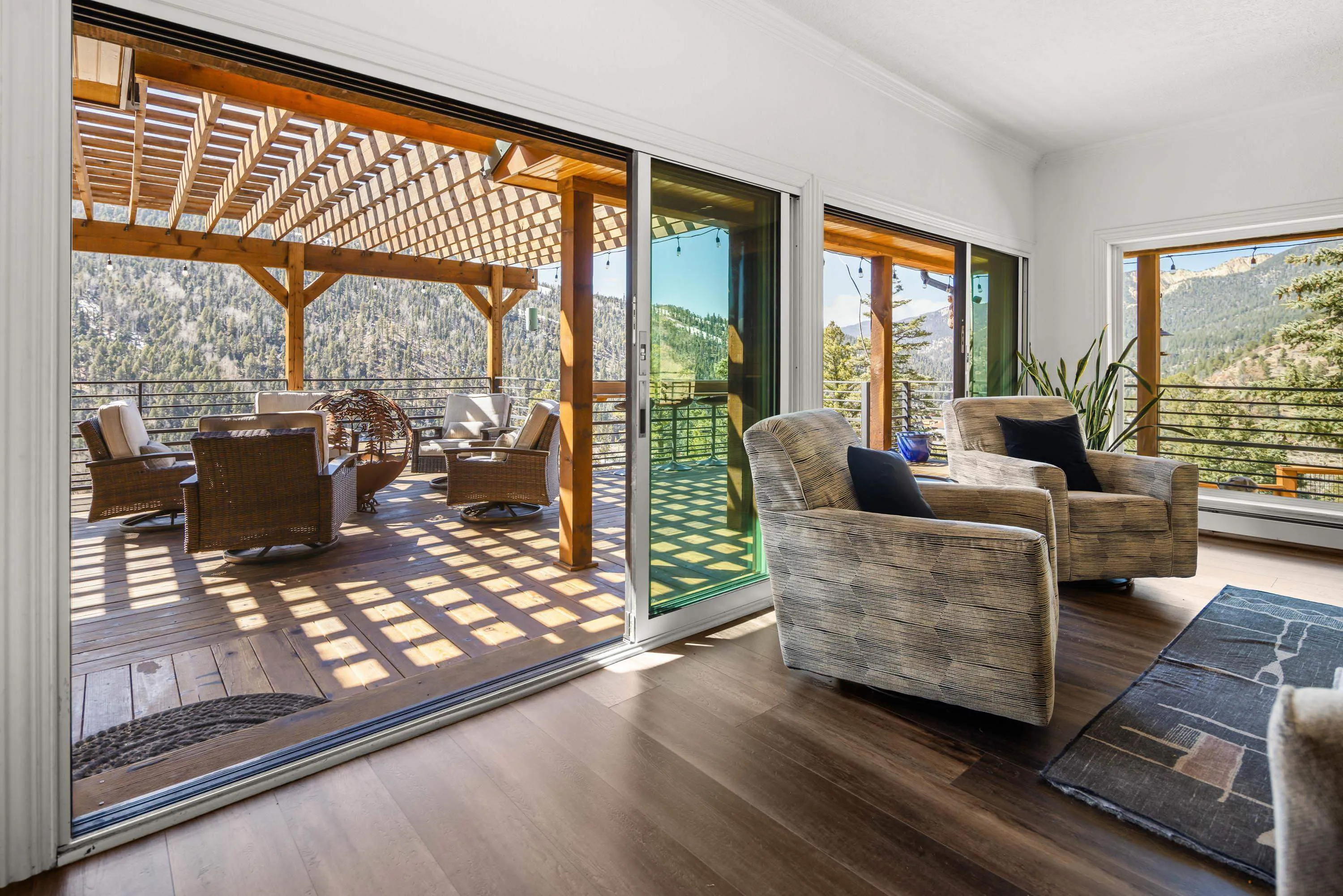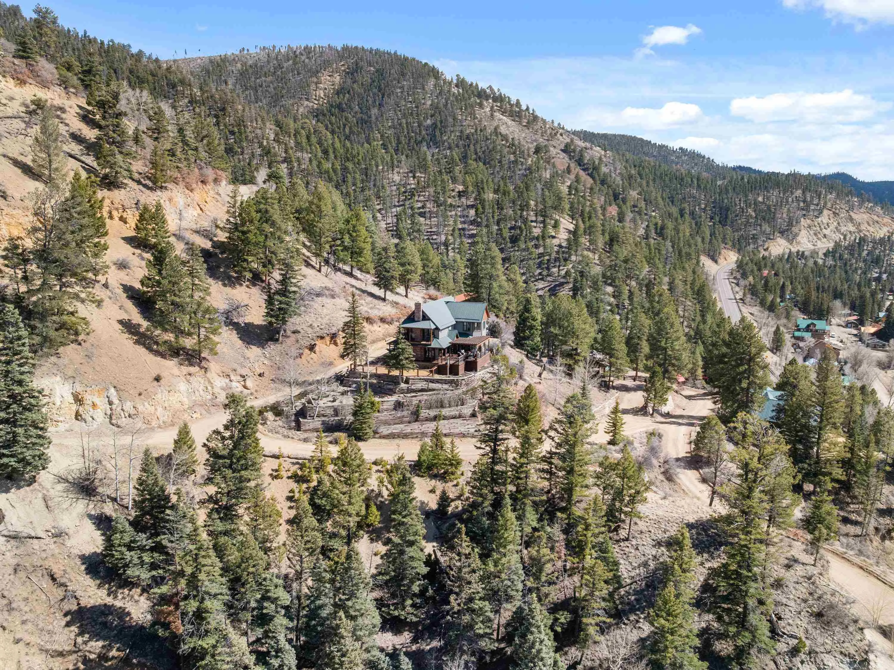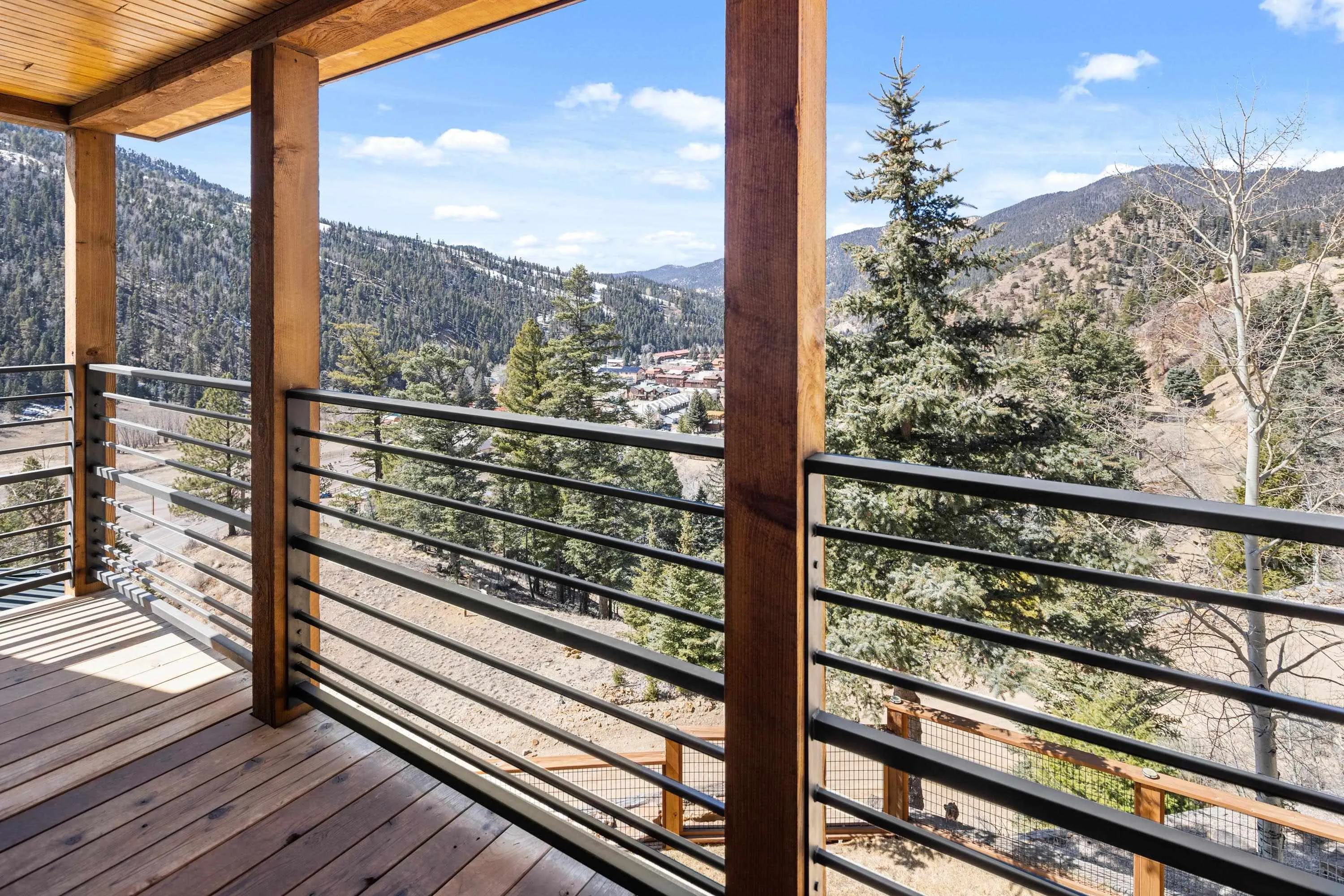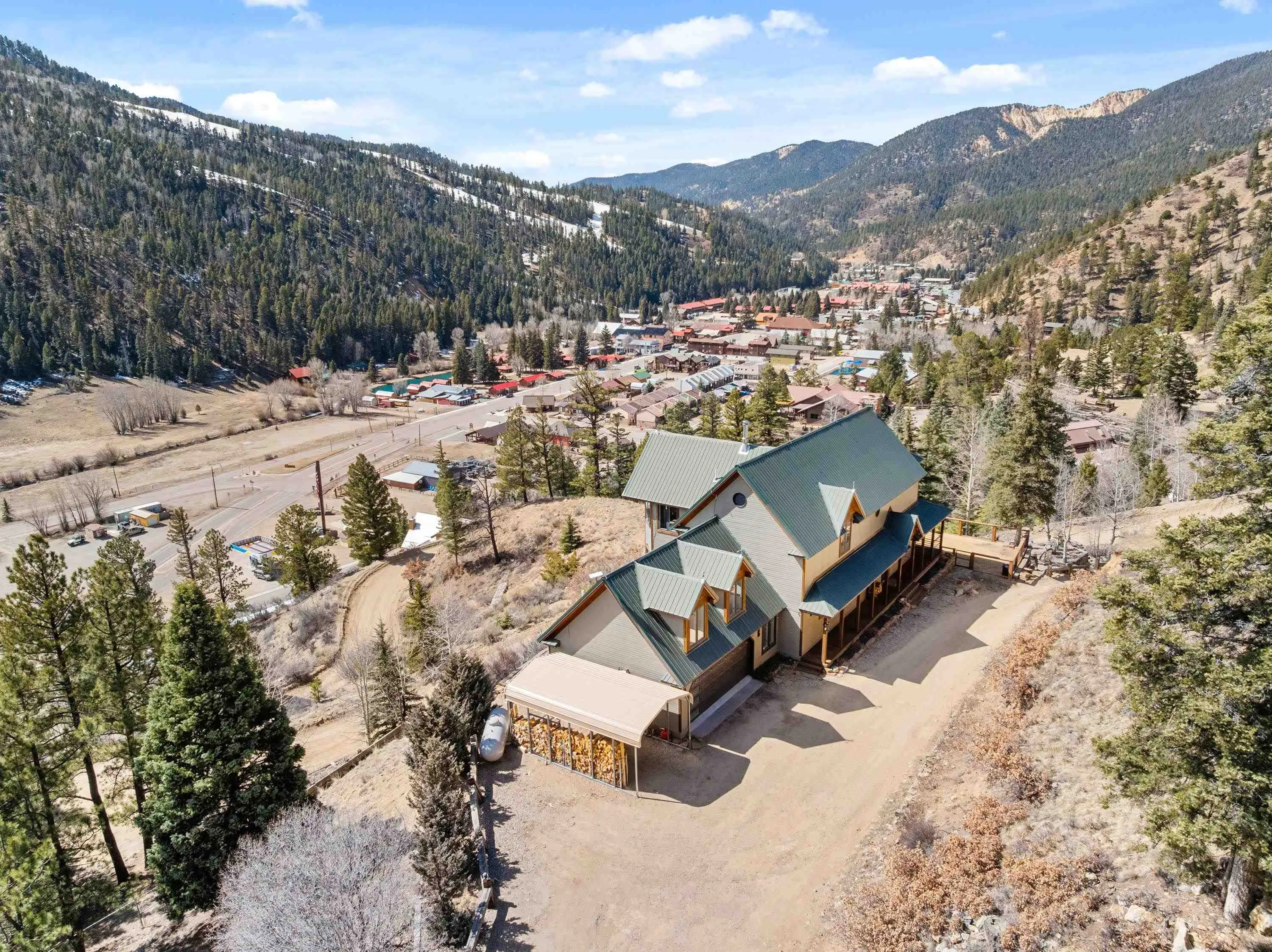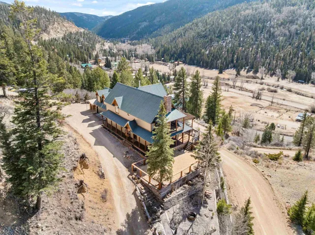 The Biggest and Best View in Red River Awaits! Welcome to 400 Spruce Trail, your fully remodeled and updated mountain retreat perched high above town. This property boasts what is arguably the biggest and best view in all of Red River, offering unparalleled panoramas of the town, mountains, and spectacular sunsets. The home welcomes you into an open living and dining area, surrounded by glass to maximize the stunning vistas. Adjacent to the wood-burning fireplace, two oversized sliders seamlessly extend the living space onto the scenic deck. Here, you can soak in the unbelievable view, gather around the custom globe fire pit, or post up at the outdoor bar overlooking the entire valley. Inside, the main floor features a wet bar complete with a built-in ice maker and beverage cooler, leading into an updated, modern kitchen – a true chef’s dream. The main floor spacious primary suite, also wrapped in windows, provides a private, bedside view over the entire valley. Up the custom floating staircase, you’ll find a second living space and two additional spacious bedrooms, each with their own ensuite bathrooms. A window-wrapped flex space on this level offers potential for an office or a fifth bedroom conversion. For added privacy, a separate fourth bedroom with an ensuite bathroom is located above the oversized two-car garage. The property comes complete with a sodded and fenced side yard and is serviced by town utilities and plowing. Call today to schedule your chance to see this one-of-a-kind property and experience the high-altitude view for yourself!