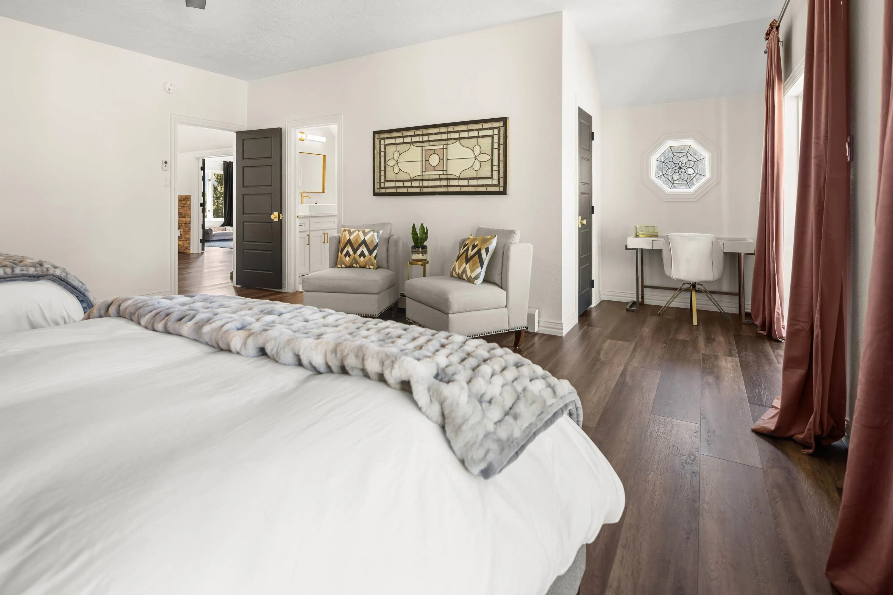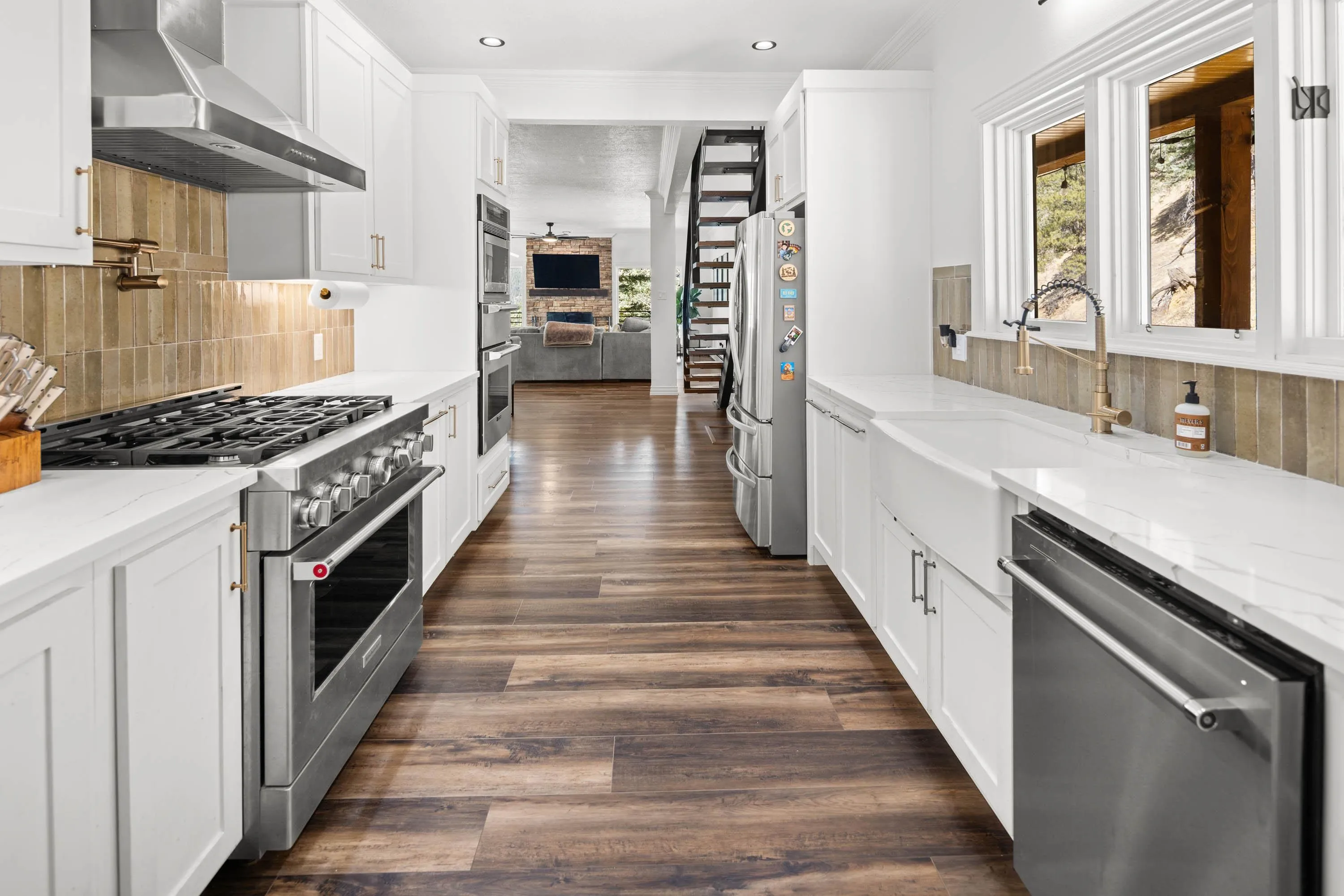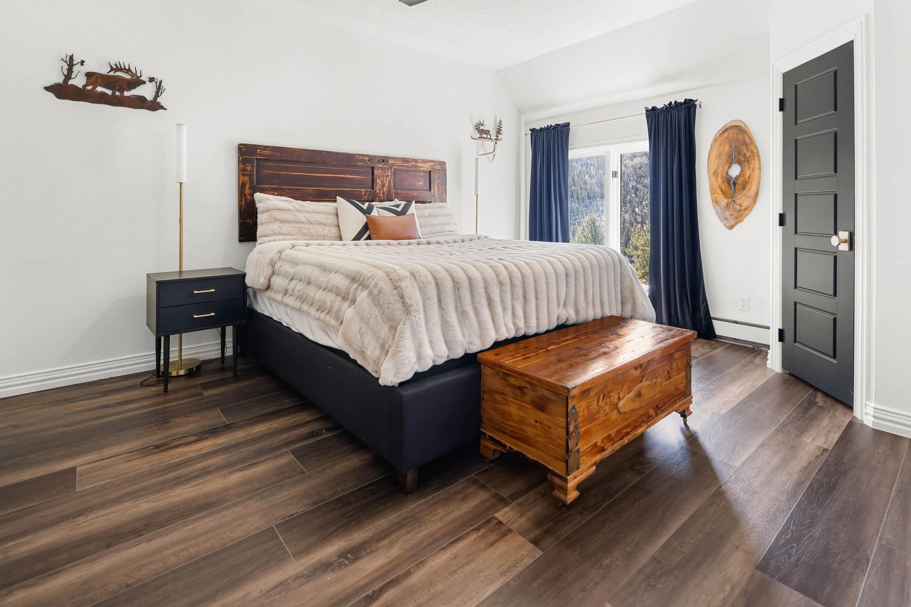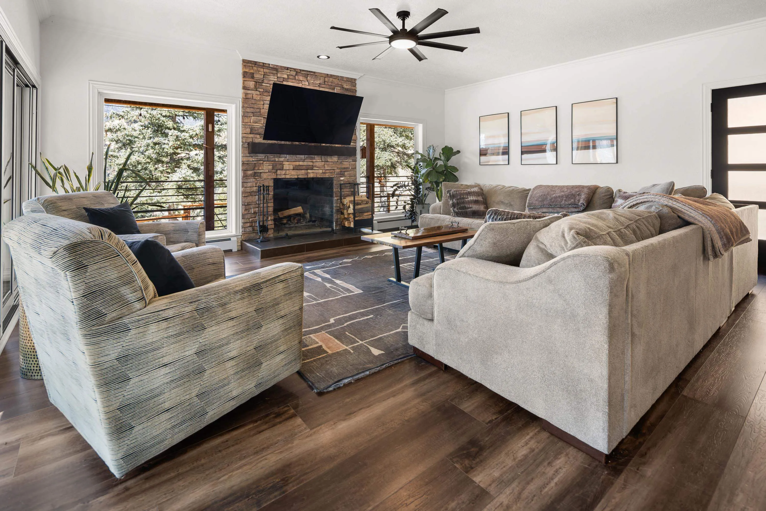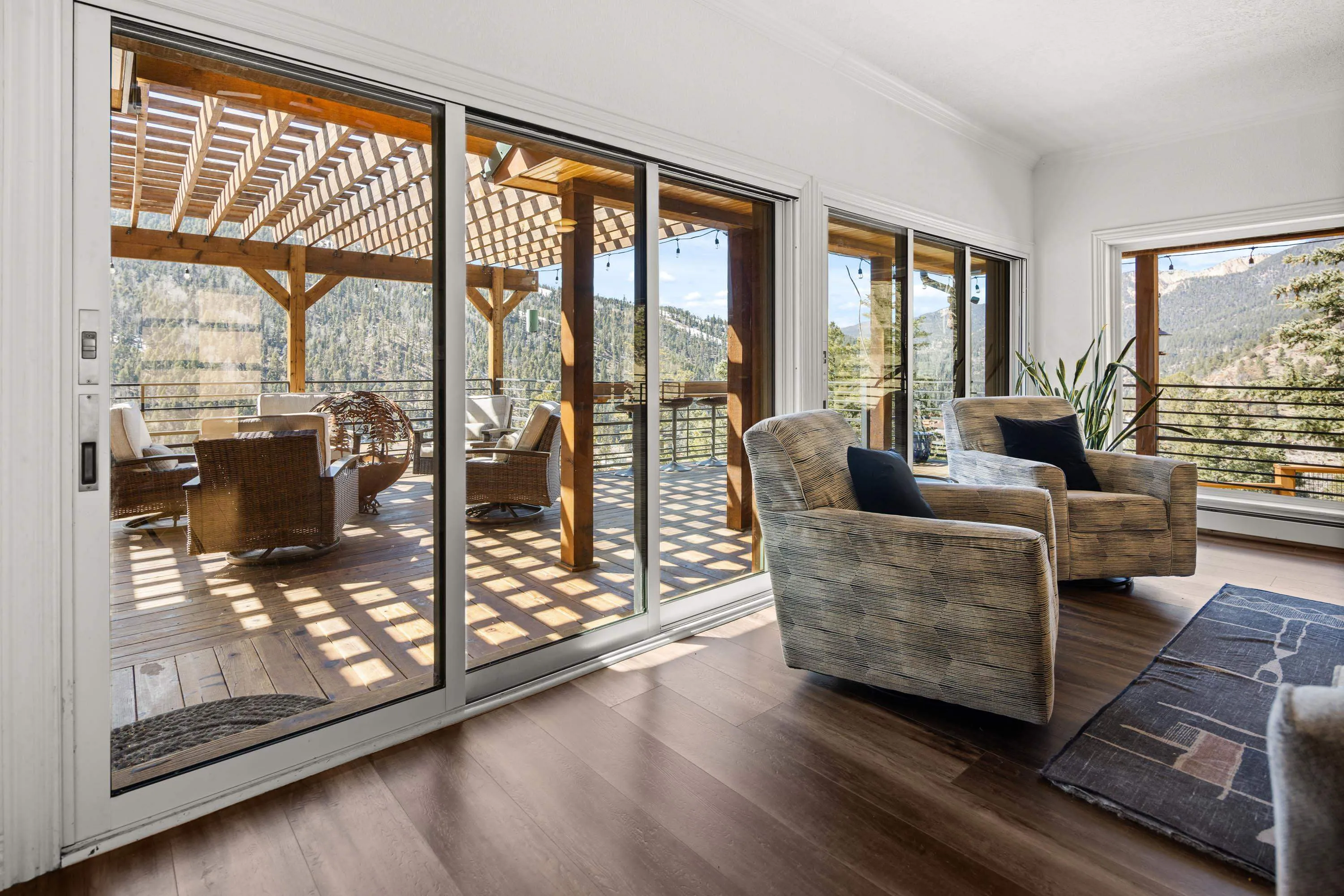 The Biggest and Best View in Red River Awaits! Welcome to 400 Spruce Trail, your fully remodeled and updated mountain retreat perched high above town. This property boasts what is arguably the biggest and best view in all of Red River, offering unparalleled panoramas of the town, mountains, and spectacular sunsets. The home welcomes you into an open living and dining area, surrounded by glass to maximize the stunning vistas. Adjacent to the wood-burning fireplace, two oversized sliders seamlessly extend the living space onto the scenic deck. Here, you can soak in the unbelievable view, gather around the custom globe fire pit, or post up at the outdoor bar overlooking the entire valley. Inside, the main floor features a wet bar complete with a built-in ice maker and beverage cooler, leading into an updated, modern kitchen – a true chef’s dream. The main floor spacious primary suite, also wrapped in windows, provides a private, bedside view over the entire valley. Up the custom floating staircase, you’ll find a second living space and two additional spacious bedrooms, each with their own ensuite bathrooms. A window-wrapped flex space on this level offers potential for an office or a fifth bedroom conversion. For added privacy, a separate fourth bedroom with an ensuite bathroom is located above the oversized two-car garage. The property comes complete with a sodded and fenced side yard and is serviced by town utilities and plowing. Call today to schedule your chance to see this one-of-a-kind property and experience the high-altitude view for yourself!