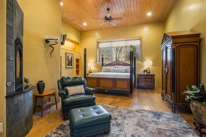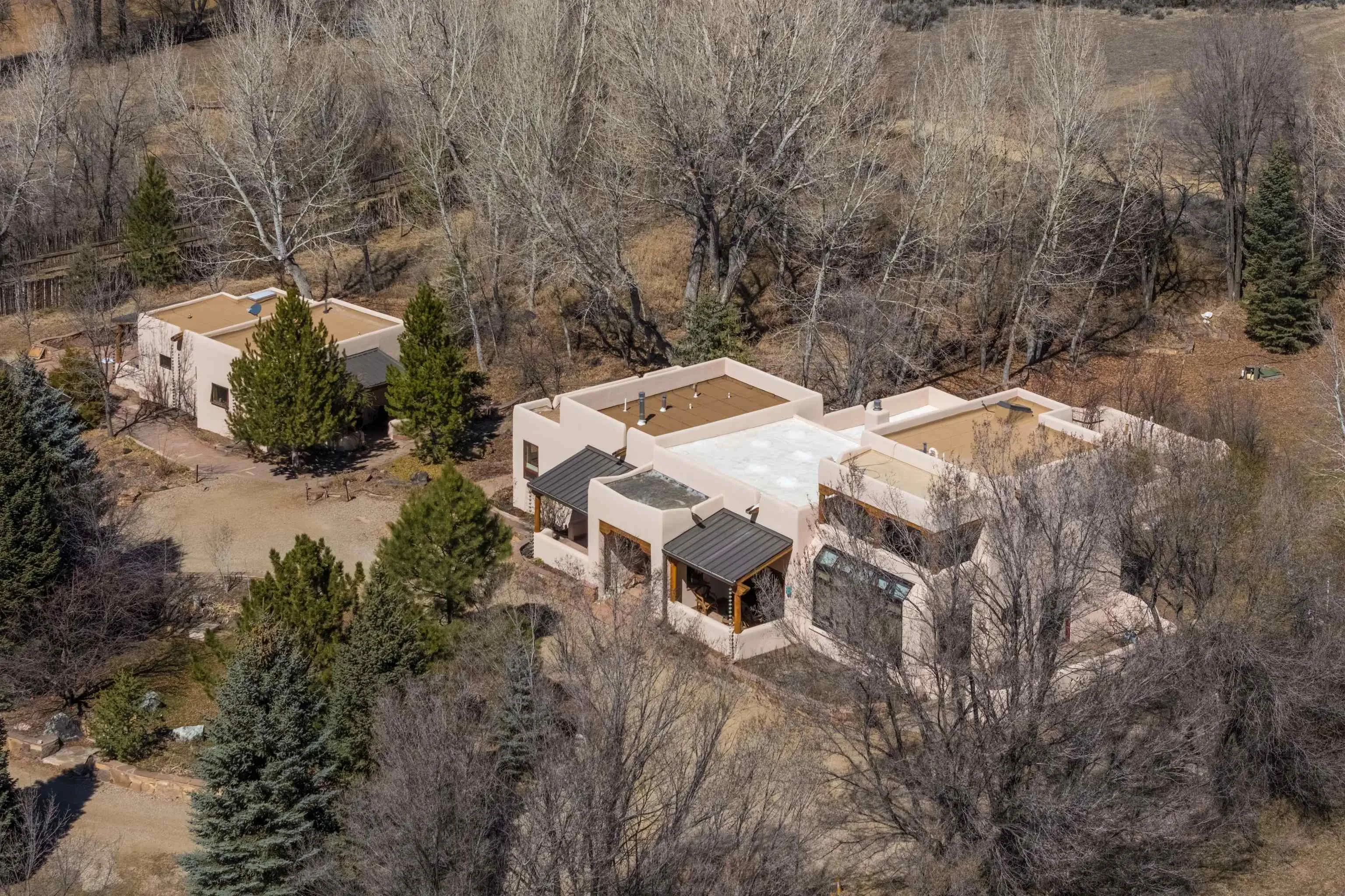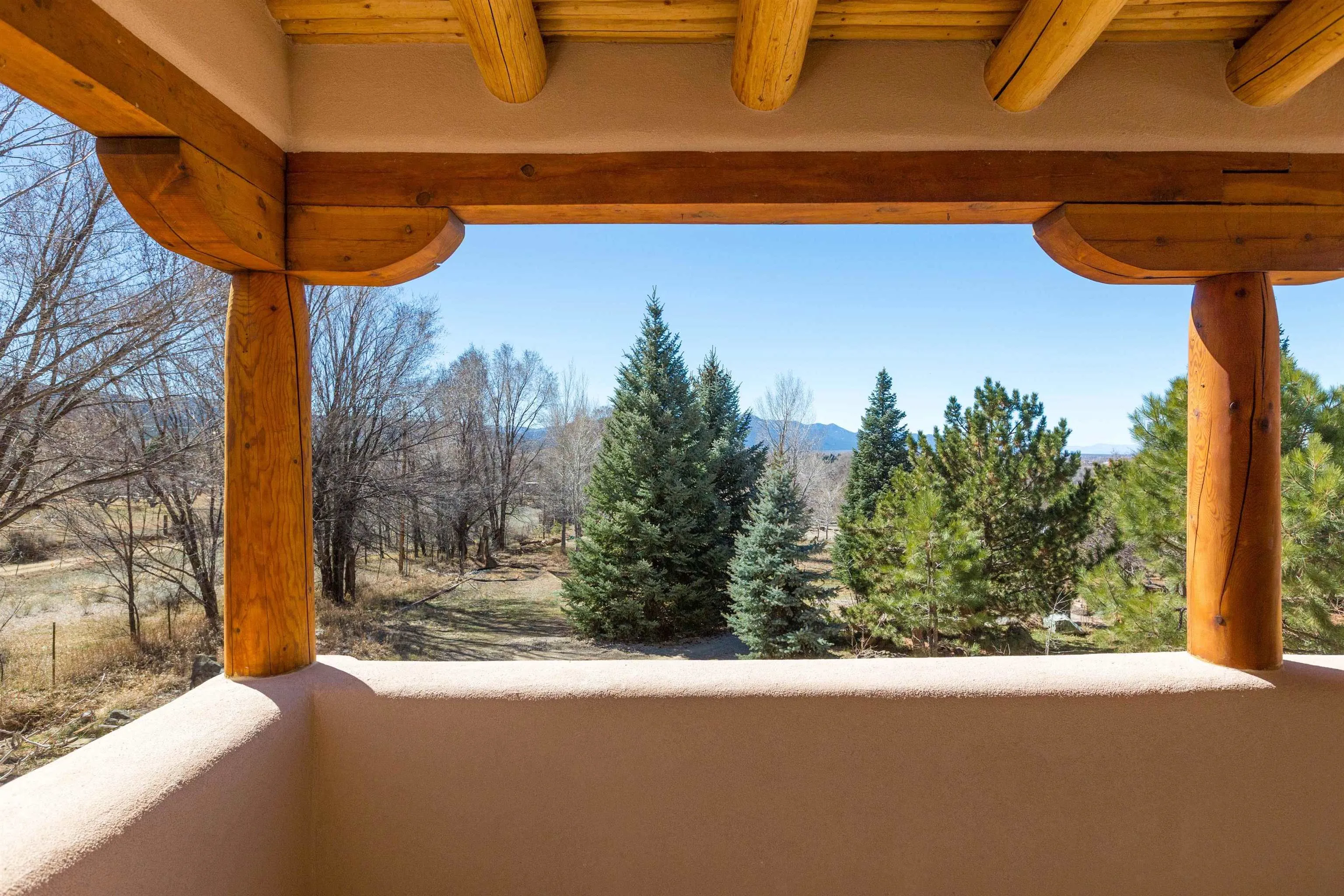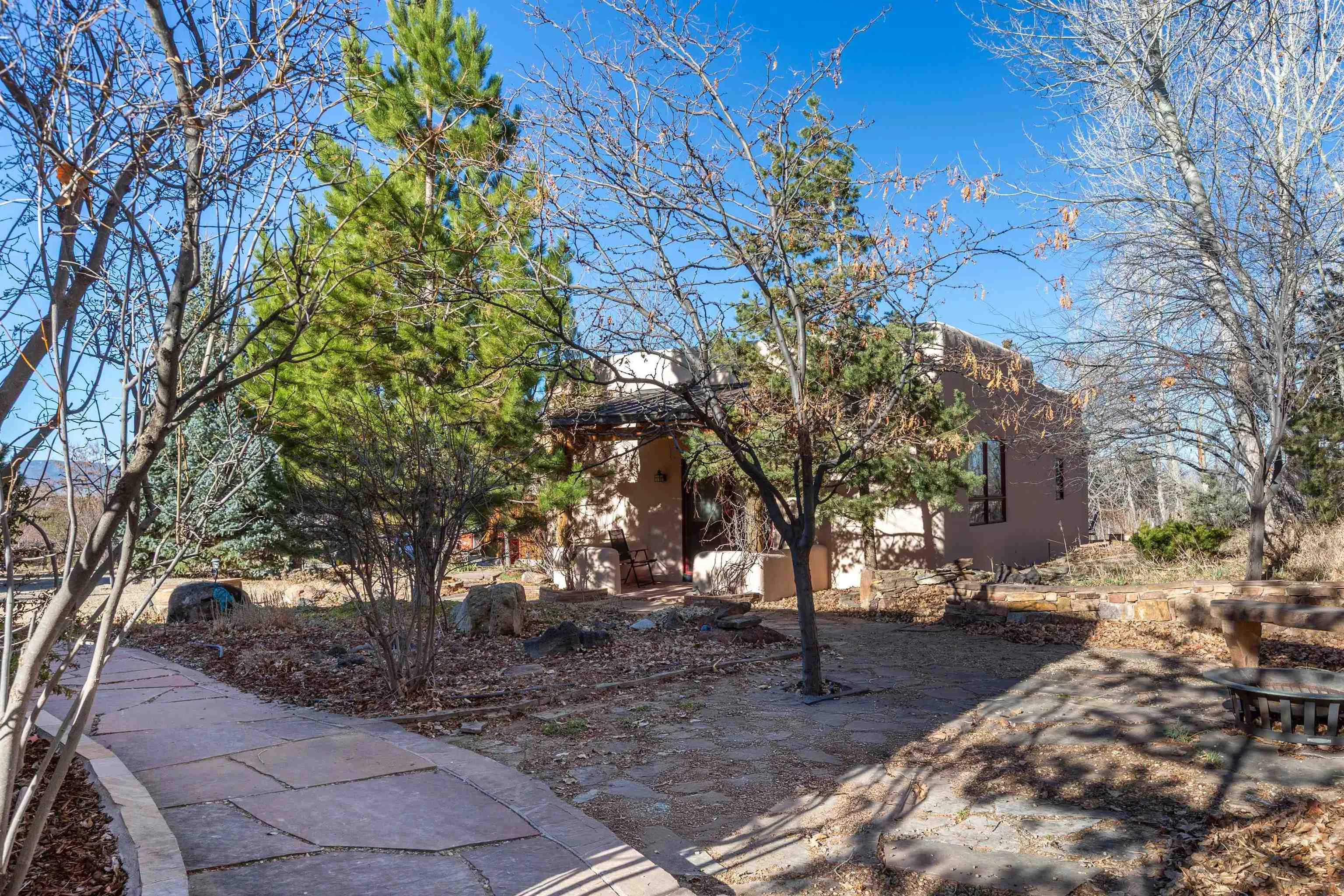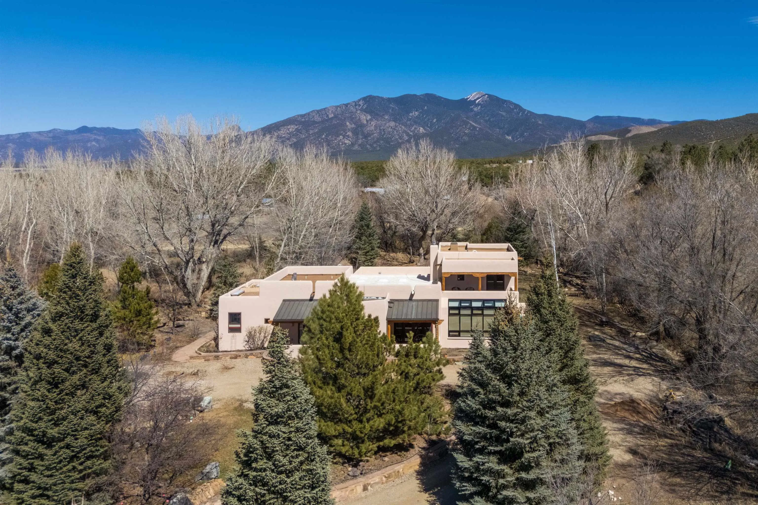 Welcome to Simple Elegance in Taos!! Set within the breathtaking high desert landscape of Taos and minutes from the Plaza. This extraordinary first time on the market, private estate offers a rare blend of timeless Northern New Mexico architecture, artisanal craftsmanship, and self-sustaining luxury. Built by Paul Rotman with substantial 18-inch thick Rastra Block walls, the residence embodies the enduring character of traditional adobe-style design while incorporating refined modern comfort. From the moment you enter through the handcrafted adobe entryway constructed with approximately 100-year-old bricks, the home reveals a level of artistry rarely found in traditional builds. Fourteen-foot ceilings, graceful coved ceilings in the kitchen, and diamond-finish plaster walls tinted with natural mineral pigments create a warm, sculptural interior that reflects the region’s rich architectural heritage. The chef’s kitchen is both bold and elegant, featuring granite countertops with full bullnose edges, custom cherry cabinetry, double ovens, Wolf range cook top and an intimate breakfast nook. Living spaces are anchored by gas fireplaces and custom stonework by renowned artisan Bob Loveless, complemented by natural stone tile flooring and expansive light-filled gathering areas including a tranquil sunroom. The primary suite offers a luxurious retreat with two primary closets and distinctive green marble accents in the bath, while upstairs cherry wood flooring adds warmth and refinement. Comfort throughout the home is provided by radiant floor heating, supplemental wall heaters, and a Navien high-efficiency boiler installed in February 2026. A charming 1 bath, 1 bedroom casita with tongue-and-groove ceilings crafted from 400-year-old reclaimed wood provides exceptional guest accommodations or private retreat space. Beyond the residence, the property unfolds into an extraordinary multi-use compound. A heated three-car garage, artist studio, woodworking shop with professional dust collection system, and fitness room with full bath and laundry hookups create unmatched flexibility for creative pursuits, wellness, or home-based enterprises. The grounds themselves form a true Taos sanctuary. With 7+ acres with irrigation rights and mature gardens and landscaping surround a productive orchard of apple, pear, apricot, cherry, peach, and plum trees, alongside flowering perennials and majestic Austrian pine, Colorado blue spruce, and bristlecone pines. Additional agricultural features include a tree nursery, chicken coop, bee house, and hoop house. Designed for both sustainability and independence, the estate includes two wells (one solar powered), three cisterns, a five-zone in-ground irrigation system, RV hookups with water and 30-amp service, and a back porch pre-wired for a hot tub—perfect for enjoying the quiet beauty and star-filled skies of northern New Mexico. This exceptional offering represents a rare opportunity to own a private high-desert compound where craftsmanship, land stewardship, and luxury living come together in one remarkable Taos property.