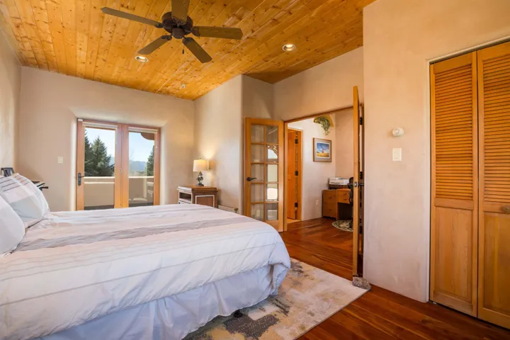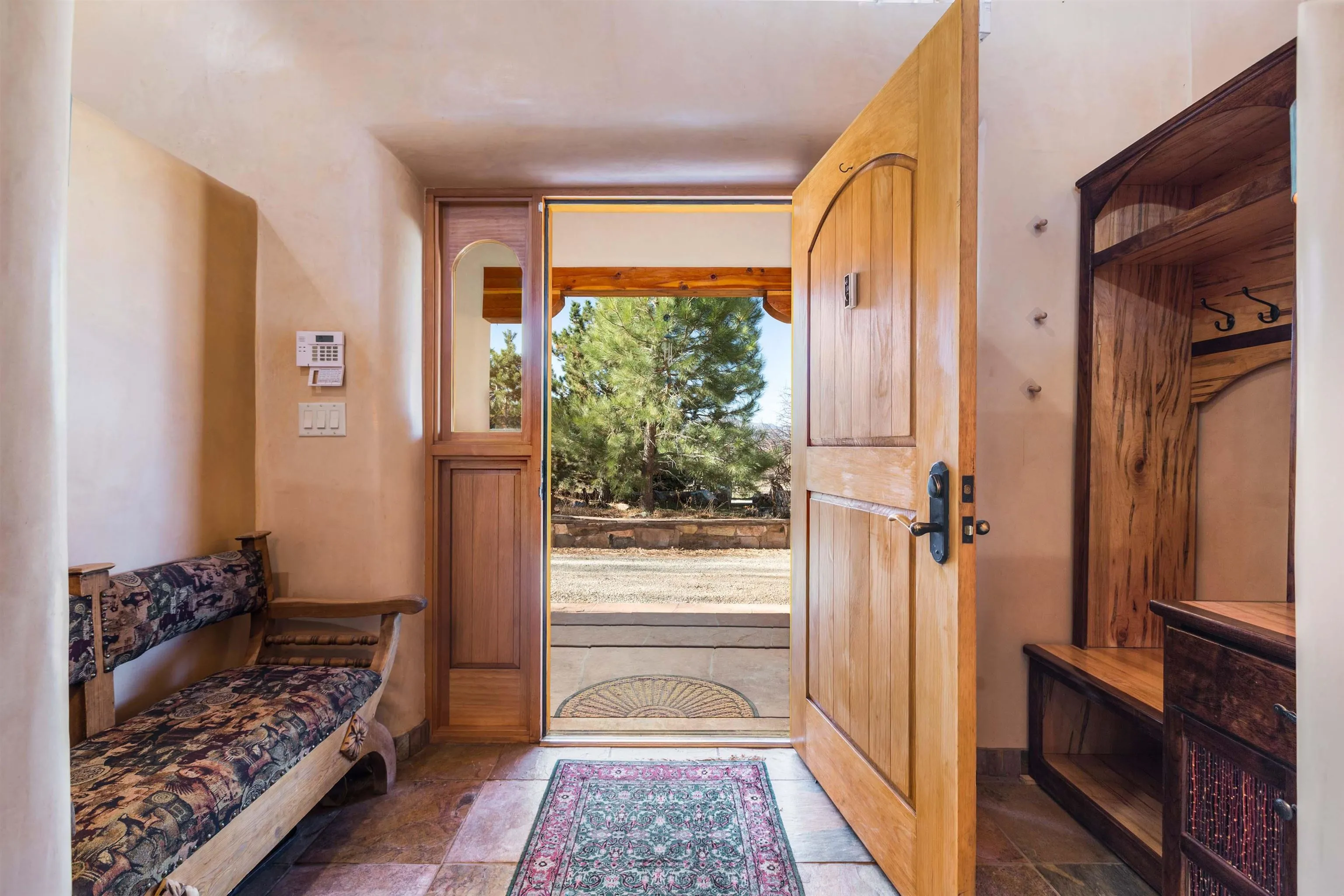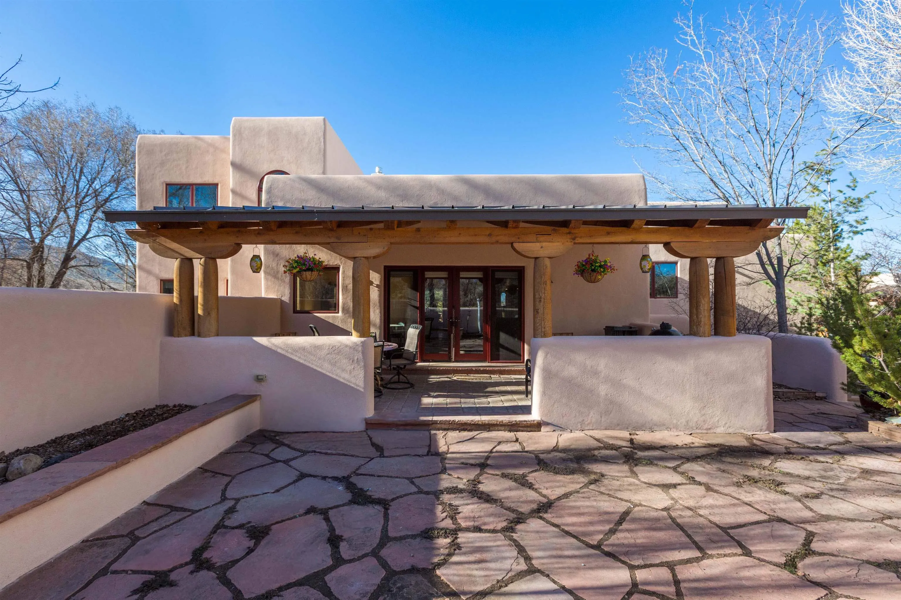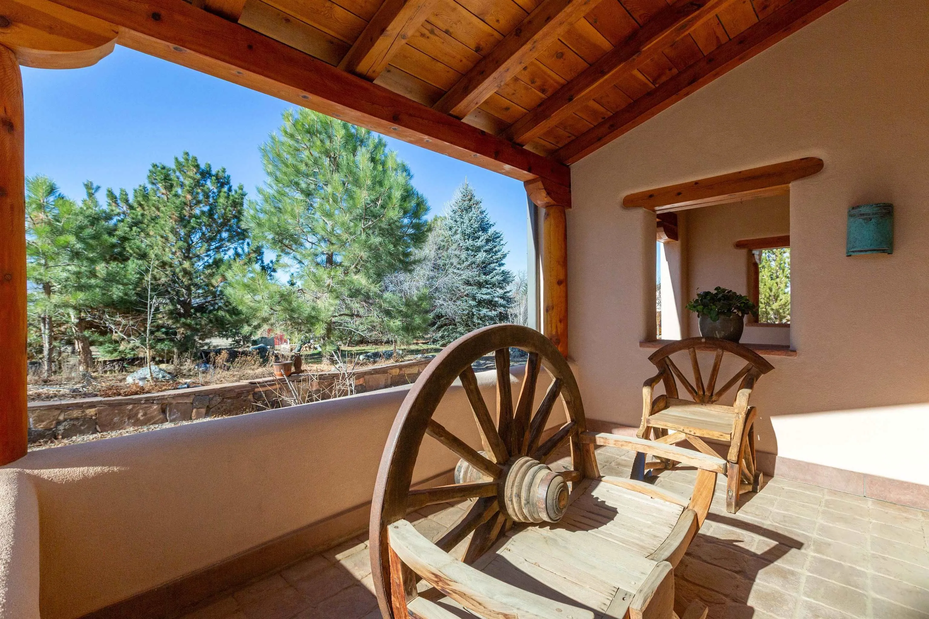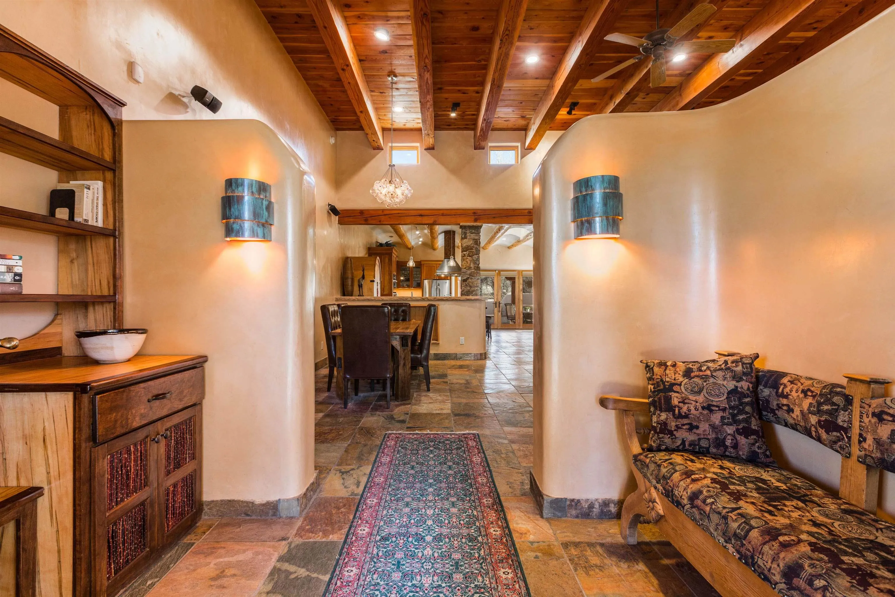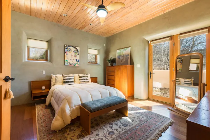 Welcome to Simple Elegance in Taos!! Set within the breathtaking high desert landscape of Taos and minutes from the Plaza. This extraordinary first time on the market, private estate offers a rare blend of timeless Northern New Mexico architecture, artisanal craftsmanship, and self-sustaining luxury. Built by Paul Rotman with substantial 18-inch thick Rastra Block walls, the residence embodies the enduring character of traditional adobe-style design while incorporating refined modern comfort. From the moment you enter through the handcrafted adobe entryway constructed with approximately 100-year-old bricks, the home reveals a level of artistry rarely found in traditional builds. Fourteen-foot ceilings, graceful coved ceilings in the kitchen, and diamond-finish plaster walls tinted with natural mineral pigments create a warm, sculptural interior that reflects the region’s rich architectural heritage. The chef’s kitchen is both bold and elegant, featuring granite countertops with full bullnose edges, custom cherry cabinetry, double ovens, Wolf range cook top and an intimate breakfast nook. Living spaces are anchored by gas fireplaces and custom stonework by renowned artisan Bob Loveless, complemented by natural stone tile flooring and expansive light-filled gathering areas including a tranquil sunroom. The primary suite offers a luxurious retreat with two primary closets and distinctive green marble accents in the bath, while upstairs cherry wood flooring adds warmth and refinement. Comfort throughout the home is provided by radiant floor heating, supplemental wall heaters, and a Navien high-efficiency boiler installed in February 2026. A charming 1 bath, 1 bedroom casita with tongue-and-groove ceilings crafted from 400-year-old reclaimed wood provides exceptional guest accommodations or private retreat space. Beyond the residence, the property unfolds into an extraordinary multi-use compound. A heated three-car garage, artist studio, woodworking shop with professional dust collection system, and fitness room with full bath and laundry hookups create unmatched flexibility for creative pursuits, wellness, or home-based enterprises. The grounds themselves form a true Taos sanctuary. With 7+ acres with irrigation rights and mature gardens and landscaping surround a productive orchard of apple, pear, apricot, cherry, peach, and plum trees, alongside flowering perennials and majestic Austrian pine, Colorado blue spruce, and bristlecone pines. Additional agricultural features include a tree nursery, chicken coop, bee house, and hoop house. Designed for both sustainability and independence, the estate includes two wells (one solar powered), three cisterns, a five-zone in-ground irrigation system, RV hookups with water and 30-amp service, and a back porch pre-wired for a hot tub—perfect for enjoying the quiet beauty and star-filled skies of northern New Mexico. This exceptional offering represents a rare opportunity to own a private high-desert compound where craftsmanship, land stewardship, and luxury living come together in one remarkable Taos property.