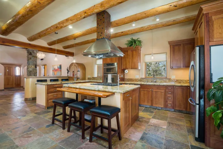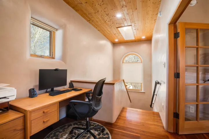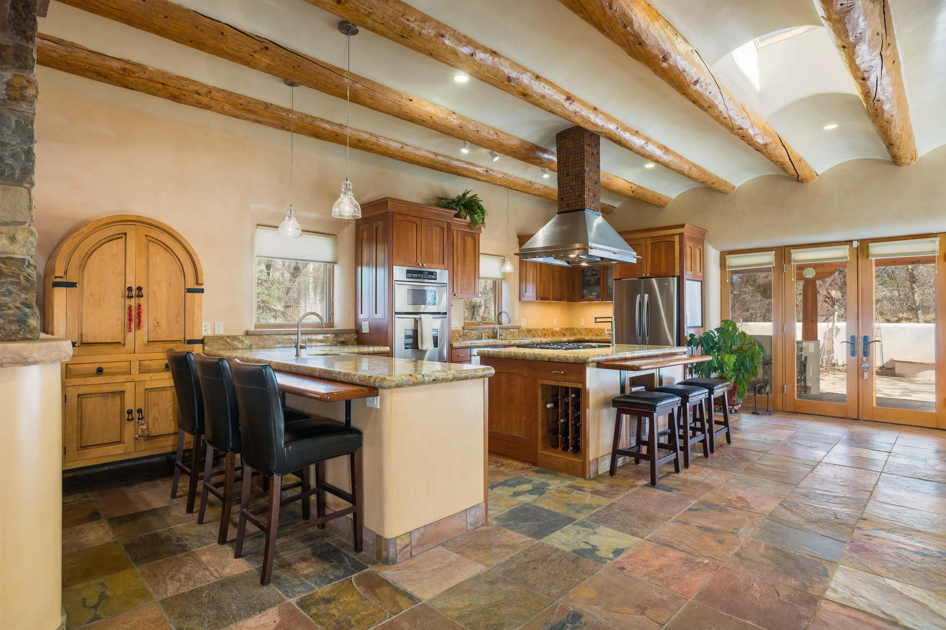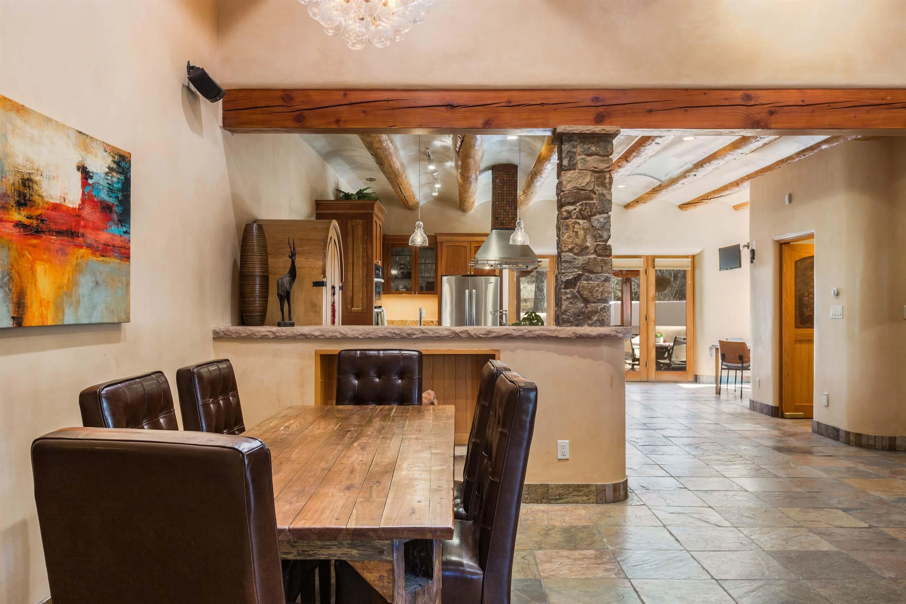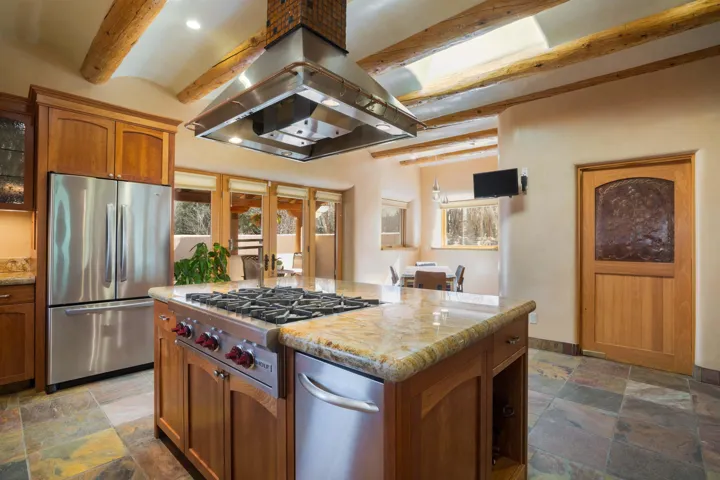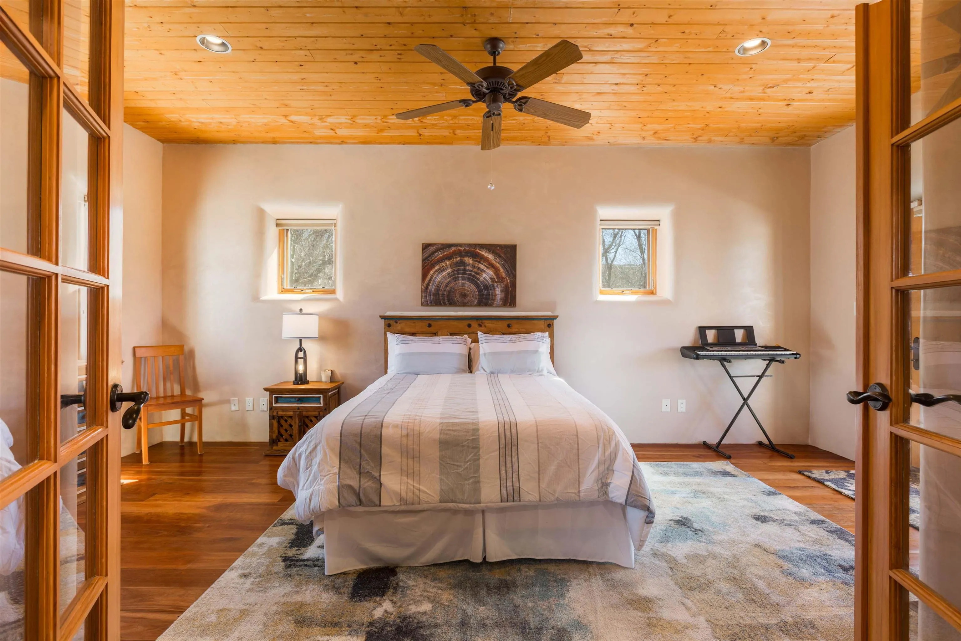 Welcome to Simple Elegance in Taos!! Set within the breathtaking high desert landscape of Taos and minutes from the Plaza. This extraordinary first time on the market, private estate offers a rare blend of timeless Northern New Mexico architecture, artisanal craftsmanship, and self-sustaining luxury. Built by Paul Rotman with substantial 18-inch thick Rastra Block walls, the residence embodies the enduring character of traditional adobe-style design while incorporating refined modern comfort. From the moment you enter through the handcrafted adobe entryway constructed with approximately 100-year-old bricks, the home reveals a level of artistry rarely found in traditional builds. Fourteen-foot ceilings, graceful coved ceilings in the kitchen, and diamond-finish plaster walls tinted with natural mineral pigments create a warm, sculptural interior that reflects the region’s rich architectural heritage. The chef’s kitchen is both bold and elegant, featuring granite countertops with full bullnose edges, custom cherry cabinetry, double ovens, Wolf range cook top and an intimate breakfast nook. Living spaces are anchored by gas fireplaces and custom stonework by renowned artisan Bob Loveless, complemented by natural stone tile flooring and expansive light-filled gathering areas including a tranquil sunroom. The primary suite offers a luxurious retreat with two primary closets and distinctive green marble accents in the bath, while upstairs cherry wood flooring adds warmth and refinement. Comfort throughout the home is provided by radiant floor heating, supplemental wall heaters, and a Navien high-efficiency boiler installed in February 2026. A charming 1 bath, 1 bedroom casita with tongue-and-groove ceilings crafted from 400-year-old reclaimed wood provides exceptional guest accommodations or private retreat space. Beyond the residence, the property unfolds into an extraordinary multi-use compound. A heated three-car garage, artist studio, woodworking shop with professional dust collection system, and fitness room with full bath and laundry hookups create unmatched flexibility for creative pursuits, wellness, or home-based enterprises. The grounds themselves form a true Taos sanctuary. With 7+ acres with irrigation rights and mature gardens and landscaping surround a productive orchard of apple, pear, apricot, cherry, peach, and plum trees, alongside flowering perennials and majestic Austrian pine, Colorado blue spruce, and bristlecone pines. Additional agricultural features include a tree nursery, chicken coop, bee house, and hoop house. Designed for both sustainability and independence, the estate includes two wells (one solar powered), three cisterns, a five-zone in-ground irrigation system, RV hookups with water and 30-amp service, and a back porch pre-wired for a hot tub—perfect for enjoying the quiet beauty and star-filled skies of northern New Mexico. This exceptional offering represents a rare opportunity to own a private high-desert compound where craftsmanship, land stewardship, and luxury living come together in one remarkable Taos property.