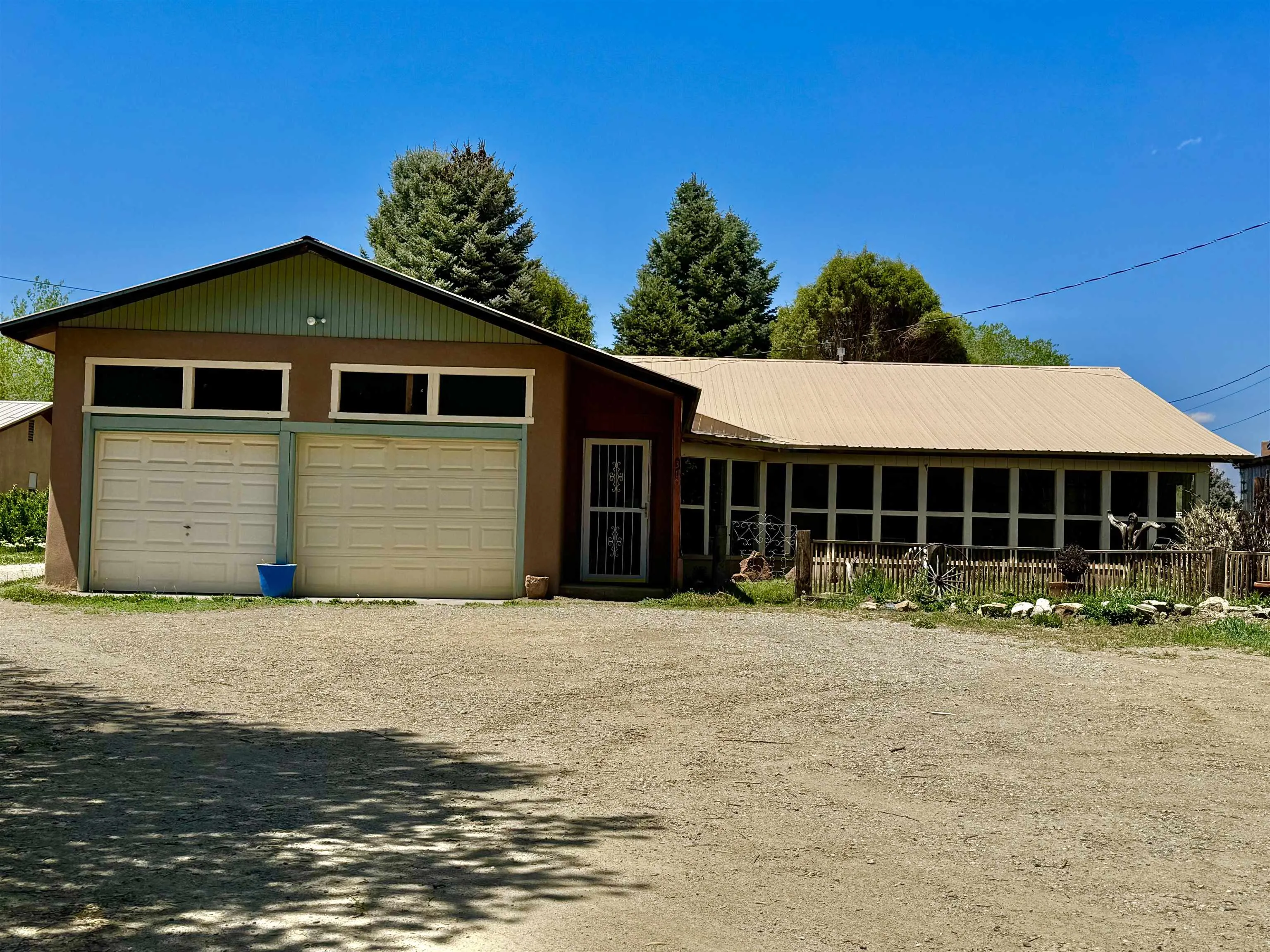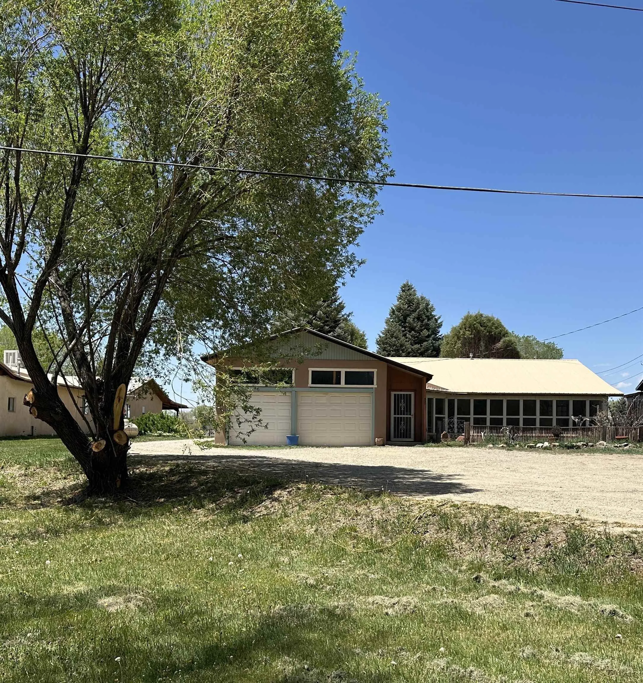 Welcome to your exclusive piece of Taoseño living! This Conventional style, Northern New Mexico, residence, constructed approximately in 1978, will immerse you in the authentic ambiance of Taos living. Situated directly across the street from the Rio Lucero, a natural flowing river originating from the Taos Pueblo and traversing the verdant expanse of the Taos Valley, this home offers a serene retreat amidst the tranquility of the surrounding landscape. The property has lush grass and mature trees that decorate the property with greenery that is easy to maintain. There is a patio/portal located at the rear of the home, perfect for relaxing, entertaining or outdoor cooking. The front of the home consists of a covered porch and walkway that can be used as a sunroom. At approximately 1,700 square feet, this three-bedroom, two-bathroom home boasts a unique layout and spacious living areas. Its interior features a harmonious blend of tile, wood, carpet, and old-style rock flooring, complemented by ceilings adorned with beams and plaster. The walls throughout the house are textured and one wall has a nice wood accent which decorates a bedroom. The sunken living room is elevated by a grand rock fireplace equipped with a wood-burning insert, flanked by yellow stained glass, creating a heart-warming ambiance and sunbeam lighting. The kitchen has plenty of shelving and storage space for your culinary needs, with nice updated appliances to make it all a bit easier. The house has a large dining area and very spacious living room, perfect for entertaining guests or every day living. Conveniently attached to the house is a two-car garage, providing ample parking or storage space keeping vehicles protected from elements or having extra room for projects. The home is situated on 0.51 acres of greenbelt land, with the driveway leading to the home and garage, directly from paved and maintained, Rio Lucero Road. Its proximity to the Town of Taos is mere minutes away, while the Rio Grande Gorge Bridge is approximately 14 minutes from the property. Additionally, the Taos Ski Valley is conveniently accessible within about 27 minutes. Schedule an in-person or virtual viewing today to discover the extraordinary features of this remarkable home and embark on a journey of Taos style and comfortable tranquility.