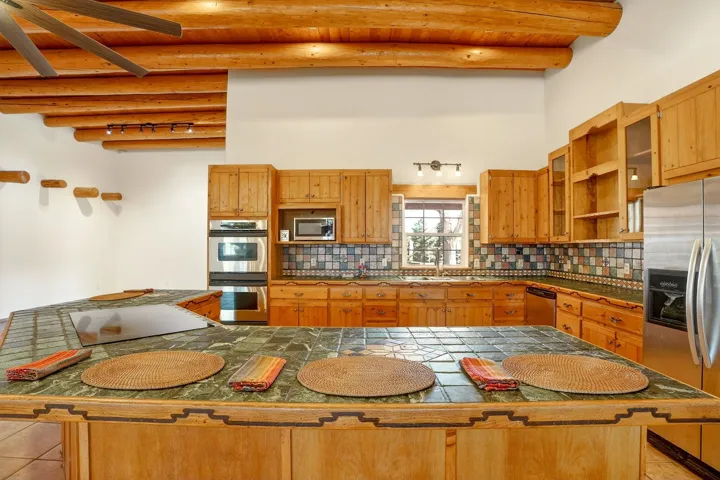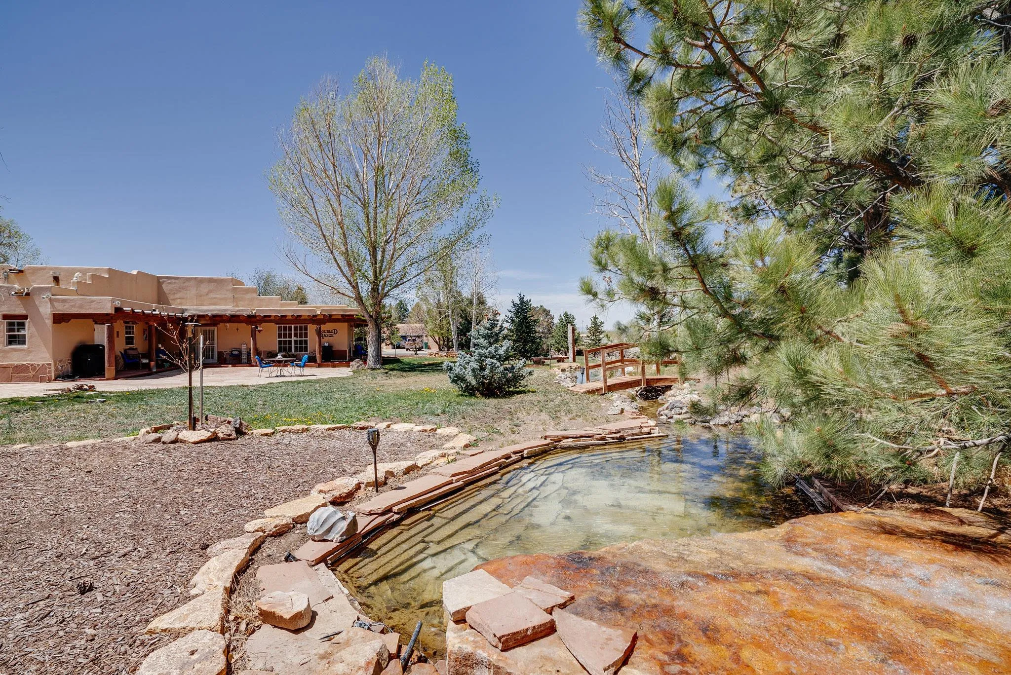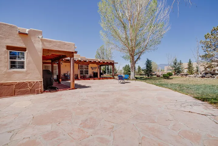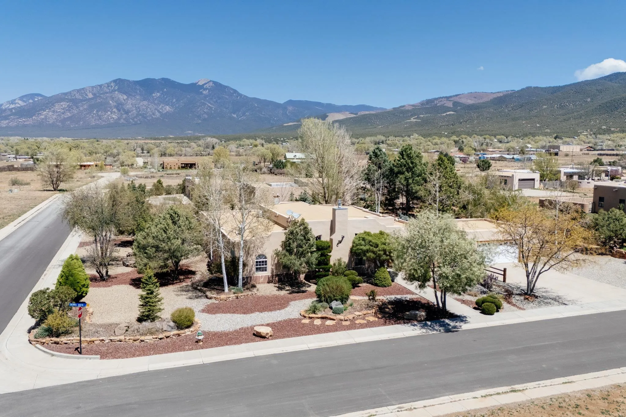 Welcome to this spacious 4-bedroom, 3-bathroom home offering approximately 3,400 square feet of comfort, character, and Southwestern charm in the Vegas De Taos subdivision. Set on a peaceful .68-acre lot, this in-town property combines convenience with a sense of privacy, complete with paved roads, sidewalks, and a welcoming community atmosphere. The beautifully curated grounds feature multiple water features, lush lawn areas, raised garden beds, and a diverse collection of mature trees, including conifers, deciduous varieties, and fruit trees. Enjoy mountain views, big open skies, and a thoughtful blend of low-maintenance xeriscaping in the front with a vibrant backyard retreat. Rock walls and wood fencing create a variety of inviting outdoor spaces, perfect for relaxing or entertaining. Inside, the grand great room impresses with 14-foot vaulted ceilings, custom woodwork, and radiant floor heating, complemented by efficient split units for year-round comfort. French doors off the dining area open to a generous covered veranda, ideal for indoor-outdoor living. The kitchen is designed for both function and gathering, featuring stainless steel appliances, a double oven, a smooth-surface cooktop on the island, a 3-basin sink, and a large island with seating for up to eight. A formal dining room offers additional space for hosting. The west wing includes two guest bedrooms, a spacious full bathroom, and a private primary suite with hickory Pergo flooring, a sitting area or office nook, a whirlpool tub, a separate shower, and an oversized walk-in closet. The east wing offers an additional bedroom, a guest bath, a large pantry, hall storage, and a laundry room with access to the covered breezeway and detached two-car garage. Located just minutes from downtown Taos, the hospital, and local amenities, this property offers a rare combination of space, comfort, and a true in-town homestead feel.