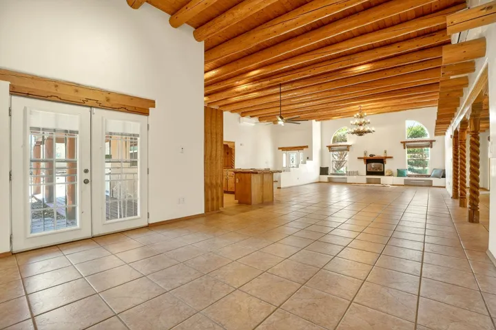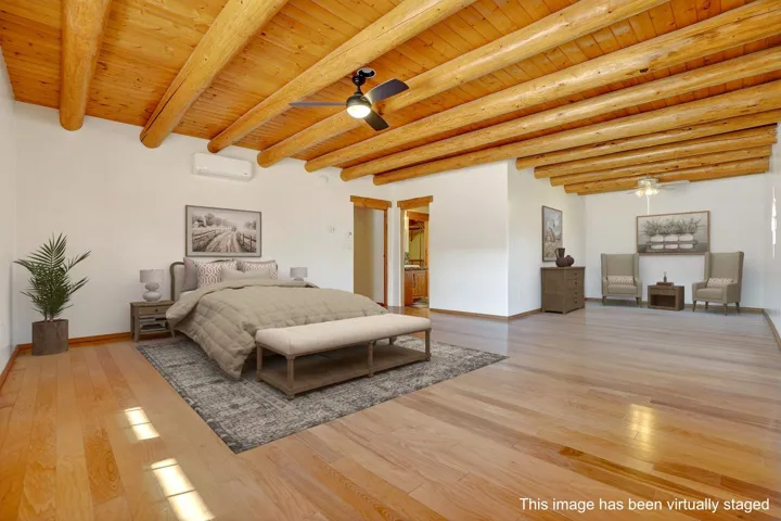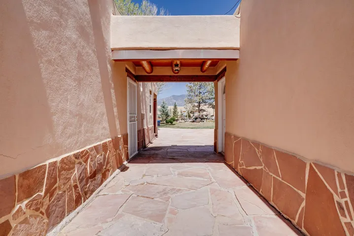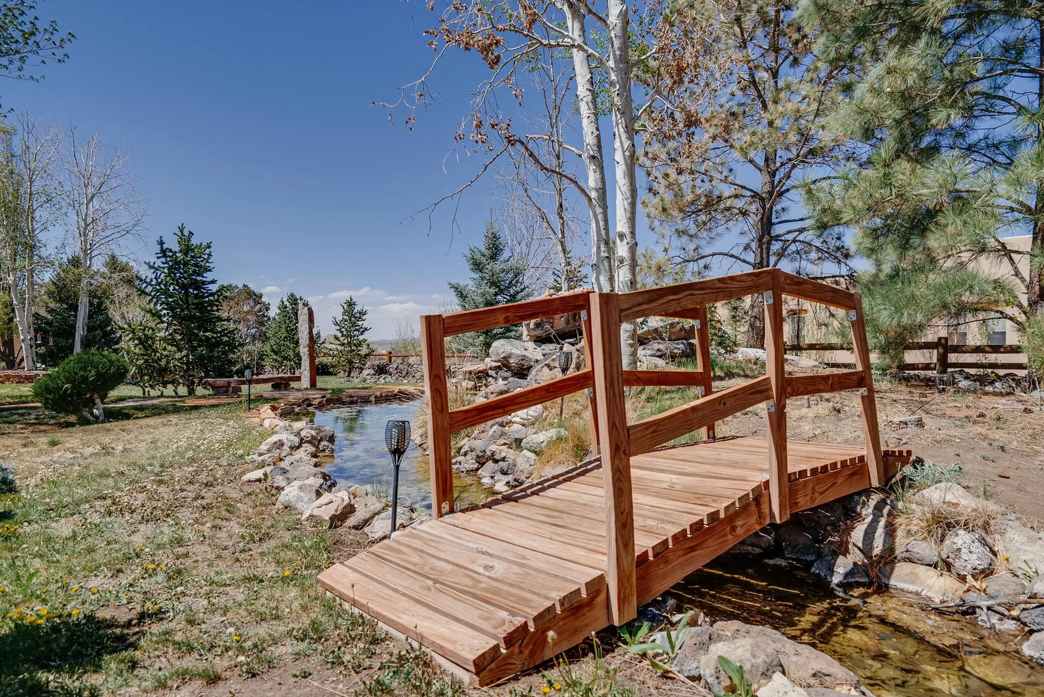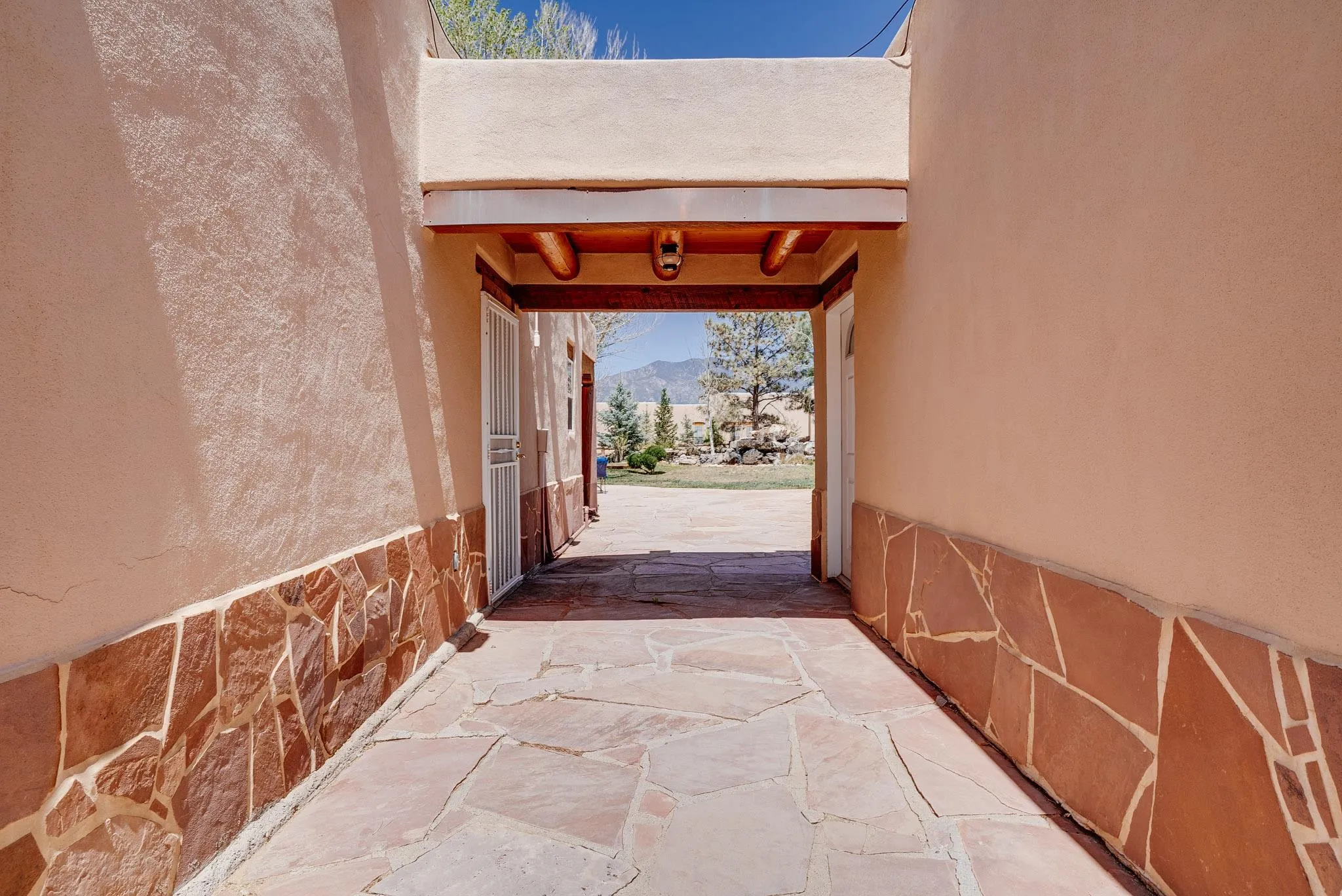 Welcome to this spacious 4-bedroom, 3-bathroom home offering approximately 3,400 square feet of comfort, character, and Southwestern charm in the Vegas De Taos subdivision. Set on a peaceful .68-acre lot, this in-town property combines convenience with a sense of privacy, complete with paved roads, sidewalks, and a welcoming community atmosphere. The beautifully curated grounds feature multiple water features, lush lawn areas, raised garden beds, and a diverse collection of mature trees, including conifers, deciduous varieties, and fruit trees. Enjoy mountain views, big open skies, and a thoughtful blend of low-maintenance xeriscaping in the front with a vibrant backyard retreat. Rock walls and wood fencing create a variety of inviting outdoor spaces, perfect for relaxing or entertaining. Inside, the grand great room impresses with 14-foot vaulted ceilings, custom woodwork, and radiant floor heating, complemented by efficient split units for year-round comfort. French doors off the dining area open to a generous covered veranda, ideal for indoor-outdoor living. The kitchen is designed for both function and gathering, featuring stainless steel appliances, a double oven, a smooth-surface cooktop on the island, a 3-basin sink, and a large island with seating for up to eight. A formal dining room offers additional space for hosting. The west wing includes two guest bedrooms, a spacious full bathroom, and a private primary suite with hickory Pergo flooring, a sitting area or office nook, a whirlpool tub, a separate shower, and an oversized walk-in closet. The east wing offers an additional bedroom, a guest bath, a large pantry, hall storage, and a laundry room with access to the covered breezeway and detached two-car garage. Located just minutes from downtown Taos, the hospital, and local amenities, this property offers a rare combination of space, comfort, and a true in-town homestead feel.