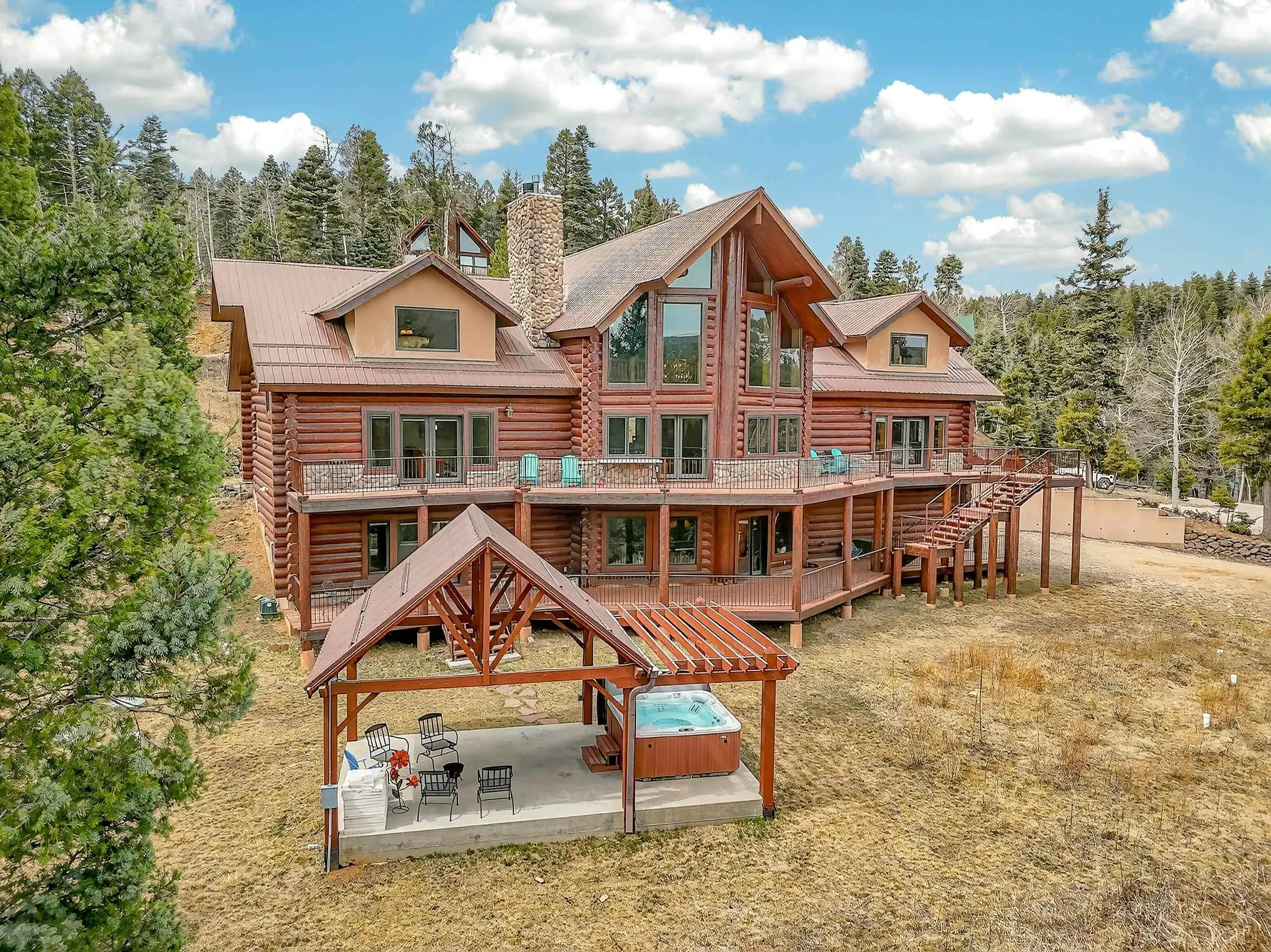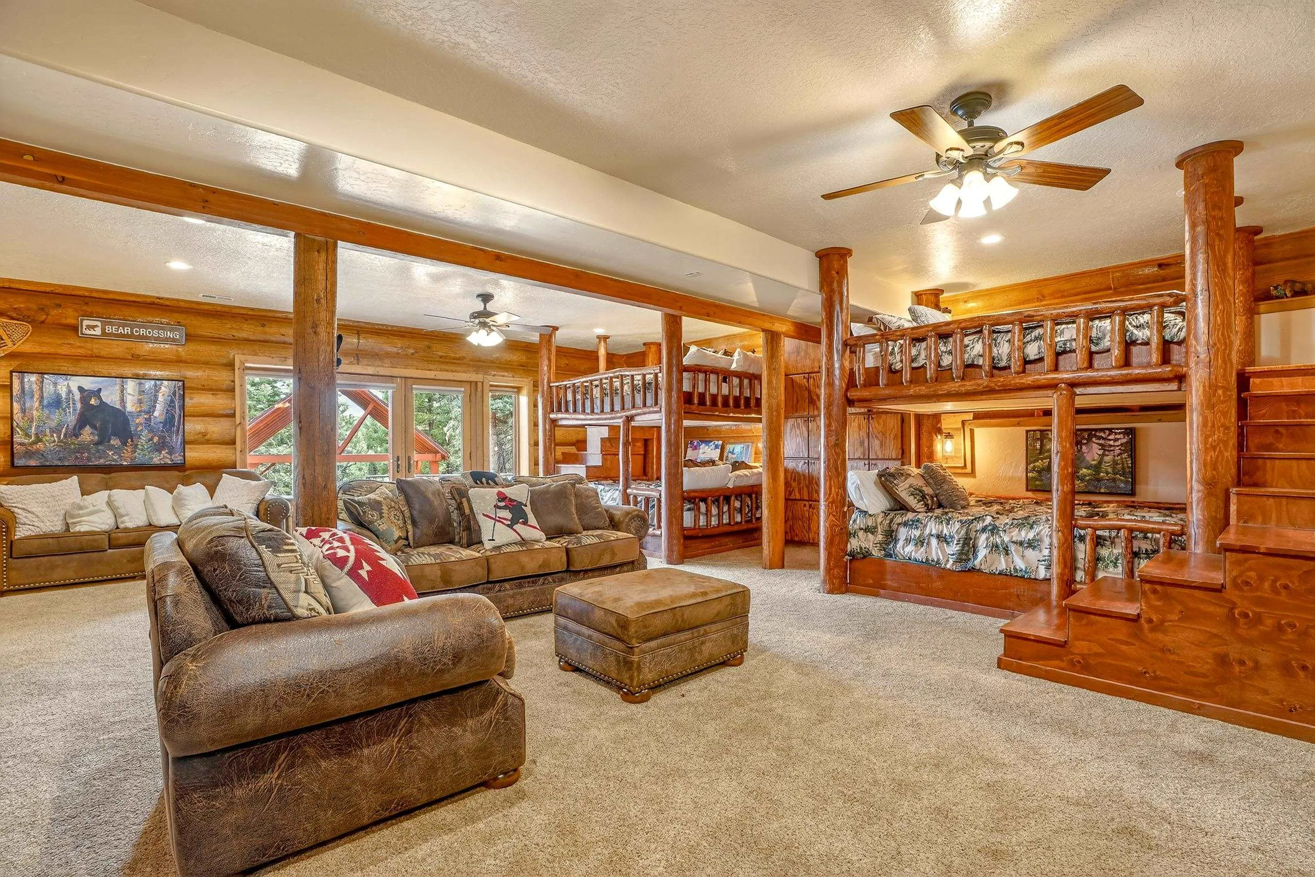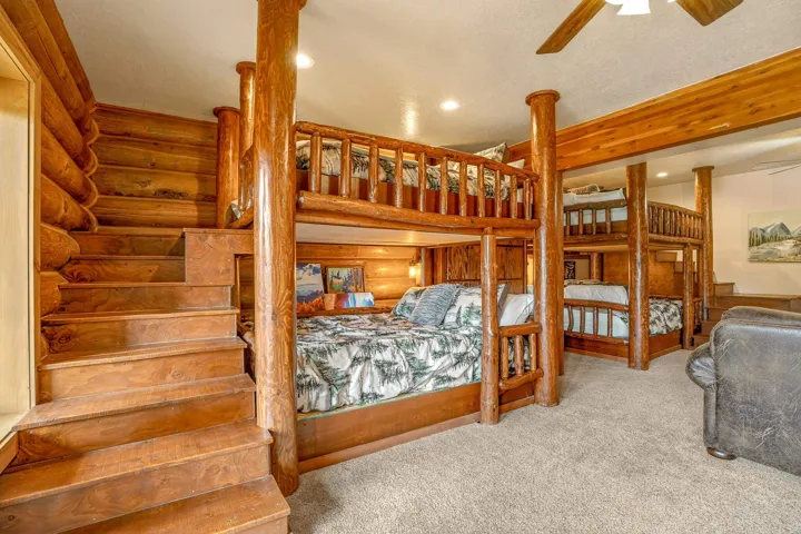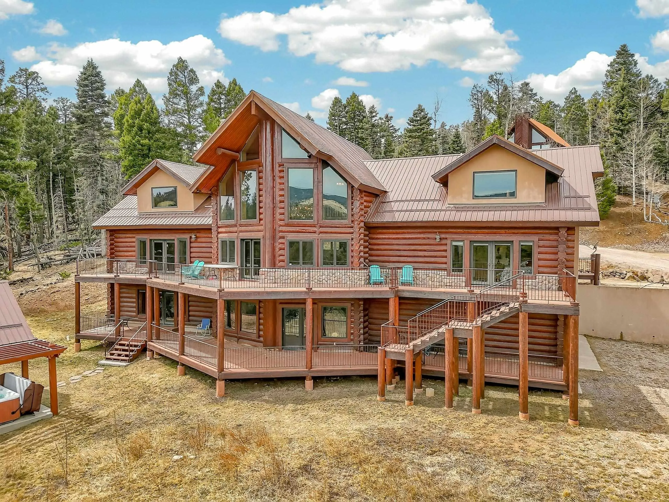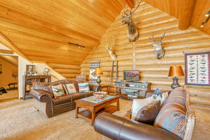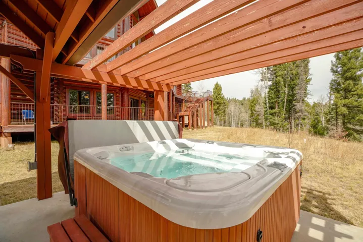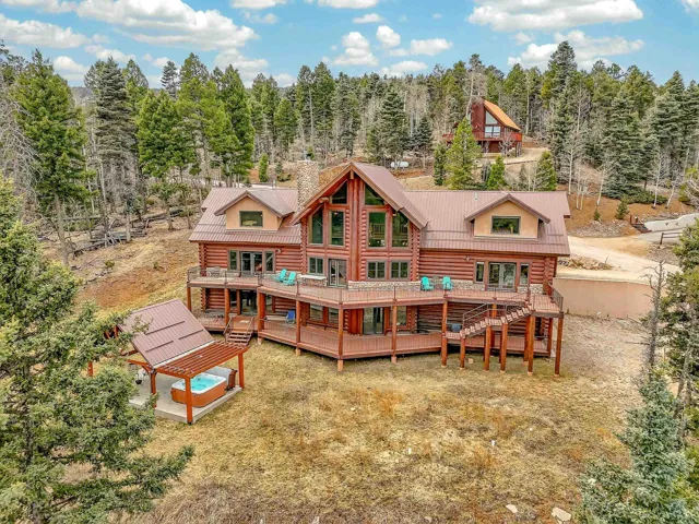 Mountain Luxury Living At Its Finest! This beautiful log and stucco residence boasts 4 spacious bedrooms, 5 bathrooms, a safe room, a children’s game room and multiple living areas. Highlighted with impressive natural log columns, soaring ceilings and a wall of windows with great views. A massive rock fireplace serves as the centerpiece of the expansive living room. The kitchen is thoughtfully designed with custom cabinetry, granite countertops, and high-quality appliances. This home offers two additional living or recreational spaces, making it ideal for large or extended family gatherings. Downstairs the “bear den” has plenty of space for game-night and the other room has unique custom bunkbeds which is perfect for the little ones. Step outside to enjoy multiple outdoor spaces, including a hot tub gazebo, a main-level deck, and a lower deck—perfect for relaxing and taking in the beautiful views toward the Valley of the Utes. Located a couple of blocks from Monte Verde Lake, this stunning home offers easy access to all the amenities Angel Fire has to offer, including skiing and golfing. Additional features include a large two-car garage and a covered drive-up portal at the front of the home, spacious enough for convenient sheltered parking. Generated $100,000+ per year in rental income for the past two years!
