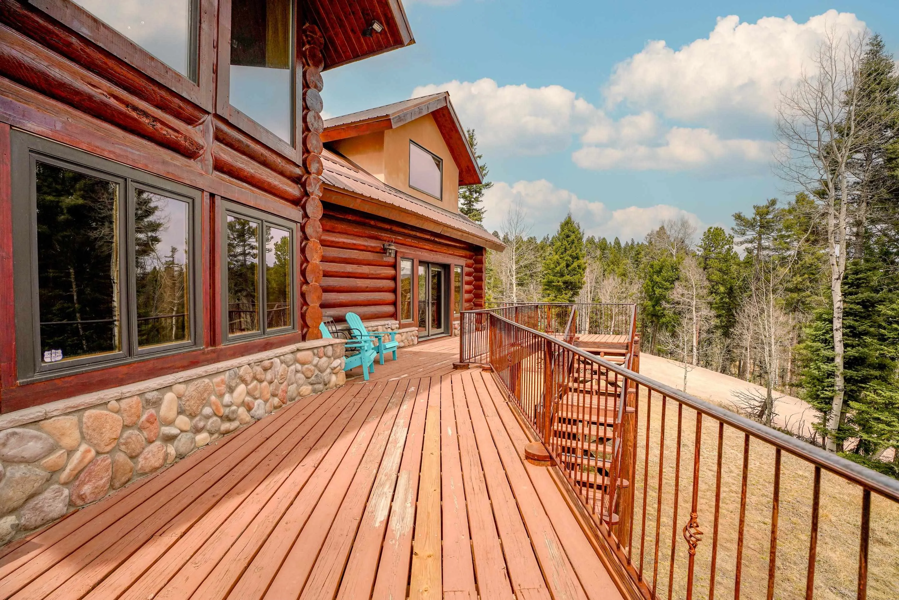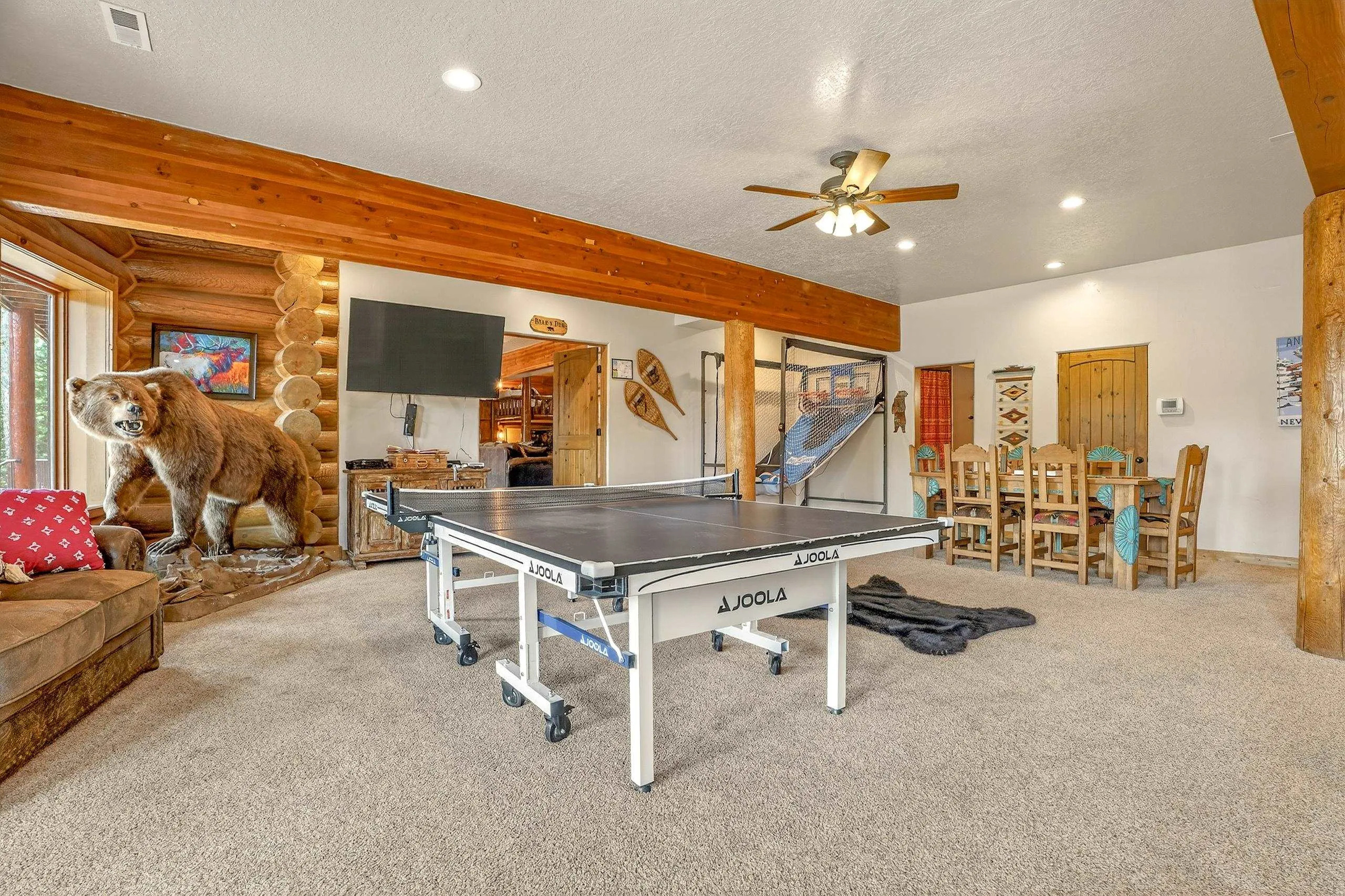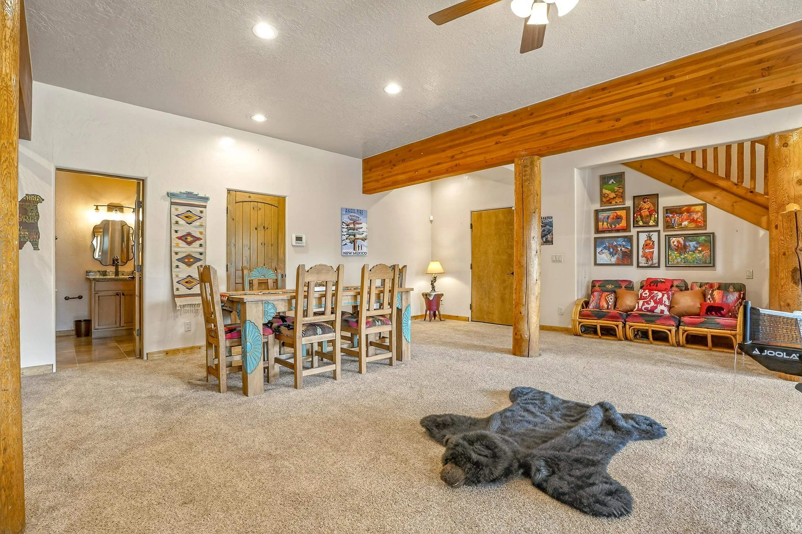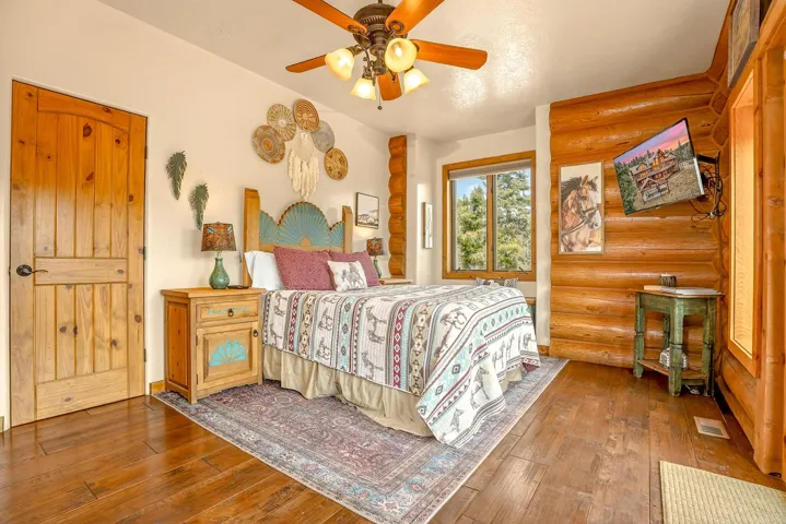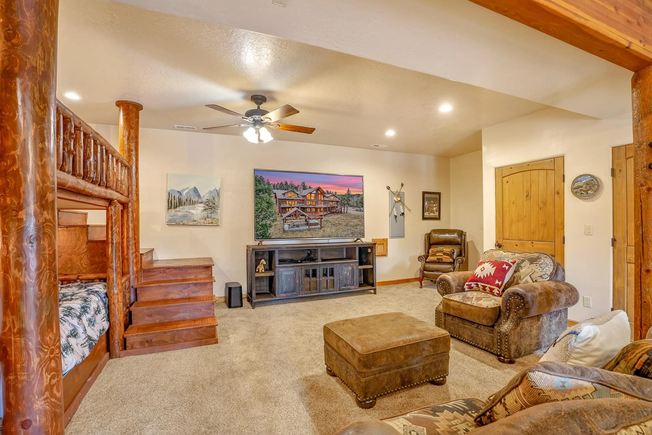 Mountain Luxury Living At Its Finest! This beautiful log and stucco residence boasts 4 spacious bedrooms, 5 bathrooms, a safe room, a children’s game room and multiple living areas. Highlighted with impressive natural log columns, soaring ceilings and a wall of windows with great views. A massive rock fireplace serves as the centerpiece of the expansive living room. The kitchen is thoughtfully designed with custom cabinetry, granite countertops, and high-quality appliances. This home offers two additional living or recreational spaces, making it ideal for large or extended family gatherings. Downstairs the “bear den” has plenty of space for game-night and the other room has unique custom bunkbeds which is perfect for the little ones. Step outside to enjoy multiple outdoor spaces, including a hot tub gazebo, a main-level deck, and a lower deck—perfect for relaxing and taking in the beautiful views toward the Valley of the Utes. Located a couple of blocks from Monte Verde Lake, this stunning home offers easy access to all the amenities Angel Fire has to offer, including skiing and golfing. Additional features include a large two-car garage and a covered drive-up portal at the front of the home, spacious enough for convenient sheltered parking. Generated $100,000+ per year in rental income for the past two years!