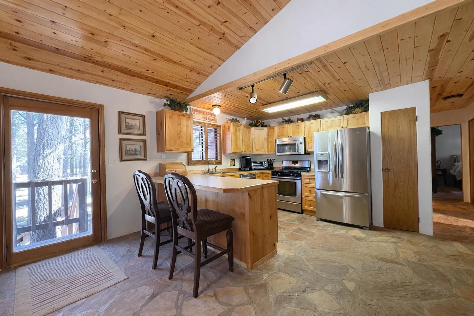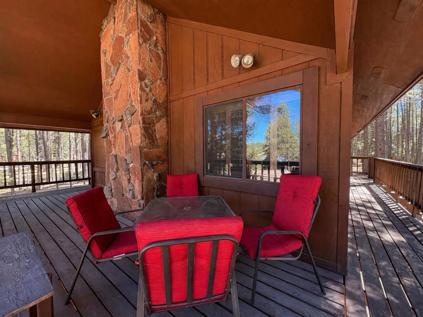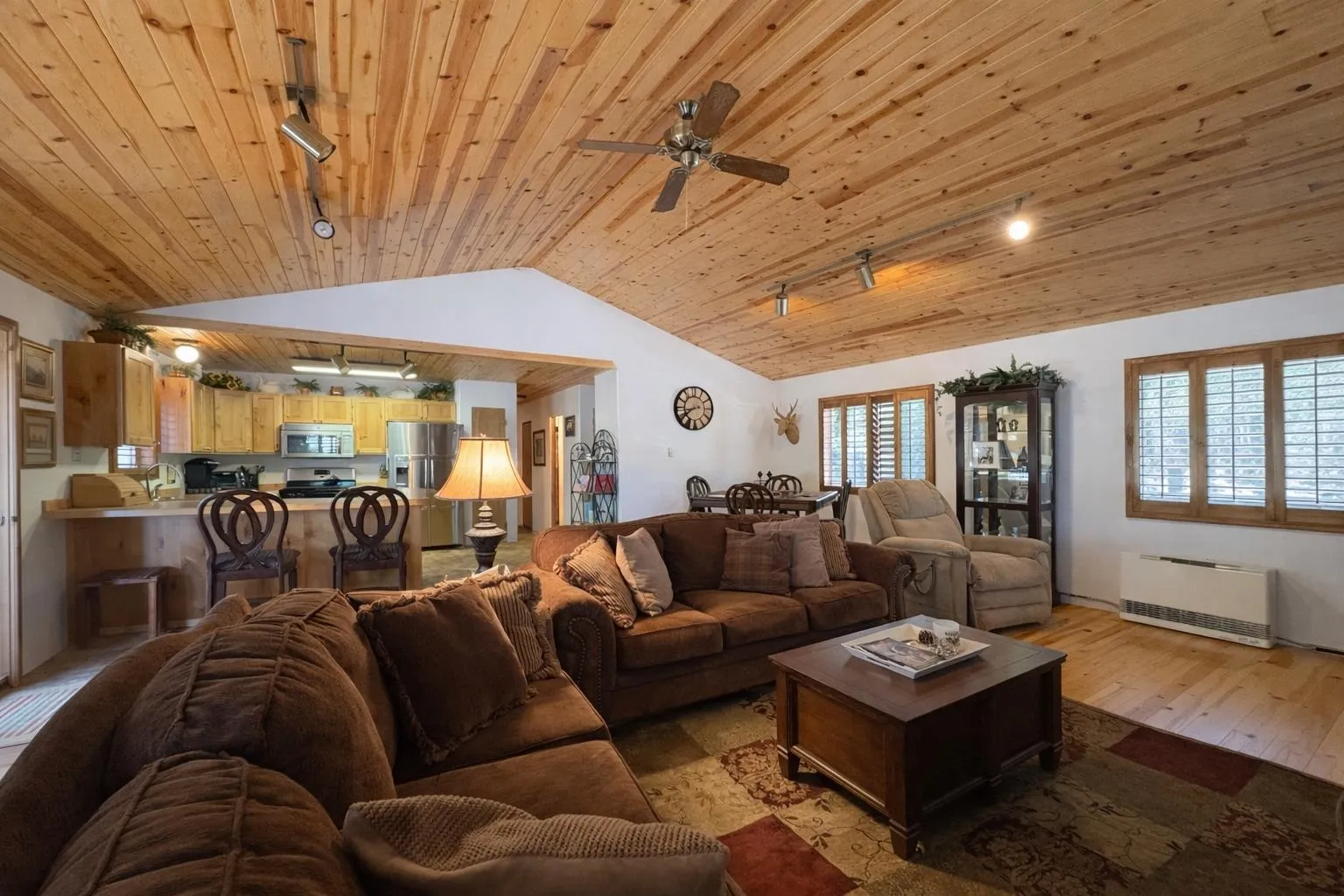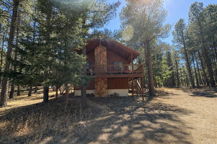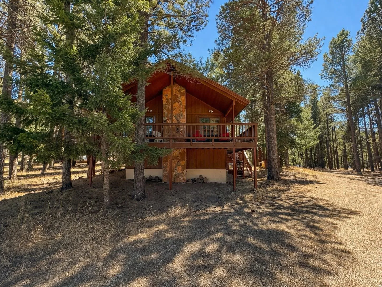 1 block from Monte Verde Lake! This adorable cabin is conveniently located, has 2 fireplaces, stone flooring, tongue & groove celings and great outdoor space! When you first walk in you are greeted by a great mud room area that leads into an open room where you’ll find the kitchen, dining room and living room. The large stone fireplace is the highlight of this space! When you step outside onto the patio is a great covered porch and a sunny BBQ area. Further into the house, you follow the stone floor into a master bedroom with another stone fireplace! The property is a part of the Angel Fire Resort Membership, where you can enjoy a PGA golf course, down hill mountain biking park, ski resort, hiking trails, fishing and so much more!