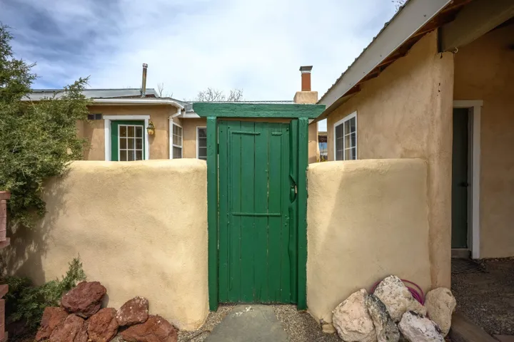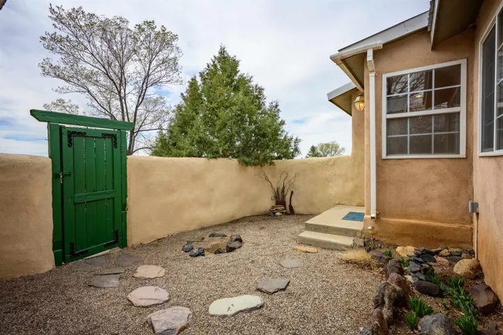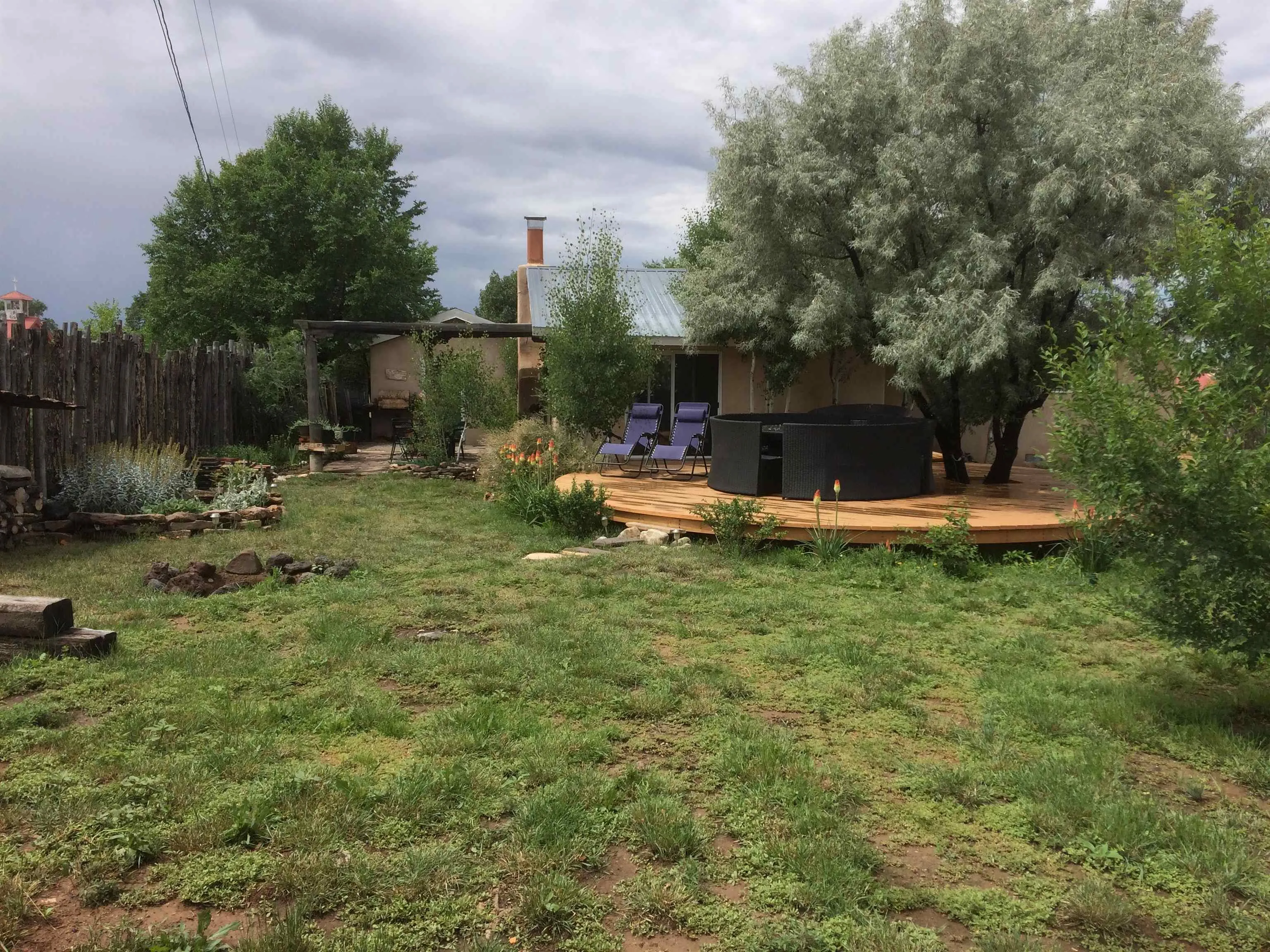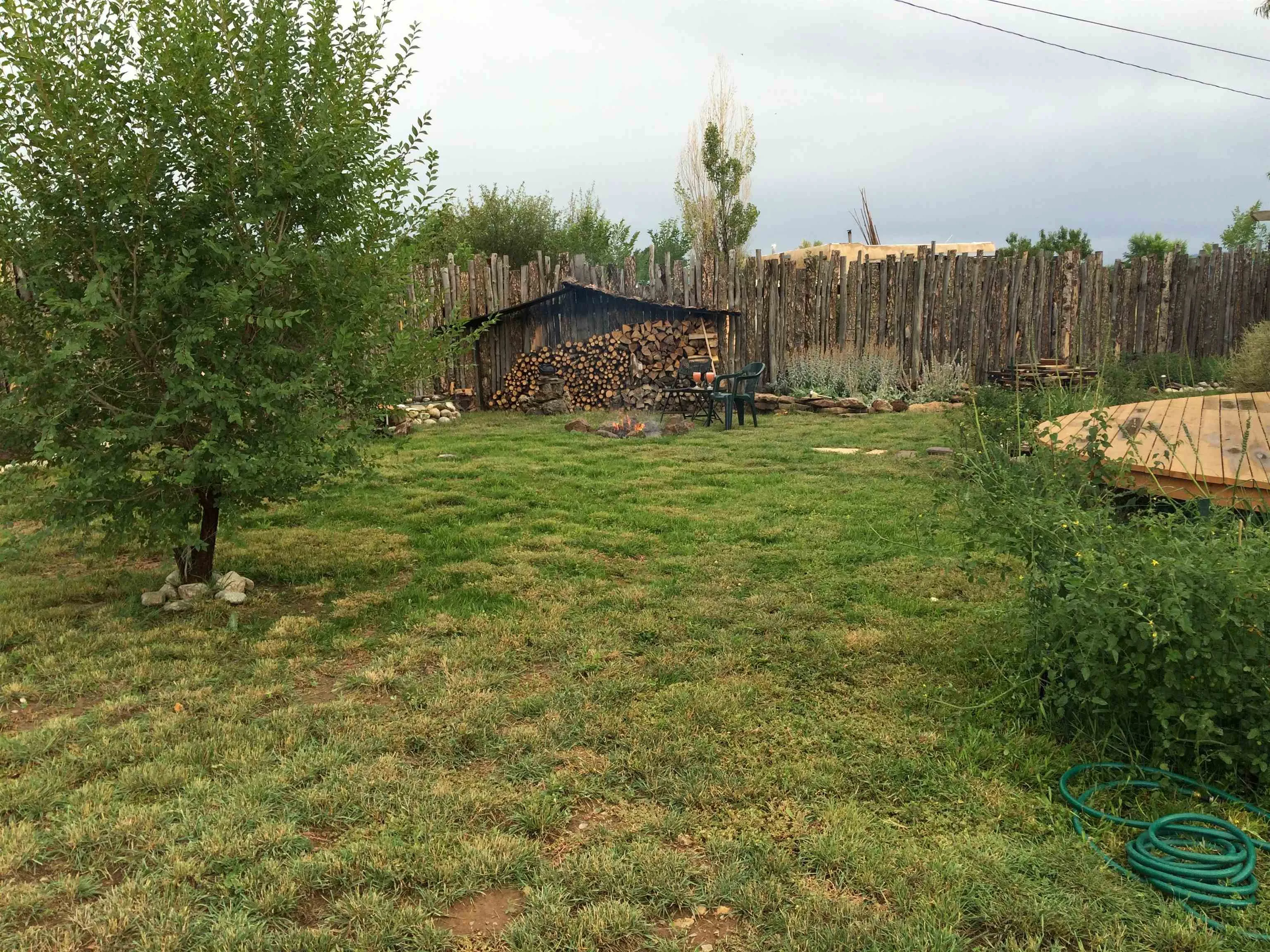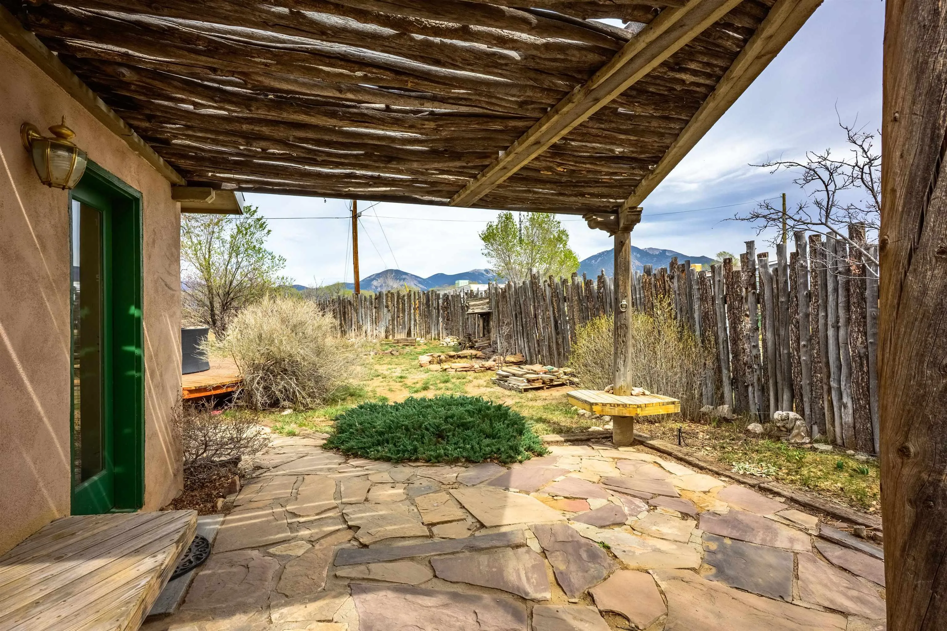 Near the end of a quiet road, across from “Little Santo Nino Church,” is a special dwelling on 0.88 acres with young aspens and flowering bushes. The property has a front courtyard concealed behind a curved wall with large slate stepping stones that lead to a covered portal. Inside is an open living/dining area and a very festive cute kitchen. A large picture window and sliding glass doors provide lots of light, perfect for plants, and the stone fireplace will create warmth and ambiance for the humans. The home has two full bathrooms, one large bedroom, and two smaller rooms which can be used as an office, study, or spare bedroom. The driveway leads to a carport with an attached storage shed. Wooden fencing encloses the back yard creating a private sanctuary. At the center is a nature inspired elevated circular deck with a beautiful, sweetly scented olive tree umbrellaing over your party. This deck adds 500 sq ft of usable outdoor space. Entertain with the eight-seater Kontiki while enjoying those tasty fire-roasted meals, then kick back to observe the stars and feel the Great Cosmos. The yard has a tilled garden area, raised beds, and numerous fruit trees-apple, peach, plum, cherry, and produced over a thousand juicy apricots. Taos is known for its spectacular sunsets drawing artists from all over, as well as a deep history of spiritual groups, that congregate for the mystical experiences. Adventure enthusiasts come to ski, bike, and kayak, succumbing to the allure of Taos Mountain and the Gorge. Conveniently located; 15 minutes to the heart of Taos and 25 minutes to Taos Ski Valley or the Rio Grande. A brand-new septic system adds peace of mind and value. With its peaceful setting and inviting outdoor spaces, this property is a wonderful opportunity to enjoy the best of Taos living—schedule your showing today.