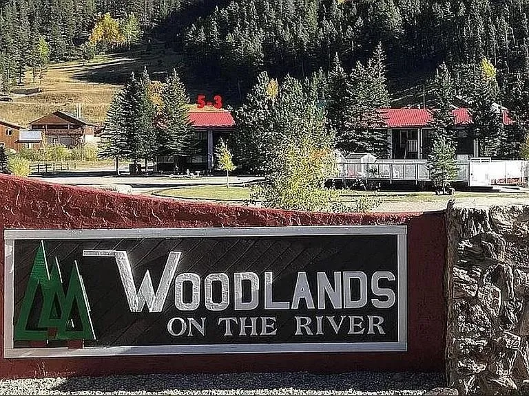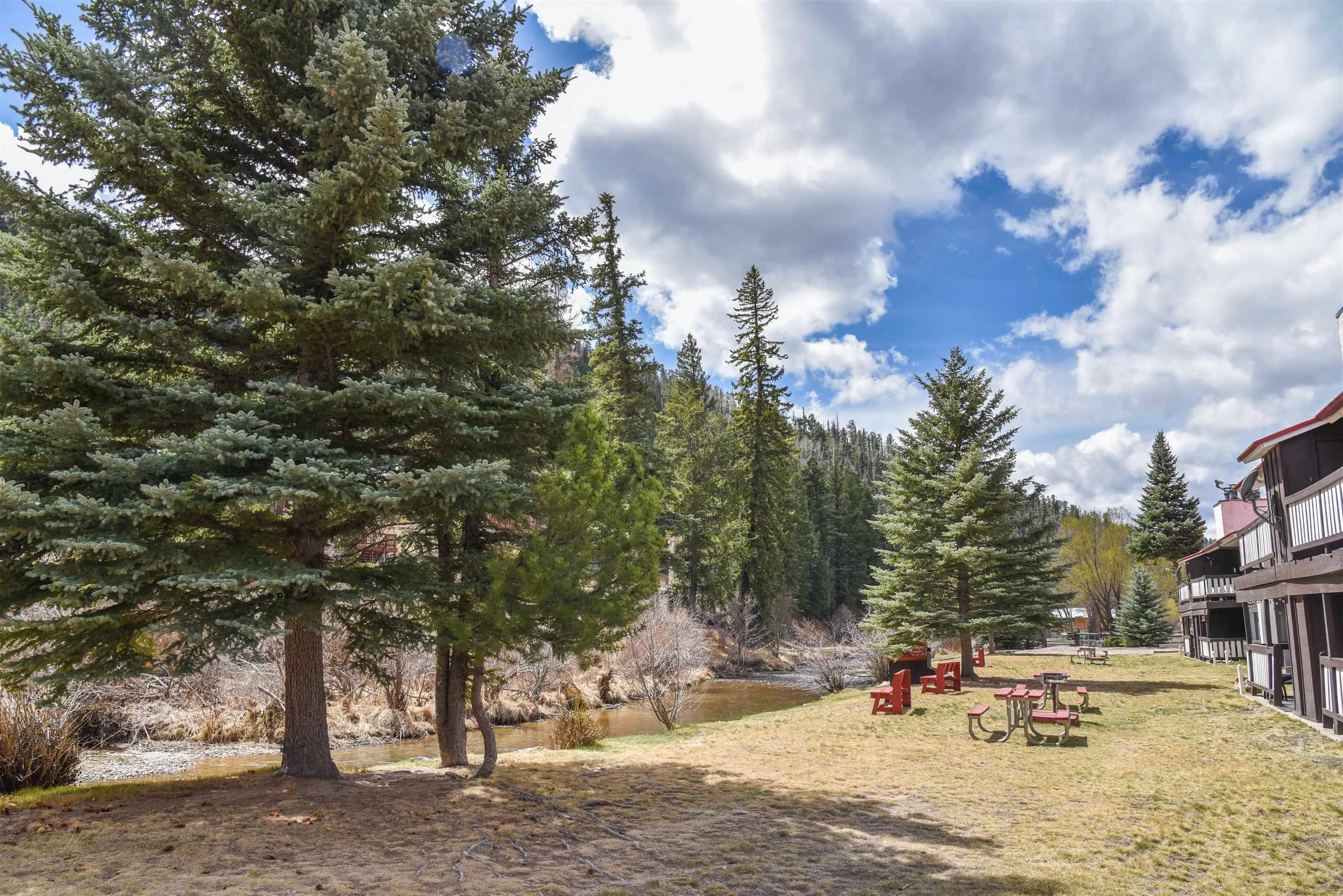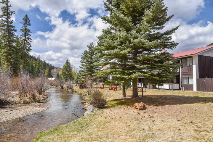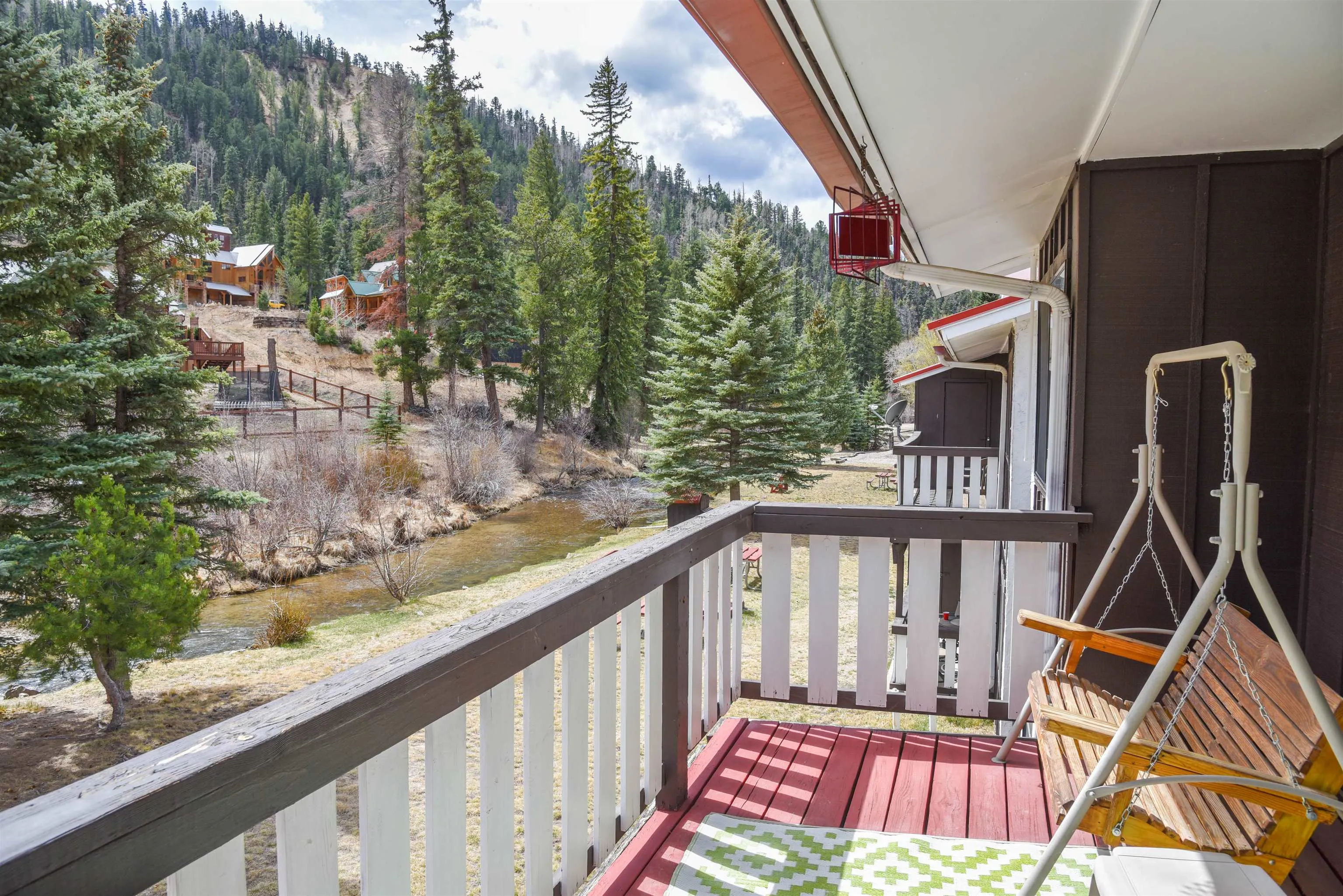 Woodlands Condominium Unit 4 — 2-Bedroom, 1-Bath Riverfront Condo in Red River, New Mexico | 909 Sq Ft Riverfront condominium in Red River, New Mexico offering 909 square feet of mountain-style living space in a two-story complex set directly along the Red River. Unit 4 in Building 4 is an upper-level, 2-bedroom, 1-bath condo with private balcony overlooking the river, one of the most sought-after locations within the Woodlands community. The open-concept living and dining area features a dramatic floor-to-ceiling stone fireplace with wood-burning stove insert, floor-to-ceiling natural stone surround, and a raised stone hearth, a true centerpiece for cool mountain evenings. Sliding glass doors open to the private balcony with direct Red River views and the sound of moving water year-round. The fully equipped kitchen includes oak cabinetry, laminate countertops, full-size refrigerator, electric range, built-in microwave, dishwasher, double sink, and breakfast bar seating — open to the living area and comfortable for vacation use or short-term rental turnovers. Both bedrooms are well-sized with closet space, ceiling fans, and mountain character. The primary bedroom features a hand-painted black bear mural wall and mirrored closet doors. The second bedroom is decorated in a Western theme with rope accents, horseshoe and Texas motifs, and mirrored closet doors. The full bathroom includes a walk-in shower, single vanity, and nature-themed décor. The unit is offered furnished and turnkey-ready. Woodlands Condominium amenities include community green space along the Red River, mature spruce and pine trees, picnic tables, charcoal grills, a children’s play structure, a stocked pond, and benches along the riverbank, all maintained by the HOA. The setting provides year-round access to trout fishing, wildlife viewing, and the sights and sounds of the Red River corridor. Located in Red River, NM, minutes from Red River Ski Area, Red River Main Street shops and restaurants, hiking trails, and the Enchanted Circle Scenic Byway. Per HOA guidelines, this property is not eligible for full-time residential use; ideal as a personal vacation getaway or investment property with vacation rental potential.