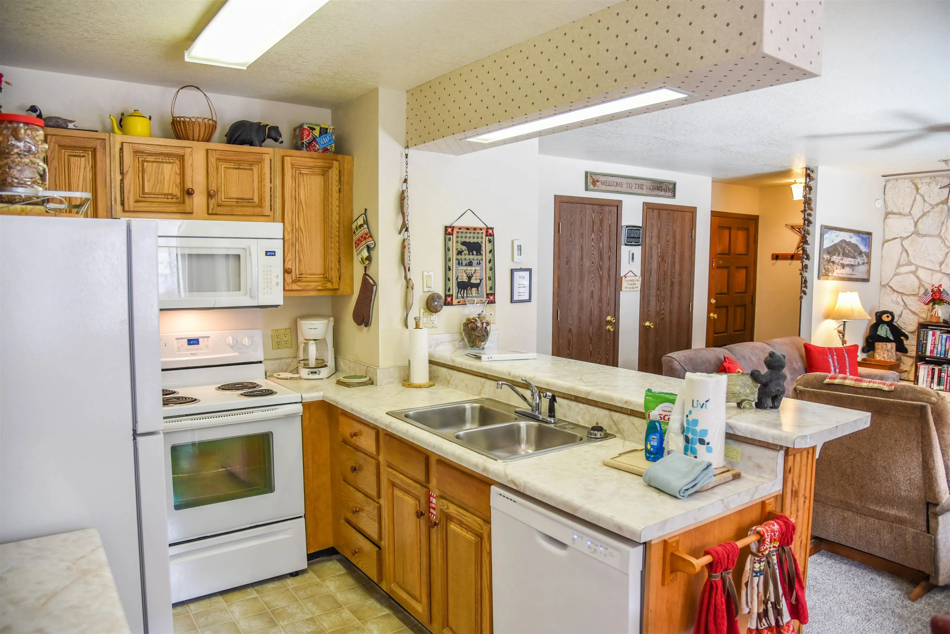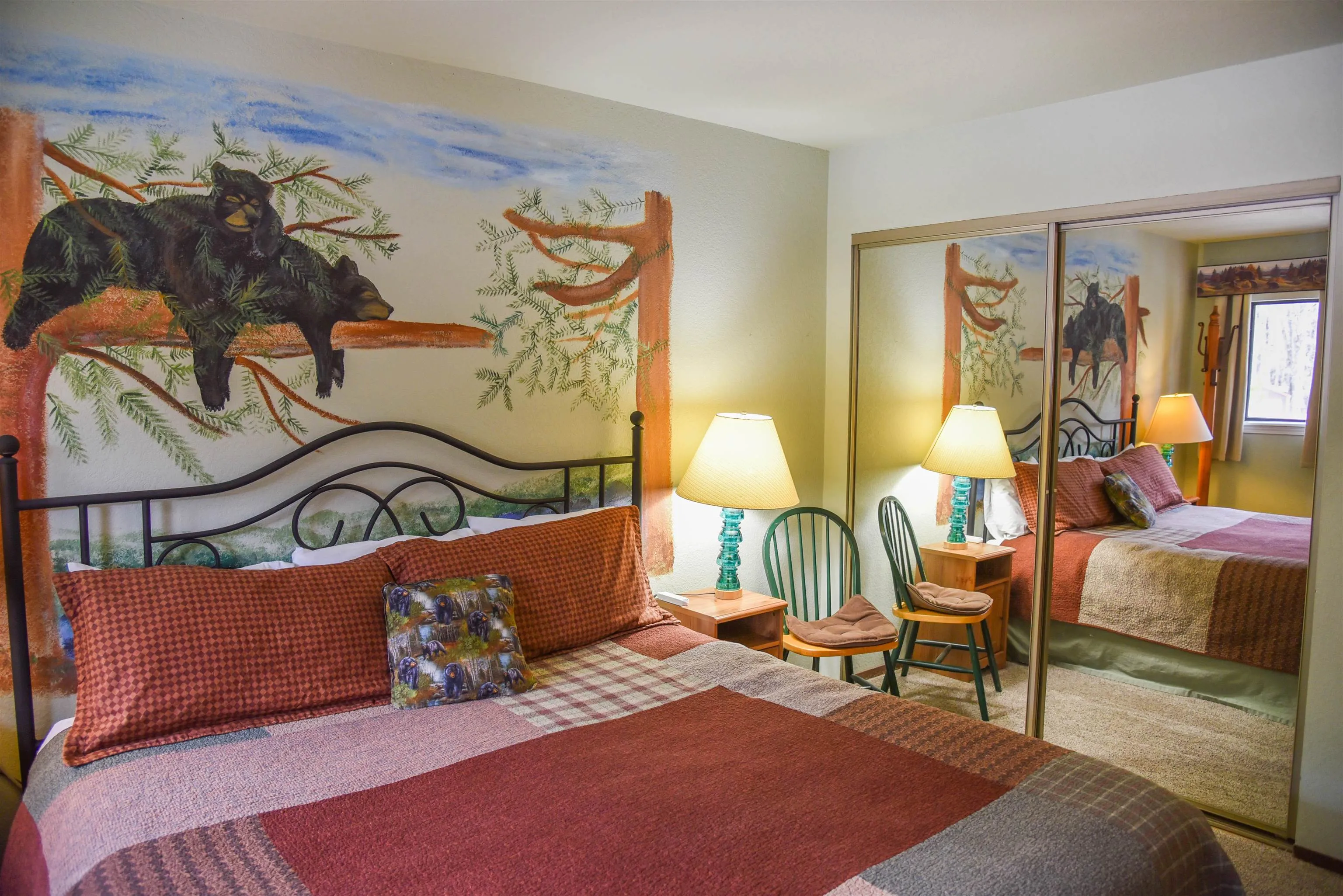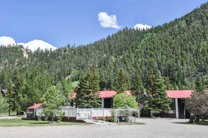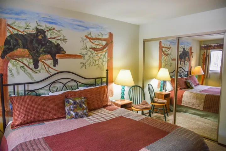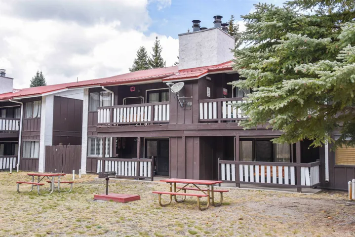 Woodlands Condominium Unit 4 — 2-Bedroom, 1-Bath Riverfront Condo in Red River, New Mexico | 909 Sq Ft Riverfront condominium in Red River, New Mexico offering 909 square feet of mountain-style living space in a two-story complex set directly along the Red River. Unit 4 in Building 4 is an upper-level, 2-bedroom, 1-bath condo with private balcony overlooking the river, one of the most sought-after locations within the Woodlands community. The open-concept living and dining area features a dramatic floor-to-ceiling stone fireplace with wood-burning stove insert, floor-to-ceiling natural stone surround, and a raised stone hearth, a true centerpiece for cool mountain evenings. Sliding glass doors open to the private balcony with direct Red River views and the sound of moving water year-round. The fully equipped kitchen includes oak cabinetry, laminate countertops, full-size refrigerator, electric range, built-in microwave, dishwasher, double sink, and breakfast bar seating — open to the living area and comfortable for vacation use or short-term rental turnovers. Both bedrooms are well-sized with closet space, ceiling fans, and mountain character. The primary bedroom features a hand-painted black bear mural wall and mirrored closet doors. The second bedroom is decorated in a Western theme with rope accents, horseshoe and Texas motifs, and mirrored closet doors. The full bathroom includes a walk-in shower, single vanity, and nature-themed décor. The unit is offered furnished and turnkey-ready. Woodlands Condominium amenities include community green space along the Red River, mature spruce and pine trees, picnic tables, charcoal grills, a children’s play structure, a stocked pond, and benches along the riverbank, all maintained by the HOA. The setting provides year-round access to trout fishing, wildlife viewing, and the sights and sounds of the Red River corridor. Located in Red River, NM, minutes from Red River Ski Area, Red River Main Street shops and restaurants, hiking trails, and the Enchanted Circle Scenic Byway. Per HOA guidelines, this property is not eligible for full-time residential use; ideal as a personal vacation getaway or investment property with vacation rental potential.