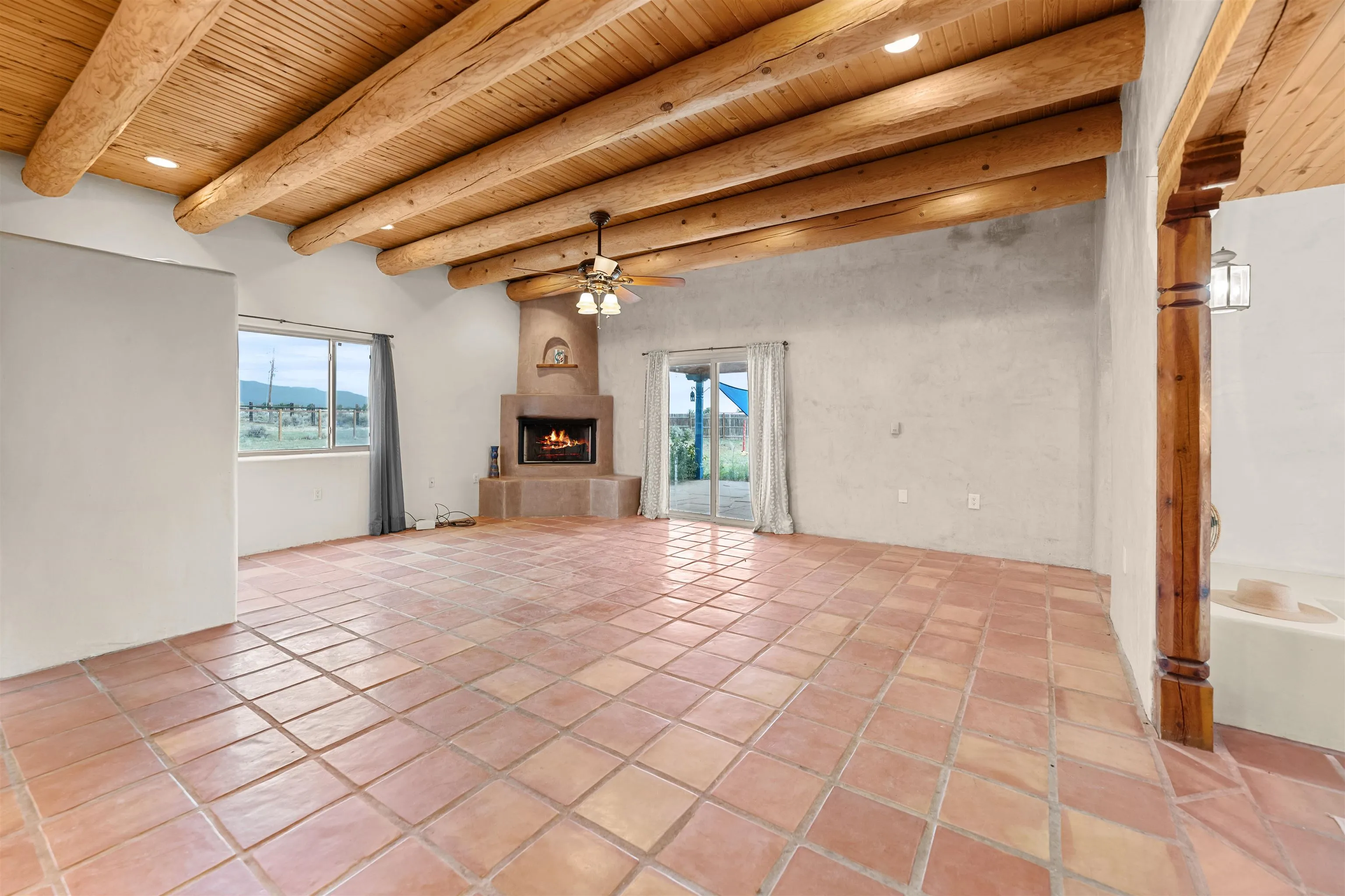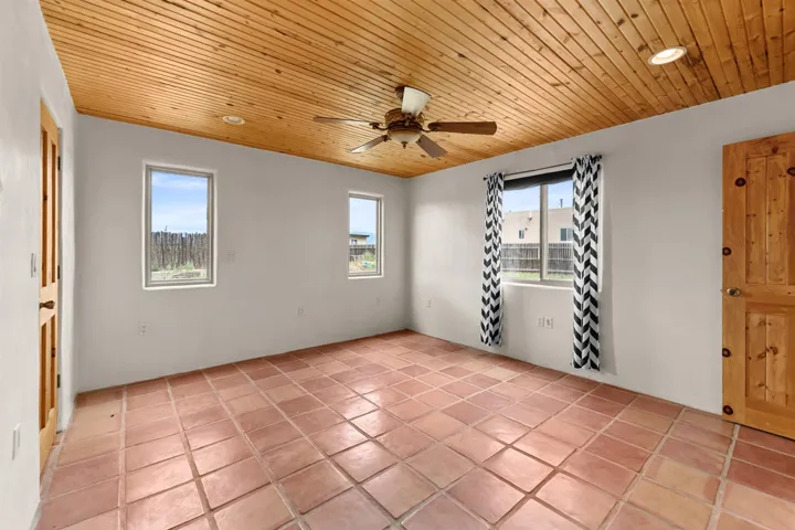 This stunning Pueblo-style home in Taos blends timeless architecture with modern comfort. Inside, soaring 10-foot ceilings with oversized vigas create a sense of warmth and spaciousness, while the open floor plan invites easy flow between living, dining, and kitchen areas. The expansive living room is the heart of the home, featuring a traditional Kiva fireplace and sliding doors that open onto a covered portal—perfect for enjoying breathtaking sunsets to the west. A convenient half-bathroom is located just off the main living space. The thoughtful split-bedroom layout ensures privacy, with each suite offering an oversized en suite bath and serene views to the south and west. Large windows bathe the interiors in natural light, framing the beauty of the surrounding landscape. Outdoors, you’ll find raised garden beds, a storage shed for tools and equipment, and plenty of space to enjoy the mountain air. Recent upgrades include a new roof (2019) and several new windows. With its blend of traditional craftsmanship, elegant proportions, and inviting design, this home captures the essence of Taos living—both refined and deeply connected to the land.