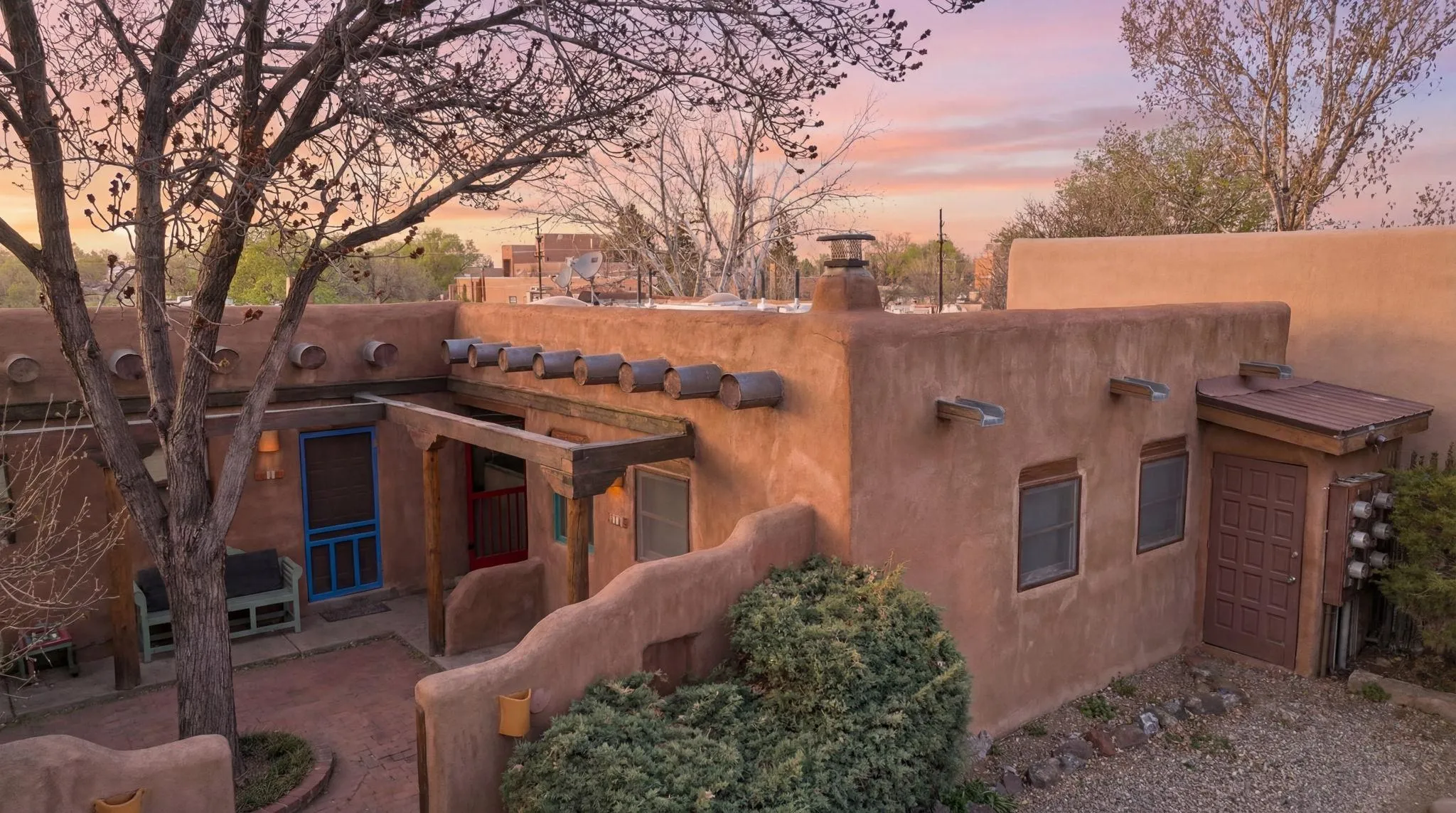 Sunset-Facing Historic Adobe Studio Around the Corner from Taos Plaza ~ Quietly tucked into the very northwest corner of the Las Casitas Condominiums blooming courtyard, #9 West is a highly private adobe studio listed on the National Register of Historic Places. The space is firmly grounded in authentic Southwestern character, featuring classic Saltillo tile floors, exposed ceiling vigas and beams with t&g, large nichos, built-in bancos, and a kiva fireplace for chilly high-desert nights. Plenty of natural light flows into this warm and well lit condo with skylights. As one of only three units in the building with a western exposure, the studio provides a rare sense of space and a vantage point to watch the sunset filter through distant cottonwoods. Walk and bike everywhere from this secluded unit; the historic Taos Plaza is just steps away, offering immediate access to the area’s renowned galleries, museums, restaurants, and live music venues. Taos Ski Valley for skiing and then Ojo Caliente Hot Spring for soaking, both are a short scenic drive over the Gorge Bridge and Rio Grande National Monument. Designed for an effortless lifestyle, the low condo HOA cost covers grounds maintenance, trash service, water, sewer, and general insurance on the unit structure, helping to keep utility costs down for all homeowners. This is the Taos Casita you don’t want to let get away, reach out to see for yourself! Vamos!