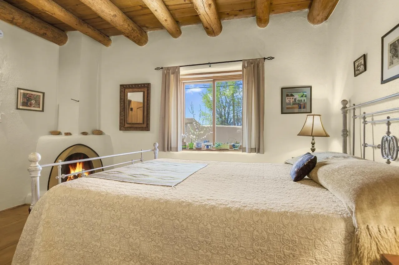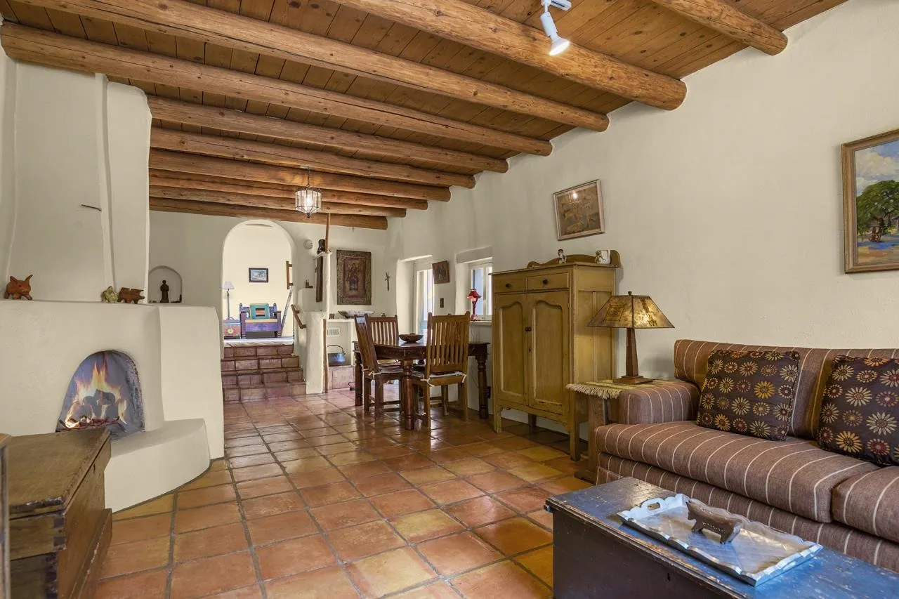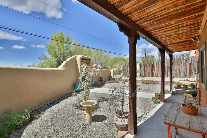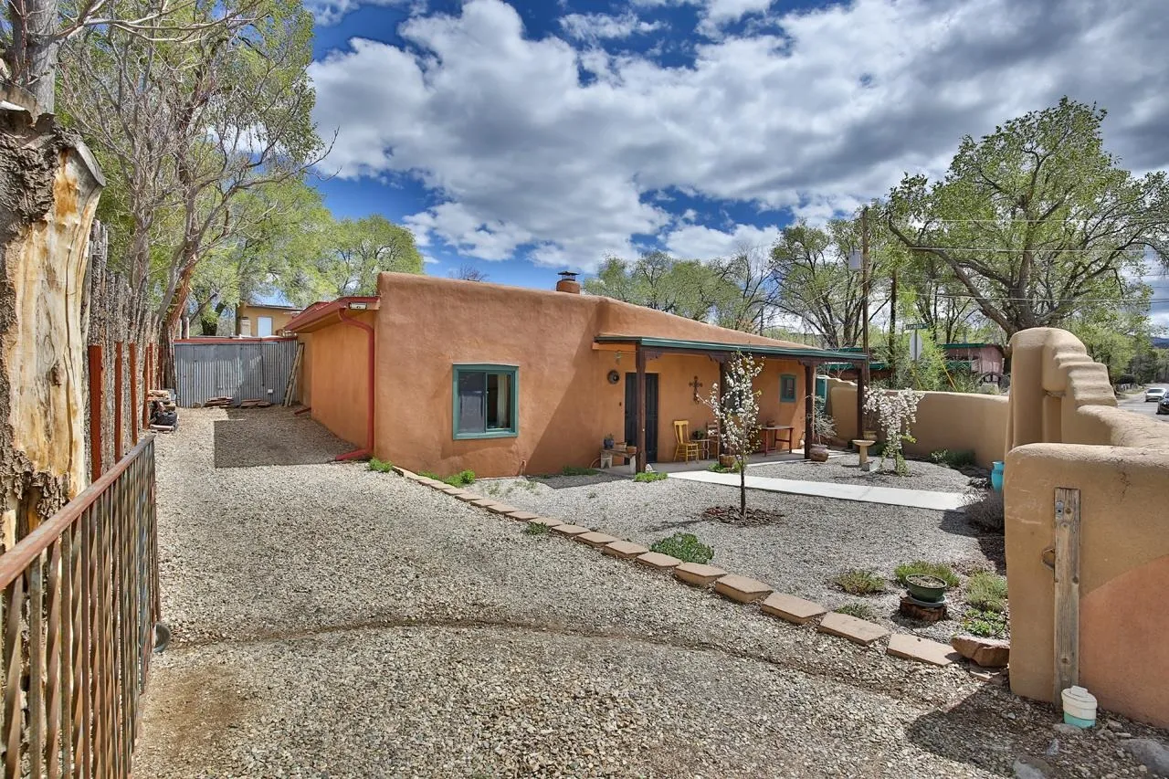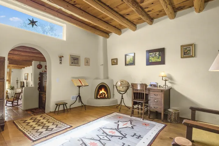 Enchanting, authentic adobe home in the historic neighborhood by the Ranchos de Taos Plaza. This tastefully renovated 2-bedroom + extra room/2-bath home offers classic Taos “character” throughout: saltillo tile and wide-plank wood floors; ceilings with hand-hewn viga beams; a mixture of latillas, tongue & groove, and coved plaster in the spaces between the beams; 3 “beehive” wood-burning fireplaces for cozy warmth and ambiance; colorful porcelain Mexican tiles in kitchen and baths; nichos and bancos; hand-plastered walls. The thick adobe walls are naturally insulating and sound-attenuating (it’s so quiet inside), and they keep the house cool in summer and warm in winter. The efficient galley kitchen looks out onto honeysuckle-covered grillwork. The appliances are only a few years old. The extra room is currently set up as a library/den but it could be a third bedroom. It features a fireplace, south-facing clerestory window, a large closet/storage space behind rustic wood doors,and a built-in desk and antique library drawers. The rear courtyard is completely enclosed by adobe walls, offering a wonderful setting for outdoor living and entertaining. There are fruit trees (peach, plum, pear), a concrete slab for cooking and dining, and a banco for extra seating. Inside the adobe wall along Valerio Road, the front yard includes a traditional “portal” and a xeriscaped yard with cherry and weeping crabapple trees, and native water-wise perennial plants which attract birds (especially hummingbirds) and bees. The driveway next to the house can accommodate 2-3 vehicles. The property also includes a parking area directly across Valerio Road; it can handle another3-4 vehicles. The original part of the home is thought to date from the late 1800’s. Situated in a traditional Taos neighborhood, walking distance to historic San Francisco de Asis church, a couple of restaurants, galleries, a coffee shop, and the post office. Located less than 4 miles from Taos Plaza, near traditional agricultural fields and acequias (irrigation ditches) coming from the Rio Grande del Rancho. In 2023, the owners had a new Brai-type (modified Bitumen) roof installed over the living-dining portion of the house. The remainder of the roof is metal. Rain gutters were installed in 2021. The entire interior and the wood exterior trim was repainted in 2025. The wood floors were recently refinished. Note: Many of the fine furnishings are available separately. Any documents included with this listing are provided as a courtesy only. Buyer should rely on documents provided with title commitment. Neither the Listing Broker nor Seller warrant the square footage of the home or the acreage of the property. If the size of the home or the property acreage is of material concern to Buyer, then Buyer should have it measured and/or surveyed. The fires depicted in the fireplaces are virtually included.