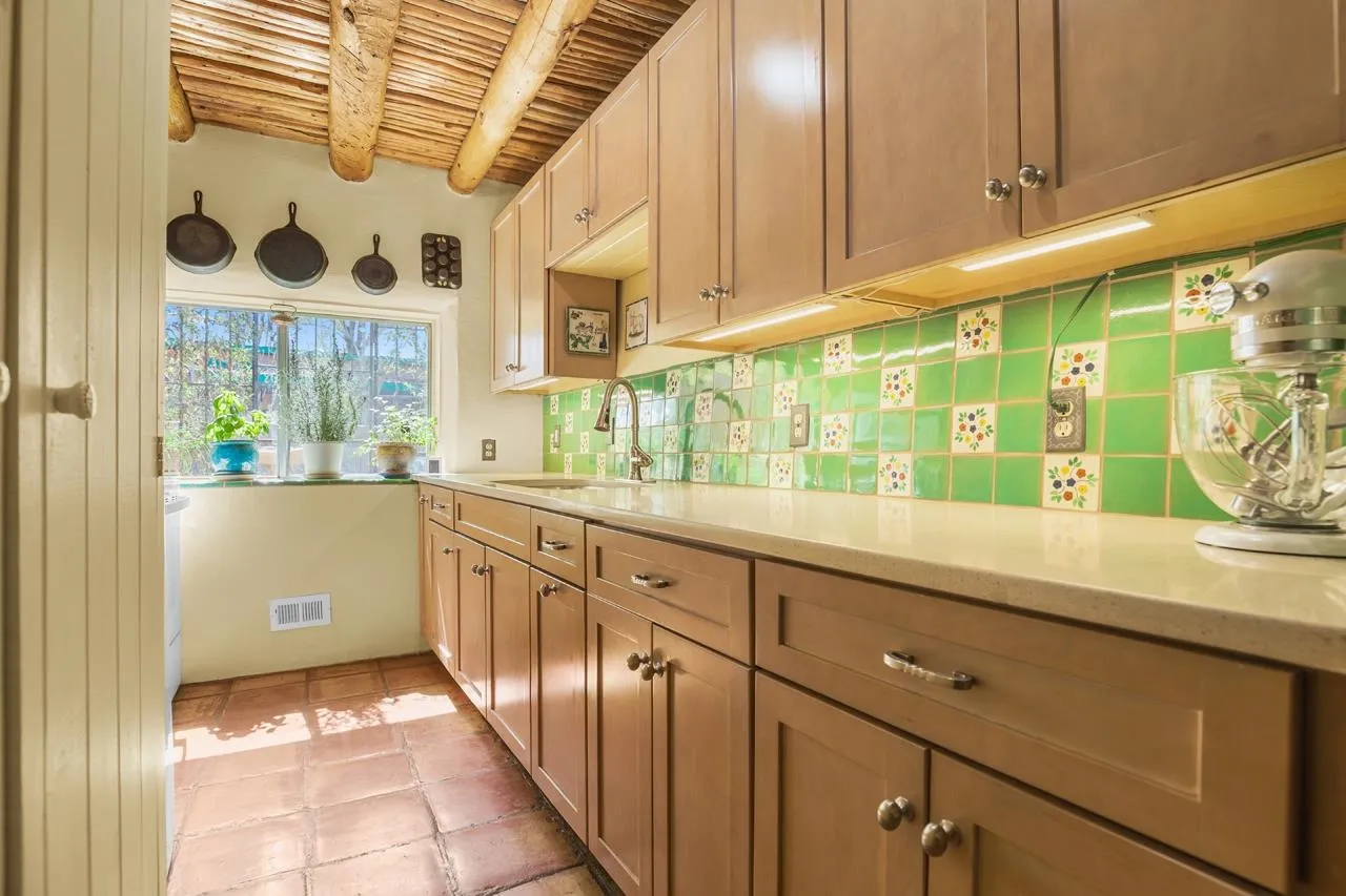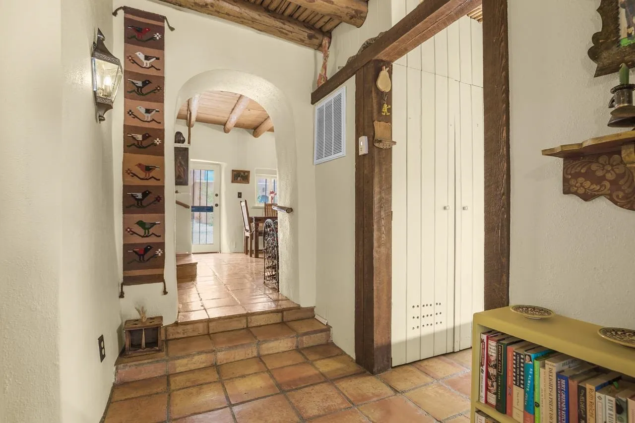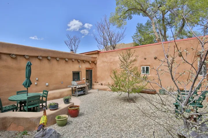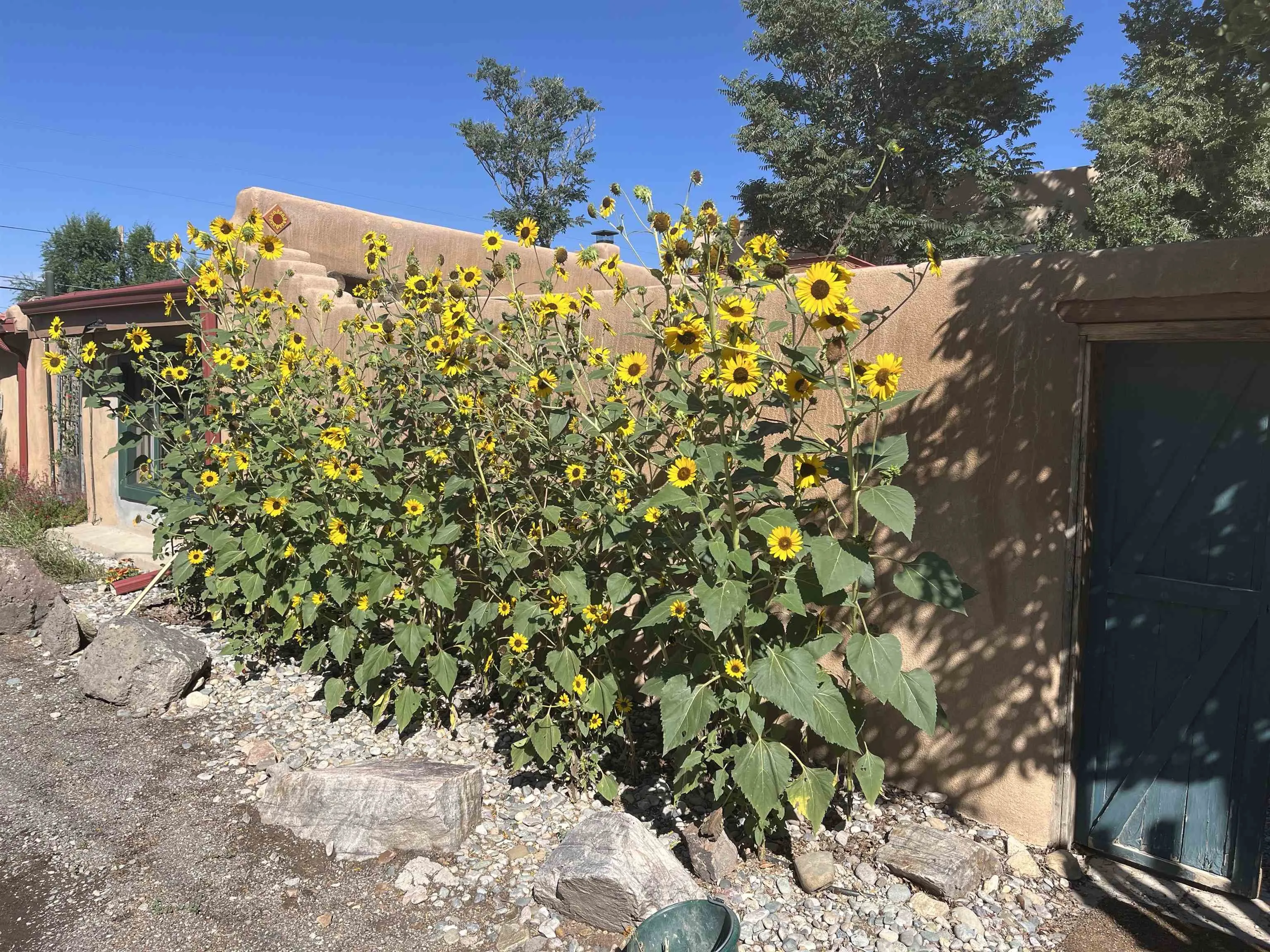 Enchanting, authentic adobe home in the historic neighborhood by the Ranchos de Taos Plaza. This tastefully renovated 2-bedroom + extra room/2-bath home offers classic Taos “character” throughout: saltillo tile and wide-plank wood floors; ceilings with hand-hewn viga beams; a mixture of latillas, tongue & groove, and coved plaster in the spaces between the beams; 3 “beehive” wood-burning fireplaces for cozy warmth and ambiance; colorful porcelain Mexican tiles in kitchen and baths; nichos and bancos; hand-plastered walls. The thick adobe walls are naturally insulating and sound-attenuating (it’s so quiet inside), and they keep the house cool in summer and warm in winter. The efficient galley kitchen looks out onto honeysuckle-covered grillwork. The appliances are only a few years old. The extra room is currently set up as a library/den but it could be a third bedroom. It features a fireplace, south-facing clerestory window, a large closet/storage space behind rustic wood doors,and a built-in desk and antique library drawers. The rear courtyard is completely enclosed by adobe walls, offering a wonderful setting for outdoor living and entertaining. There are fruit trees (peach, plum, pear), a concrete slab for cooking and dining, and a banco for extra seating. Inside the adobe wall along Valerio Road, the front yard includes a traditional “portal” and a xeriscaped yard with cherry and weeping crabapple trees, and native water-wise perennial plants which attract birds (especially hummingbirds) and bees. The driveway next to the house can accommodate 2-3 vehicles. The property also includes a parking area directly across Valerio Road; it can handle another3-4 vehicles. The original part of the home is thought to date from the late 1800’s. Situated in a traditional Taos neighborhood, walking distance to historic San Francisco de Asis church, a couple of restaurants, galleries, a coffee shop, and the post office. Located less than 4 miles from Taos Plaza, near traditional agricultural fields and acequias (irrigation ditches) coming from the Rio Grande del Rancho. In 2023, the owners had a new Brai-type (modified Bitumen) roof installed over the living-dining portion of the house. The remainder of the roof is metal. Rain gutters were installed in 2021. The entire interior and the wood exterior trim was repainted in 2025. The wood floors were recently refinished. Note: Many of the fine furnishings are available separately. Any documents included with this listing are provided as a courtesy only. Buyer should rely on documents provided with title commitment. Neither the Listing Broker nor Seller warrant the square footage of the home or the acreage of the property. If the size of the home or the property acreage is of material concern to Buyer, then Buyer should have it measured and/or surveyed. The fires depicted in the fireplaces are virtually included.