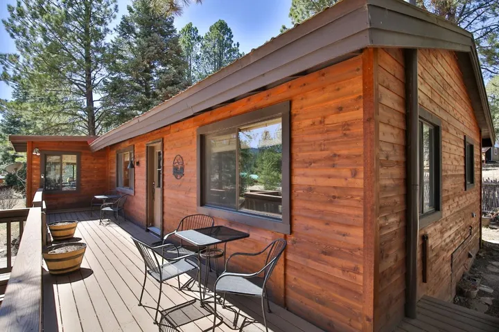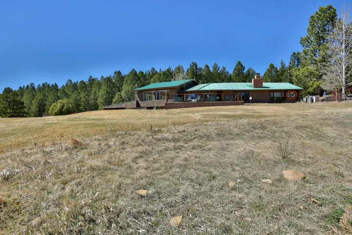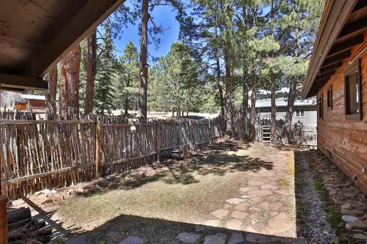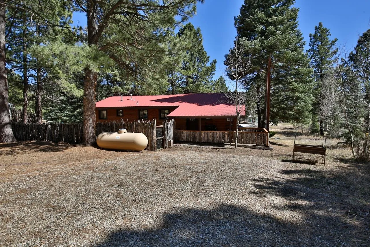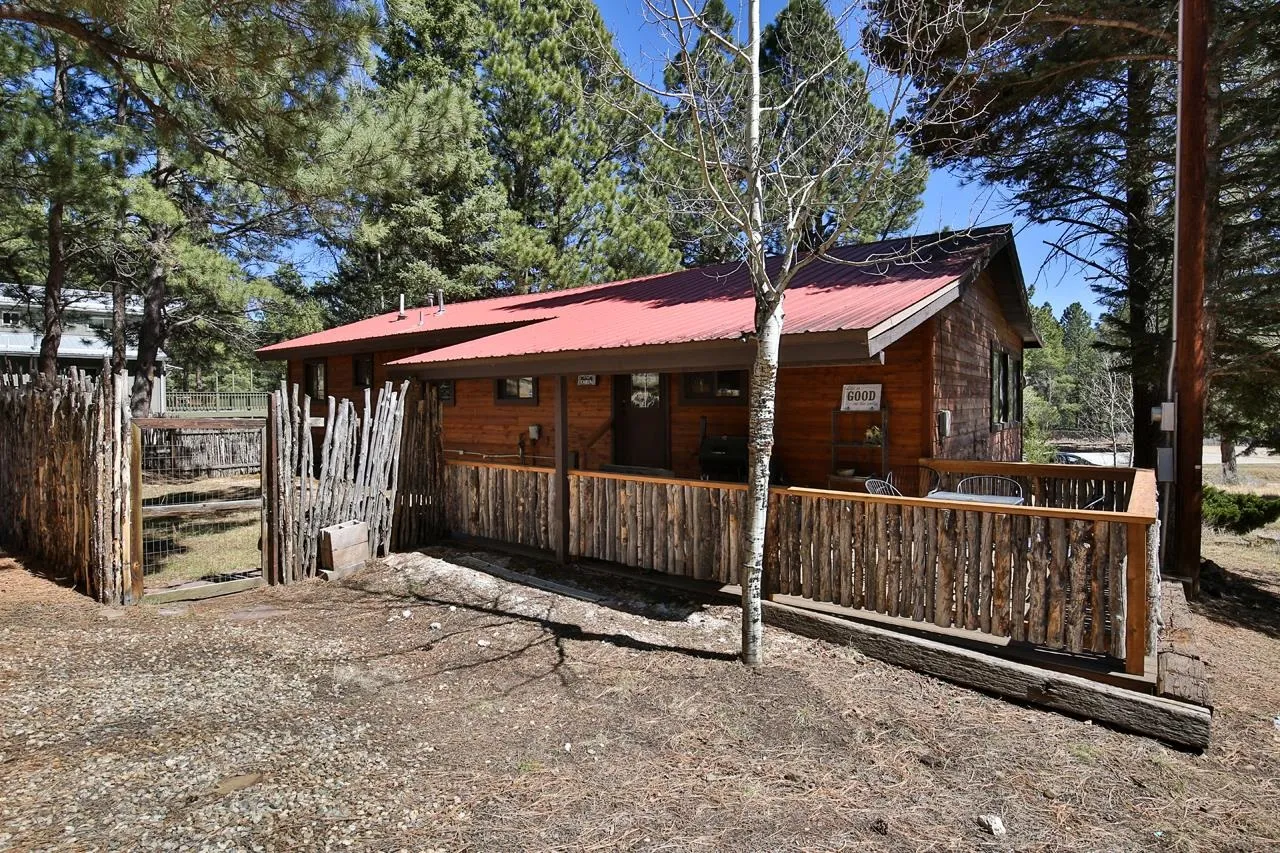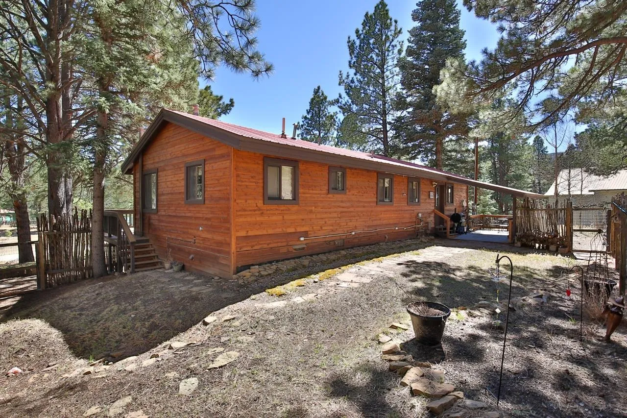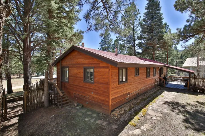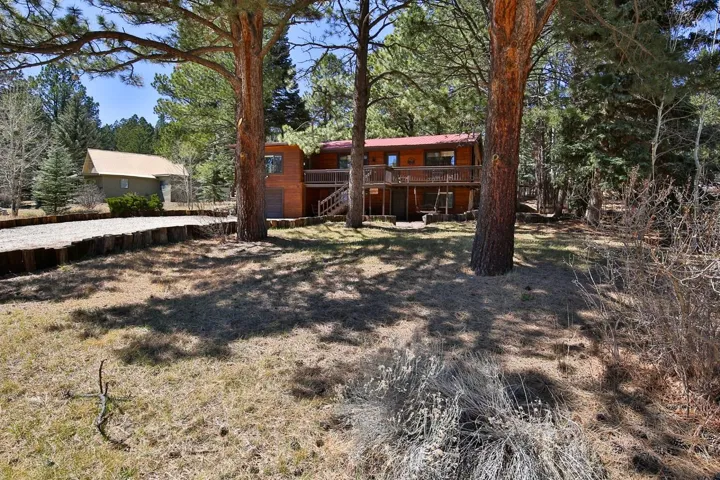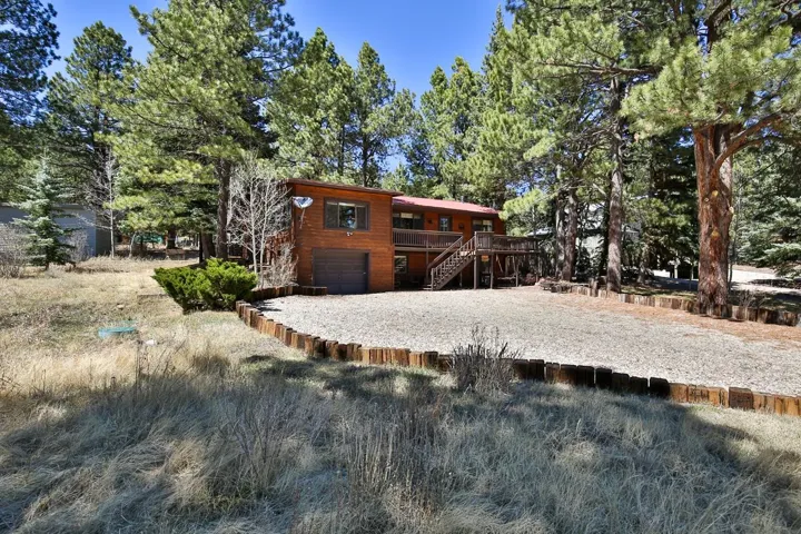 Mountain living meets modern comfort in this beautifully remodeled El Valle Escondido retreat set among towering pines. Nestled among mature trees, this 1,950 sq. ft. home offers the perfect blend of comfort, style, and year-round recreation. Featuring 2 bedrooms, 2 bathrooms, and a spacious bonus living area, the home is thoughtfully designed with the main living spaces upstairs to capture abundant natural light and scenic views overlooking the valley and clubhouse. Vaulted tongue-and-groove ceilings with exposed beams, expansive windows, and an open-concept layout create a bright and inviting atmosphere. The updated kitchen features quality cabinetry, stainless appliances, a large center island, and pantry ideal for entertaining and everyday living. A 2015 remodel brought updated kitchens, baths, flooring, and finishes throughout, while the exterior was enhanced with rich stained cedar siding for a true alpine feel. Multiple living areas including a generous lower-level bonus space provide flexibility for guests, recreation, or work-from-home use. Enjoy outdoor living on two trex decks expand living areas to offer privacy and a peaceful mountain setting. The rare double lot (0.56 acres) adds additional space and usability. Fully fenced latilla area perfect for pets. The attached 1-car double-deep garage offers ample room for storage, a vehicle, and/or workshop. The homeowners association provides community water, trash service, road maintenance, and access to outstanding amenities including a clubhouse, 9-hole golf course, stocked fishing ponds, and a seasonal swimming pool. Conveniently located between Taos and Angel Fire, this turnkey property is an ideal full-time residence or mountain getaway.