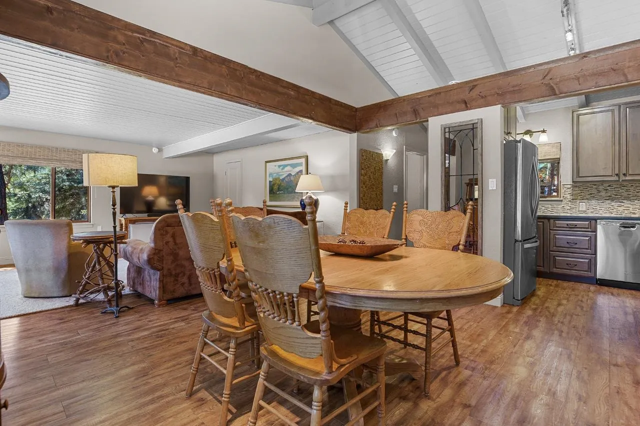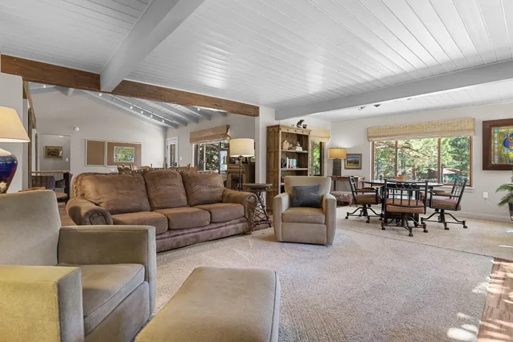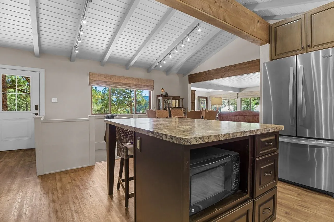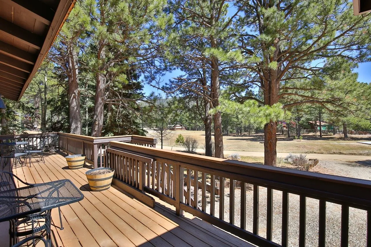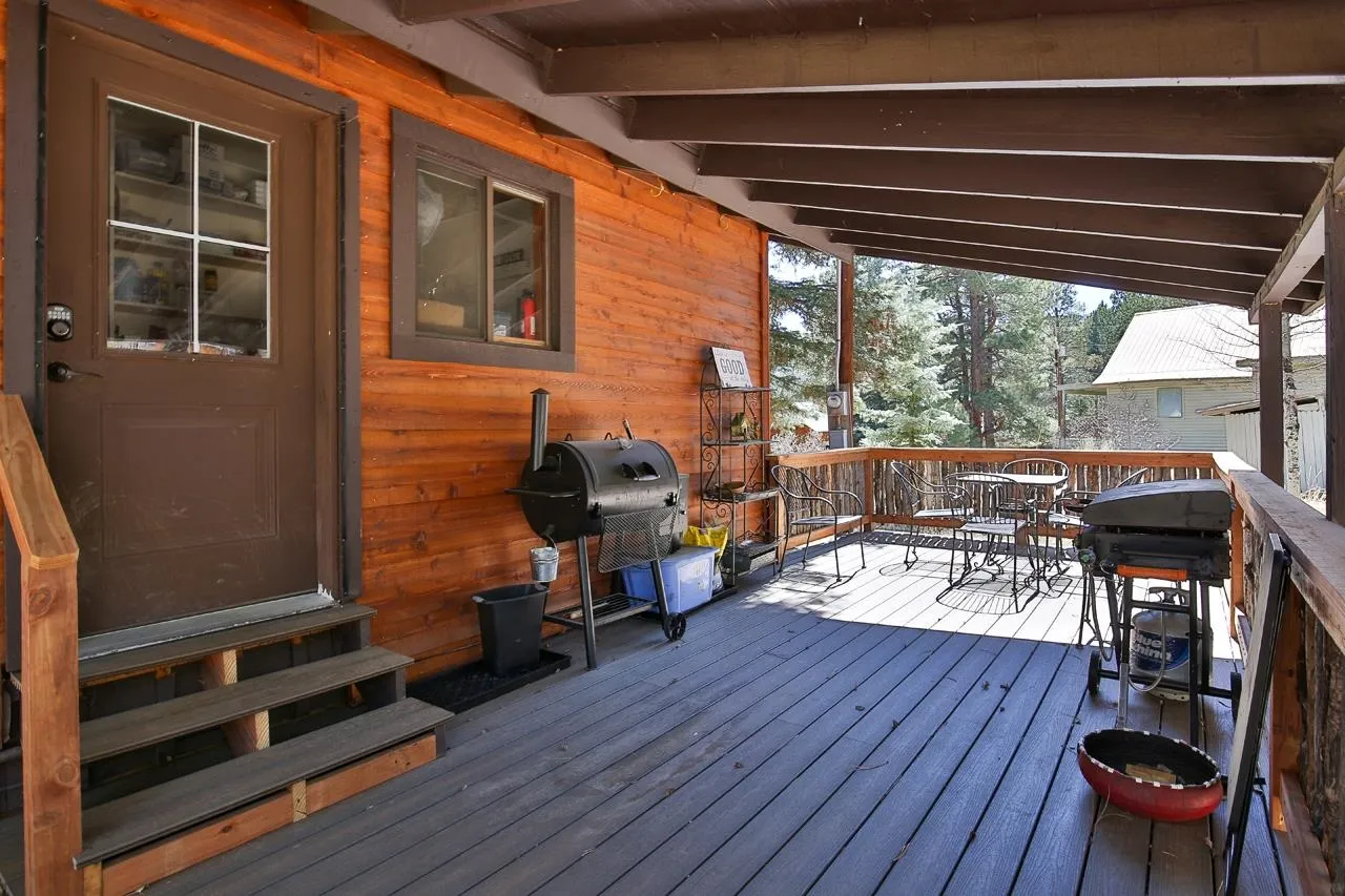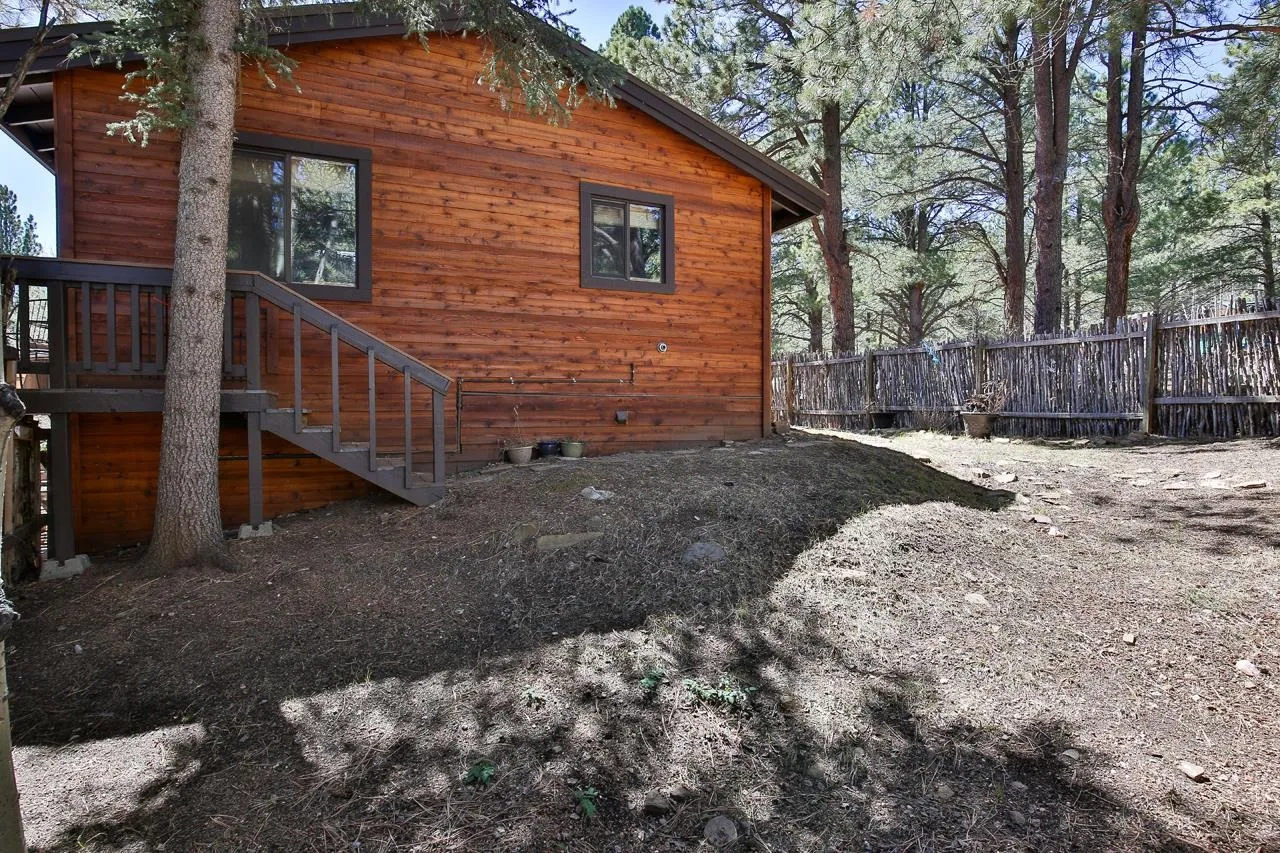 Mountain living meets modern comfort in this beautifully remodeled El Valle Escondido retreat set among towering pines. Nestled among mature trees, this 1,950 sq. ft. home offers the perfect blend of comfort, style, and year-round recreation. Featuring 2 bedrooms, 2 bathrooms, and a spacious bonus living area, the home is thoughtfully designed with the main living spaces upstairs to capture abundant natural light and scenic views overlooking the valley and clubhouse. Vaulted tongue-and-groove ceilings with exposed beams, expansive windows, and an open-concept layout create a bright and inviting atmosphere. The updated kitchen features quality cabinetry, stainless appliances, a large center island, and pantry ideal for entertaining and everyday living. A 2015 remodel brought updated kitchens, baths, flooring, and finishes throughout, while the exterior was enhanced with rich stained cedar siding for a true alpine feel. Multiple living areas including a generous lower-level bonus space provide flexibility for guests, recreation, or work-from-home use. Enjoy outdoor living on two trex decks expand living areas to offer privacy and a peaceful mountain setting. The rare double lot (0.56 acres) adds additional space and usability. Fully fenced latilla area perfect for pets. The attached 1-car double-deep garage offers ample room for storage, a vehicle, and/or workshop. The homeowners association provides community water, trash service, road maintenance, and access to outstanding amenities including a clubhouse, 9-hole golf course, stocked fishing ponds, and a seasonal swimming pool. Conveniently located between Taos and Angel Fire, this turnkey property is an ideal full-time residence or mountain getaway.