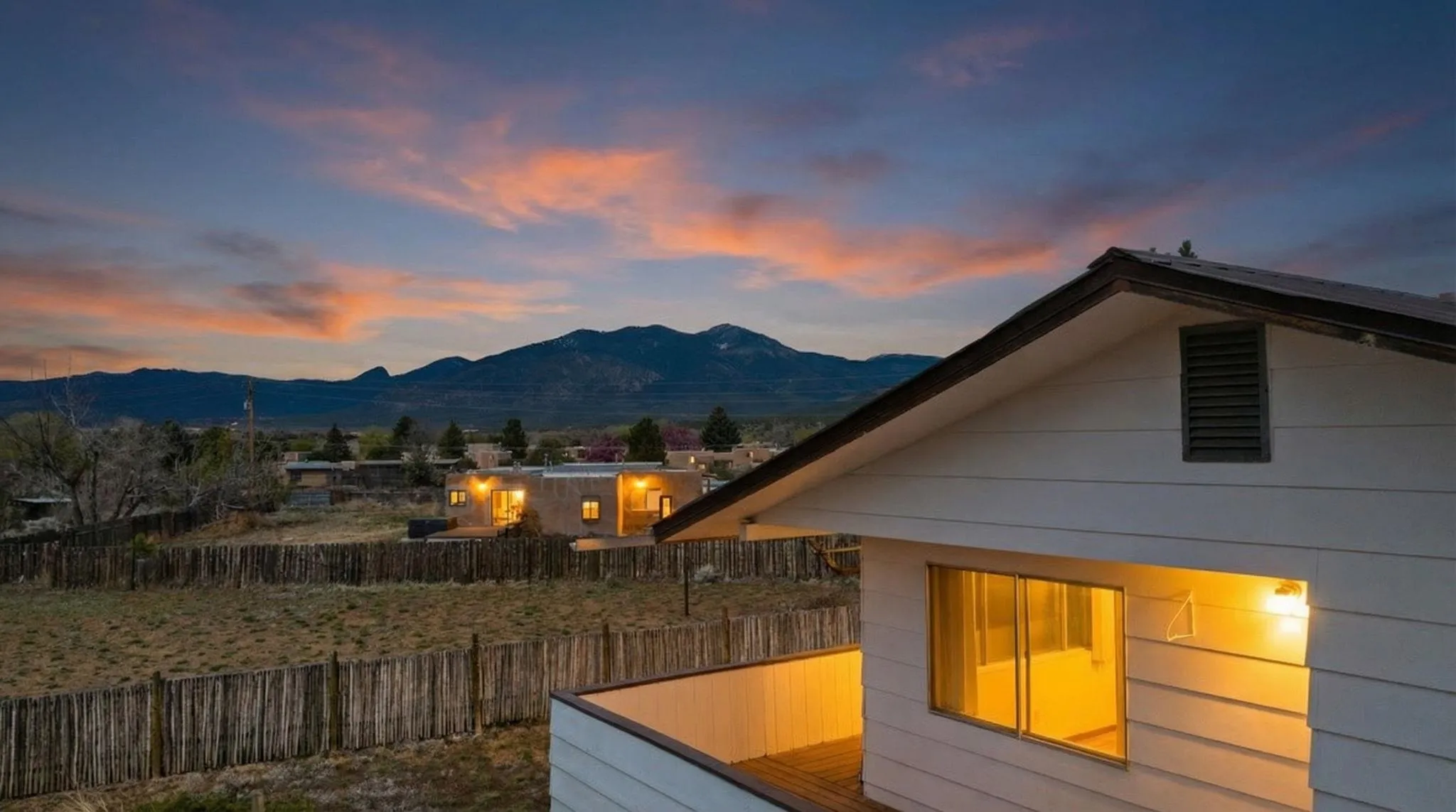 Classic Two-Story Taos Starter in Town ~ Tucked into one of the nicest, quietest, and most traditional neighborhoods in town, this two-story, five-bedroom, two-bathroom property is a fantastic starter home with the space to evolve alongside you. The upper-level deck takes full advantage of the surrounding landscape and dramatic mountain sunsets and sunrises. Outside, the large fenced yard features an authentic outdoor horno ready for baking, a treehouse to renovate for the kids, and plenty of open space with the real potential to expand into a large in-town garden or perhaps another home. Inside, the generous footprint provides serious flexibility, giving you plenty of room to set up a home office, art studio, yoga meditation space, or rooms to host family & guests, with a practical attached two-car garage. You get a highly convenient everyday balance here: the calm feel of a well-established street paired with quick access to local schools, nearby shopping, and an easy outlet to nature via the backroads for hiking, biking, skiing, fishing, hunting, and so on. Whether you want a spacious place to plant your roots right now or a property you can steadily transform over time, this home is a solid foundation.