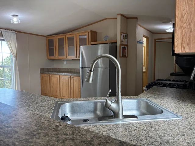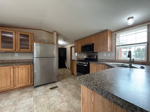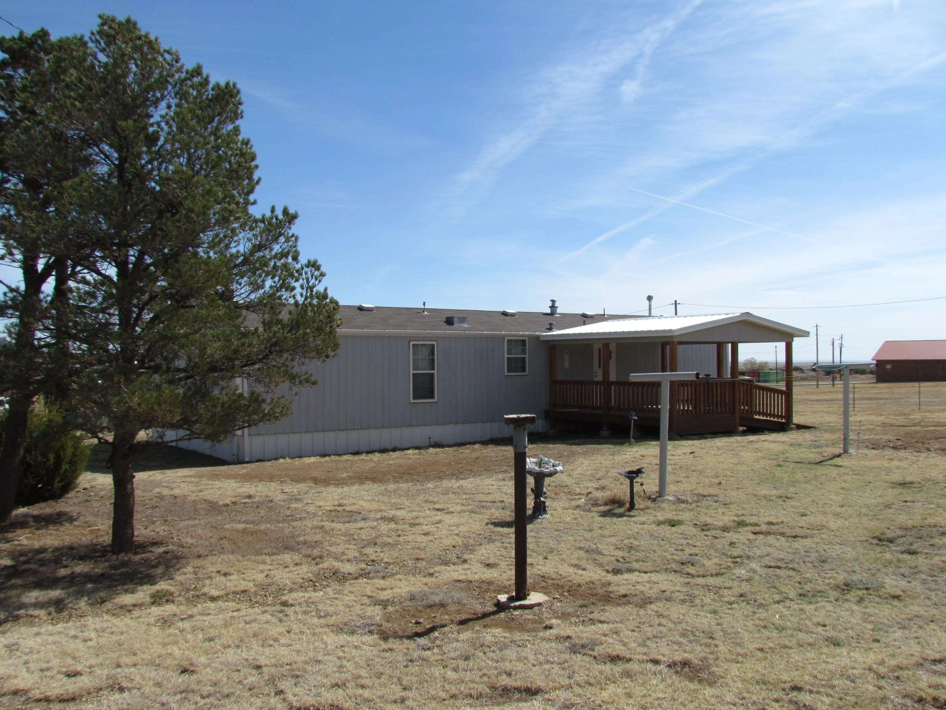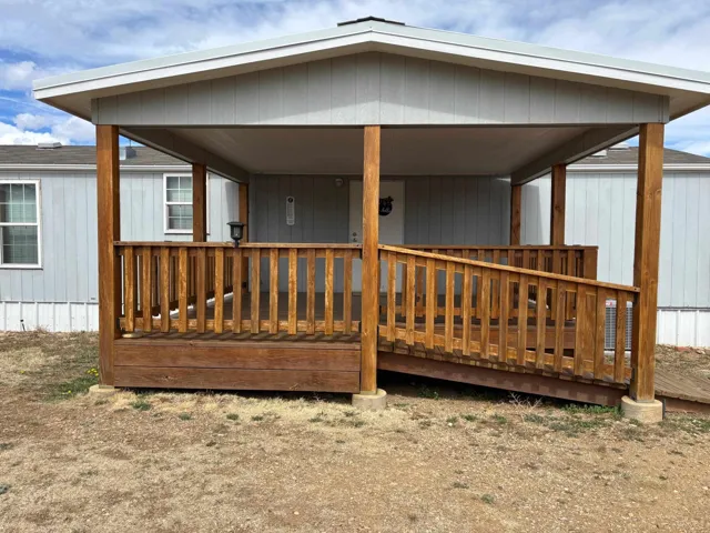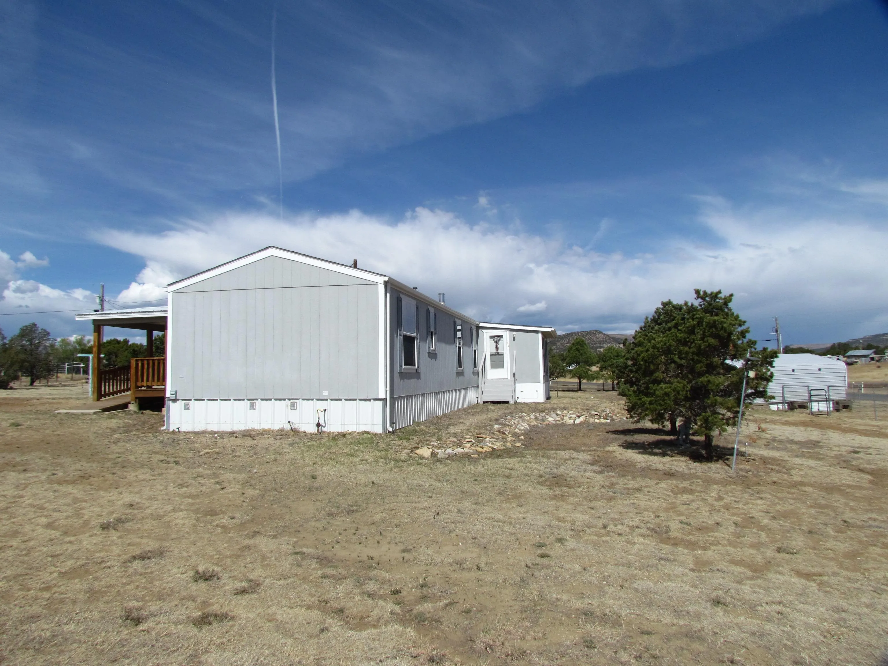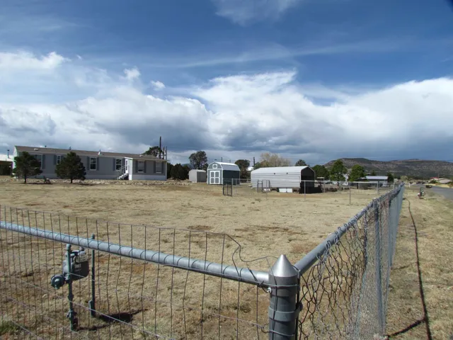 Nice 2-bedroom, 2 bathroom 1,024 +/- sq ft home (986 +/- sq ft heated and cooled with A/C) on 1.00 acre of land. Covered (15ft X 12ft) deck faces south with handicapped accessible ramp. Home has stackable laundry, newer natural gas 4 burner and griddle range, convection bake oven, microwave, stainless steel refrigerator, led circular lights with fan in bedrooms and family room, motion lights in closets, newer flooring, small window a/c unit in sunroom. Outside is a 18ft X 20 ft carport, New 10ft X 16ft wood storage shed with extra inbuilt storage and small garden shed. The property has been landscaped with 20 plus trees lovingly cared for with two outside spigots. The entire property has a chain link fence (dog friendly) with two wide gates for vehicle access and a small gate. The carport is not within the main fence so easy in and out. There is room for a new owner to drive around east side of home and park on south of property near covered porch. Room to build a garage/ workshop at that location. The home is a 2010 Oak Creek, taxed as a manufactured home. There is a chimney flue where a stand alone wood burning stove could be installed. Utilities include city water, electricity, natural gas, telephone. Sewer is a permitted septic system. Restrictions and Covenants for Lambert Hills available. No Homeowners Association has been formed. Lot is a corner lot with blacktop on Lambert Hills Blvd and Pinon Avenue.