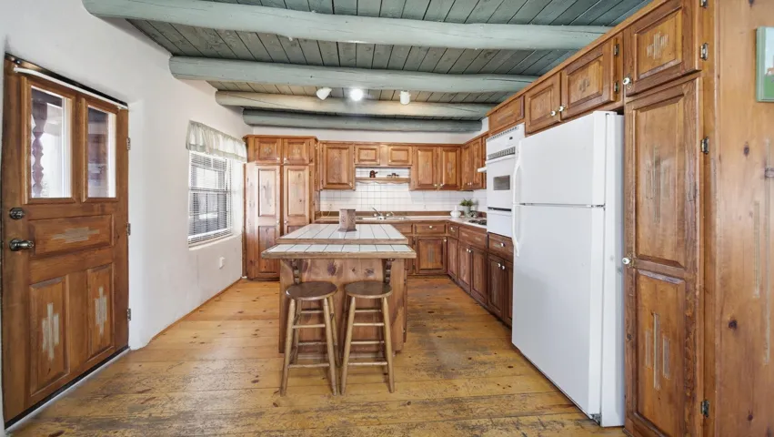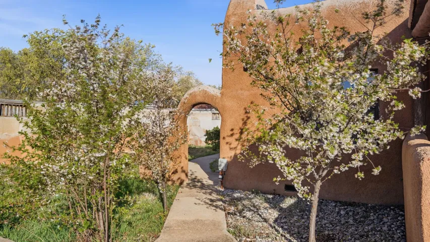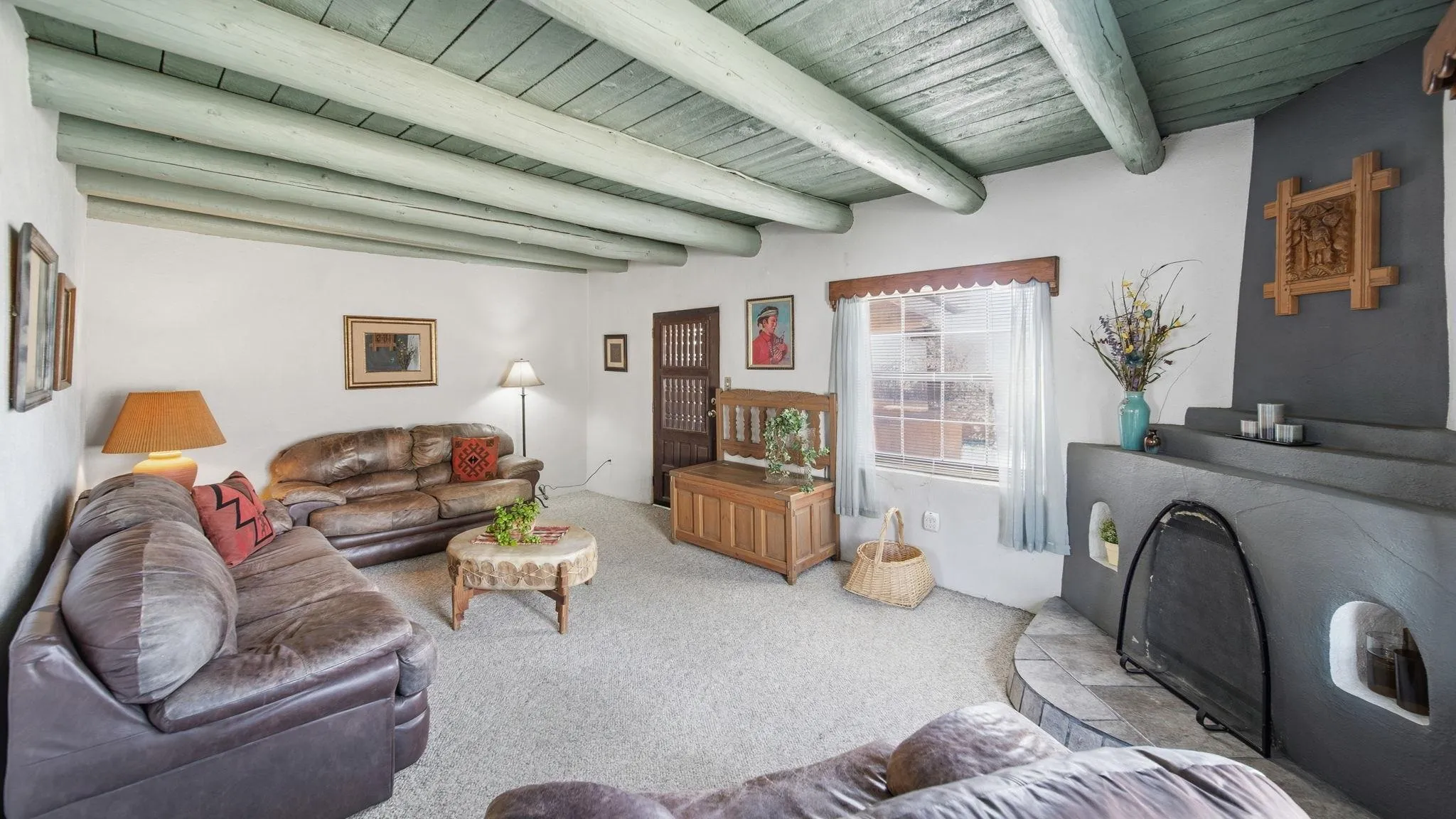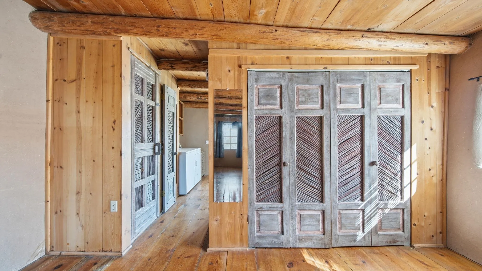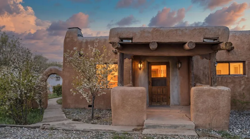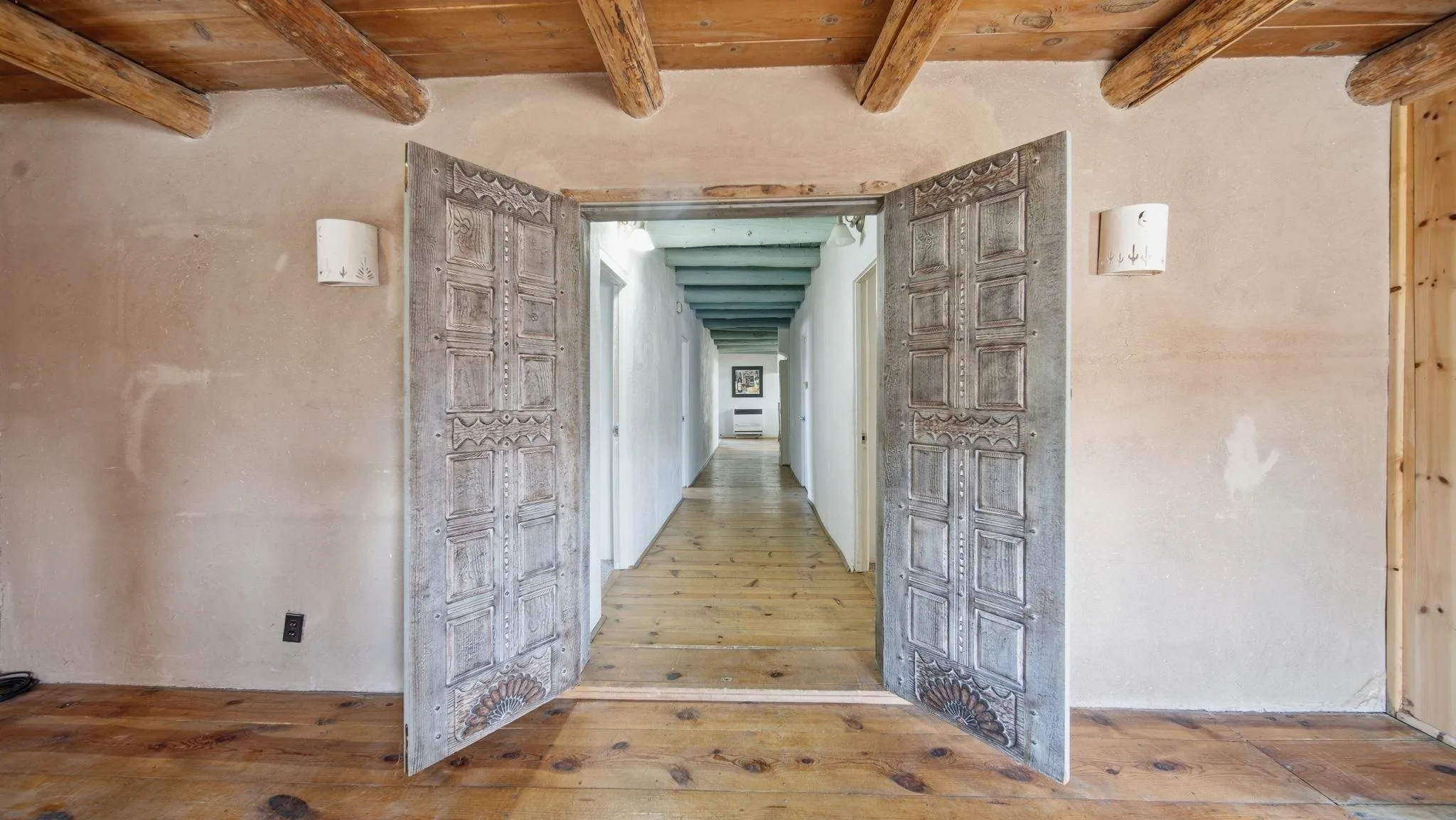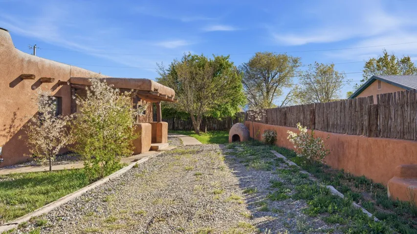 Hand-Carved Adobe Fortress in the Heart of Taos ~ In the very heart of Taos, New Mexico, you will find a residence with a home that is a true piece of art. Inside, almost everything has been meticulously hand-carved by the artist-owner. Constructed with solid, thick adobe walls that act as a private, peaceful fortress, this home naturally stays cool during the warm summer months and wonderfully retains its heat through the winter. Upon entering the kitchen, you are greeted by awe-inspiring, Spanish-colonial inspired carved cabinets stretching from floor to ceiling around the center island, and a special theme that continues through the home, along with creative storage throughout. Traditional, tough hardwood floors flow seamlessly into the dining room, which features the first of two cozy kiva fireplaces under ceilings adorned with tasteful Taos turquoise vigas and planks. The inviting living room boasts the home’s second fireplace, creating the ultimate gathering space for family year-round and especially during the holidays. Each of the 4 spacious bedrooms offers a comfortable retreat, but the enormous primary suite is a true standout, with a convenient in-room laundry with willow-etched doors, big closets, and direct egress to the yard. Throughout the home, you will discover custom hand-carved doors and special touches like clever hidden bathroom vanity doors and gorgeous handmade built-in cabinets beside a classic clawfoot tub. Outside, the yard invites you to relax among budding fruit trees and charming walking paths, all centered around a traditional horno for authentic outdoor baking. Conveniently located off Gusdorf Road near the historic Taos Plaza, the unbeatable proximity makes this an ideal residence if you work in town, and it is especially perfect for teachers at one of the excellent nearby schools. Whether you are looking for a highly accessible part-time Land of Enchantment getaway or the perfect starter home ready for you to add your own finishing exterior touches, this adobe gem places you minutes from world-class skiing at Taos Ski Valley, vibrant local art galleries, and breathtaking Rio Grande river adventures. This home is priced well, and ready for you to make it your very own!