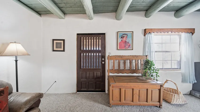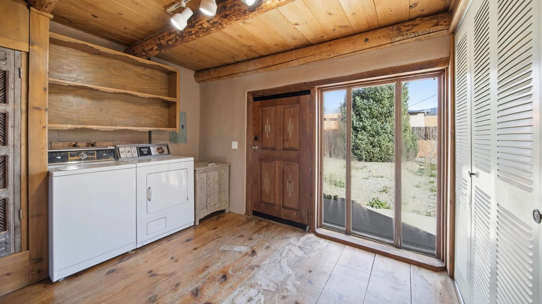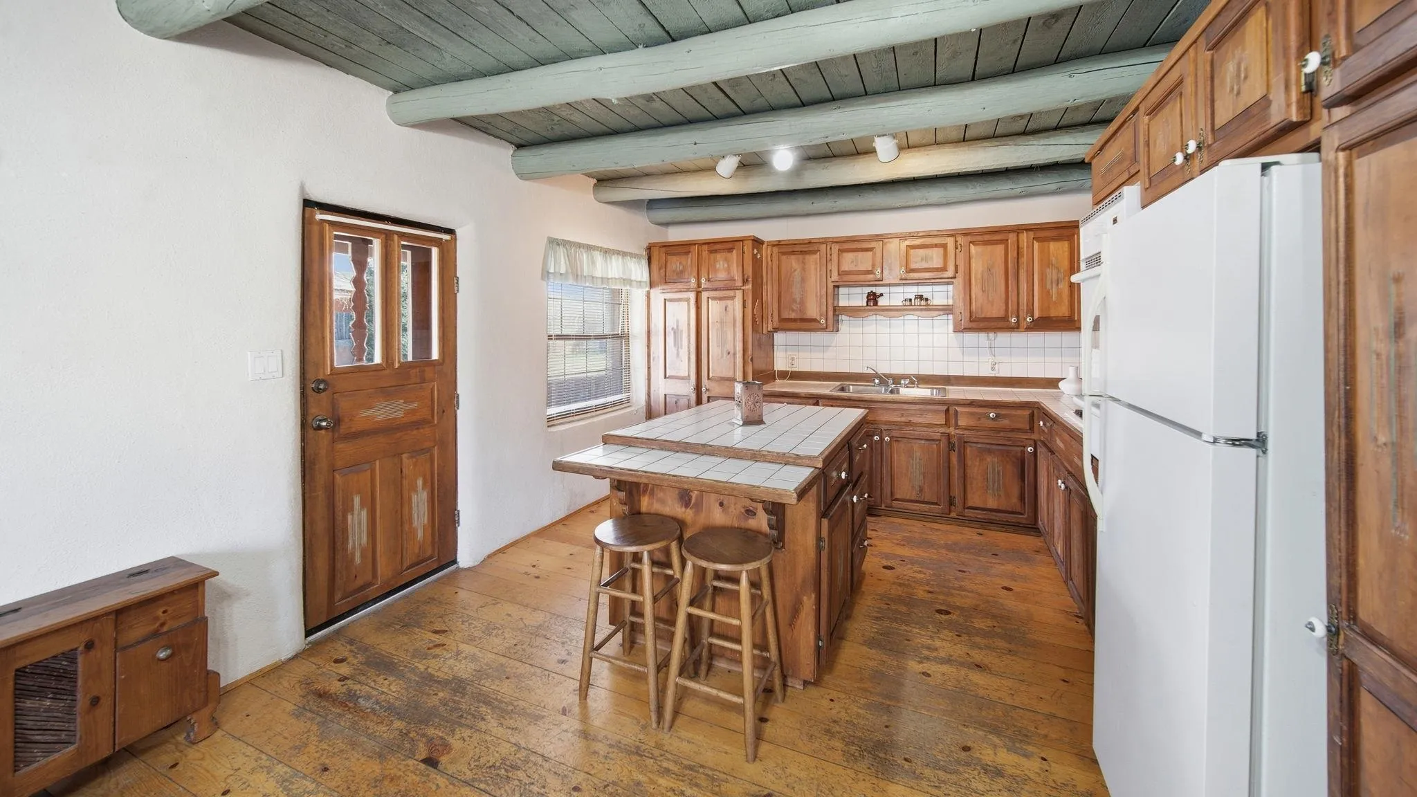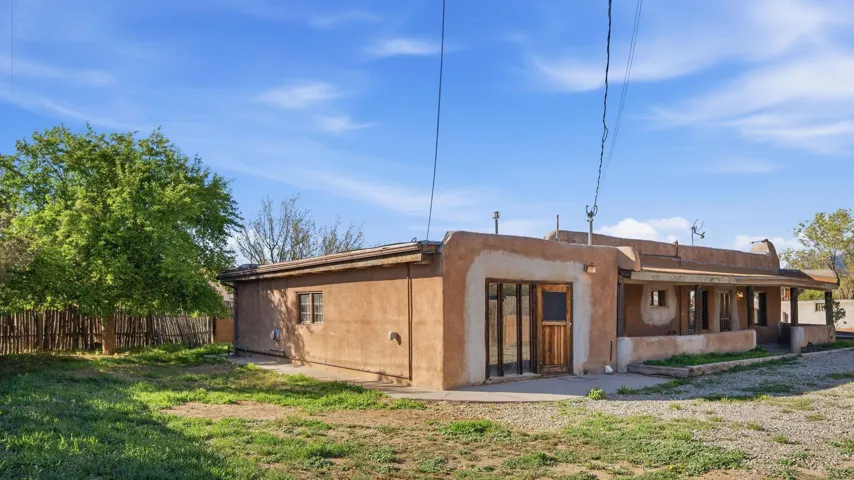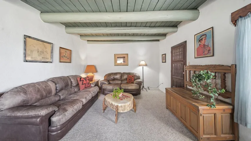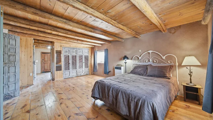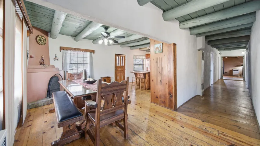 Hand-Carved Adobe Fortress in the Heart of Taos ~ In the very heart of Taos, New Mexico, you will find a residence with a home that is a true piece of art. Inside, almost everything has been meticulously hand-carved by the artist-owner. Constructed with solid, thick adobe walls that act as a private, peaceful fortress, this home naturally stays cool during the warm summer months and wonderfully retains its heat through the winter. Upon entering the kitchen, you are greeted by awe-inspiring, Spanish-colonial inspired carved cabinets stretching from floor to ceiling around the center island, and a special theme that continues through the home, along with creative storage throughout. Traditional, tough hardwood floors flow seamlessly into the dining room, which features the first of two cozy kiva fireplaces under ceilings adorned with tasteful Taos turquoise vigas and planks. The inviting living room boasts the home’s second fireplace, creating the ultimate gathering space for family year-round and especially during the holidays. Each of the 4 spacious bedrooms offers a comfortable retreat, but the enormous primary suite is a true standout, with a convenient in-room laundry with willow-etched doors, big closets, and direct egress to the yard. Throughout the home, you will discover custom hand-carved doors and special touches like clever hidden bathroom vanity doors and gorgeous handmade built-in cabinets beside a classic clawfoot tub. Outside, the yard invites you to relax among budding fruit trees and charming walking paths, all centered around a traditional horno for authentic outdoor baking. Conveniently located off Gusdorf Road near the historic Taos Plaza, the unbeatable proximity makes this an ideal residence if you work in town, and it is especially perfect for teachers at one of the excellent nearby schools. Whether you are looking for a highly accessible part-time Land of Enchantment getaway or the perfect starter home ready for you to add your own finishing exterior touches, this adobe gem places you minutes from world-class skiing at Taos Ski Valley, vibrant local art galleries, and breathtaking Rio Grande river adventures. This home is priced well, and ready for you to make it your very own!