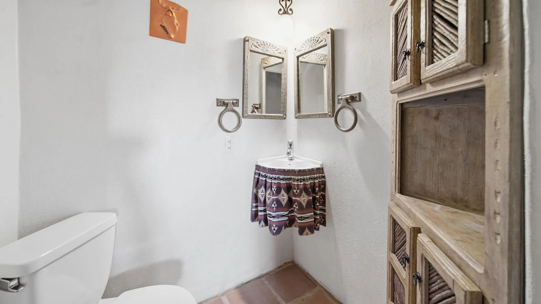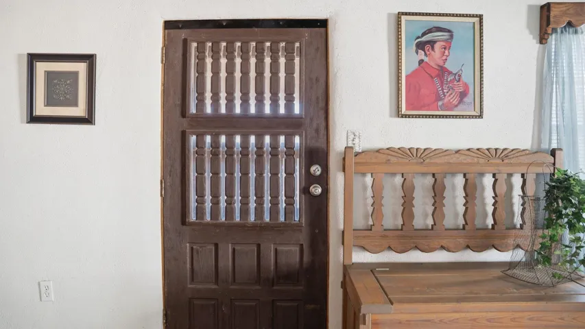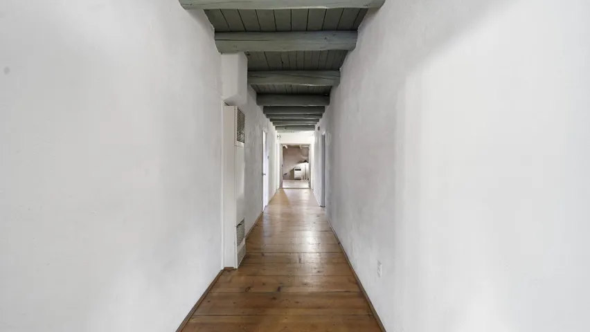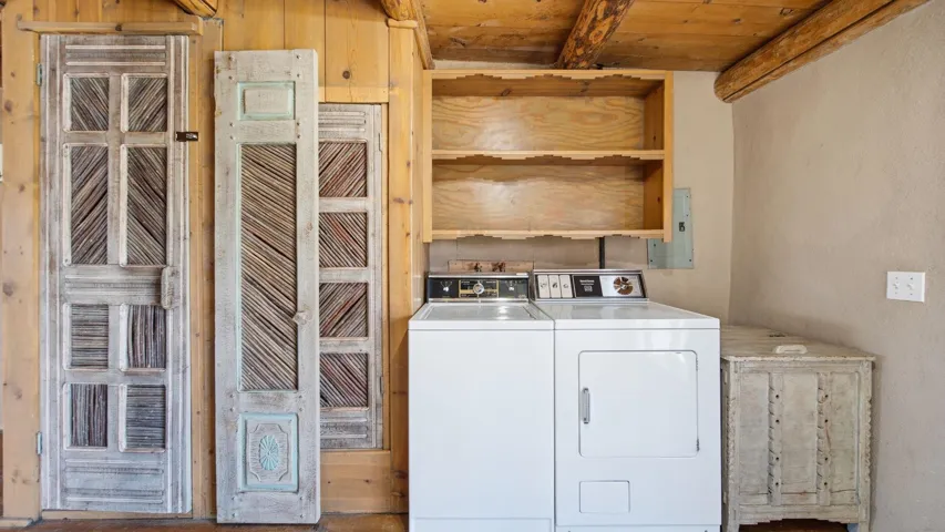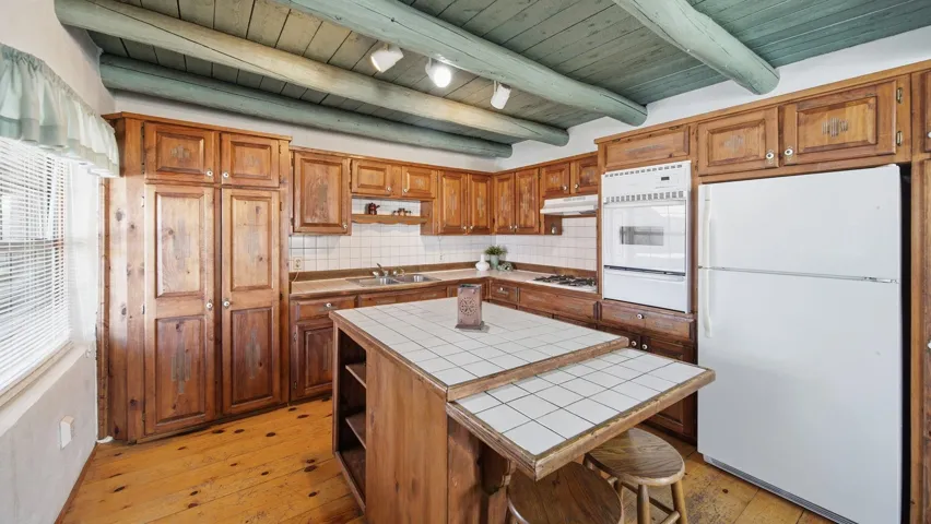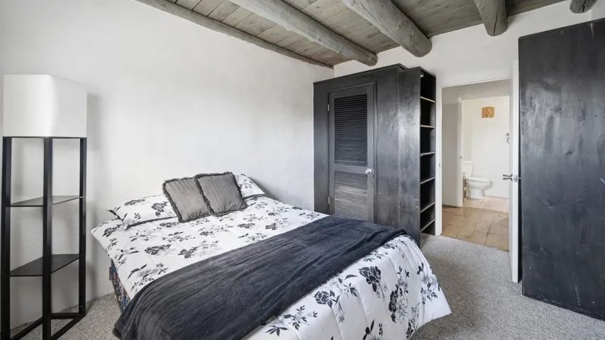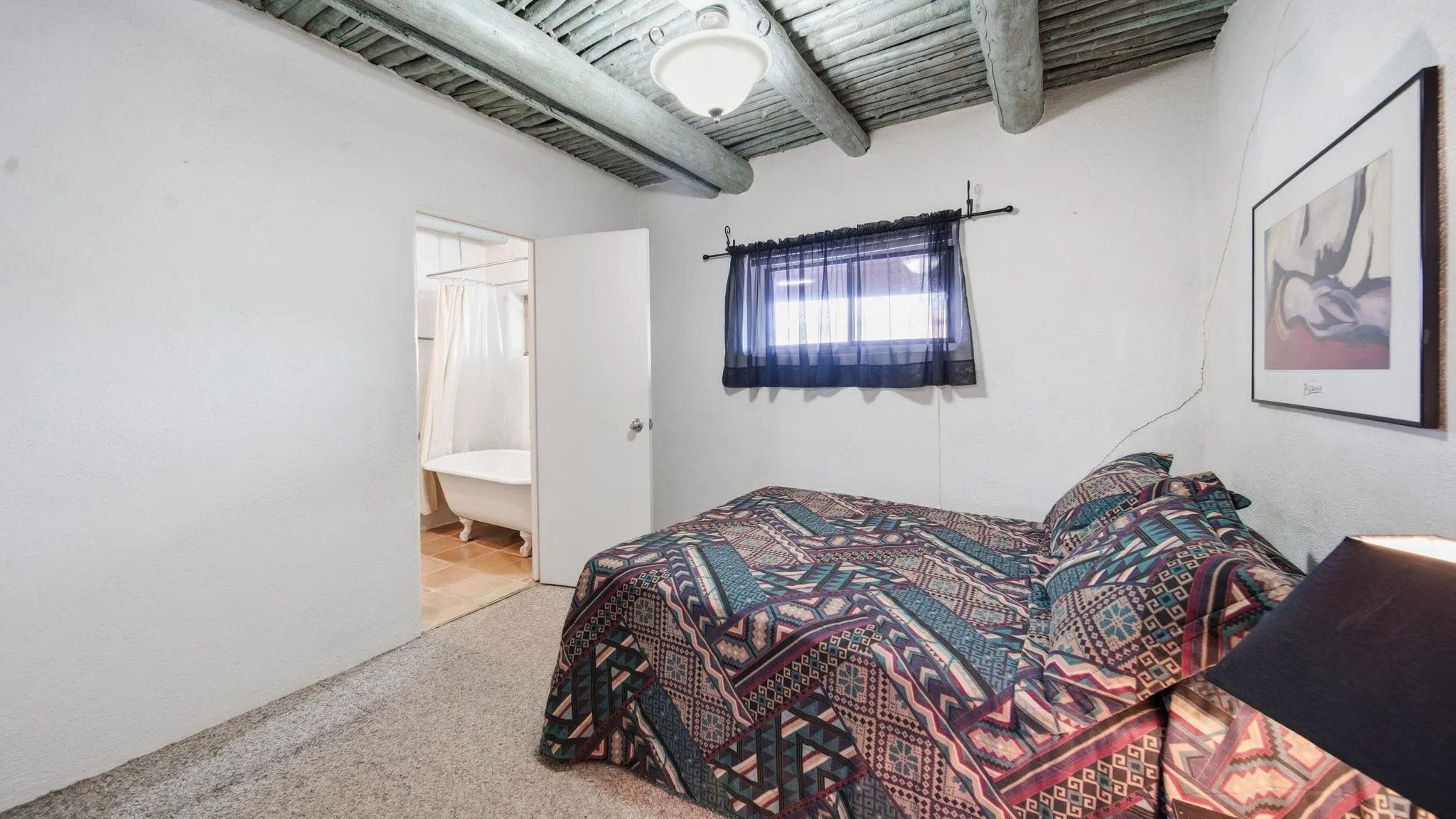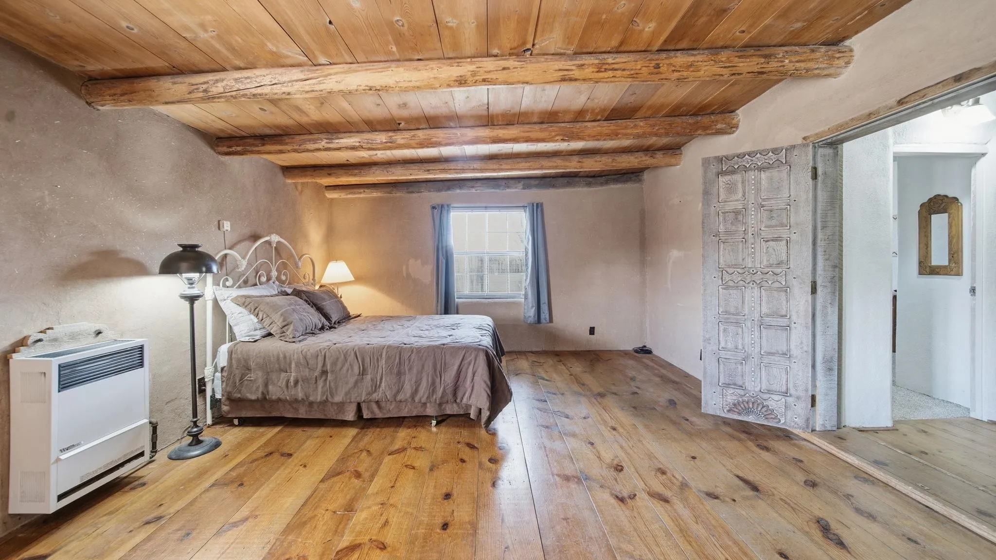 Hand-Carved Adobe Fortress in the Heart of Taos ~ In the very heart of Taos, New Mexico, you will find a residence with a home that is a true piece of art. Inside, almost everything has been meticulously hand-carved by the artist-owner. Constructed with solid, thick adobe walls that act as a private, peaceful fortress, this home naturally stays cool during the warm summer months and wonderfully retains its heat through the winter. Upon entering the kitchen, you are greeted by awe-inspiring, Spanish-colonial inspired carved cabinets stretching from floor to ceiling around the center island, and a special theme that continues through the home, along with creative storage throughout. Traditional, tough hardwood floors flow seamlessly into the dining room, which features the first of two cozy kiva fireplaces under ceilings adorned with tasteful Taos turquoise vigas and planks. The inviting living room boasts the home’s second fireplace, creating the ultimate gathering space for family year-round and especially during the holidays. Each of the 4 spacious bedrooms offers a comfortable retreat, but the enormous primary suite is a true standout, with a convenient in-room laundry with willow-etched doors, big closets, and direct egress to the yard. Throughout the home, you will discover custom hand-carved doors and special touches like clever hidden bathroom vanity doors and gorgeous handmade built-in cabinets beside a classic clawfoot tub. Outside, the yard invites you to relax among budding fruit trees and charming walking paths, all centered around a traditional horno for authentic outdoor baking. Conveniently located off Gusdorf Road near the historic Taos Plaza, the unbeatable proximity makes this an ideal residence if you work in town, and it is especially perfect for teachers at one of the excellent nearby schools. Whether you are looking for a highly accessible part-time Land of Enchantment getaway or the perfect starter home ready for you to add your own finishing exterior touches, this adobe gem places you minutes from world-class skiing at Taos Ski Valley, vibrant local art galleries, and breathtaking Rio Grande river adventures. This home is priced well, and ready for you to make it your very own!