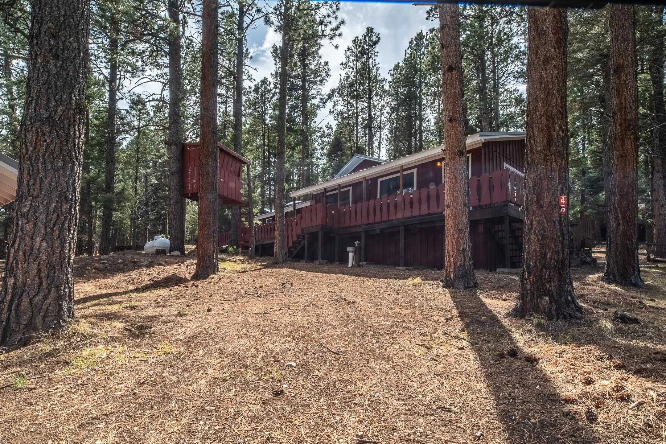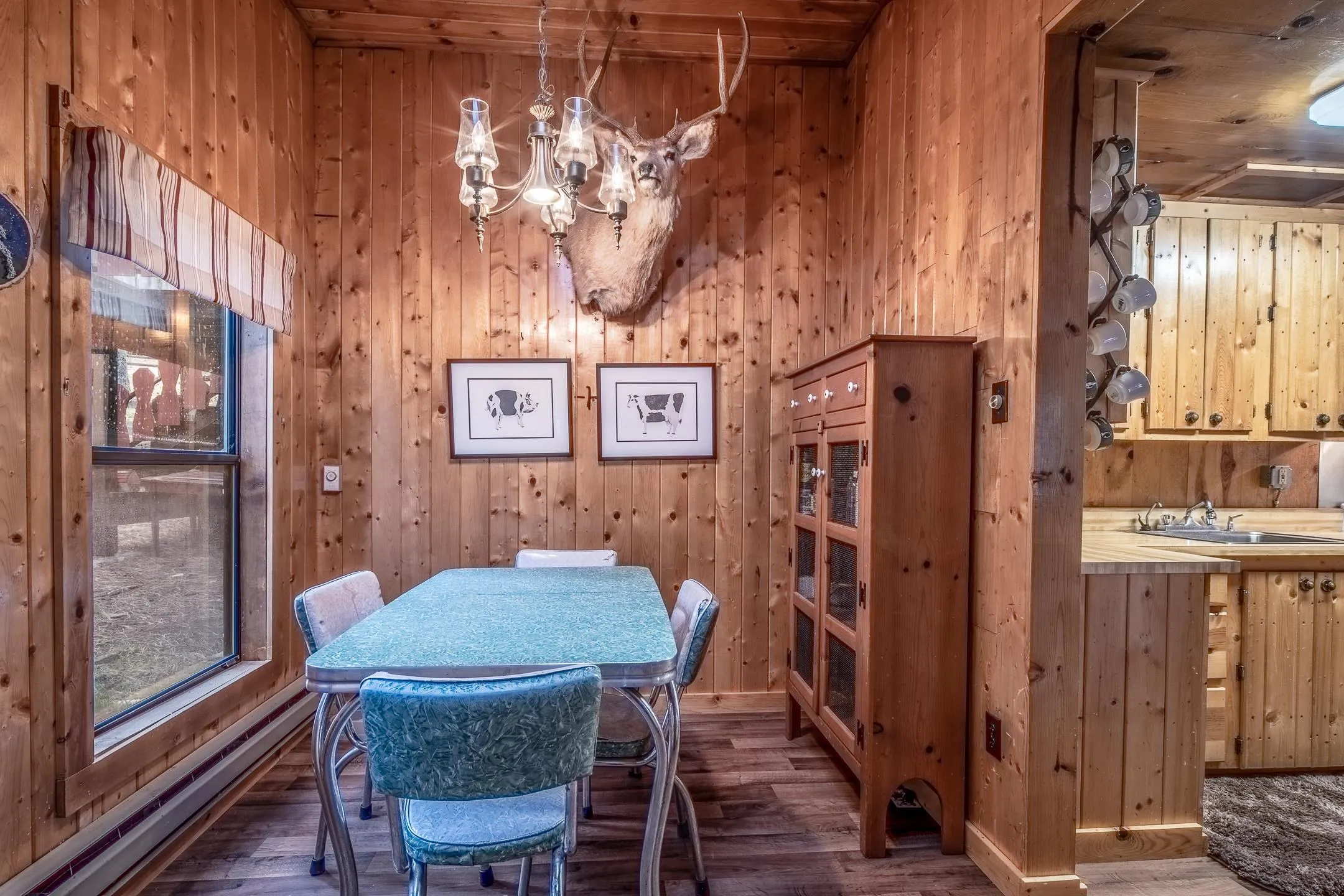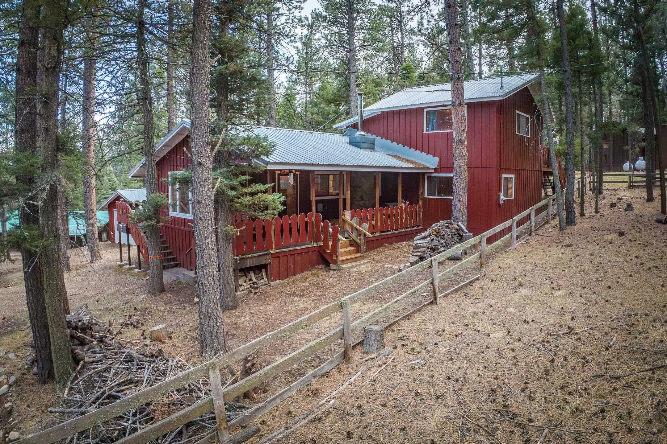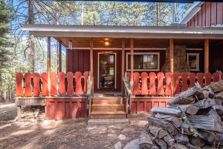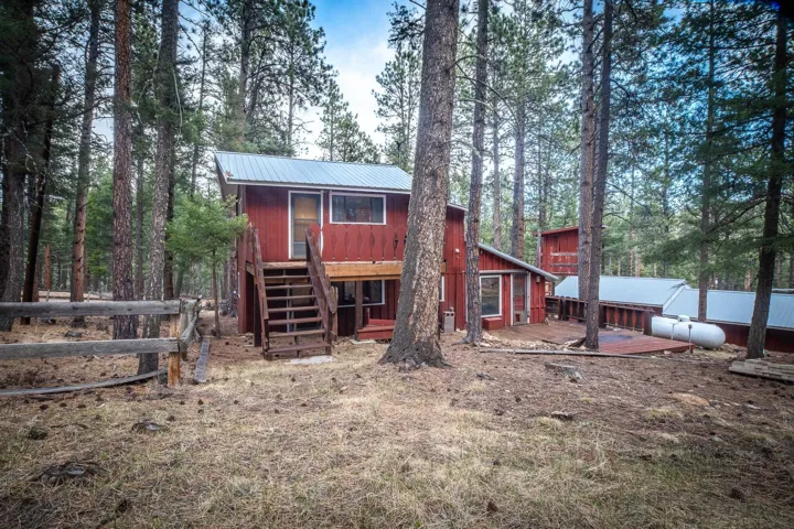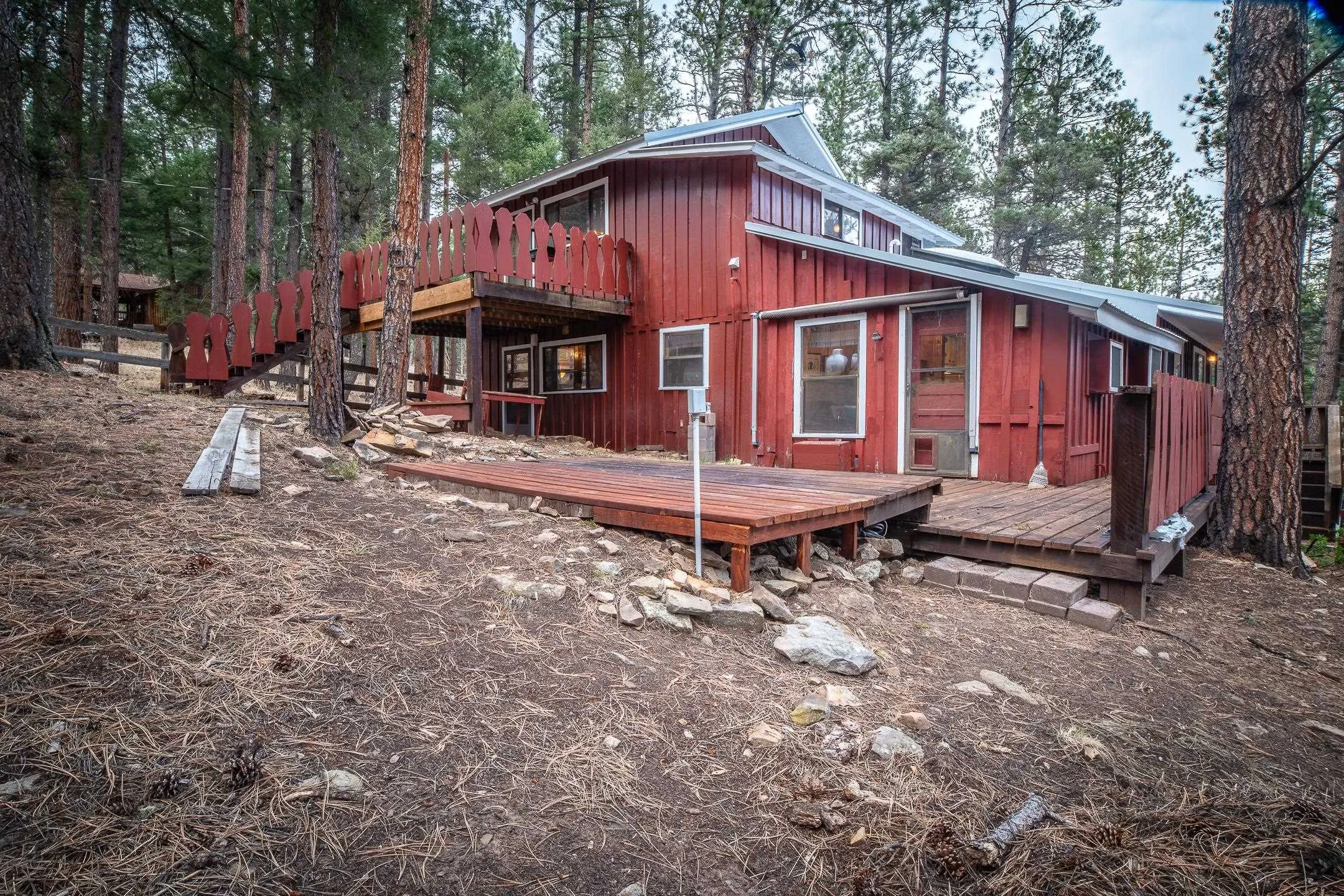 Secluded mountain retreat in the hidden community of Idlewild, just minutes from Eagle Nest Lake, Red River, and Angel Fire. This charming two-bedroom, two-bath cabin also features a versatile bunk room, offering ample space for family and guests. The spacious living room is designed for gathering, complete with a wood-burning stove installed in a beautiful rock fireplace that provides an efficient and cozy heat source. The kitchen offers functional space with warm wooden cabinetry and a quaint dining area. Wood floors and walls enhance the inviting cabin atmosphere. Multiple sleeping options are available in each room, making it ideal for hosting larger groups. Enjoy the outdoors from the covered deck or the additional uncovered patio space, perfect for taking in the surrounding mountain setting. Please note: four-wheel drive is recommended, and winter access is weather-dependent.