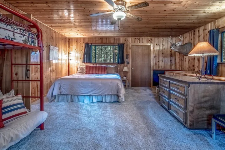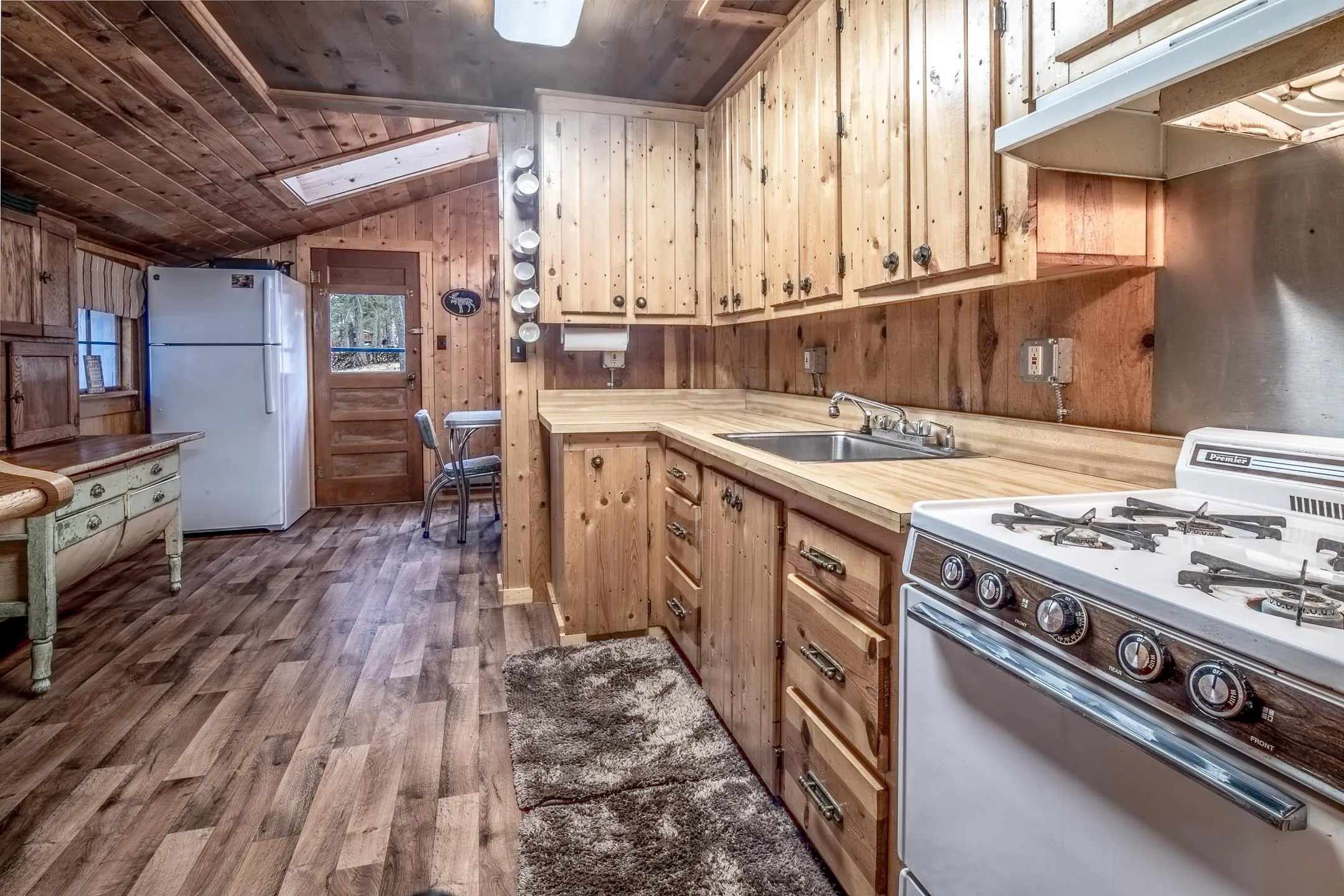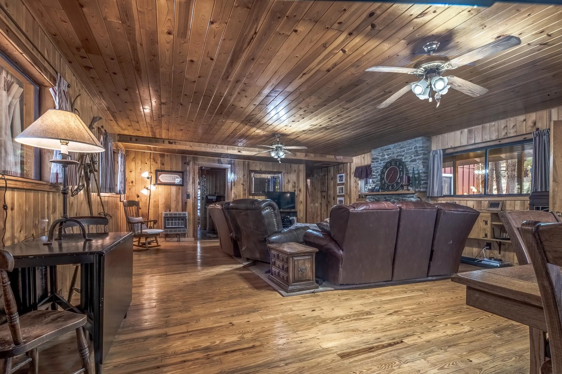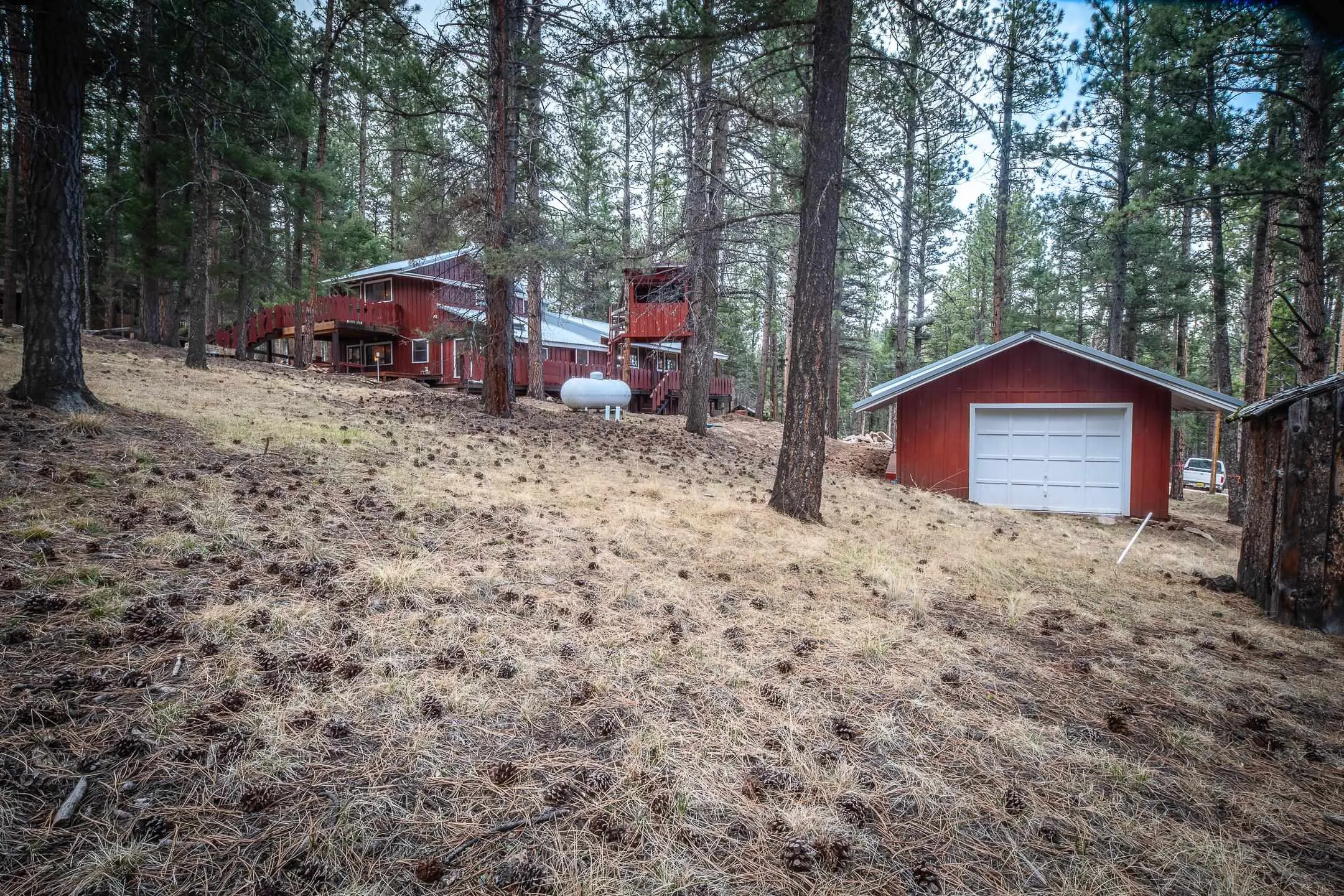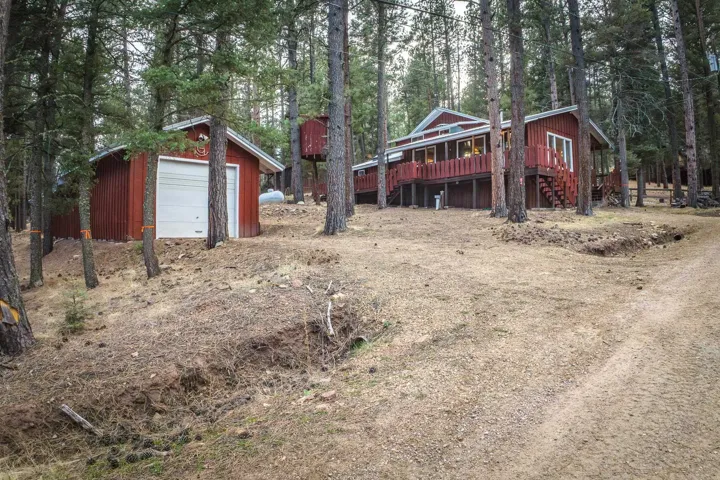 Secluded mountain retreat in the hidden community of Idlewild, just minutes from Eagle Nest Lake, Red River, and Angel Fire. This charming two-bedroom, two-bath cabin also features a versatile bunk room, offering ample space for family and guests. The spacious living room is designed for gathering, complete with a wood-burning stove installed in a beautiful rock fireplace that provides an efficient and cozy heat source. The kitchen offers functional space with warm wooden cabinetry and a quaint dining area. Wood floors and walls enhance the inviting cabin atmosphere. Multiple sleeping options are available in each room, making it ideal for hosting larger groups. Enjoy the outdoors from the covered deck or the additional uncovered patio space, perfect for taking in the surrounding mountain setting. Please note: four-wheel drive is recommended, and winter access is weather-dependent.