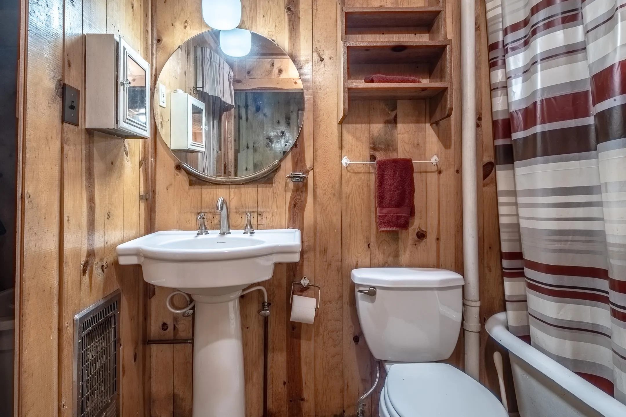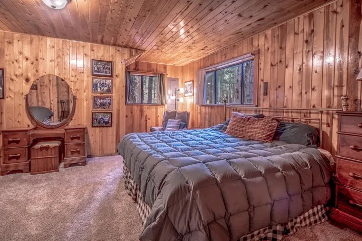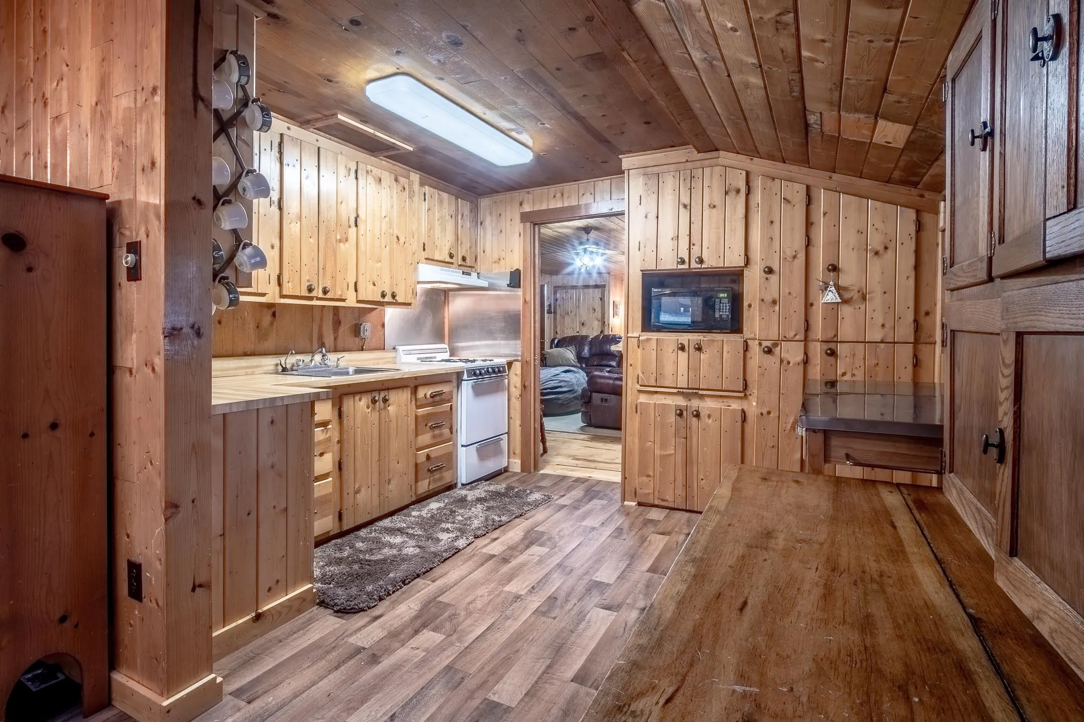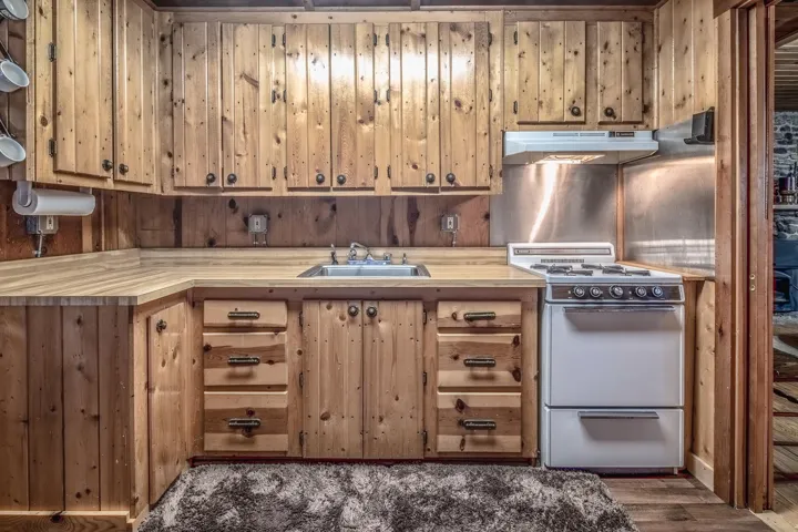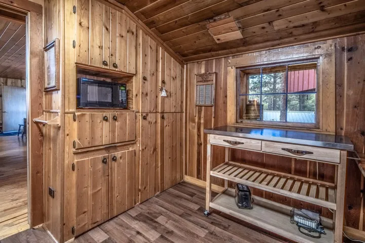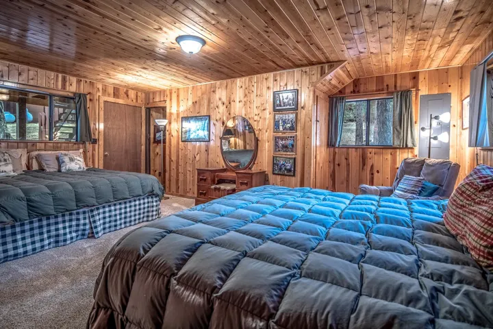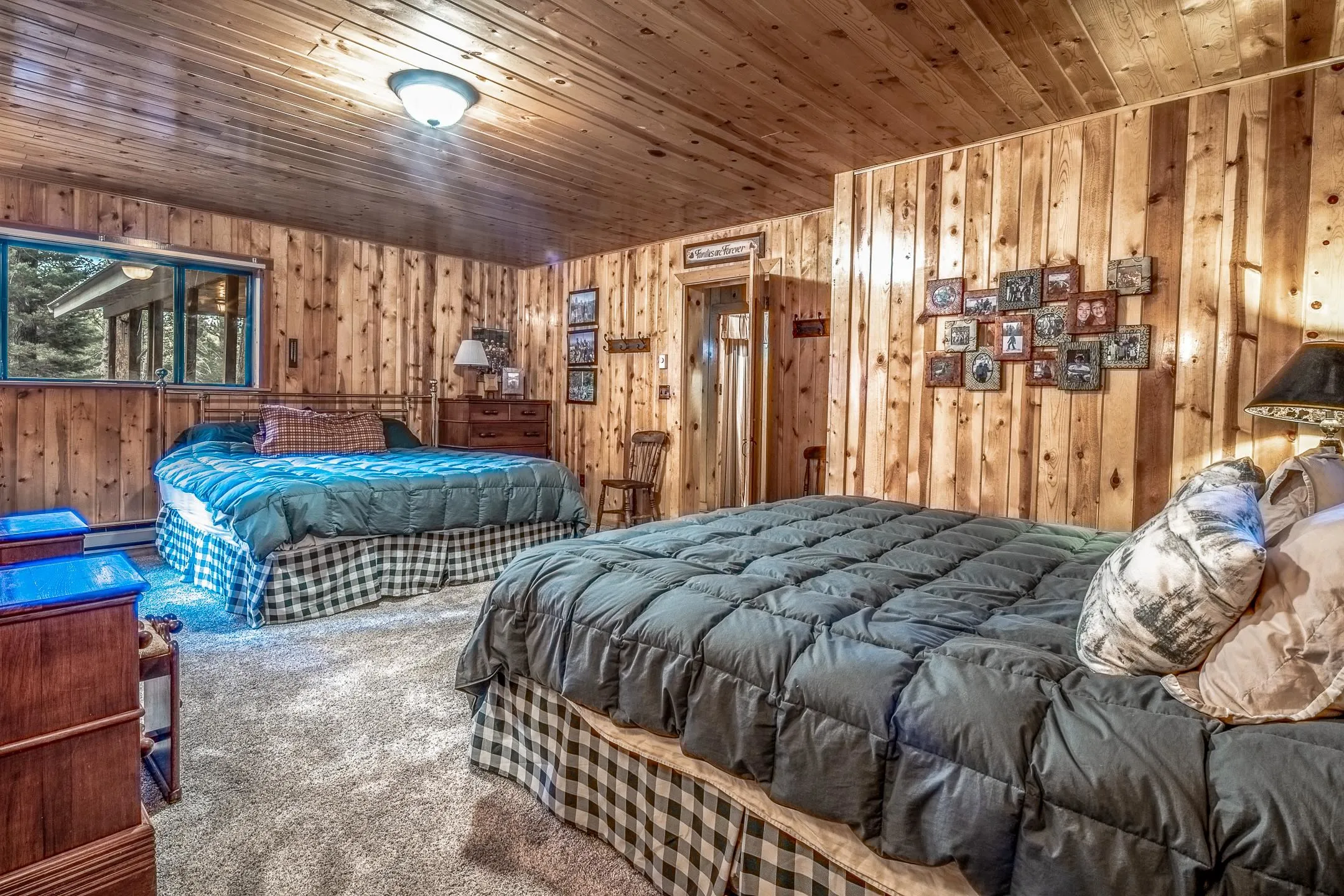 Secluded mountain retreat in the hidden community of Idlewild, just minutes from Eagle Nest Lake, Red River, and Angel Fire. This charming two-bedroom, two-bath cabin also features a versatile bunk room, offering ample space for family and guests. The spacious living room is designed for gathering, complete with a wood-burning stove installed in a beautiful rock fireplace that provides an efficient and cozy heat source. The kitchen offers functional space with warm wooden cabinetry and a quaint dining area. Wood floors and walls enhance the inviting cabin atmosphere. Multiple sleeping options are available in each room, making it ideal for hosting larger groups. Enjoy the outdoors from the covered deck or the additional uncovered patio space, perfect for taking in the surrounding mountain setting. Please note: four-wheel drive is recommended, and winter access is weather-dependent.