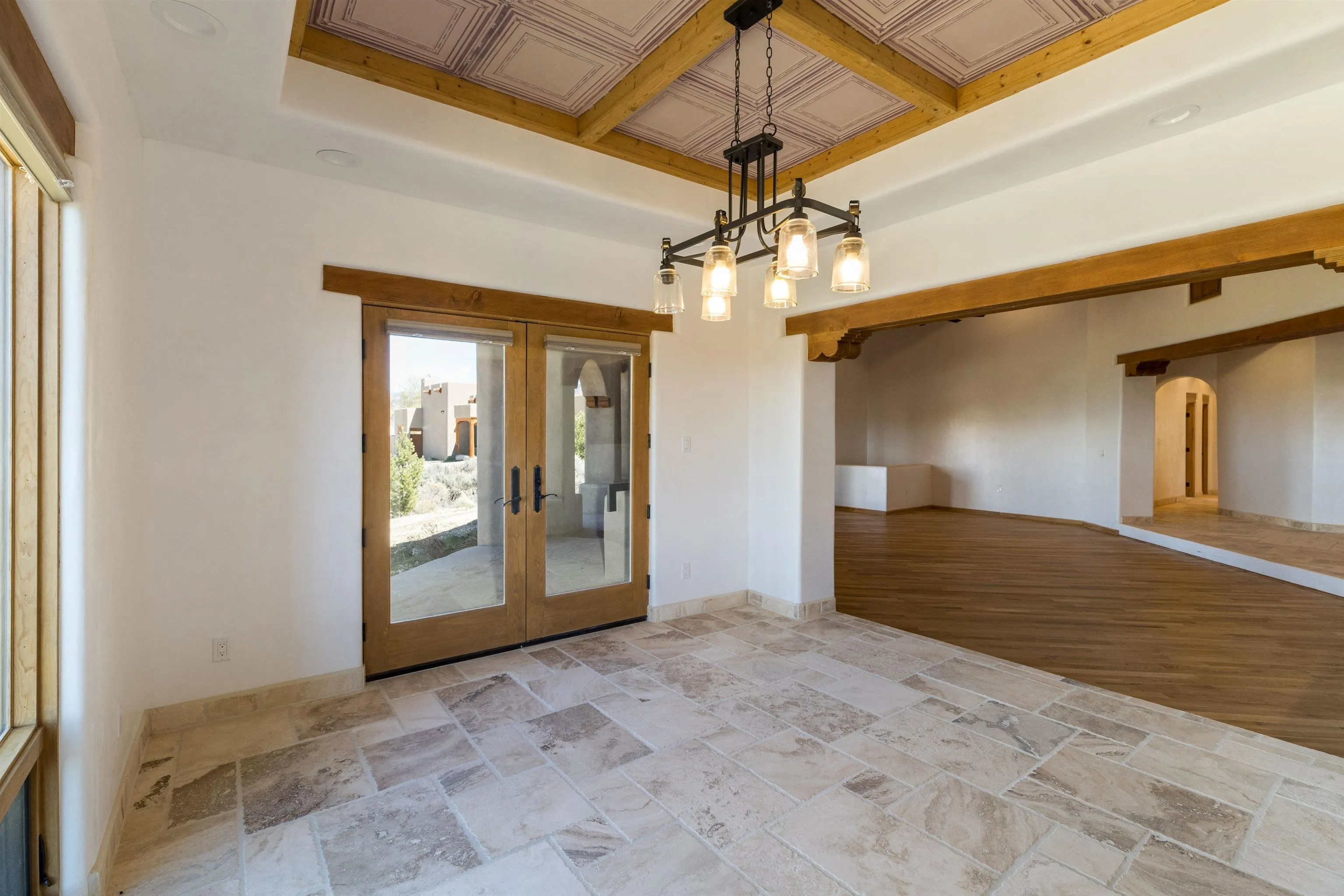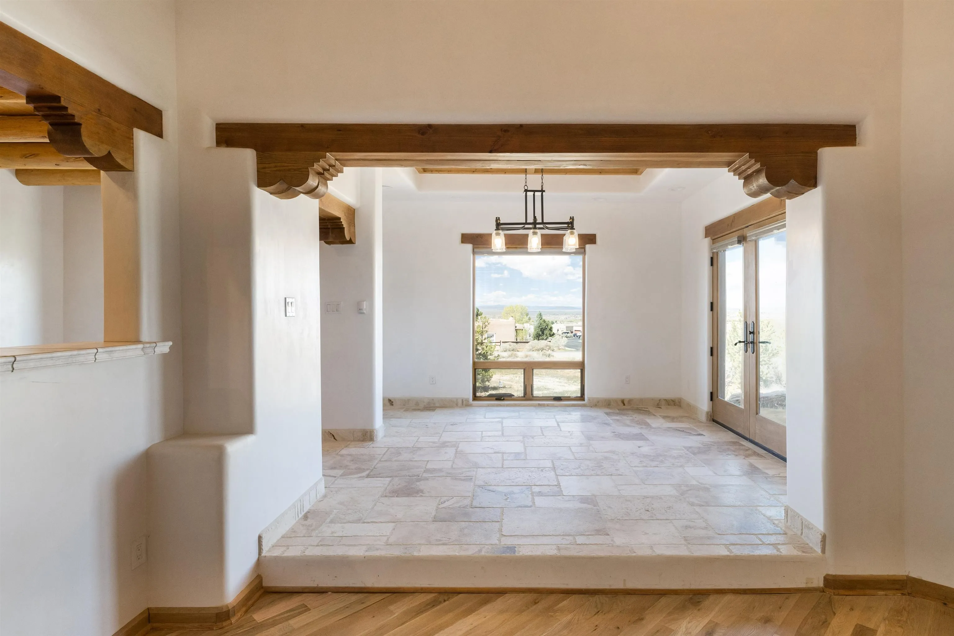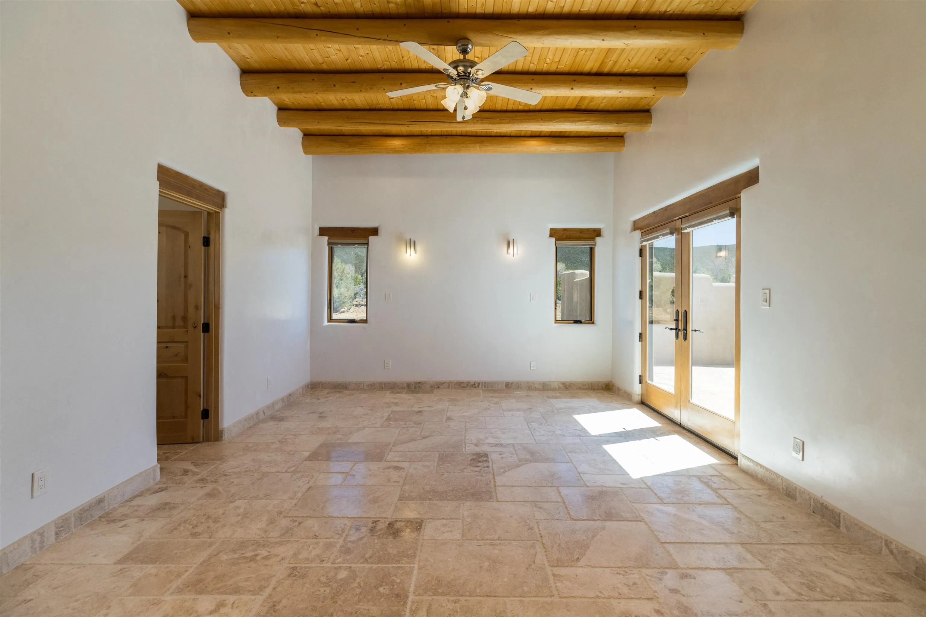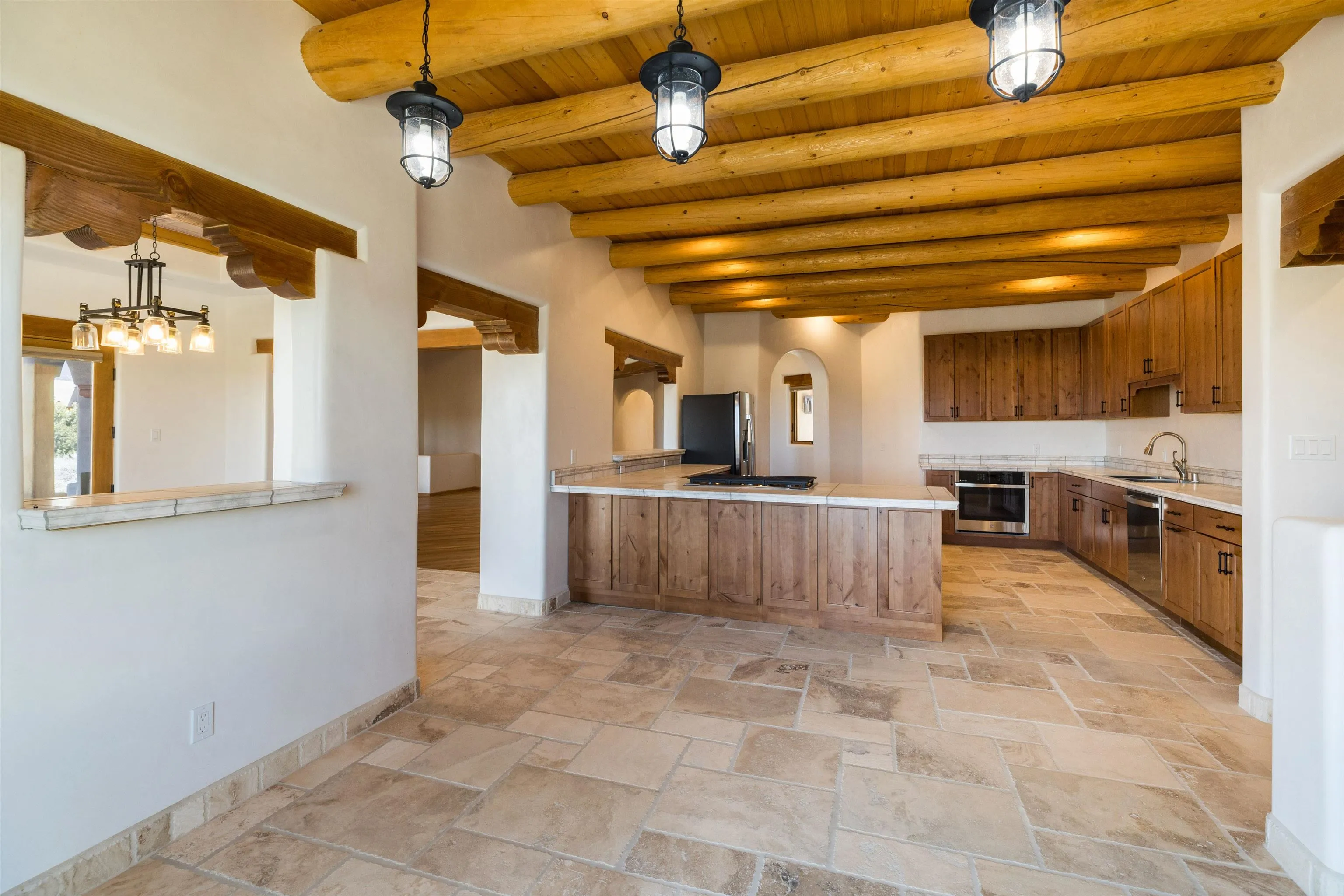 Welcome to your brand-new sanctuary blending authentic Southwestern design with refined modern touches at 1411 Maestas Road, a never-lived-in custom home set on a one-acre lot in the coveted Weimer neighborhood, offering immediate access to healthcare, shopping, and daily essentials while still feeling peacefully private. From the moment you step inside, you’ll feel the quality and care poured into every detail. Travertine natural stone flooring runs throughout the home, paired with rich oak hardwood floors in the great room and stunning viga and tongue-and-groove ceilings, hand-carved corbels, and custom wrought-iron railings that bring timeless Taos character to life. Radiant in-floor heating with three separate zones keeps the home cozy year-round with effortless efficiency. The kitchen invites connection and conversation with its open floor plan design, complete with quality finishes, stainless steel appliances, a gas cooktop, breakfast nook, full dining area, beautiful views, and a generous walk-in pantry for easy everyday living. With blinds already installed, this home is truly move-in ready. Thoughtfully designed with both beauty and flexibility in mind, the home offers two bedrooms, two full baths, and two half baths, along with a versatile flex space that can function as a home office or an additional bedroom depending on your needs. An oversized laundry room with front-load washer and dryer and a finished basement entertainment space with egress and a half bath provide additional comfort and adaptability…ideal for guests, movie nights, or a creative studio. Both bedrooms feature direct outdoor access. The primary suite is a peaceful retreat with a private courtyard, a travertine walk-in shower, an oversized soaking tub, and a spacious walk-in closet. Step outside and take in sweeping Taos Mountain views from the wraparound flagstone patio, offering multiple spaces to relax, dine, or entertain while enjoying the natural surroundings. An attached two-car garage adds everyday convenience. The Dos Arroyos Walking Trail is just down the driveway and offers scenic mountain views perfect for a short walk or hike. Ideally located just minutes from town amenities, approximately 5 miles from Taos Plaza and 30 miles from Taos Ski Valley. A home where timeless Taos design meets modern luxury, ready to welcome its very first owner.
