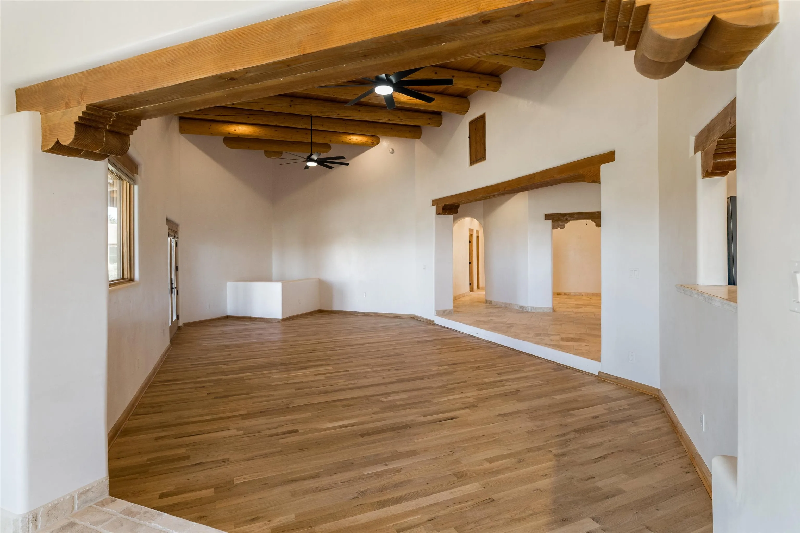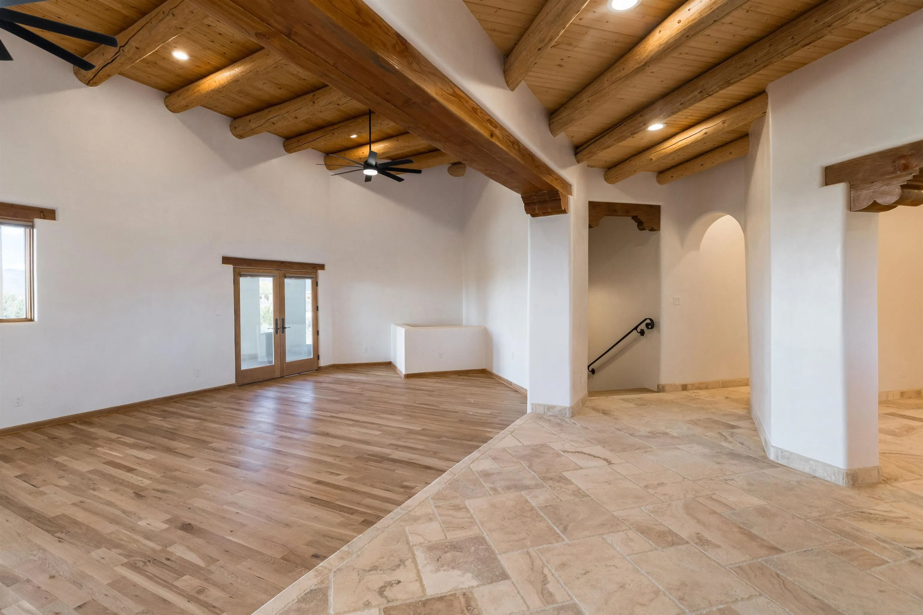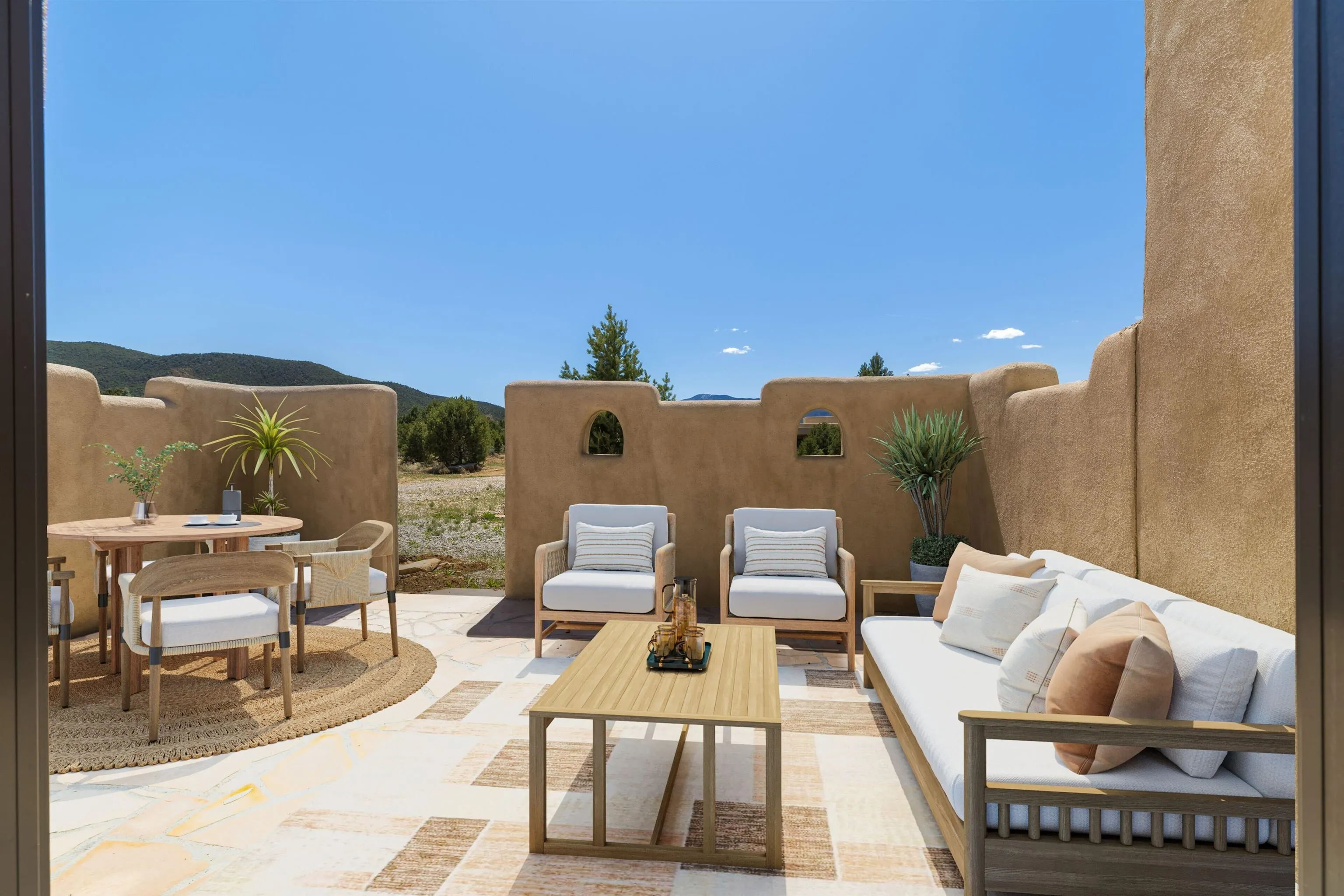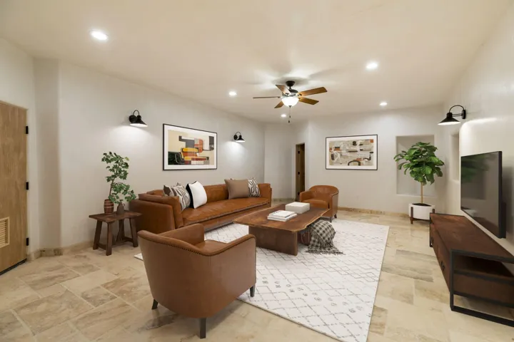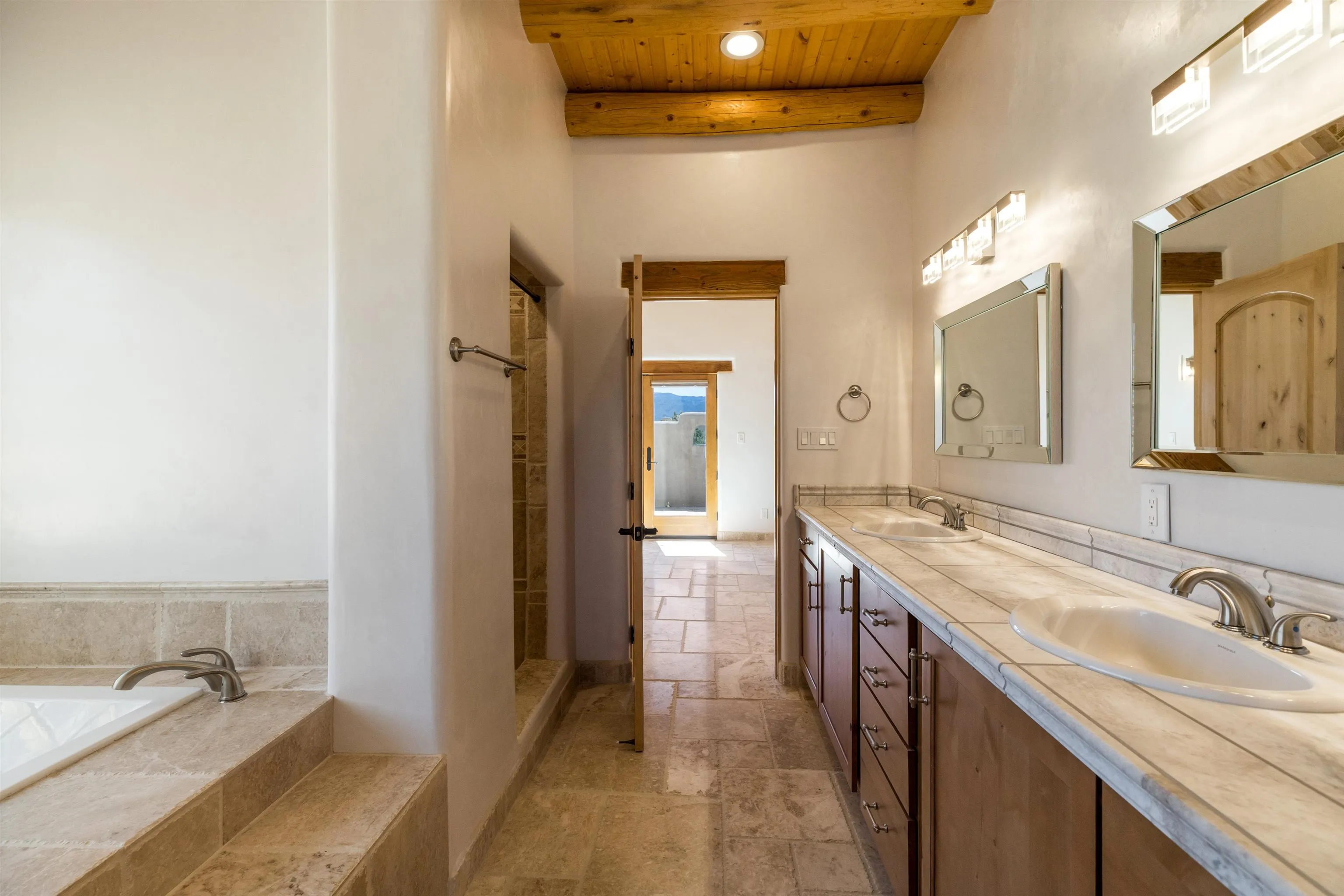 Welcome to your brand-new sanctuary blending authentic Southwestern design with refined modern touches at 1411 Maestas Road, a never-lived-in custom home set on a one-acre lot in the coveted Weimer neighborhood, offering immediate access to healthcare, shopping, and daily essentials while still feeling peacefully private. From the moment you step inside, you’ll feel the quality and care poured into every detail. Travertine natural stone flooring runs throughout the home, paired with rich oak hardwood floors in the great room and stunning viga and tongue-and-groove ceilings, hand-carved corbels, and custom wrought-iron railings that bring timeless Taos character to life. Radiant in-floor heating with three separate zones keeps the home cozy year-round with effortless efficiency. The kitchen invites connection and conversation with its open floor plan design, complete with quality finishes, stainless steel appliances, a gas cooktop, breakfast nook, full dining area, beautiful views, and a generous walk-in pantry for easy everyday living. With blinds already installed, this home is truly move-in ready. Thoughtfully designed with both beauty and flexibility in mind, the home offers two bedrooms, two full baths, and two half baths, along with a versatile flex space that can function as a home office or an additional bedroom depending on your needs. An oversized laundry room with front-load washer and dryer and a finished basement entertainment space with egress and a half bath provide additional comfort and adaptability…ideal for guests, movie nights, or a creative studio. Both bedrooms feature direct outdoor access. The primary suite is a peaceful retreat with a private courtyard, a travertine walk-in shower, an oversized soaking tub, and a spacious walk-in closet. Step outside and take in sweeping Taos Mountain views from the wraparound flagstone patio, offering multiple spaces to relax, dine, or entertain while enjoying the natural surroundings. An attached two-car garage adds everyday convenience. The Dos Arroyos Walking Trail is just down the driveway and offers scenic mountain views perfect for a short walk or hike. Ideally located just minutes from town amenities, approximately 5 miles from Taos Plaza and 30 miles from Taos Ski Valley. A home where timeless Taos design meets modern luxury, ready to welcome its very first owner.